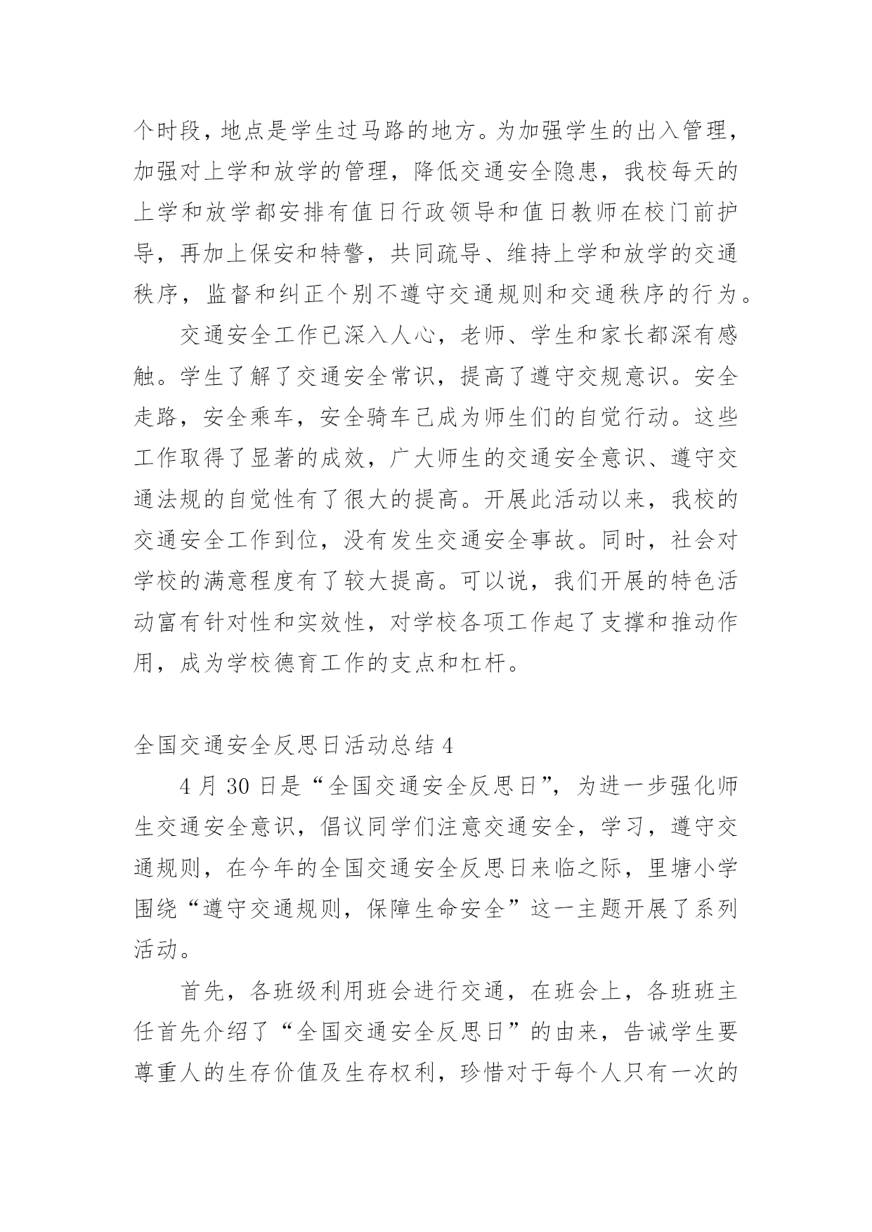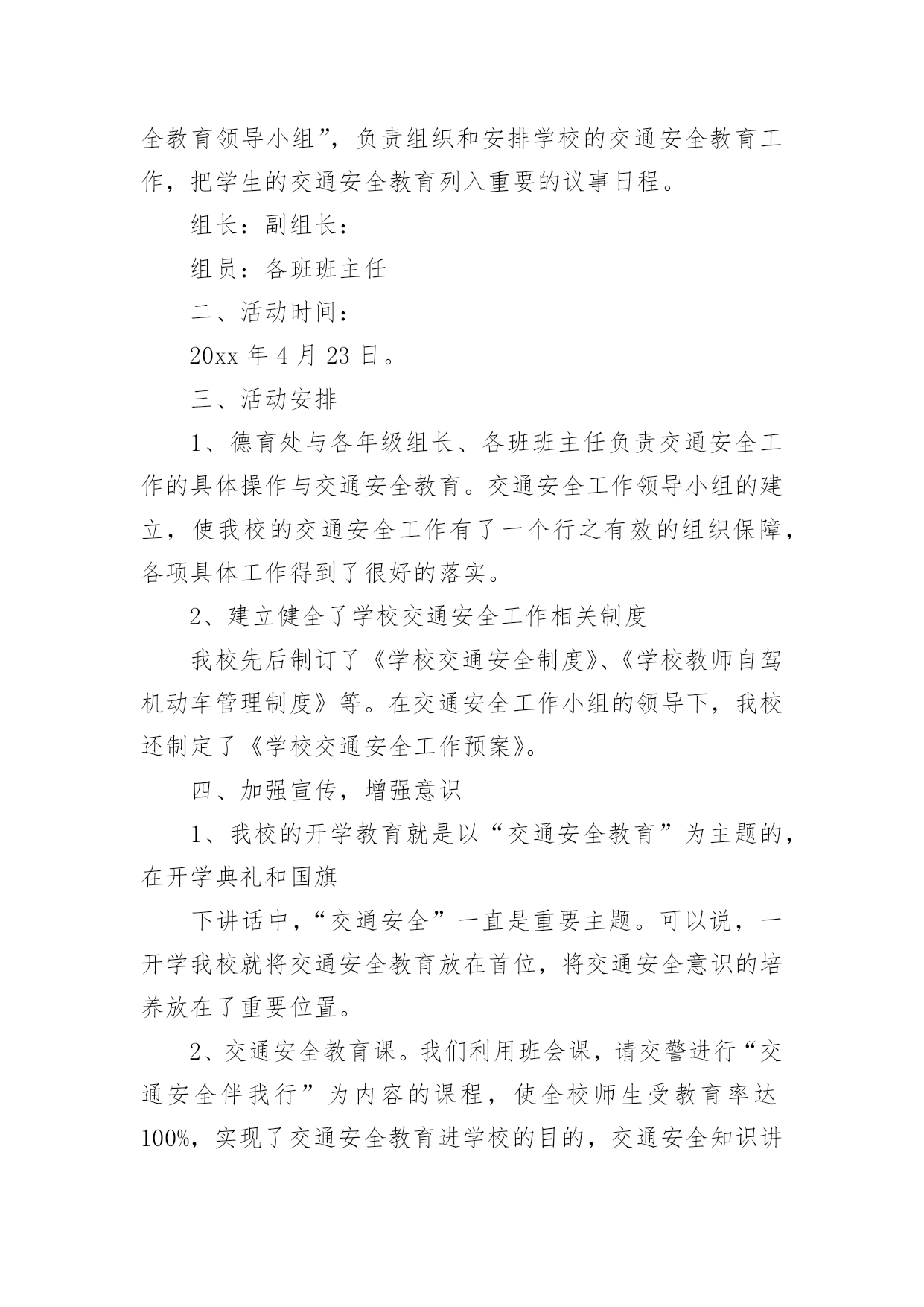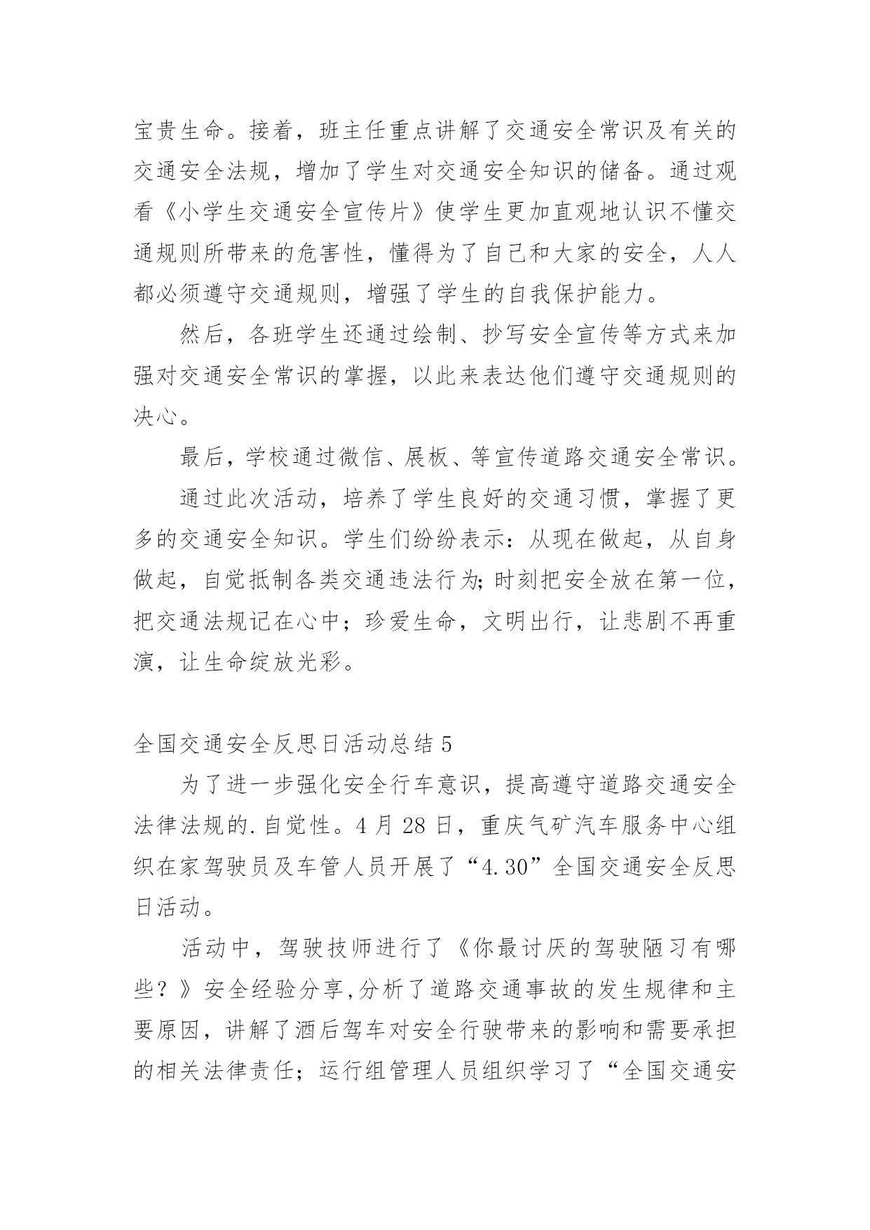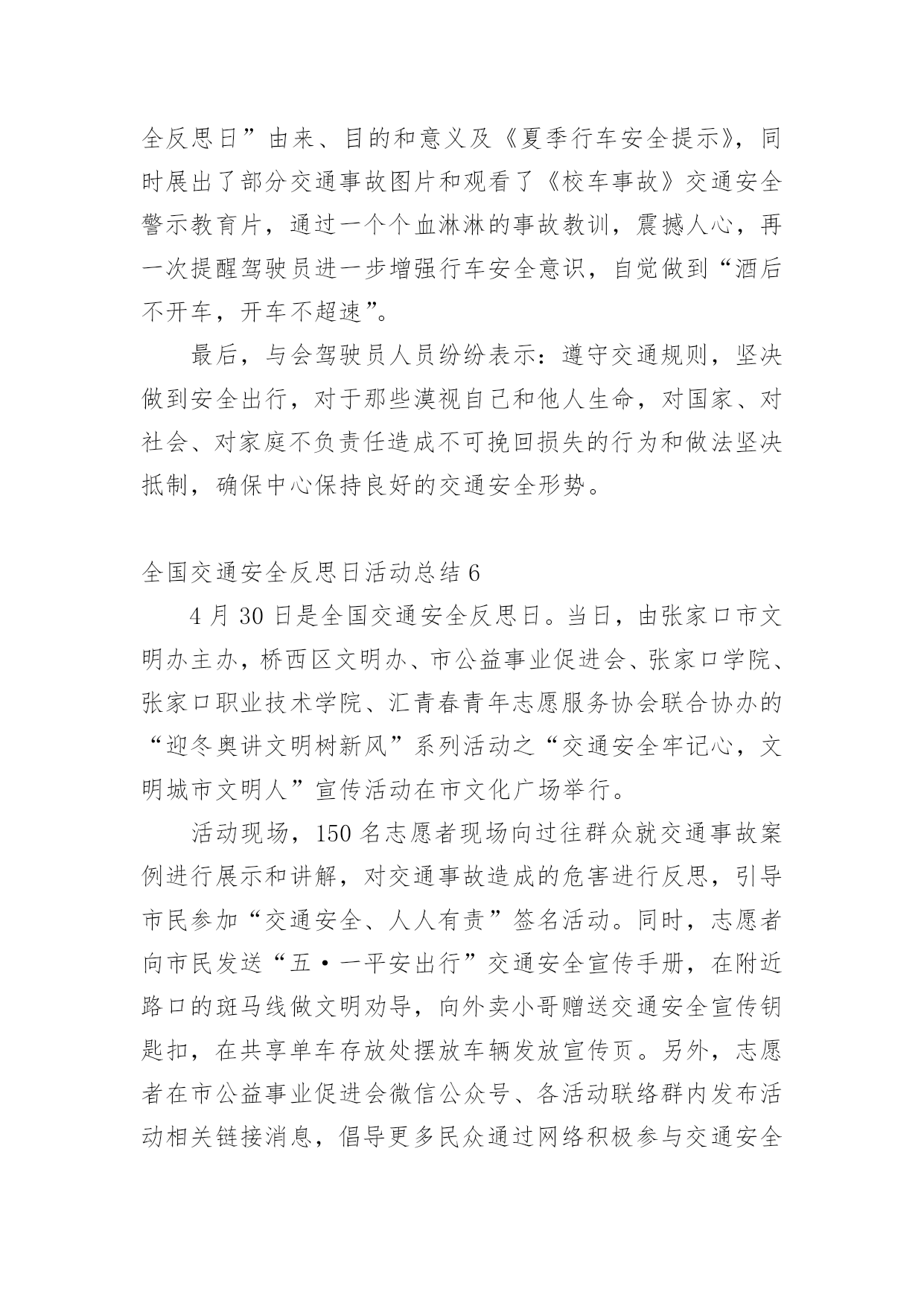 全国交通安全反思日活动总结总结在一个时期、一个年度、一个阶段对学习和工作生活等情况加以回顾和分析的一种书面材料,它可以促使我们思考,快快来写一份总结吧。总结怎么写才不会流于形式呢?以下是小编为大家收集的全国交通安全反思日活动总结,希望对大家有所帮助。全国交通安全反思日活动总结1我们希望,有更多的市民来关注交通安全,反思以往的行路驾车的陋习,认真审视并改正不文明的交通习惯,把宝贵生命从无情的车祸中解救出来,尊重人的生存价值和生存权利!对于那些漠视自己生命和漠视他人生命,对国家、对社会、对受害人家庭造成不可挽回损失的做法,无论赔偿多少钱也终究无法挽回最宝贵生命,同时也给以人为本的和谐社会投下了阴影,这样的事情是永远无法原谅的。一、节日介绍随着经济的快速增长,城市规模的不断扩大,城市交通供需矛盾也日益突出。交通拥堵问题凸显,交通事故频发已成为社会的主要公害。每年的4月30日是“全国交通安全反思日”。“交通安全,人人有责”,让我们从点滴做起,教给孩子们必要的交通安全常识。尊重生命,让“马路杀手”销声匿迹。二、社会影响交通违法行为危害超过战争,中国公安部办公厅副主任、新闻发言人武和平痛斥交通违法行为,20xx年死于车轮下的无辜生命已经达到了10万人,不亚于甚至超过一场惨烈的战争。良好的交通秩序是靠依法严管出来的,为了广大人民群众的生命财产负责,必须严管重罚才能遏制当前群死群伤交通事故上升的势头,这不仅是交通管理实践,同时也被世界发达国家交通管理实践所证实。客运车超员、机动车超速、货车载人、酒后开车、疲劳驾驶,都是马路杀手,这种驾驶车辆的状况,都随时可能发生交通事故。这个过程本身就是违法行为,使每个出行者都成了潜在的被害人,随时都可能遇害,是不特定的,不管是谁。漠视自己的生命和漠视他人生命的做法,或者叫生命意识的淡漠对国家、对社会、对受害人家庭造成了不可挽回的损失,也给以人为本的和谐社会投下了阴影。对违法者的姑息迁就就是对人类的犯罪。公安机关的交管部门采取设立安全服务站,在重要路段设立安全服务站,对超员的车辆要卸车转移,对疲劳驾驶的人员强令休息,对重点路段超重驾驶从重处罚。三、交通安全常识1、交通信号灯的判断在繁忙的十字路口,四面都悬挂着红、黄、绿、三色交通信号灯,它是不出声的“交通警”。红绿灯是国际统一的交通信号灯。红灯是停止信号,绿灯是通行信号。交叉路口,几个方向来的车都汇集在这儿,有的要直行,有的要拐弯,到底让谁先走,这就是要听从红绿灯指挥。红灯亮,行或左转弯,在不碍行人和车辆情况下,允许车辆右转弯;绿灯亮,准许车辆直行或转弯;黄灯亮,停在路口停止线或人行横道线以内,已经继续通行;黄灯闪烁时,警告车辆注意安全。2、交通标线的判断马路上,用漆划的各种各样颜色线条是“交通标线”。道路中间长长的黄色或白色直线,叫“车道中心线”。它是用来分隔来往车辆,使它们互不干扰。中心线两侧的白色虚线,叫“车道分界线”,它规定机动车在机动车道上行驶。非机动车在非机动车道上行驶。在路口四周有一根白线是“停止线”。红灯亮时,各种车辆应该停在这条线内。马路上用白色平等线像斑马纹那样的线条组成的长廊就是“人行横道线”。行人在这里过马路比较安全。3、如何安全走路如果我们不注意交通安全,走路也闯祸。因此,我们上学读书、放学回家、节假日外出时,走在人来车往的交通繁忙的道路上,要遵守交通规则,增强自我保护意识。我们走路要走在人行道上。在没有人行道的地方,应靠道路右边行走。走路时,思想要集中,不要东张西望,不能一边走一边玩耍,不能一边走路一边看书,不能三五成群并排行走,不要乱马路,更不能追赶车辆嬉戏打闹。更不要在马路上踢球、溜冰、放风筝、做游戏。一旦被来往车辆撞倒,后果非常严重。全国交通安全反思日活动总结24月30日讯4月30日,是全国交通安全反思日。为培养学生的交通安全意识,提高自我防范能力,滨州市沾化区富国街道开展“文明交通安全出行”主题宣传活动。活动中,民警通过讲解交通标识、发放各类宣传资料,分别从怎样安全走路、安全乘车等方面进行了详细的讲解,深入浅出地分析了遵守交通法规的重要性,教育学生们要从小养成遵守交通法规的好习惯,安全文明出行。沾化区富国街道明德小学学生xxx说:“通过这个活动,我会自主的学习关于交通安全的知识,同时,在保证自己人身安全的同时也会尽可能保护他人。”通过此次活动,让学生们从小养成遵守交通法规、文明出行的良好习惯,确保他们健康快乐的成长,安全幸福的生活。全国交通安全反思日活动总结3交通安全教育是我校德育的重点工作,为了强化学生交通法规和安全常识的意识,提高学生自我防护能力,我校通过开展形式多样的学习教育活动,对学生进行交通安全教育,使学生懂得交通安全的重要性,帮助学生养成良好的交通行为习惯,增强学生交通安全意识,确保学生交通安全。现把我们学校