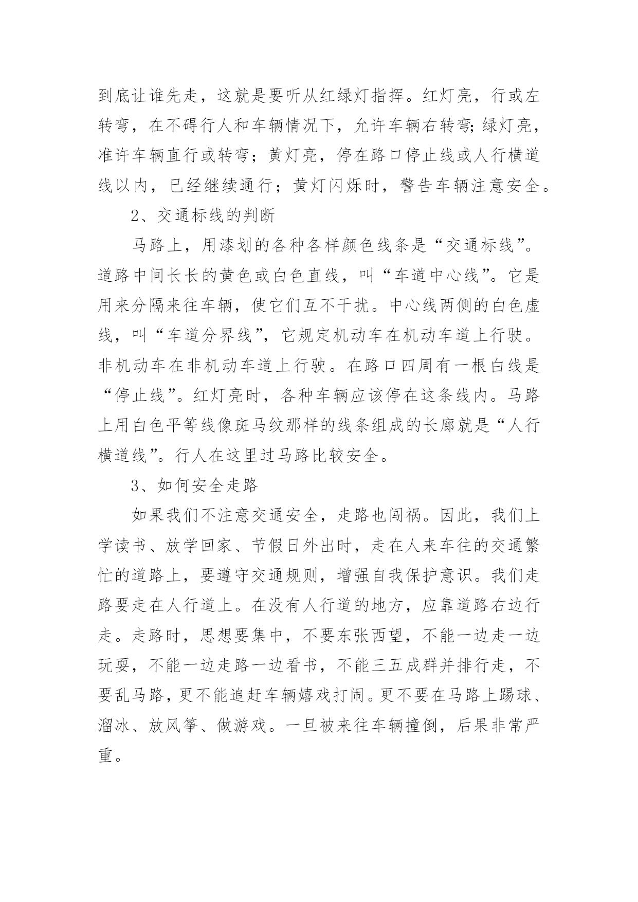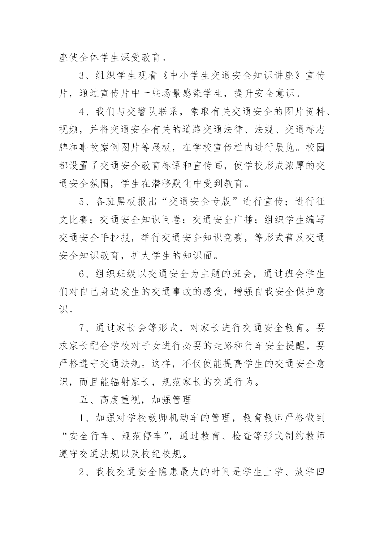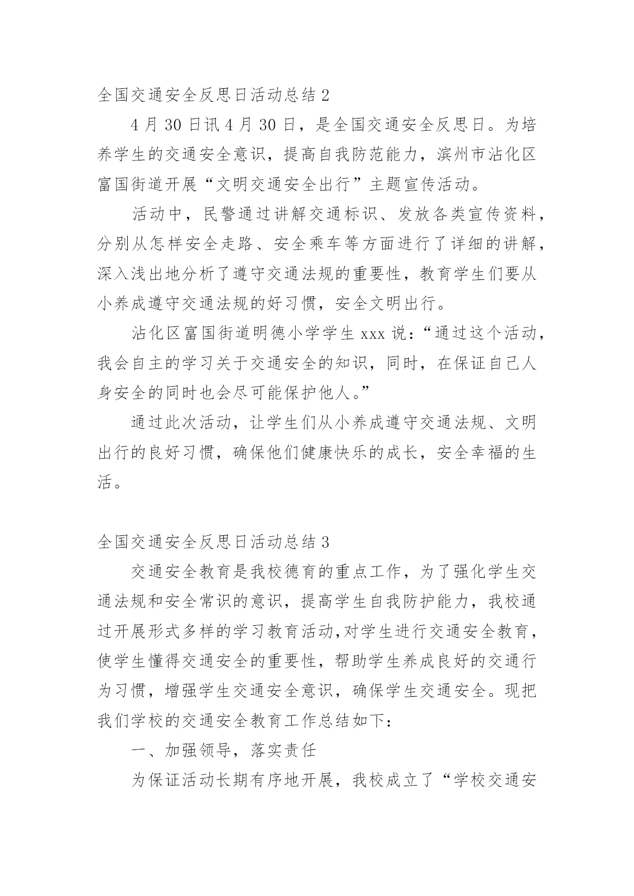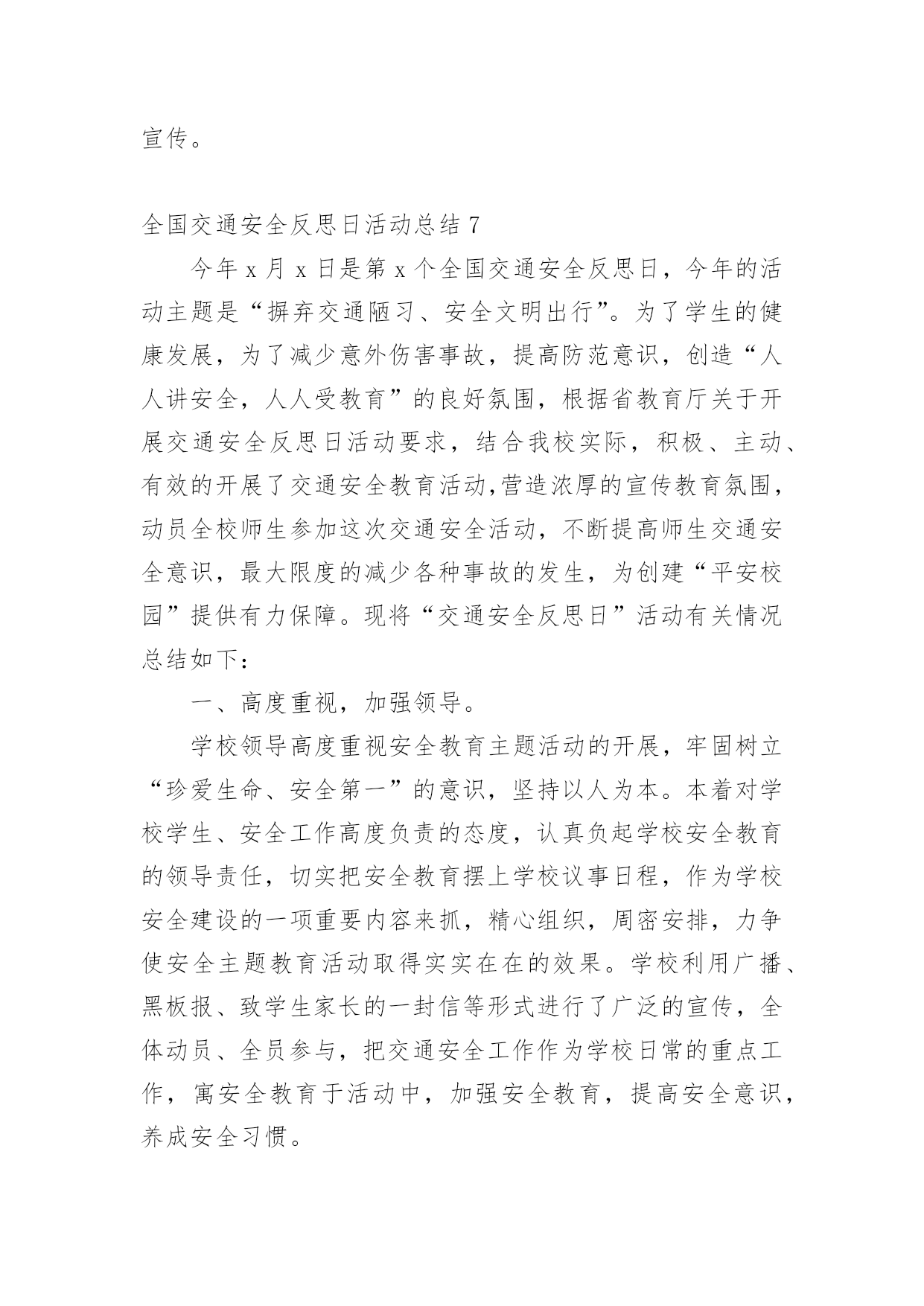 全国交通安全反思日活动总结总结在一个时期、一个年度、一个阶段对学习和工作生活等情况加以回顾和分析的一种书面材料,它可以促使我们思考,快快来写一份总结吧。总结怎么写才不会流于形式呢?以下是小编为大家收集的全国交通安全反思日活动总结,希望对大家有所帮助。全国交通安全反思日活动总结1我们希望,有更多的市民来关注交通安全,反思以往的行路驾车的陋习,认真审视并改正不文明的交通习惯,把宝贵生命从无情的车祸中解救出来,尊重人的生存价值和生存权利!对于那些漠视自己生命和漠视他人生命,对国家、对社会、对受害人家庭造成不可挽回损失的做法,无论赔偿多少钱也终究无法挽回最宝贵生命,同时也给以人为本的和谐社会投下了阴影,这样的事情是永远无法原谅的。一、节日介绍随着经济的快速增长,城市规模的不断扩大,城市交通供需矛盾也日益突出。交通拥堵问题凸显,交通事故频发已成为社会的主要公害。每年的4月30日是“全国交通安全反思日”。“交通安全,人人有责”,让我们从点滴做起,教给孩子们必要的交通安全常识。尊重生命,让“马路杀手”销声匿迹。二、社会影响交通违法行为危害超过战争,中国公安部办公厅副主任、新闻发言人武和平痛斥交通违法行为,20xx年死于车轮下的无辜生命已经达到了10万人,不亚于甚至超过一场惨烈的战争。良好的交通秩序是靠依法严管出来的,为了广大人民群众的生命财产负责,必须严管重罚才能遏制当前群死群伤交通事故上升的势头,这不仅是交通管理实践,同时也被世界发达国家交通管理实践所证实。客运车超员、机动车超速、货车载人、酒后开车、疲劳驾驶,都是马路杀手,这种驾驶车辆的状况,都随时可能发生交通事故。这个过程本身就是违法行为,使每个出行者都成了潜在的被害人,随时都可能遇害,是不特定的,不管是谁。漠视自己的生命和漠视他人生命的做法,或者叫生命意识的淡漠对国家、对社会、对受害人家庭造成了不可挽回的损失,也给以人为本的和谐社会投下了阴影。对违法者的姑息迁就就是对人类的犯罪。公安机关的交管部门采取设立安全服务站,在重要路段设立安全服务站,对超员的车辆要卸车转移,对疲劳驾驶的人员强令休息,对重点路段超重驾驶从重处罚。三、交通安全常识1、交通信号灯的判断在繁忙的十字路口,四面都悬挂着红、黄、绿、三色交通信号灯,它是不出声的“交通警”。红绿灯是国际统一的交通信号灯。红灯是停止信号,绿灯是通行信号。交叉路口,几个方向来的车都汇集在这儿,有的要直行,有的要拐弯,到底让谁先走,这就是要听从红绿灯指挥。红灯亮,行或左转弯,在不碍行人和车辆情况下,允许车辆右转弯;绿灯亮,准许车辆直行或转弯;黄灯亮,停在路口停止线或人行横道线以内,已经继续通行;黄灯闪烁时,警告车辆注意安全。2、交通标线的判断马路上,用漆划的各种各样颜色线条是“交通标线”。道路中间长长的黄色或白色直线,叫“车道中心线”。它是用来分隔来往车辆,使它们互不干扰。中心线两侧的白色虚线,叫“车道分界线”,它规定机动车在机动车道上行驶。非机动车在非机动车道上行驶。在路口四周有一根白线是“停止线”。红灯亮时,各种车辆应该停在这条线内。马路上用白色平等线像斑马纹那样的线条组成的长廊就是“人行横道线”。行人在这里过马路比较安全。3、如何安全走路如果我们不注意交通安全,走路也闯祸。因此,我们上学读书、放学回家、节假日外出时,走在人来车往的交通繁忙的道路上,要遵守交通规则,增强自我保护意识。我们走路要走在人行道上。在没有人行道的地方,应靠道路右边行走。走路时,思想要集中,不要东张西望,不能一边走一边玩耍,不能一边走路一边看书,不能三五成群并排行走,不要乱马路,更不能追赶车辆嬉戏打闹。更不要在马路上踢球、溜冰、放风筝、做游戏。一旦被来往车辆撞倒,后果非常严重。全国交通安全反思日活动总结24月30日讯4月30日,是全国交通安全反思日。为培养学生的交通安全意识,提高自我防范能力,滨州市沾化区富国街道开展“文明交通安全出行”主题宣传活动。活动中,民警通过讲解交通标识、发放各类宣传资料,分别从怎样安全走路、安全乘车等方面进行了详细的讲解,深入浅出地分析了遵守交通法规的重要性,教育学生们要从小养成遵守交通法规的好习惯,安全文明出行。沾化区富国街道明德小学学生xxx说:“通过这个活动,我会自主的学习关于交通安全的知识,同时,在保证自己人身安全的同时也会尽可能保护他人。”通过此次活动,让学生们从小养成遵守交通法规、文明出行的良好习惯,确保他们健康快乐的成长,安全幸福的生活。全国交通安全反思日活动总结3交通安全教育是我校德育的重点工作,为了强化学生交通法规和安全常识的意识,提高学生自我防护能力,我校通过开展形式多样的学习教育活动,对学生进行交通安全教育,使学生懂得交通安全的重要性,帮助学生养成良好的交通行为习惯,增强学生交通安全意识,确保学生交通安全。现把我们学校
