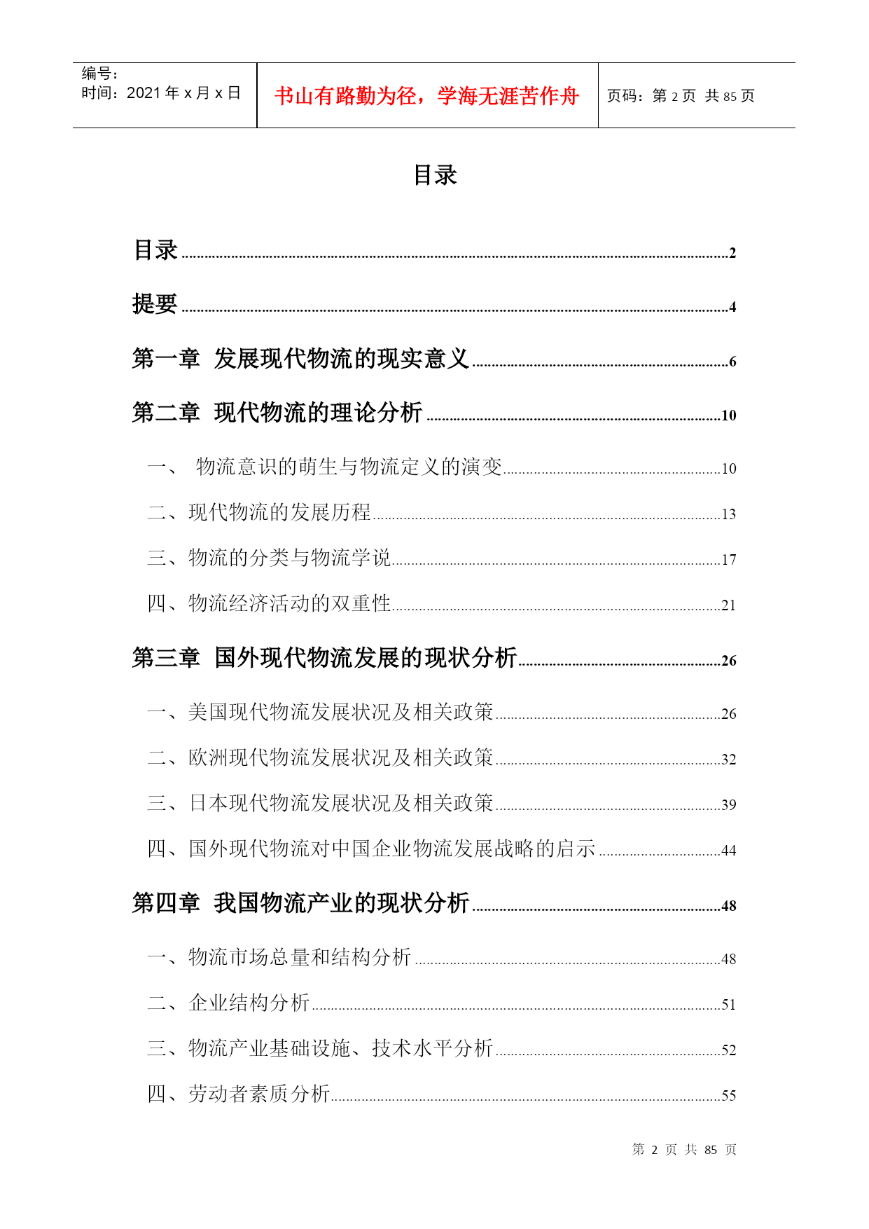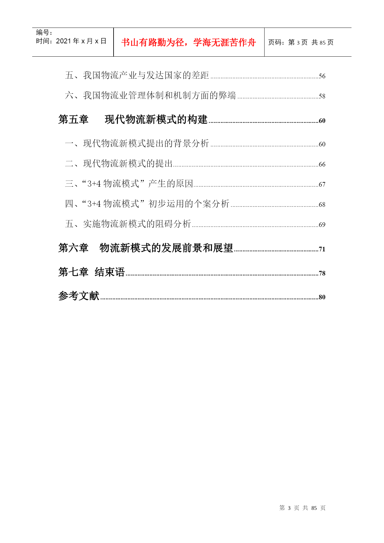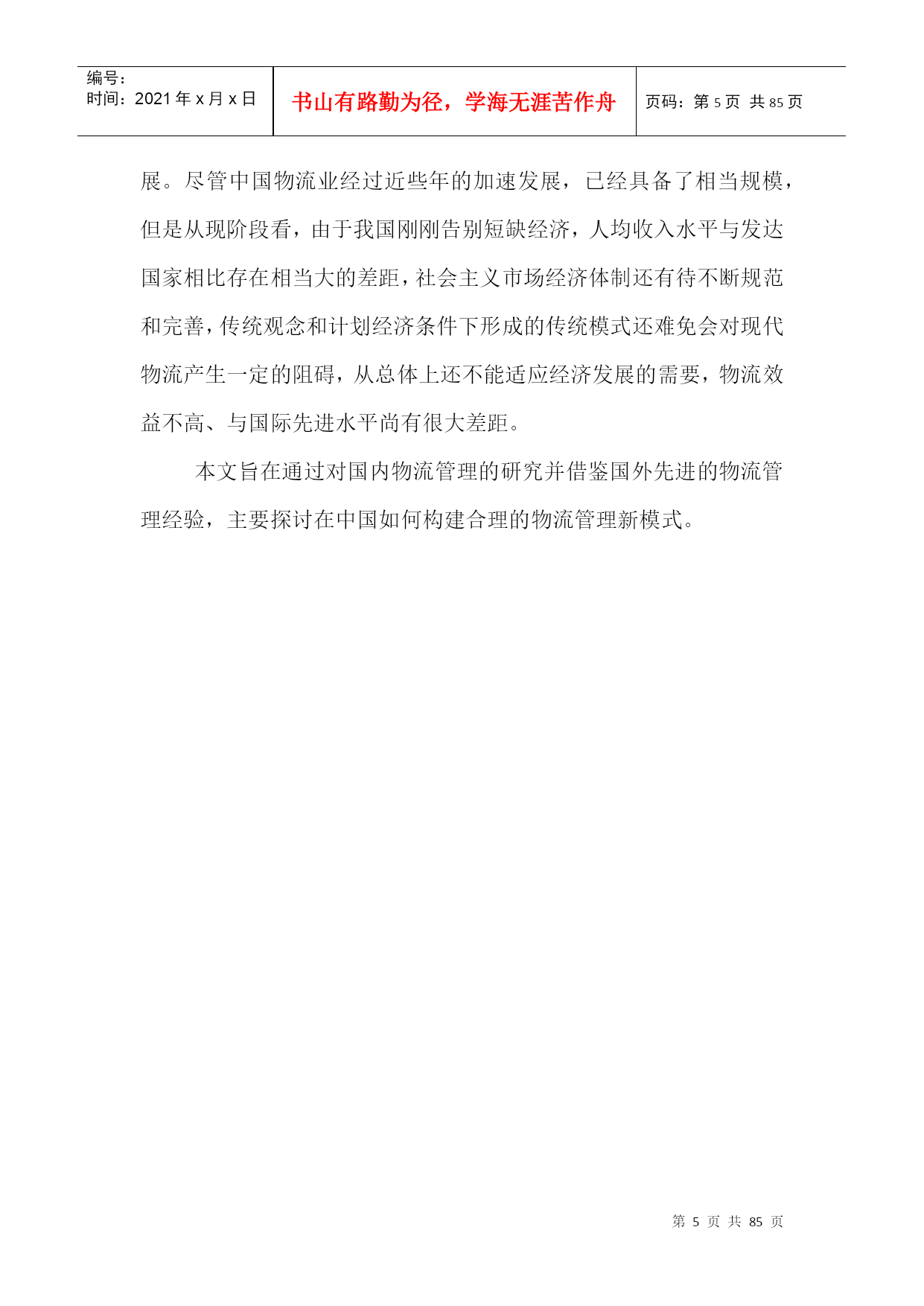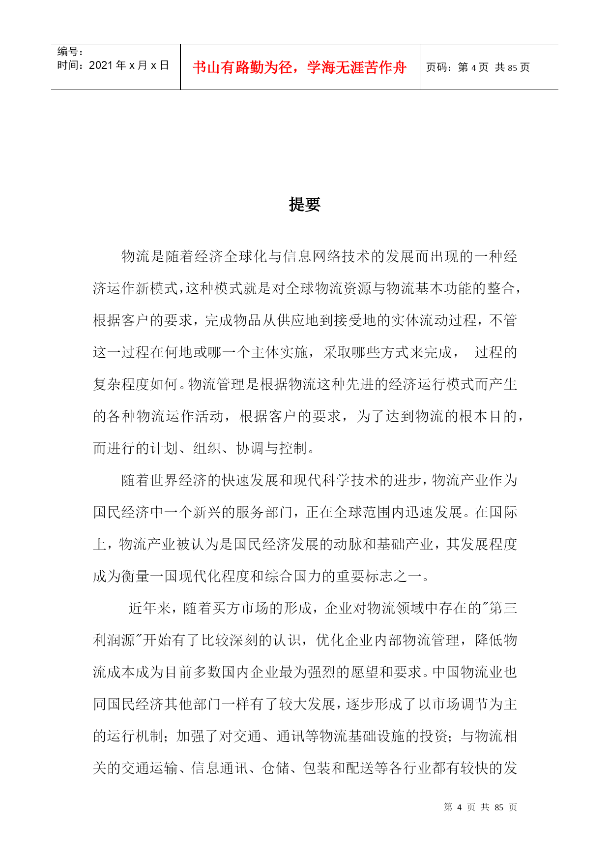 编号:时间:2021年x月x日书山有路勤为径,学海无涯苦作舟页码:第PAGE85页共NUMPAGES85页第PAGE\*MERGEFORMAT85页共NUMPAGES\*MERGEFORMAT85页现代物流管理新模式研究目录TOC\o"1-3"\h\zHYPERLINK\l"_Toc73336892"目录PAGEREF_Toc73336892\h2HYPERLINK\l"_Toc73336893"提要PAGEREF_Toc73336893\h4HYPERLINK\l"_Toc73336894"第一章发展现代物流的现实意义PAGEREF_Toc73336894\h6HYPERLINK\l"_Toc73336895"第二章现代物流的理论分析PAGEREF_Toc73336895\h10HYPERLINK\l"_Toc73336896"一、物流意识的萌生与物流定义的演变PAGEREF_Toc73336896\h10HYPERLINK\l"_Toc73336897"二、现代物流的发展历程PAGEREF_Toc73336897\h13HYPERLINK\l"_Toc73336898"三、物流的分类与物流学说PAGEREF_Toc73336898\h17HYPERLINK\l"_Toc73336899"四、物流经济活动的双重性PAGEREF_Toc73336899\h21HYPERLINK\l"_Toc73336900"第三章国外现代物流发展的现状分析PAGEREF_Toc73336900\h26HYPERLINK\l"_Toc73336901"一、美国现代物流发展状况及相关政策PAGEREF_Toc73336901\h26HYPERLINK\l"_Toc73336902"二、欧洲现代物流发展状况及相关政策PAGEREF_Toc73336902\h32HYPERLINK\l"_Toc73336903"三、日本现代物流发展状况及相关政策PAGEREF_Toc73336903\h39HYPERLINK\l"_Toc73336904"四、国外现代物流对中国企业物流发展战略的启示PAGEREF_Toc73336904\h44HYPERLINK\l"_Toc73336905"第四章我国物流产业的现状分析PAGEREF_Toc73336905\h48HYPERLINK\l"_Toc73336906"一、物流市场总量和结构分析PAGEREF_Toc73336906\h48HYPERLINK\l"_Toc73336907"二、企业结构分析PAGEREF_Toc73336907\h51HYPERLINK\l"_Toc73336908"三、物流产业基础设施、技术水平分析PAGEREF_Toc73336908\h52HYPERLINK\l"_Toc73336909"四、劳动者素质分析PAGEREF_Toc73336909\h55HYPERLINK\l"_Toc73336910"五、我国物流产业与发达国家的差距PAGEREF_Toc73336910\h56HYPERLINK\l"_Toc73336911"六、我国物流业管理体制和机制方面的弊端PAGEREF_Toc73336911\h58HYPERLINK\l"_Toc73336912"第五章现代物流新模式的构建PAGEREF_Toc73336912\h60HYPERLINK\l"_Toc73336913"一、现代物流新模式提出的背景分析PAGEREF_Toc73336913\h60HYPERLINK\l"_Toc73336914"二、现代物流新模式的提出PAGEREF_Toc73336914\h66HYPERLINK\l"_Toc73336915"三、“3+4物流模式”产生的原因PAGEREF_Toc73336915\h67HYPERLINK\l"_Toc73336916"四、“3+4物流模式”初步运用的个案分析PAGEREF_Toc73336916\h68HYPERLINK\l"_Toc73336917"五、实施物流新模式的阻碍分析PAGEREF_Toc73336917\h69HYPERLINK\l"_Toc733369