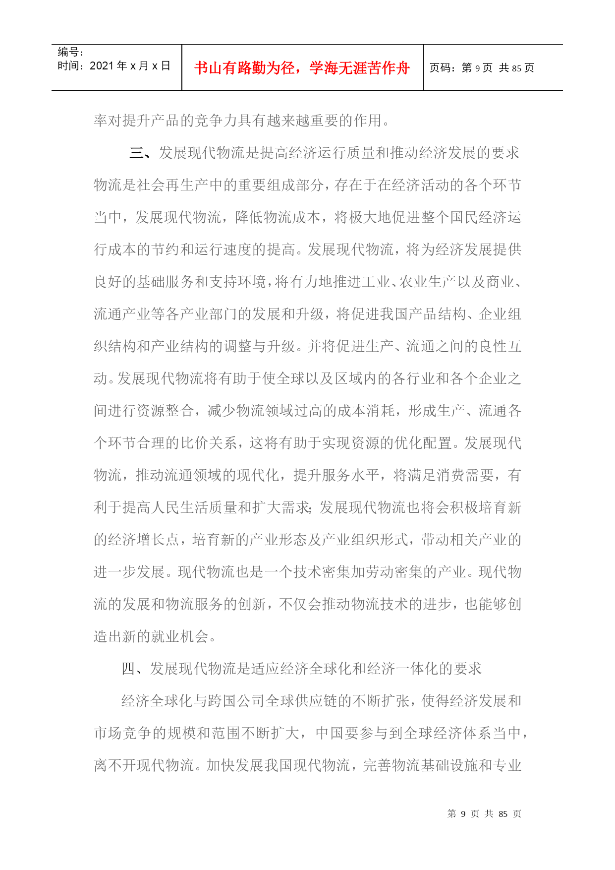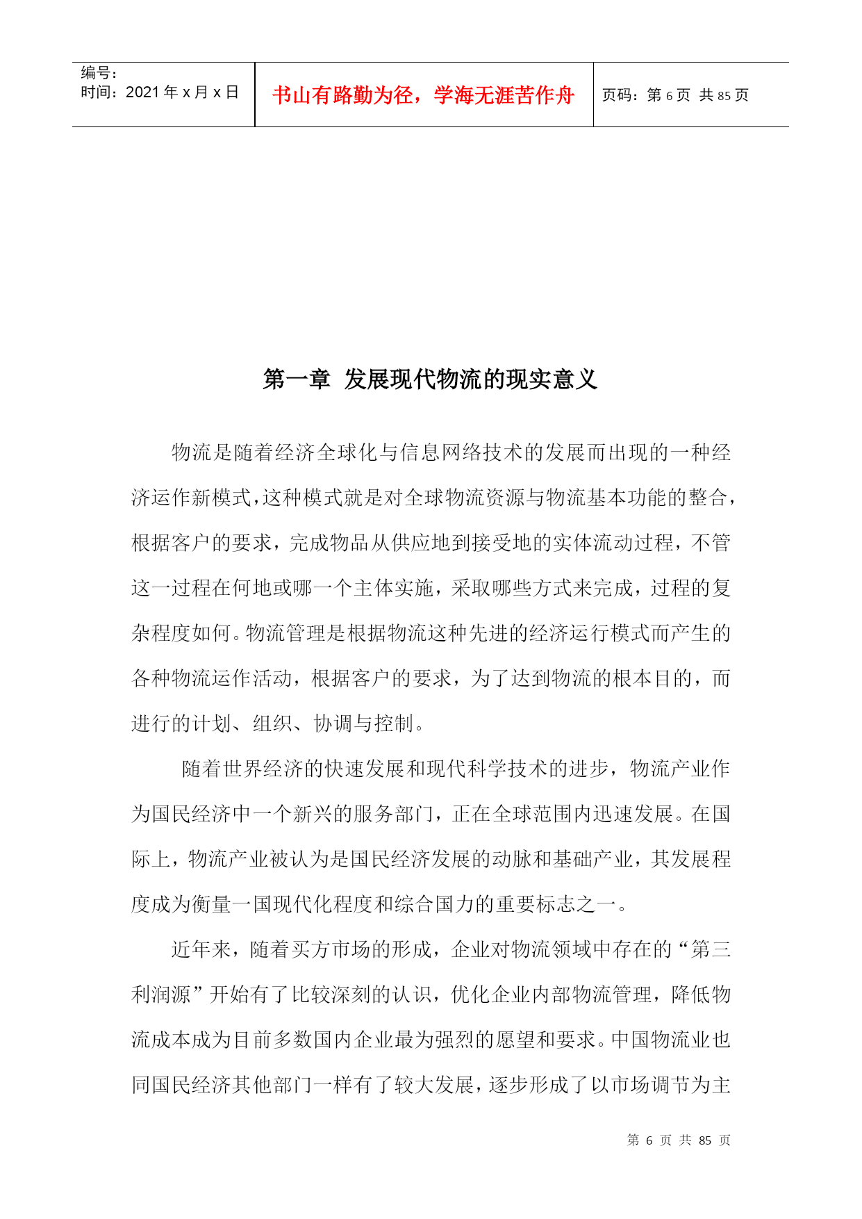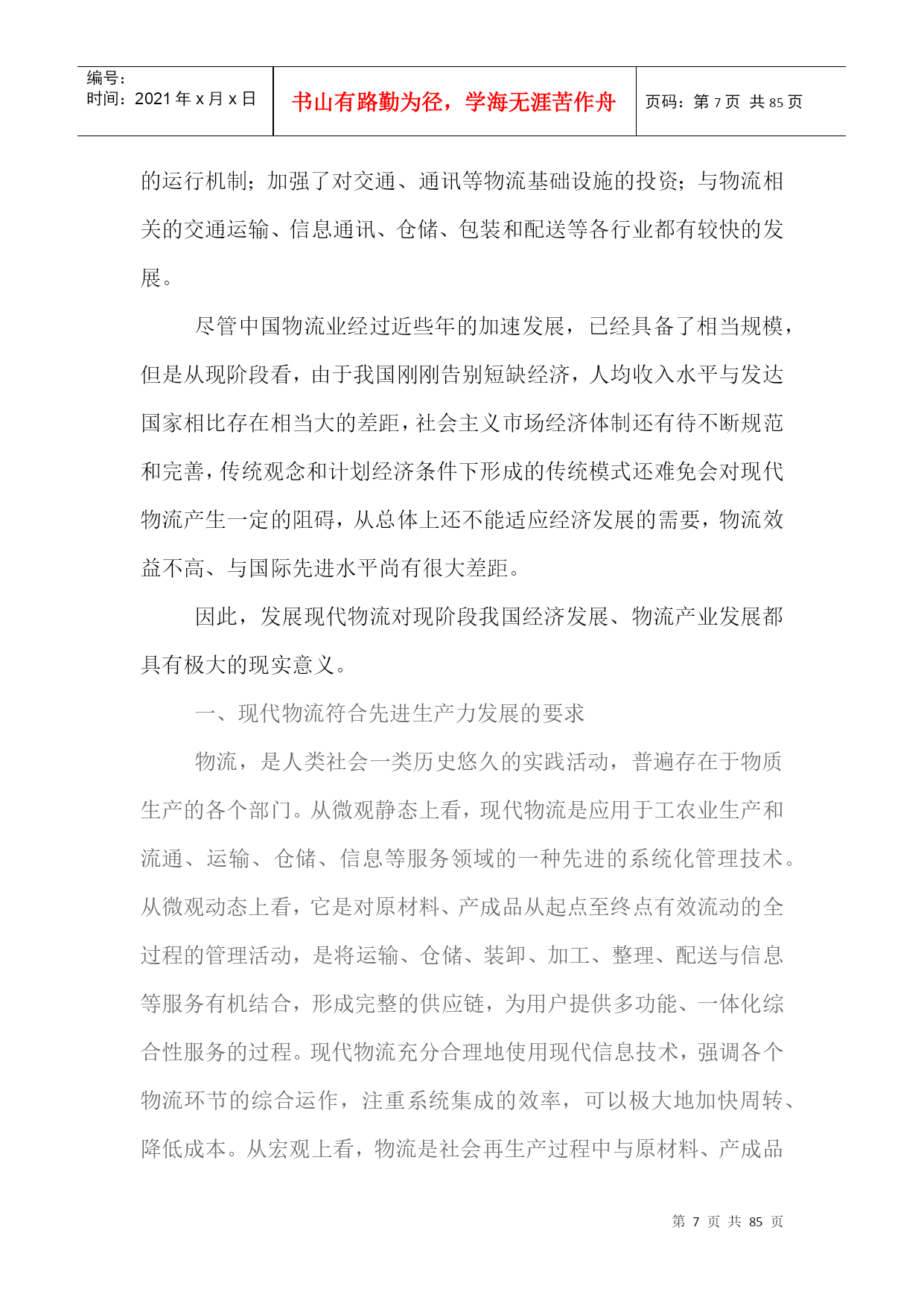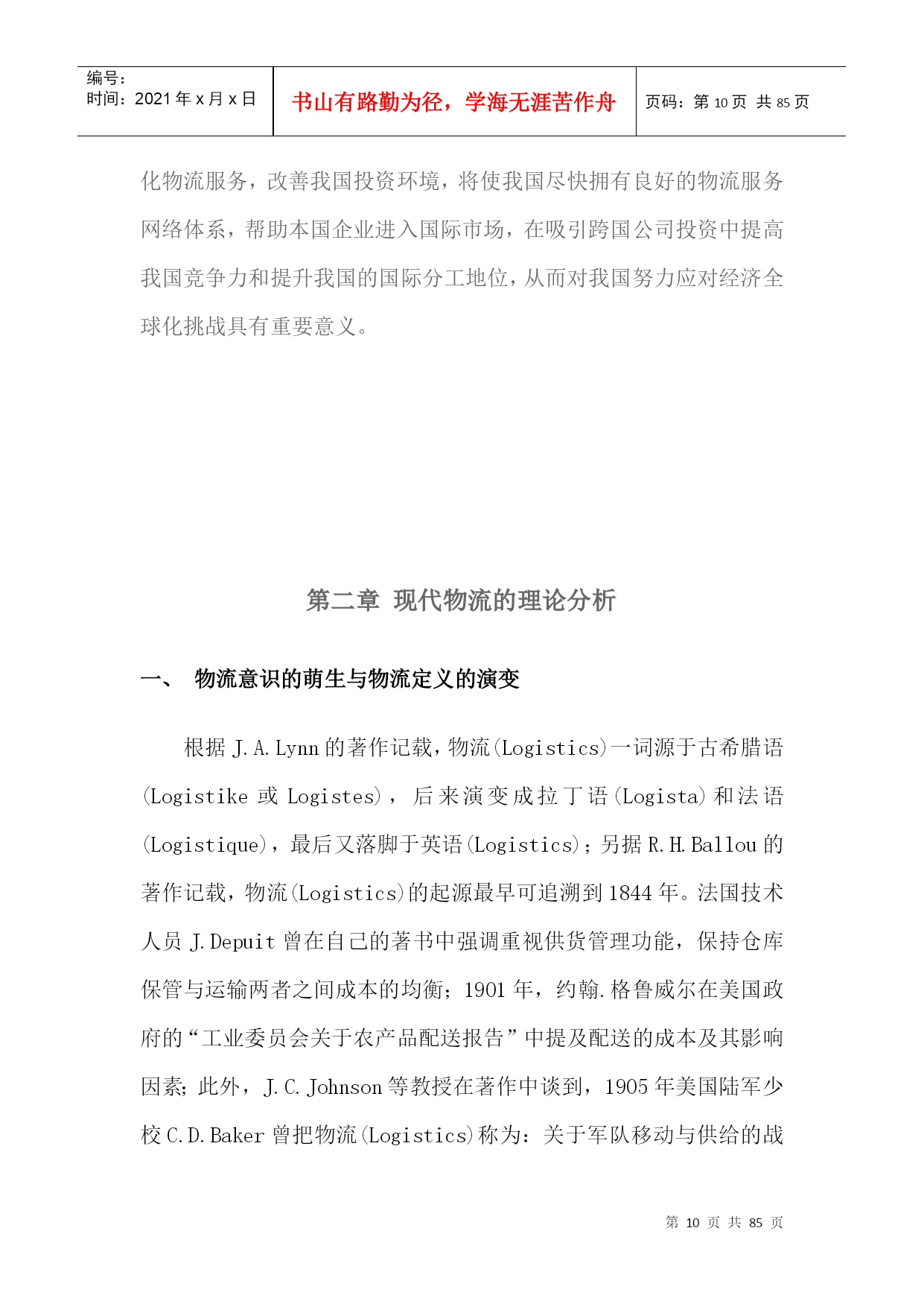 编号:时间:2021年x月x日书山有路勤为径,学海无涯苦作舟页码:第PAGE85页共NUMPAGES85页第PAGE\*MERGEFORMAT85页共NUMPAGES\*MERGEFORMAT85页现代物流管理新模式研究目录TOC\o"1-3"\h\zHYPERLINK\l"_Toc73336892"目录PAGEREF_Toc73336892\h2HYPERLINK\l"_Toc73336893"提要PAGEREF_Toc73336893\h4HYPERLINK\l"_Toc73336894"第一章发展现代物流的现实意义PAGEREF_Toc73336894\h6HYPERLINK\l"_Toc73336895"第二章现代物流的理论分析PAGEREF_Toc73336895\h10HYPERLINK\l"_Toc73336896"一、物流意识的萌生与物流定义的演变PAGEREF_Toc73336896\h10HYPERLINK\l"_Toc73336897"二、现代物流的发展历程PAGEREF_Toc73336897\h13HYPERLINK\l"_Toc73336898"三、物流的分类与物流学说PAGEREF_Toc73336898\h17HYPERLINK\l"_Toc73336899"四、物流经济活动的双重性PAGEREF_Toc73336899\h21HYPERLINK\l"_Toc73336900"第三章国外现代物流发展的现状分析PAGEREF_Toc73336900\h26HYPERLINK\l"_Toc73336901"一、美国现代物流发展状况及相关政策PAGEREF_Toc73336901\h26HYPERLINK\l"_Toc73336902"二、欧洲现代物流发展状况及相关政策PAGEREF_Toc73336902\h32HYPERLINK\l"_Toc73336903"三、日本现代物流发展状况及相关政策PAGEREF_Toc73336903\h39HYPERLINK\l"_Toc73336904"四、国外现代物流对中国企业物流发展战略的启示PAGEREF_Toc73336904\h44HYPERLINK\l"_Toc73336905"第四章我国物流产业的现状分析PAGEREF_Toc73336905\h48HYPERLINK\l"_Toc73336906"一、物流市场总量和结构分析PAGEREF_Toc73336906\h48HYPERLINK\l"_Toc73336907"二、企业结构分析PAGEREF_Toc73336907\h51HYPERLINK\l"_Toc73336908"三、物流产业基础设施、技术水平分析PAGEREF_Toc73336908\h52HYPERLINK\l"_Toc73336909"四、劳动者素质分析PAGEREF_Toc73336909\h55HYPERLINK\l"_Toc73336910"五、我国物流产业与发达国家的差距PAGEREF_Toc73336910\h56HYPERLINK\l"_Toc73336911"六、我国物流业管理体制和机制方面的弊端PAGEREF_Toc73336911\h58HYPERLINK\l"_Toc73336912"第五章现代物流新模式的构建PAGEREF_Toc73336912\h60HYPERLINK\l"_Toc73336913"一、现代物流新模式提出的背景分析PAGEREF_Toc73336913\h60HYPERLINK\l"_Toc73336914"二、现代物流新模式的提出PAGEREF_Toc73336914\h66HYPERLINK\l"_Toc73336915"三、“3+4物流模式”产生的原因PAGEREF_Toc73336915\h67HYPERLINK\l"_Toc73336916"四、“3+4物流模式”初步运用的个案分析PAGEREF_Toc73336916\h68HYPERLINK\l"_Toc73336917"五、实施物流新模式的阻碍分析PAGEREF_Toc73336917\h69HYPERLINK\l"_Toc733369