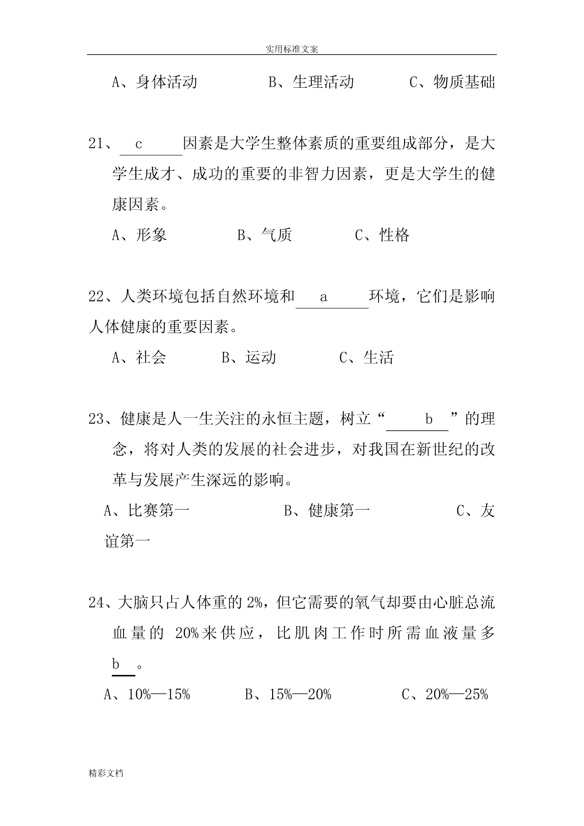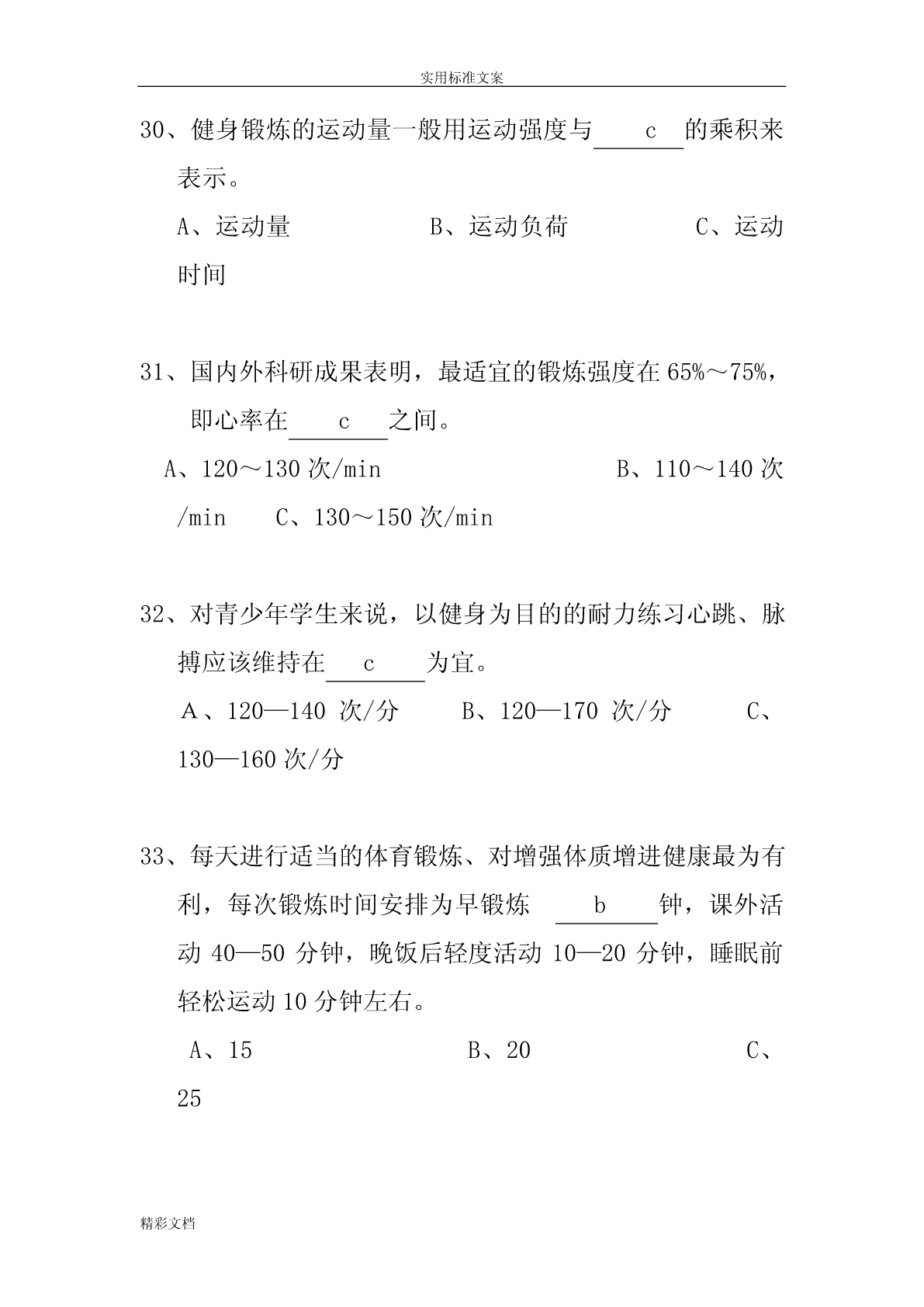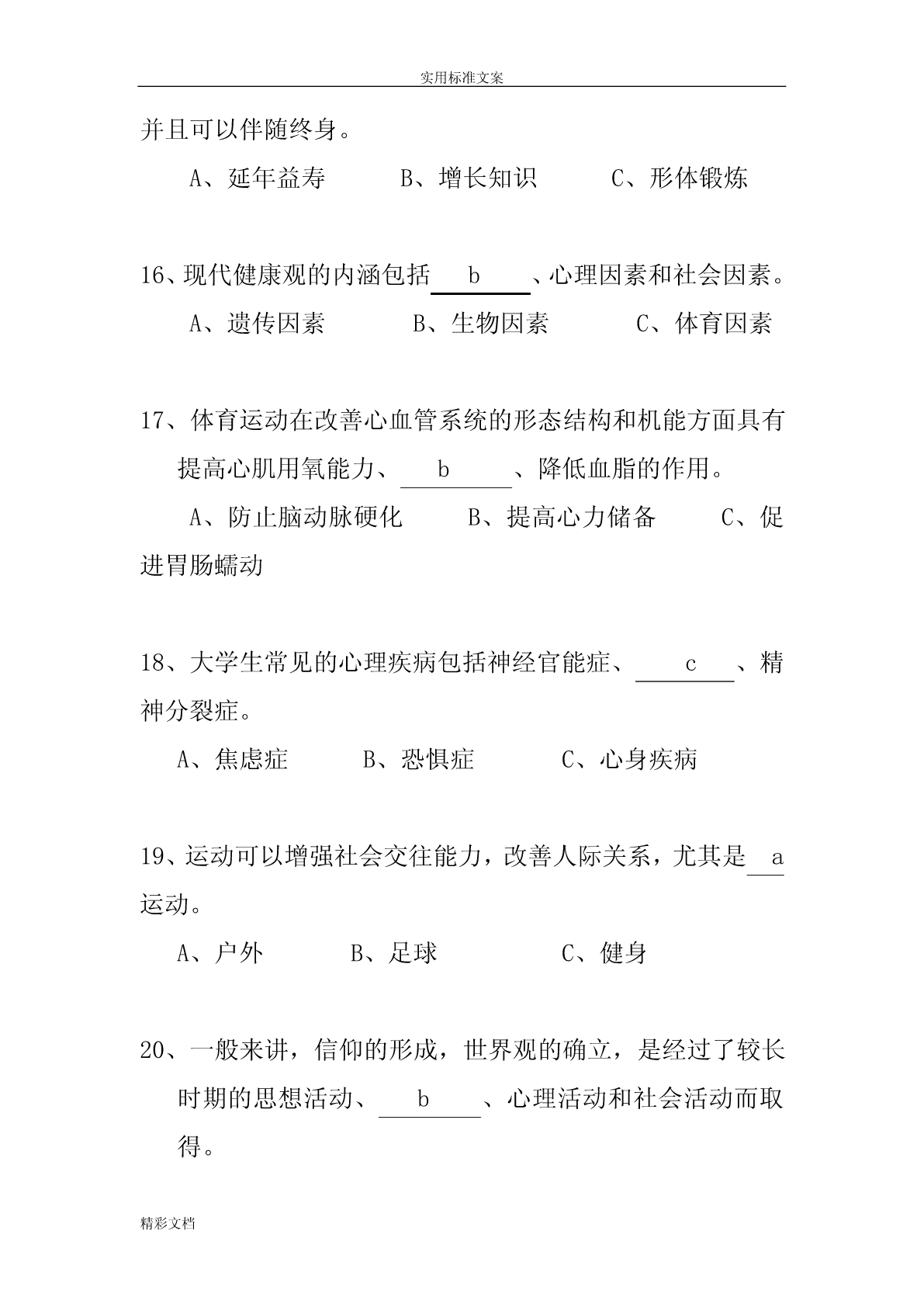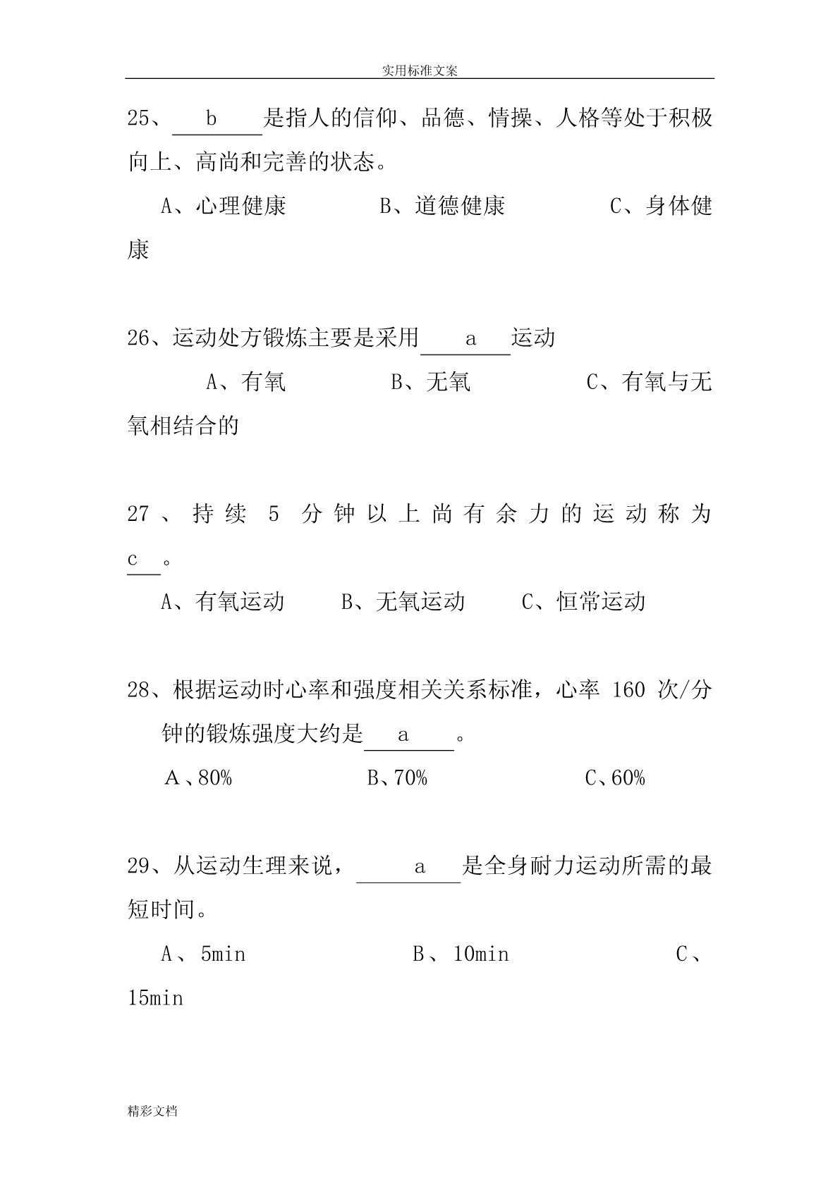 实用标准文案理论课试题1、体育是一种特殊的社会现象,它是以发展身体,增强体质、增进健康为基本特征的教育过程和___c___活动。A、生产B、劳动C、社会文化2、现代体育的范畴包括竞技体育、__c____和群众体育三个A、中学体育B、大学体育C、学校体育3、学校体育是指通过体育课教学、__c___和训练以及运动竞赛等形式来增强学生体质、促进身心健康与智力发展、培养良好的道德品质与个性特征的教育过程。A、早操B、课间操C、课外体育锻炼4、群众体育是指广大国民以锻炼身体来增强体质、增进健康、调节精神和丰富社会文化生活为目的的___b___活动。A、经济B、体育C、商业5、体育的功能包括___a___、教育功能、娱乐功能。A、健身功能B、健美功能C、健康功能精彩文档实用标准文案6、高等学校体育的目的就是以运动和b为基本手段,对大学生机体进行科学的培养,在提高人的生物潜能和心理潜能及社会适应潜能的过程中,进得、益智、促美,达到全面发展的教育总目的。A、合理营养B、身体练习C、体育竞赛7、高等学校体育的目的是通过增强学生体质,促进身心健康,掌握体育三基,a培养审美和创造美的能力及培养高水平运动员来具体实现的。A、培养道德品质B、提高运动水平C、提高身体机能8、高等学校体育的基本组织形式有c、课余体育活动。A、体育训练B、体育竞赛C、体育课程9、竞技体育是为了最大限度的发挥个人或集体的运动能力去争取优异成绩而进行的a和竞赛。A、运动训练B、理论教学C、基础练习10、公元前300年,古希腊伟大思想家亚里士多德提出“b”名言。精彩文档实用标准文案A、运动是一切生命的源泉B、生命在于运动C、活动是生活的基础11、体育运动对大学生心理健康的影响具有提高心理素质宣泄情绪a、调节生活和实现自我价值的作用。A、增强社交能力B、解除疲劳和精神紧张C、完美人格个性12、心理健康是指人在c、认知意志、平衡人际和社会关系等方面处于良好状态。A、智力B、兴趣C、情绪13、世界卫生组织认为健康包括身体健康、心理健康、c和道德健康。A、自我实现B、意识健康C、社会适应良好14、人的信仰、品德、情操、人格等处于积极向上、高尚和完善的状态就是b。A、身心健康B、心理健康C、体质健康15、体育作为一种健身养生、a的手段是最好的,精彩文档实用标准文案并且可以伴随终身。A、延年益寿B、增长知识C、形体锻炼16、现代健康观的内涵包括b、心理因素和社会因素。A、遗传因素B、生物因素C、体育因素17、体育运动在改善心血管系统的形态结构和机能方面具有提高心肌用氧能力、b、降低血脂的作用。A、防止脑动脉硬化B、提高心力储备C、促进胃肠蠕动18、大学生常见的心理疾病包括神经官能症、c、精神分裂症。A、焦虑症B、恐惧症C、心身疾病19、运动可以增强社会交往能力,改善人际关系,尤其是a运动。A、户外B、足球C、健身20、一般来讲,信仰的形成,世界观的确立,是经过了较长时期的思想活动、b、心理活动和社会活动而取得。精彩文档实用标准文案A、身体活动B、生理活动C、物质基础21、c因素是大学生整体素质的重要组成部分,是大学生成才、成功的重要的非智力因素,更是大学生的健康因素。A、形象B、气质C、性格22、人类环境包括自然环境和a环境,它们是影响人体健康的重要因素。A、社会B、运动C、生活23、健康是人一生关注的永恒主题,树立“b”的理念,将对人类的发展的社会进步,对我国在新世纪的改革与发展产生深远的影响。A、比赛第一B、健康第一C、友谊第一24、大脑只占人体重的2%,但它需要的氧气却要由心脏总流血量的20%来供应,比肌肉工作时所需血液量多b。A、10%—15%B、15%—20%C、20%—25%精彩文档实用标准文案25、b是指人的信仰、品德、情操、人格等处于积极向上、高尚和完善的状态。A、心理健康B、道德健康C、身体健康26、运动处方锻炼主要是采用a运动A、有氧B、无氧C、有氧与无氧相结合的27、持续5分钟以上尚有余力的运动称为c。A、有氧运动B、无氧运动C、恒常运动28、根据运动时心率和强度相关关系标准,心率160次/分钟的锻炼强度大约是a。A、80%B、70%C、60%29、从运动生理来说,a是全身耐力运动所需的最短时间。A、5minB、10minC、15min精彩文档实用标准文案30、健身锻炼的运动量一般用运动强度与c的乘积来表示。A、运动量B、运动