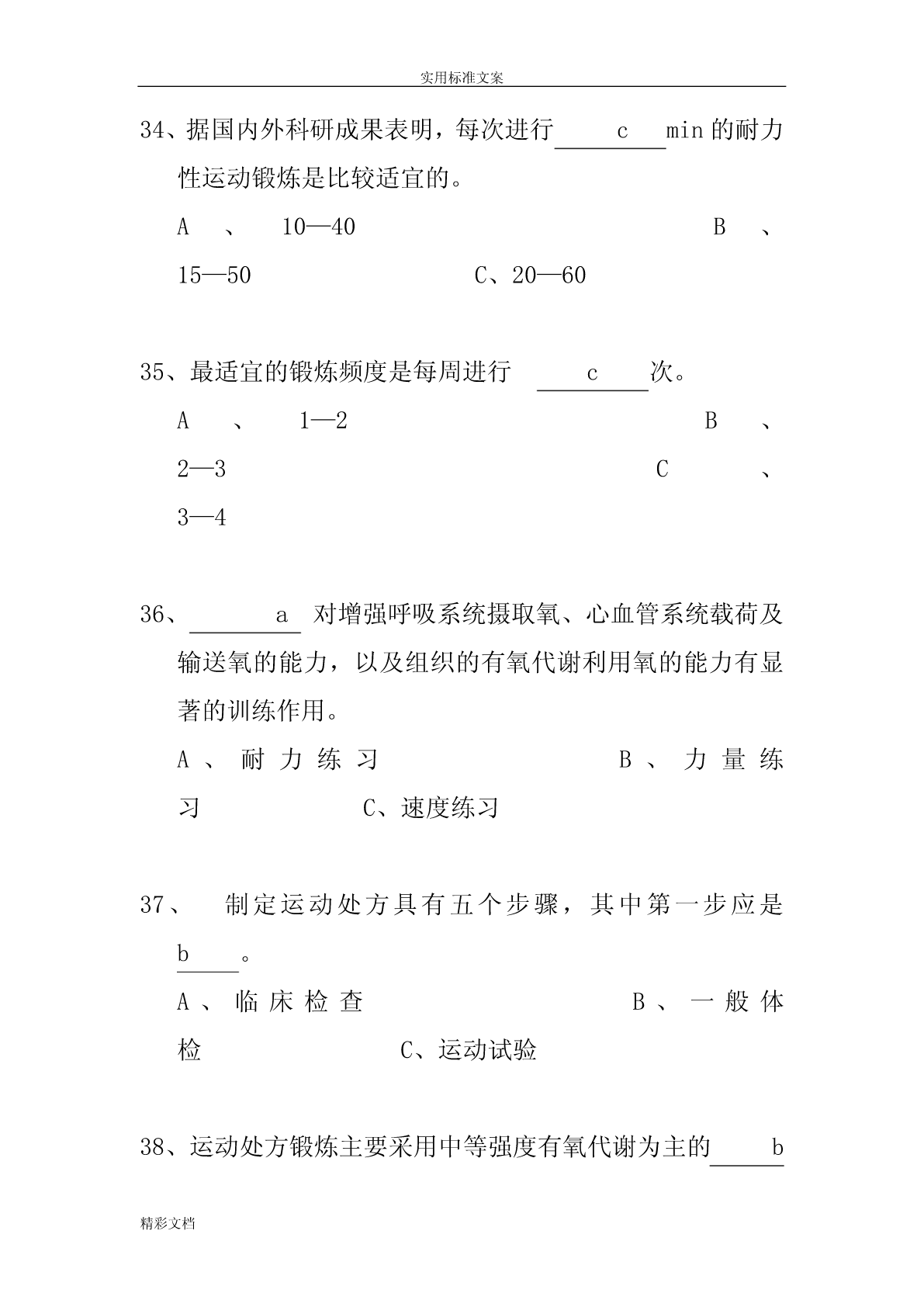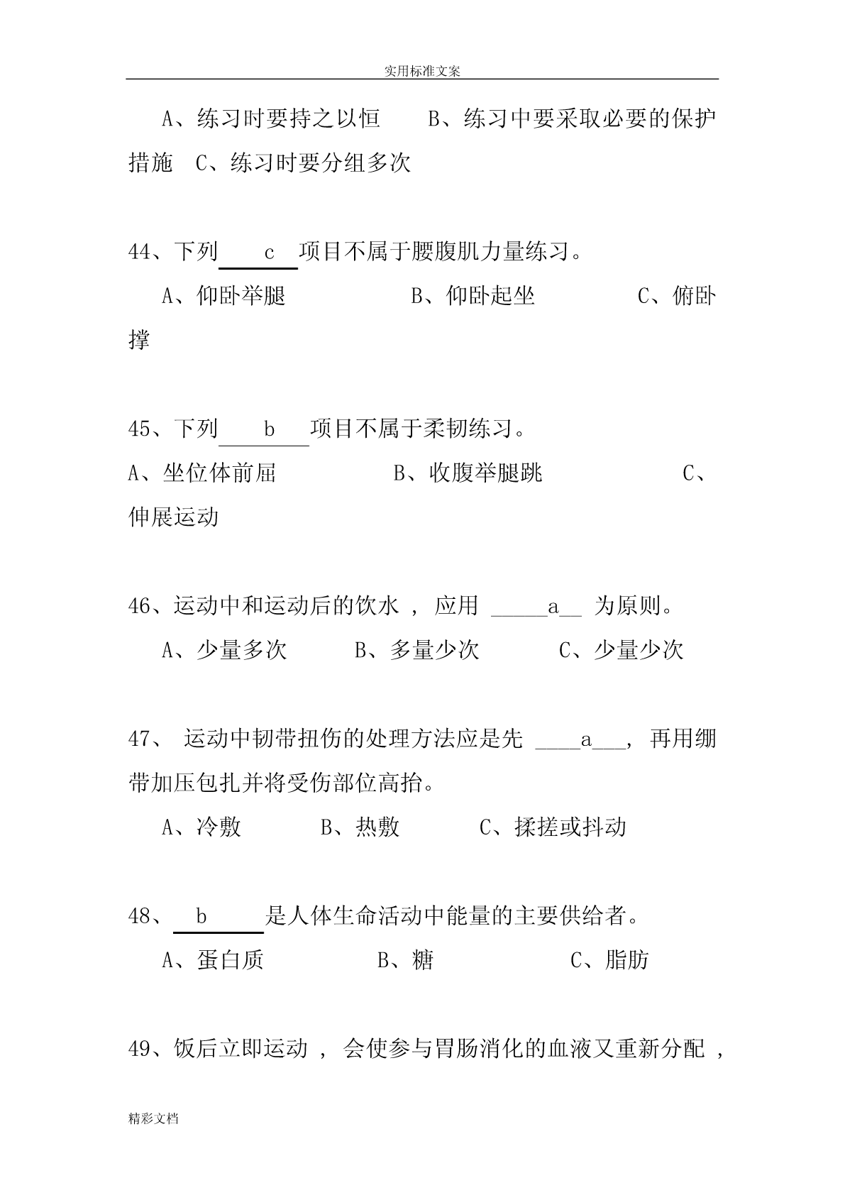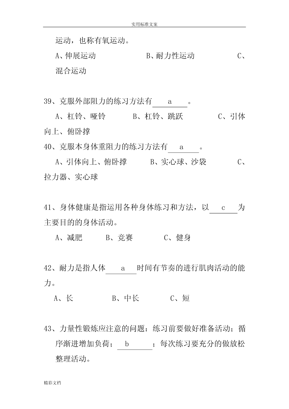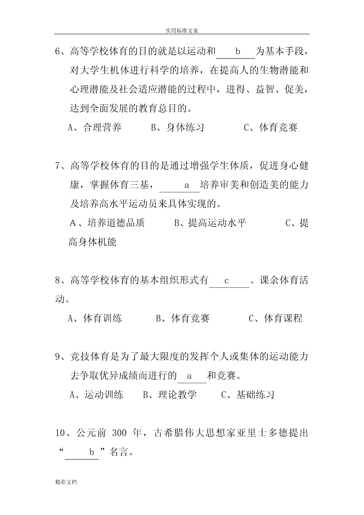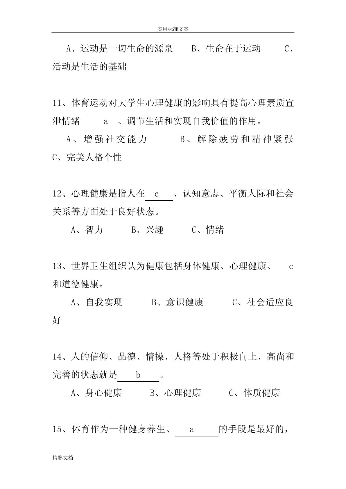 实用标准文案理论课试题1、体育是一种特殊的社会现象,它是以发展身体,增强体质、增进健康为基本特征的教育过程和___c___活动。A、生产B、劳动C、社会文化2、现代体育的范畴包括竞技体育、__c____和群众体育三个A、中学体育B、大学体育C、学校体育3、学校体育是指通过体育课教学、__c___和训练以及运动竞赛等形式来增强学生体质、促进身心健康与智力发展、培养良好的道德品质与个性特征的教育过程。A、早操B、课间操C、课外体育锻炼4、群众体育是指广大国民以锻炼身体来增强体质、增进健康、调节精神和丰富社会文化生活为目的的___b___活动。A、经济B、体育C、商业5、体育的功能包括___a___、教育功能、娱乐功能。A、健身功能B、健美功能C、健康功能精彩文档实用标准文案6、高等学校体育的目的就是以运动和b为基本手段,对大学生机体进行科学的培养,在提高人的生物潜能和心理潜能及社会适应潜能的过程中,进得、益智、促美,达到全面发展的教育总目的。A、合理营养B、身体练习C、体育竞赛7、高等学校体育的目的是通过增强学生体质,促进身心健康,掌握体育三基,a培养审美和创造美的能力及培养高水平运动员来具体实现的。A、培养道德品质B、提高运动水平C、提高身体机能8、高等学校体育的基本组织形式有c、课余体育活动。A、体育训练B、体育竞赛C、体育课程9、竞技体育是为了最大限度的发挥个人或集体的运动能力去争取优异成绩而进行的a和竞赛。A、运动训练B、理论教学C、基础练习10、公元前300年,古希腊伟大思想家亚里士多德提出“b”名言。精彩文档实用标准文案A、运动是一切生命的源泉B、生命在于运动C、活动是生活的基础11、体育运动对大学生心理健康的影响具有提高心理素质宣泄情绪a、调节生活和实现自我价值的作用。A、增强社交能力B、解除疲劳和精神紧张C、完美人格个性12、心理健康是指人在c、认知意志、平衡人际和社会关系等方面处于良好状态。A、智力B、兴趣C、情绪13、世界卫生组织认为健康包括身体健康、心理健康、c和道德健康。A、自我实现B、意识健康C、社会适应良好14、人的信仰、品德、情操、人格等处于积极向上、高尚和完善的状态就是b。A、身心健康B、心理健康C、体质健康15、体育作为一种健身养生、a的手段是最好的,精彩文档实用标准文案并且可以伴随终身。A、延年益寿B、增长知识C、形体锻炼16、现代健康观的内涵包括b、心理因素和社会因素。A、遗传因素B、生物因素C、体育因素17、体育运动在改善心血管系统的形态结构和机能方面具有提高心肌用氧能力、b、降低血脂的作用。A、防止脑动脉硬化B、提高心力储备C、促进胃肠蠕动18、大学生常见的心理疾病包括神经官能症、c、精神分裂症。A、焦虑症B、恐惧症C、心身疾病19、运动可以增强社会交往能力,改善人际关系,尤其是a运动。A、户外B、足球C、健身20、一般来讲,信仰的形成,世界观的确立,是经过了较长时期的思想活动、b、心理活动和社会活动而取得。精彩文档实用标准文案A、身体活动B、生理活动C、物质基础21、c因素是大学生整体素质的重要组成部分,是大学生成才、成功的重要的非智力因素,更是大学生的健康因素。A、形象B、气质C、性格22、人类环境包括自然环境和a环境,它们是影响人体健康的重要因素。A、社会B、运动C、生活23、健康是人一生关注的永恒主题,树立“b”的理念,将对人类的发展的社会进步,对我国在新世纪的改革与发展产生深远的影响。A、比赛第一B、健康第一C、友谊第一24、大脑只占人体重的2%,但它需要的氧气却要由心脏总流血量的20%来供应,比肌肉工作时所需血液量多b。A、10%—15%B、15%—20%C、20%—25%精彩文档实用标准文案25、b是指人的信仰、品德、情操、人格等处于积极向上、高尚和完善的状态。A、心理健康B、道德健康C、身体健康26、运动处方锻炼主要是采用a运动A、有氧B、无氧C、有氧与无氧相结合的27、持续5分钟以上尚有余力的运动称为c。A、有氧运动B、无氧运动C、恒常运动28、根据运动时心率和强度相关关系标准,心率160次/分钟的锻炼强度大约是a。A、80%B、70%C、60%29、从运动生理来说,a是全身耐力运动所需的最短时间。A、5minB、10minC、15min精彩文档实用标准文案30、健身锻炼的运动量一般用运动强度与c的乘积来表示。A、运动量B、运动