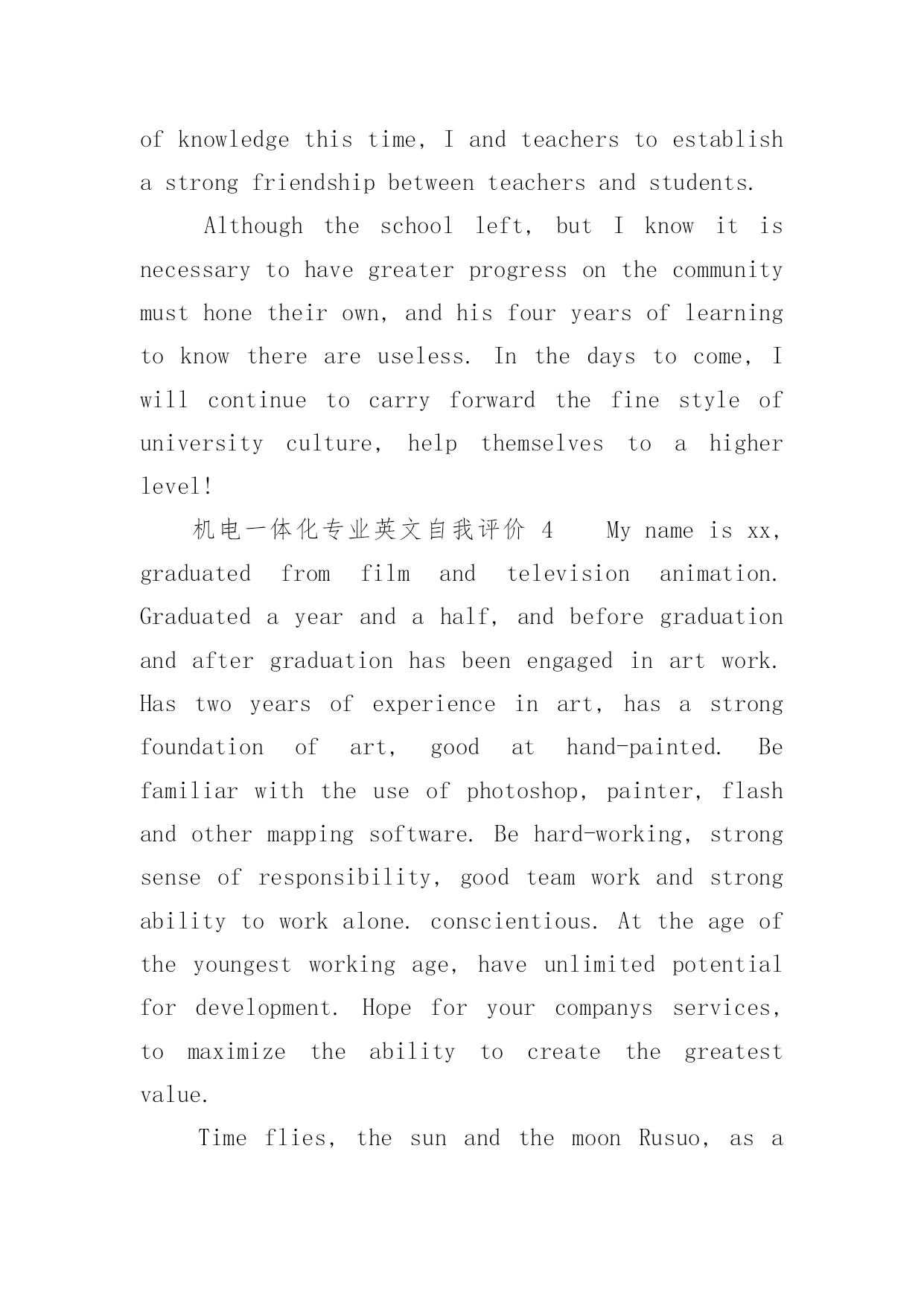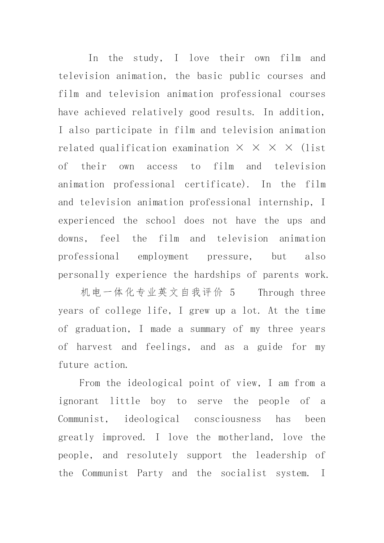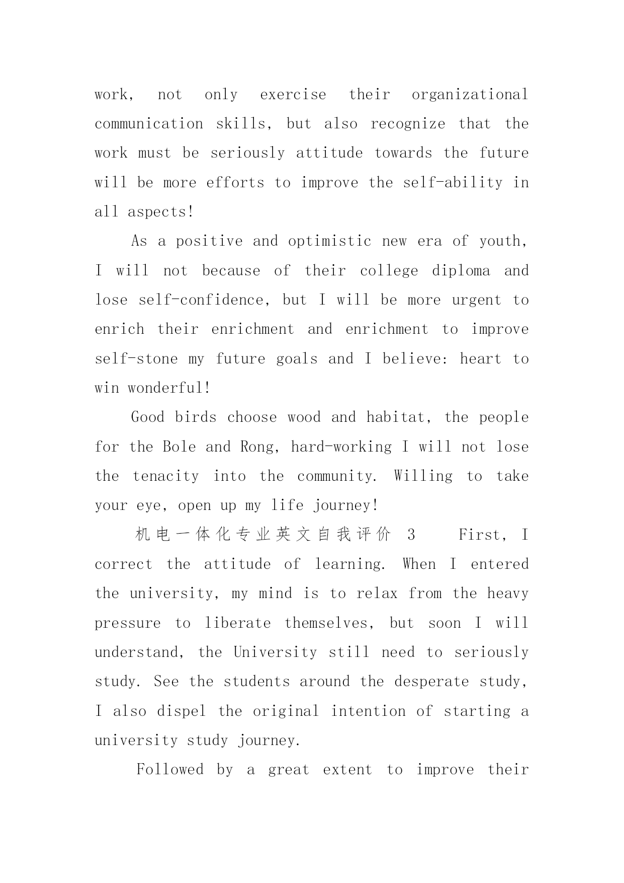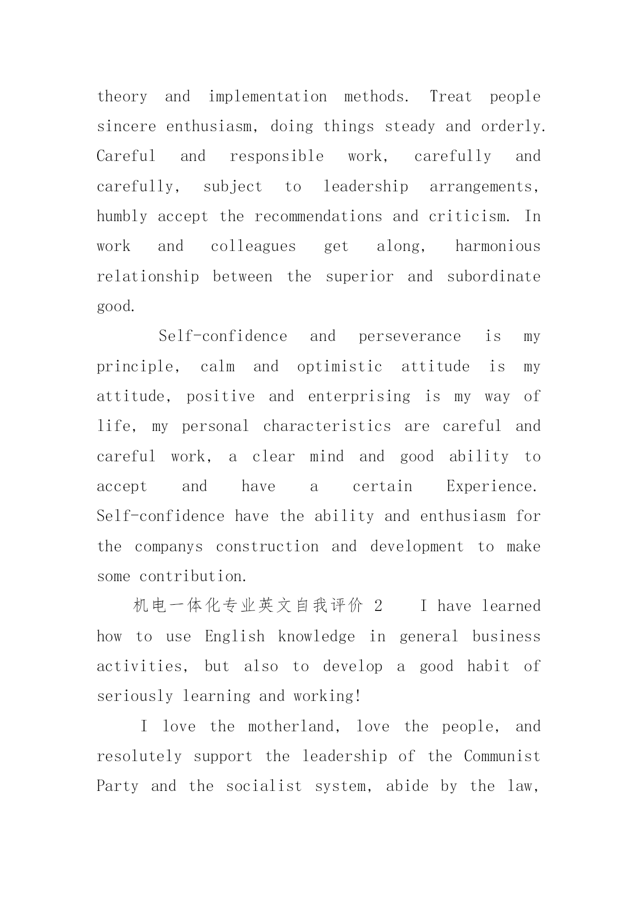 机电一体化专业英文自我评价机电一体化专业英文自我评价(通用6篇)在日复一日的学习、工作或生活中,我们都不可避免地要写自我评价,自我评价是人的自我概念的重要内容之一。如何写一份恰当的自我评价呢?以下是小编收集整理的机电一体化专业英文自我评价,希望能够帮助到大家。机电一体化专业英文自我评价1Inthecourseoftheirwork,combinedwithpersonalexpertise,dedicatedtopersonalpositions,excellentandsuccessfulcompletionoftheirwork;learnwithanopenmind,constantlyimprovethemselvesinthework.Goodatcommunicatingwithothers,haveastrongaffinity;aflexiblemind,quickthinking,thecouragetobearthepressuretobeabletoindependentlyanalyzeandsolveproblems;optimistic,withastrongsenseofresponsibility,totheoverallsituation,withothersverygoodToexchangeandcooperation.Yearsofmechanicalautomationworkexperience,familiarwiththeoperationandmanagementofenterprises,withstrongcommunicationskills,goodatbuildingefficientworkteam.Familiarwithinternet/intranettechnology,familiarwitherptheoryandimplementationmethods.Treatpeoplesincereenthusiasm,doingthingssteadyandorderly.Carefulandresponsiblework,carefullyandcarefully,subjecttoleadershiparrangements,humblyaccepttherecommendationsandcriticism.Inworkandcolleaguesgetalong,harmoniousrelationshipbetweenthesuperiorandsubordinategood.Self-confidenceandperseveranceismyprinciple,calmandoptimisticattitudeismyattitude,positiveandenterprisingismywayoflife,mypersonalcharacteristicsarecarefulandcarefulwork,aclearmindandgoodabilitytoacceptandhaveacertainExperience.Self-confidencehavetheabilityandenthusiasmforthecompanysconstructionanddevelopmenttomakesomecontribution.机电一体化专业英文自我评价2IhavelearnedhowtouseEnglishknowledgeingeneralbusinessactivities,butalsotodevelopagoodhabitofseriouslylearningandworking!Ilovethemotherland,lovethepeople,andresolutelysupporttheleadershipoftheCommunistPartyandthesocialistsystem,abidebythelaw,lovepublicproperty,unitethestudents,helpfulness.Andtothepeopleofallages,Ihaveagoodmoraleducation,andhaveastrongpoliticalorientation.Pragmaticandrealisticspiritofenthusiasmtoparticipateinschoolpublicityandpatrioticactivities,inthefreshmanparticipatedinthecollegepartyschooltraining,smoothgraduation.Inthestudy,Itryto