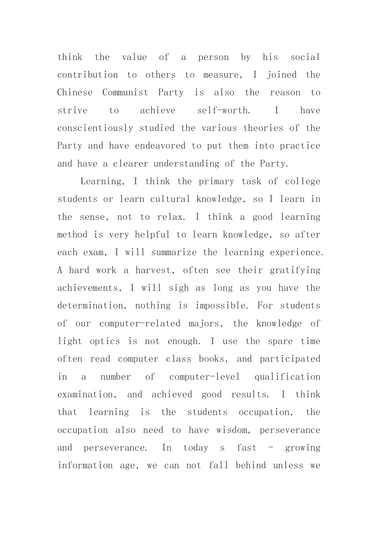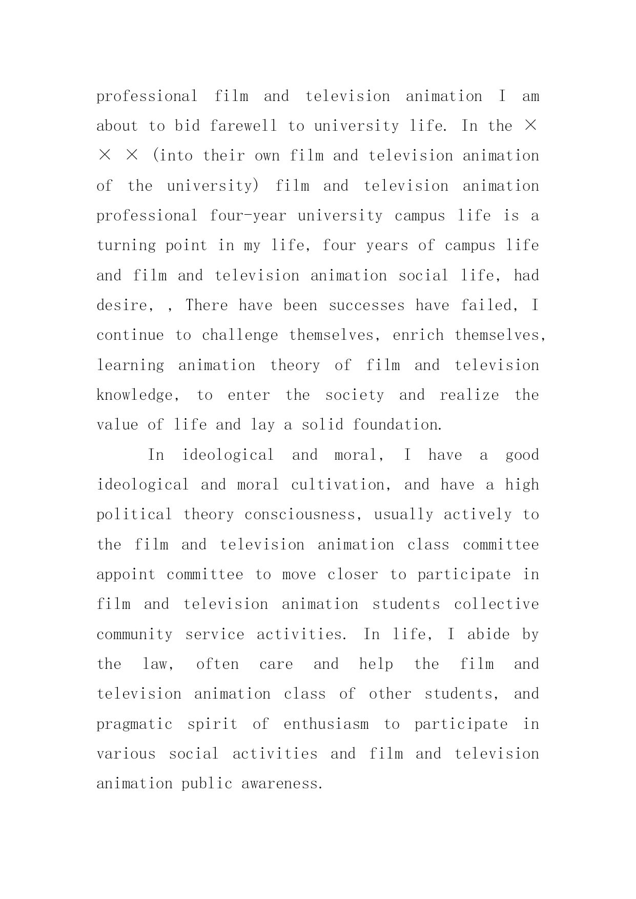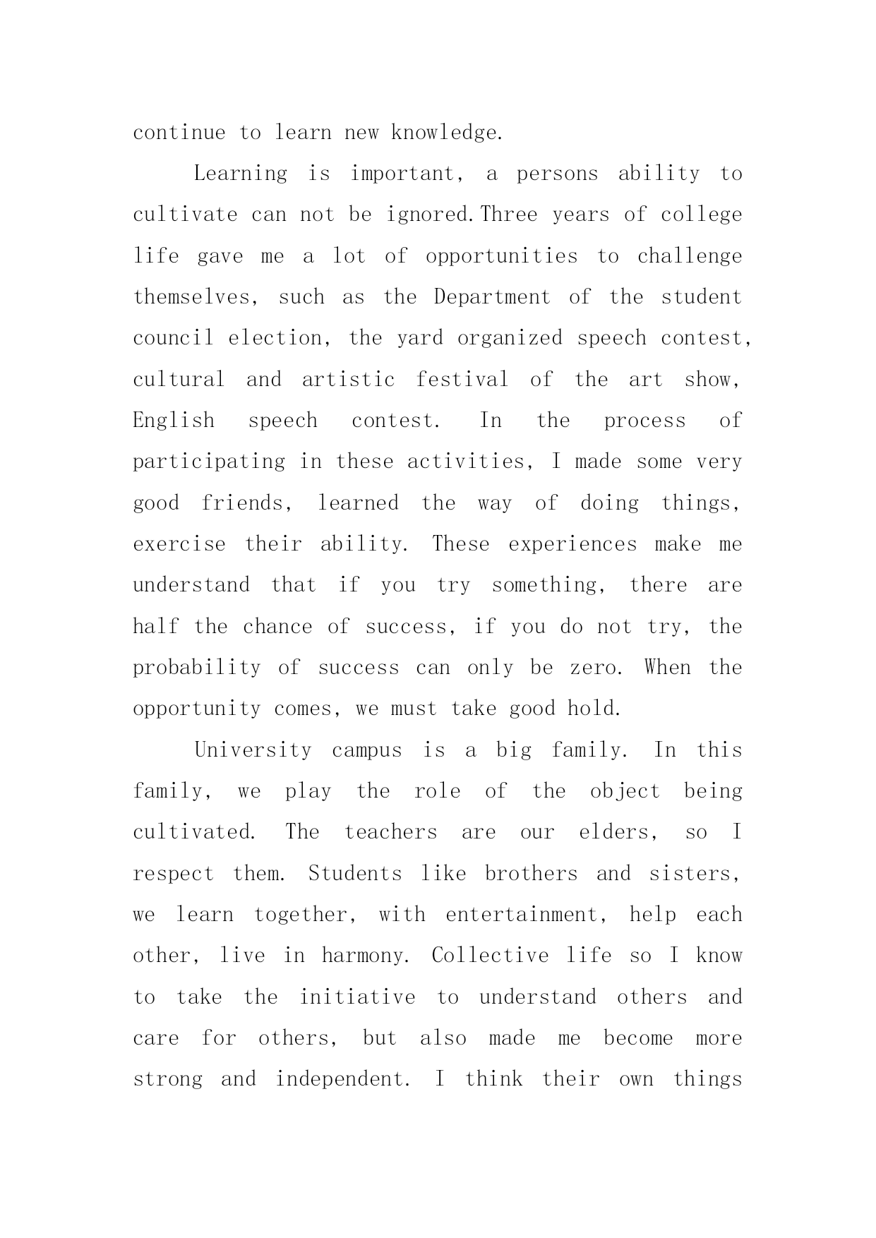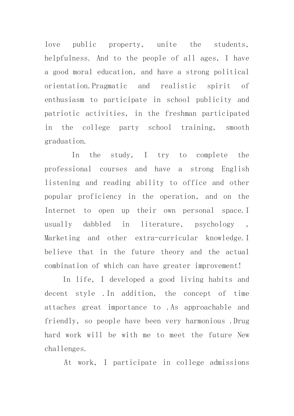 机电一体化专业英文自我评价机电一体化专业英文自我评价(通用6篇)在日复一日的学习、工作或生活中,我们都不可避免地要写自我评价,自我评价是人的自我概念的重要内容之一。如何写一份恰当的自我评价呢?以下是小编收集整理的机电一体化专业英文自我评价,希望能够帮助到大家。机电一体化专业英文自我评价1Inthecourseoftheirwork,combinedwithpersonalexpertise,dedicatedtopersonalpositions,excellentandsuccessfulcompletionoftheirwork;learnwithanopenmind,constantlyimprovethemselvesinthework.Goodatcommunicatingwithothers,haveastrongaffinity;aflexiblemind,quickthinking,thecouragetobearthepressuretobeabletoindependentlyanalyzeandsolveproblems;optimistic,withastrongsenseofresponsibility,totheoverallsituation,withothersverygoodToexchangeandcooperation.Yearsofmechanicalautomationworkexperience,familiarwiththeoperationandmanagementofenterprises,withstrongcommunicationskills,goodatbuildingefficientworkteam.Familiarwithinternet/intranettechnology,familiarwitherptheoryandimplementationmethods.Treatpeoplesincereenthusiasm,doingthingssteadyandorderly.Carefulandresponsiblework,carefullyandcarefully,subjecttoleadershiparrangements,humblyaccepttherecommendationsandcriticism.Inworkandcolleaguesgetalong,harmoniousrelationshipbetweenthesuperiorandsubordinategood.Self-confidenceandperseveranceismyprinciple,calmandoptimisticattitudeismyattitude,positiveandenterprisingismywayoflife,mypersonalcharacteristicsarecarefulandcarefulwork,aclearmindandgoodabilitytoacceptandhaveacertainExperience.Self-confidencehavetheabilityandenthusiasmforthecompanysconstructionanddevelopmenttomakesomecontribution.机电一体化专业英文自我评价2IhavelearnedhowtouseEnglishknowledgeingeneralbusinessactivities,butalsotodevelopagoodhabitofseriouslylearningandworking!Ilovethemotherland,lovethepeople,andresolutelysupporttheleadershipoftheCommunistPartyandthesocialistsystem,abidebythelaw,lovepublicproperty,unitethestudents,helpfulness.Andtothepeopleofallages,Ihaveagoodmoraleducation,andhaveastrongpoliticalorientation.Pragmaticandrealisticspiritofenthusiasmtoparticipateinschoolpublicityandpatrioticactivities,inthefreshmanparticipatedinthecollegepartyschooltraining,smoothgraduation.Inthestudy,Itryto