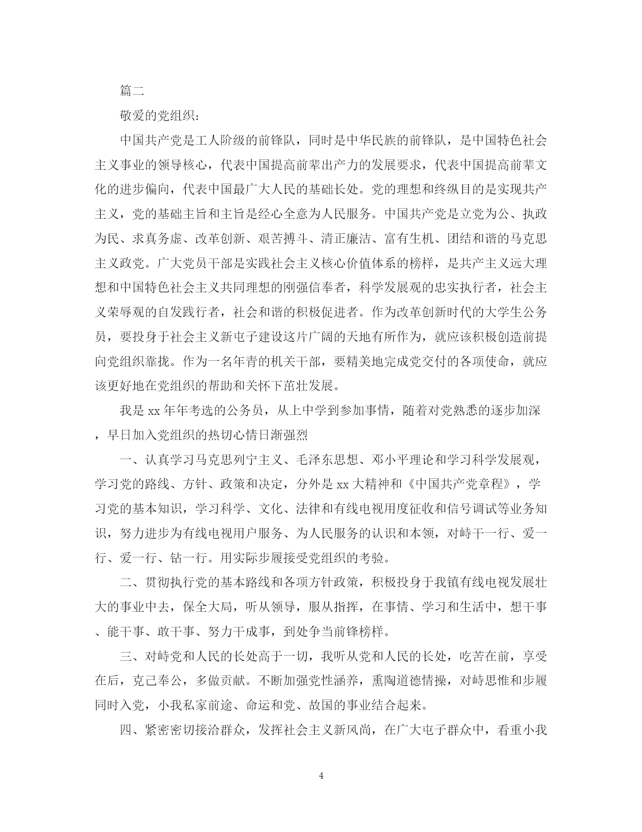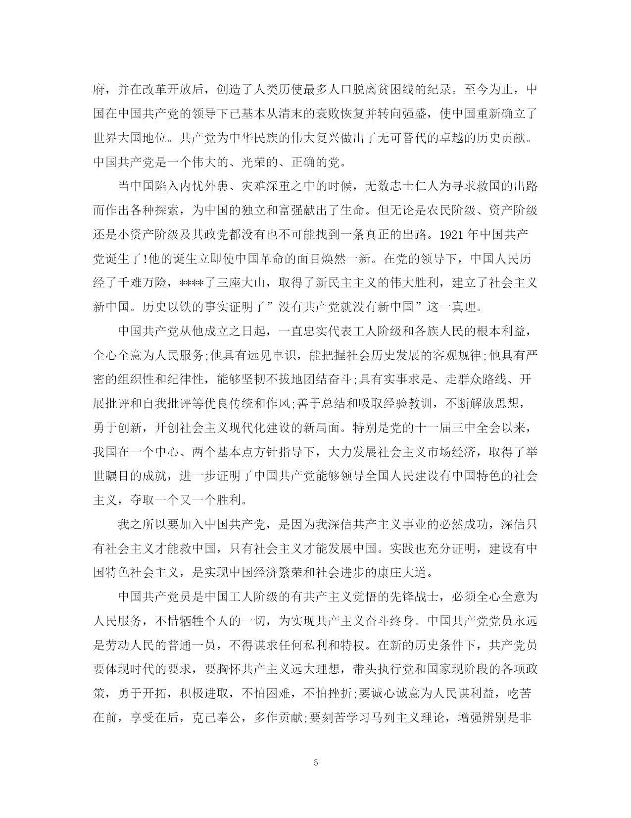 此资料由网络收集而来,如有侵权请告知上传者立即删除。资料共分享,我们负责传递知识。PAGEPAGE7公务员入党申请模板3000字篇一敬爱的党组织:我志愿加入中国共产党,愿意为共产主义事业奋斗终身。中国共产党是中国工人阶级的先锋队,是中国各族人民利益的踏实代表,是中国各族人民利益的忠实代表,是中国社会主义事业的领导核心。党的最终目的是实现共产主义的社会制度。我们党是以马列主义、毛泽东思想、邓**理论为指导思想的。自1921年中国共产党创建至今,已经走过了90年光荣的斗争道路。这几十年,中国共产党从小到大、从弱到强、从幼稚到成熟,不断发展壮大。党的辉煌历史,是中国共产党为民族解放和人民幸福,前赴后继,英勇奋斗的历史,是马克思主义原理同中国革命和建设的具体实践相结合的历史;是坚持真理,修正错误,战胜一切困难,不断发展壮大的历史。中国共产党无愧是伟大、光荣、正确的党,是中国革命和建设的坚强领导核心。实践证明:没有共产党就没有新中国!我们这一代年轻人,生长在新中国,我们成长的每一步,都与党的关怀有密切的联系。从小时起,党的光辉形象就牢牢地铭刻在我的心中,鼓舞着我前进。最后我们又通过学习文化、历史知识,知道中国共产党是中华人民共和国合法的执政党,是中国工人阶级的先锋队,是中国各族人民利益的忠实代表,是中国社会主义事业的领导核心。共产党是从鸦片战争以来一个把中国最终从贫穷衰弱带入富强的政府,并在改革开放后,创造了人类历使最多人口脱离贫困线的纪录。至今为止,中国在中国共产党的领导下已基本从清末的衰败恢复并转向强盛,使中国重新确立了世界大国地位。共产党为中华民族的伟大复兴做出了无可替代的卓越的历史贡献。中国共产党是一个伟大的、光荣的、正确的党。当中国陷入内忧外患、灾难深重之中的时候,无数志士仁人为寻求救国的出路而作出各种探索,为中国的独立和富强献出了生命。但无论是农民阶级、资产阶级还是小资产阶级及其政党都没有也不可能找到一条真正的出路。1921年中国共产党诞生了!他的诞生立即使中国革命的面目焕然一新。在党的领导下,中国人民历经了千难万险,****了三座大山,取得了新民主主义的伟大胜利,建立了社会主义新中国。历史以铁的事实证明了”没有共产党就没有新中国”这一真理。中国共产党从他成立之日起,一直忠实代表工人阶级和各族人民的根本利益,全心全意为人民服务;他具有远见卓识,能把握社会历史发展的客观规律;他具有严密的组织性和纪律性,能够坚韧不拔地团结奋斗;具有实事求是、走群众路线、开展批评和自我批评等优良传统和作风;善于总结和吸取经验教训,不断解放思想,勇于创新,开创社会主义现代化建设的新局面。特别是党的十一届三中全会以来,我国在一个中心、两个基本点方针指导下,大力发展社会主义市场经济,取得了举世瞩目的成就,进一步证明了中国共产党能够领导全国人民建设有中国特色的社会主义,夺取一个又一个胜利。我之所以要加入中国共产党,是因为我深信共产主义事业的必然成功,深信只有社会主义才能救中国,只有社会主义才能发展中国。实践也充分证明,建设有中国特色社会主义,是实现中国经济繁荣和社会进步的康庄大道。中国共产党员是中国工人阶级的有共产主义觉悟的先锋战士,必须全心全意为人民服务,不惜牺牲个人的一切,为实现共产主义奋斗终身。中国共产党党员永远是劳动人民的普通一员,不得谋求任何私利和特权。在新的历史条件下,共产党员要体现时代的要求,要胸怀共产主义远大理想,带头执行党和国家现阶段的各项政策,勇于开拓,积极进取,不怕困难,不怕挫折;要诚心诚意为人民谋利益,吃苦在前,享受在后,克己奉公,多作贡献;要刻苦学习马列主义理论,增强辨别是非的能力力,掌握做好本职工作的知识和本领,努力创造一流成绩;要在危急时刻挺身而出,维护国家和人民的利益,坚决同危害人民、危害社会、危害国家的行为作斗争。我决心用自己的实际行动接受党对我的考验,我郑重地向党提出申请:我志愿加入中国共产党,拥护党的纲领,遵守党的章程,履行党员义务,执行党的决定,严守党的纪律,保守党的秘密,对党忠诚,积极工作,为共产主义奋斗终身,随时准备为党和人民牺牲一切,永不叛党。今后我会更加努力地学习工作,认真学习马克思列宁主义、毛泽东思想、邓--理论,“三个代表”及“八荣八耻”,学习党的路线、方针、政策及决议,学习党的基本知识,学习科学、文化和业务知识,努力提高为人民服务的本领。时时刻刻以马克思列宁主义、毛泽东思想、邓小理论“三个代表”以及科学发展观等重要思想作为自己的行动指南,用三个”忠实代表”指导自己的思想和行动。坚持党和人民的利益高于一切,个人利益服从党和人民的利益,自觉遵守党的纪律和国家法律,严格保守党和国家的秘密,执行党的决定,服从组织分配,积极完成党的任务。维护党的团结和统一,对
