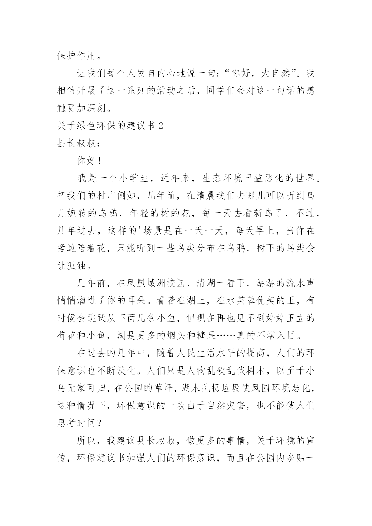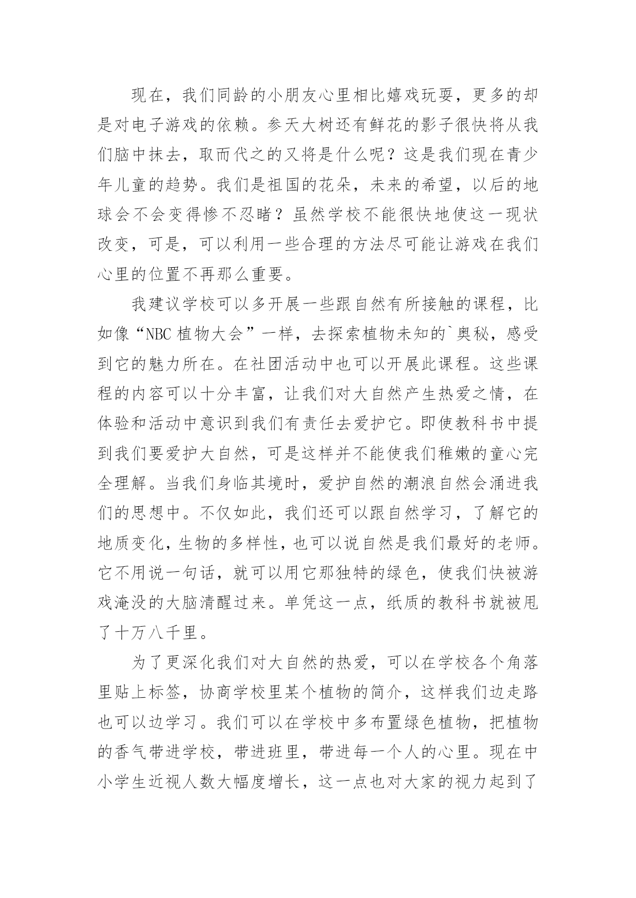 绿色环保的建议书关于绿色环保的建议书在不断进步的社会中,越来越多地方需要用到建议书,建议书可以充分调动各方面的积极因素,集中广大群众的智慧。相信许多人会觉得建议书很难写吧,下面是小编整理的关于绿色环保的建议书,仅供参考,大家一起来看看吧。关于绿色环保的建议书1我是生活在校园中的一名六年级学生。我热爱我们的校园,因为她美,她有着铺着绿纱的操场,绿荫上一栋栋被文化渲染的教学楼十分显眼,走廊旁的小花把校园装点得更美轮美奂;因为她有特色的课程表上不仅有主科和副科,还有法语课呢!我们的校园,一个充满欢声笑语的校园,可谓近乎完美,又有什么建议可提?学生,一个在漫漫读书路上不断探索和发现的群体。每天,我们都背上沉甸甸的书包,开始一天的学习。清晨,露珠“嘀嗒嘀嗒“的声音伴着我们郎朗的读书声回荡在校园里。紧接着,是一节又一节的课程。每到下课时,同学们都会一窝蜂地冲出去,打打羽毛球,放松心情,愉快跑进了每个人的心里。自习课上,我望着窗外的葱葱绿树,眼里充满了憧憬和向往之情,脑子里不断放映出体育课上我们欢快得如一只小鸟的情景,在林间飞翔,望着那没有一丝残云的蓝天,充满了幻想。现在,我们同龄的小朋友心里相比嬉戏玩耍,更多的却是对电子游戏的依赖。参天大树还有鲜花的影子很快将从我们脑中抹去,取而代之的又将是什么呢?这是我们现在青少年儿童的趋势。我们是祖国的花朵,未来的希望,以后的地球会不会变得惨不忍睹?虽然学校不能很快地使这一现状改变,可是,可以利用一些合理的方法尽可能让游戏在我们心里的位置不再那么重要。我建议学校可以多开展一些跟自然有所接触的课程,比如像“NBC植物大会”一样,去探索植物未知的`奥秘,感受到它的魅力所在。在社团活动中也可以开展此课程。这些课程的内容可以十分丰富,让我们对大自然产生热爱之情,在体验和活动中意识到我们有责任去爱护它。即使教科书中提到我们要爱护大自然,可是这样并不能使我们稚嫩的童心完全理解。当我们身临其境时,爱护自然的潮浪自然会涌进我们的思想中。不仅如此,我们还可以跟自然学习,了解它的地质变化,生物的多样性,也可以说自然是我们最好的老师。它不用说一句话,就可以用它那独特的绿色,使我们快被游戏淹没的大脑清醒过来。单凭这一点,纸质的教科书就被甩了十万八千里。为了更深化我们对大自然的热爱,可以在学校各个角落里贴上标签,协商学校里某个植物的简介,这样我们边走路也可以边学习。我们可以在学校中多布置绿色植物,把植物的香气带进学校,带进班里,带进每一个人的心里。现在中小学生近视人数大幅度增长,这一点也对大家的视力起到了保护作用。让我们每个人发自内心地说一句:“你好,大自然”。我相信开展了这一系列的活动之后,同学们会对这一句话的感触更加深刻。关于绿色环保的建议书2县长叔叔:你好!我是一个小学生,近年来,生态环境日益恶化的世界。把我们的村庄例如,几年前,在清晨我们去哪儿可以听到鸟儿婉转的乌鸦,年轻的树的花,每一天去看新鸟了,不过,几年过去,这样的'场景是在一天一天,每天早上,当你在旁边陪着花,只能听到一些鸟类分布在乌鸦,树下的鸟类会让孤独。几年前,在凤凰城洲校园、清湖一看下,潺潺的流水声悄悄溜进了你的耳朵。看着在湖上,在水芙蓉优美的玉,有时候会跳跃从下面几条小鱼,但现在再也见不到婷婷玉立的荷花和小鱼,湖是更多的烟头和糖果……真的不堪入目。在过去的几年中,随着人民生活水平的提高,人们的环保意识也不断淡化。人们只是人物乱砍乱伐树木,以至于小鸟无家可归,在公园的草坪,湖水乱扔垃圾使凤园环境恶化,这种情况下,环保意识的一段由于自然灾害,也不能使人们思考时间?所以,我建议县长叔叔,做更多的事情,关于环境的宣传,环保建议书加强人们的环保意识,而且在公园内多贴一些标志,提醒环保意识的穷人,最好能把更多的在公园内一些垃圾桶,这样才能使我们的家园更加美丽!让地球更好地造福人类!