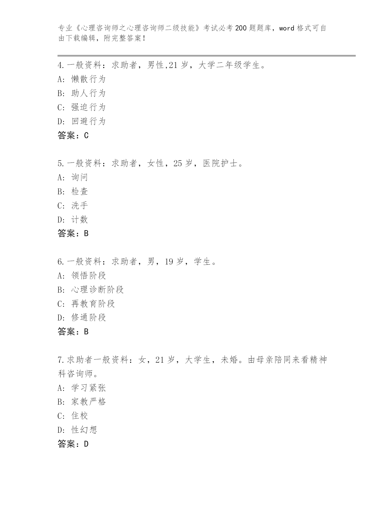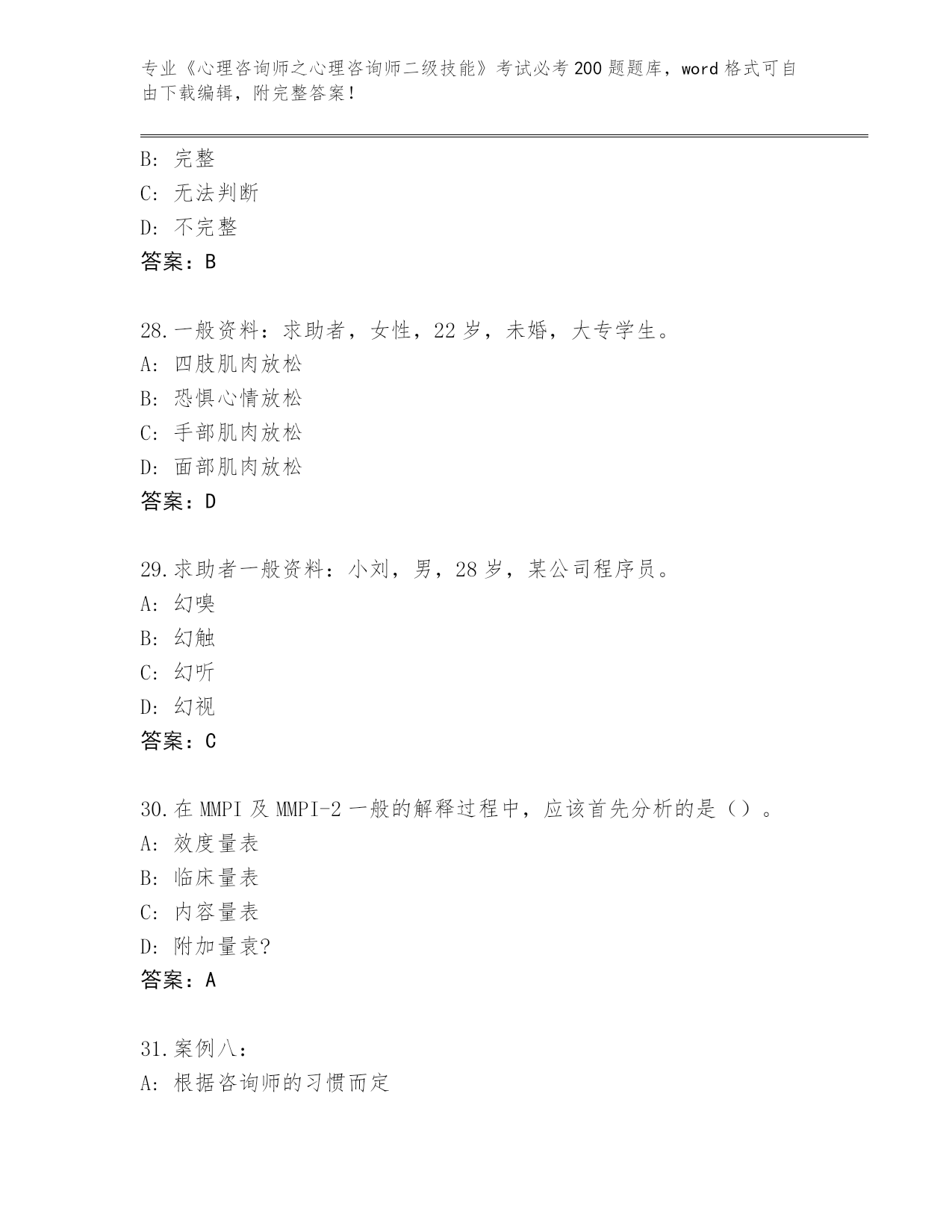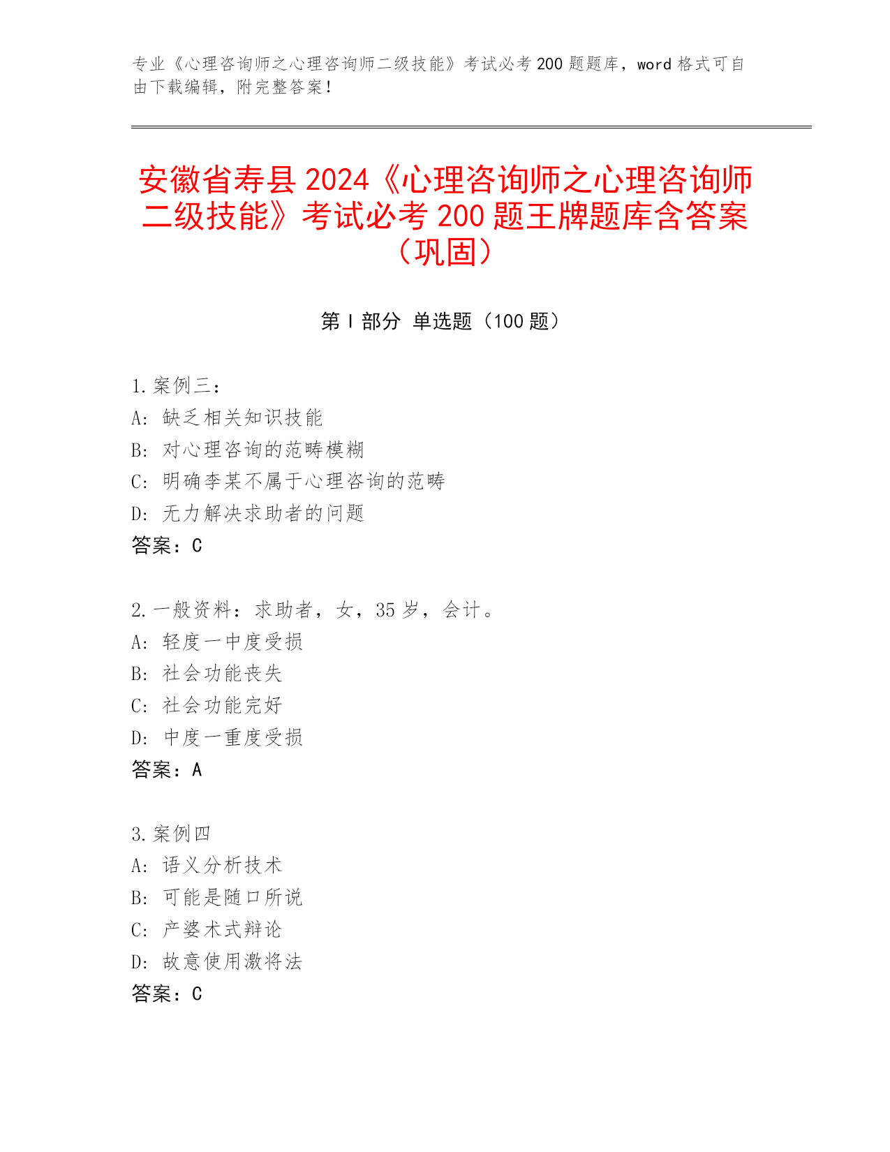 安徽省寿县2024《心理咨询师之心理咨询师二级技能》考试必考200题王牌题库含答案(巩固)