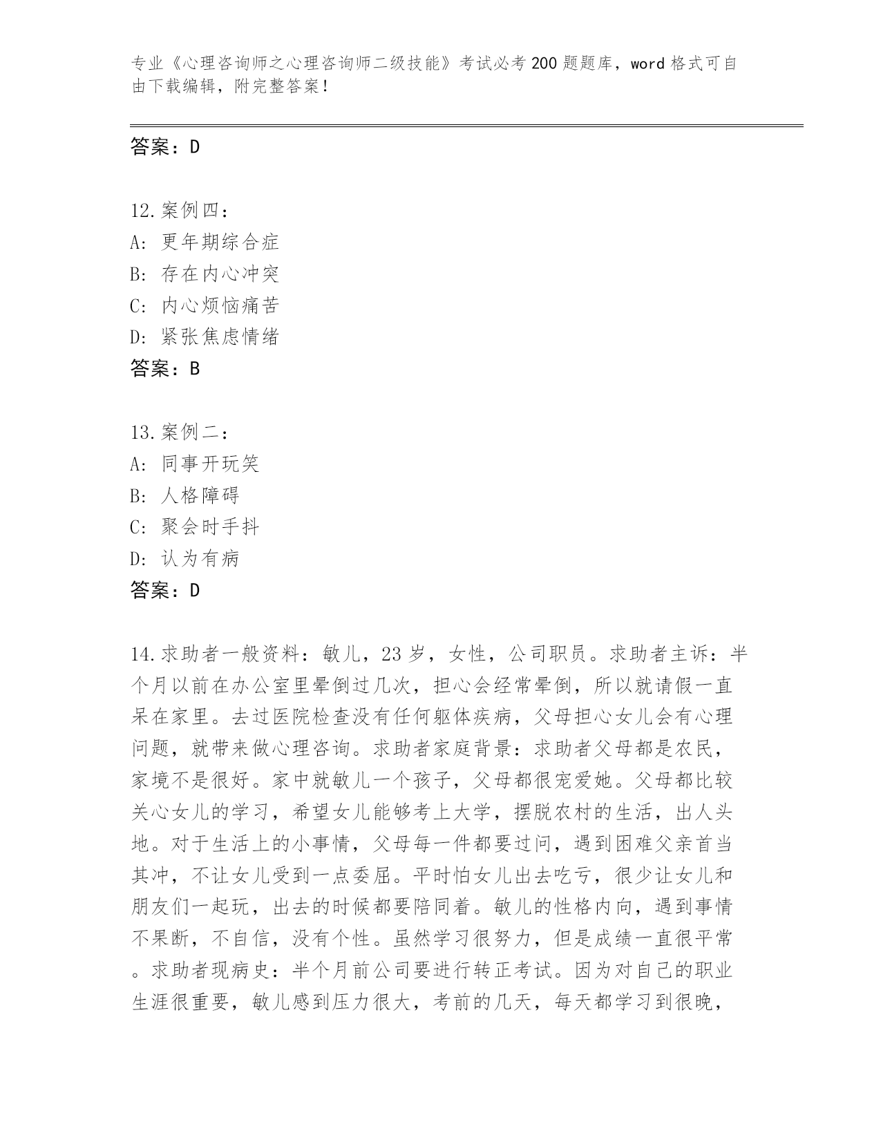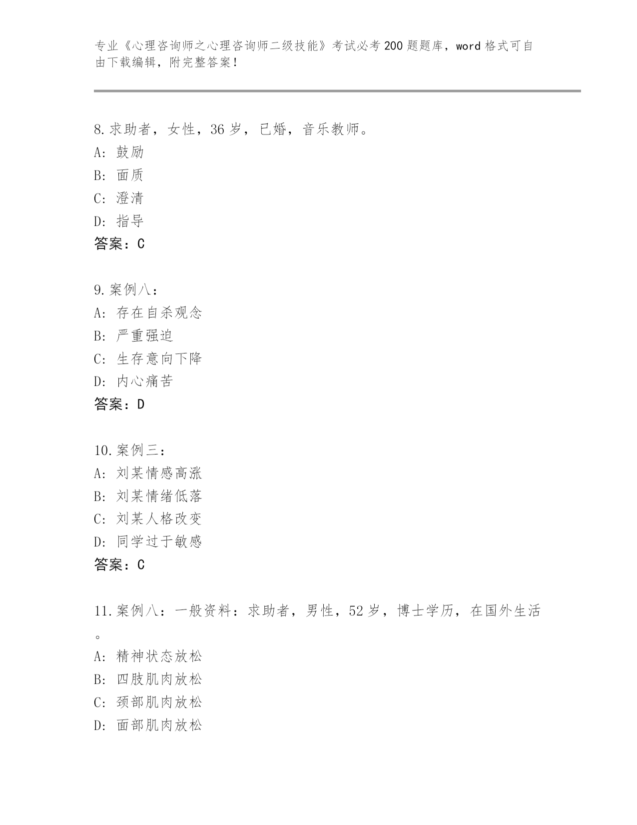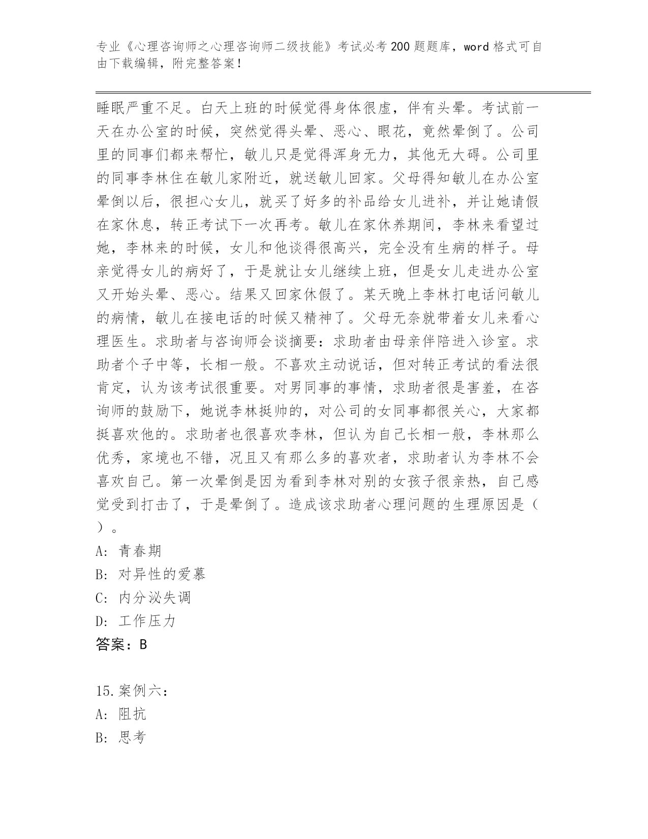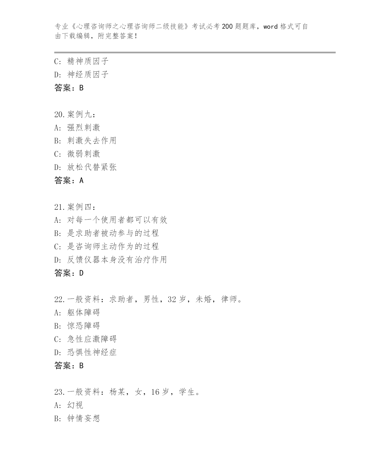 安徽省寿县2024《心理咨询师之心理咨询师二级技能》考试必考200题王牌题库含答案(巩固)