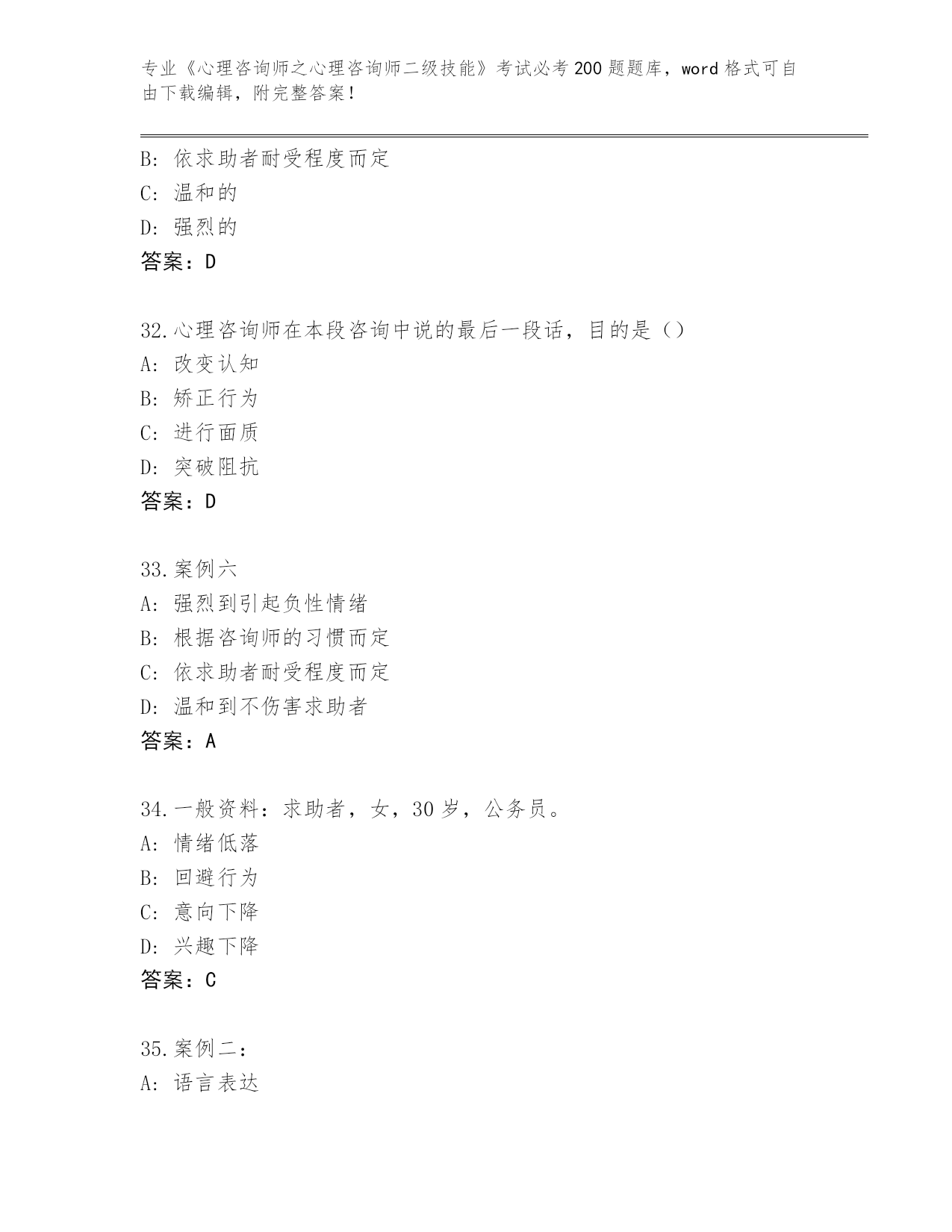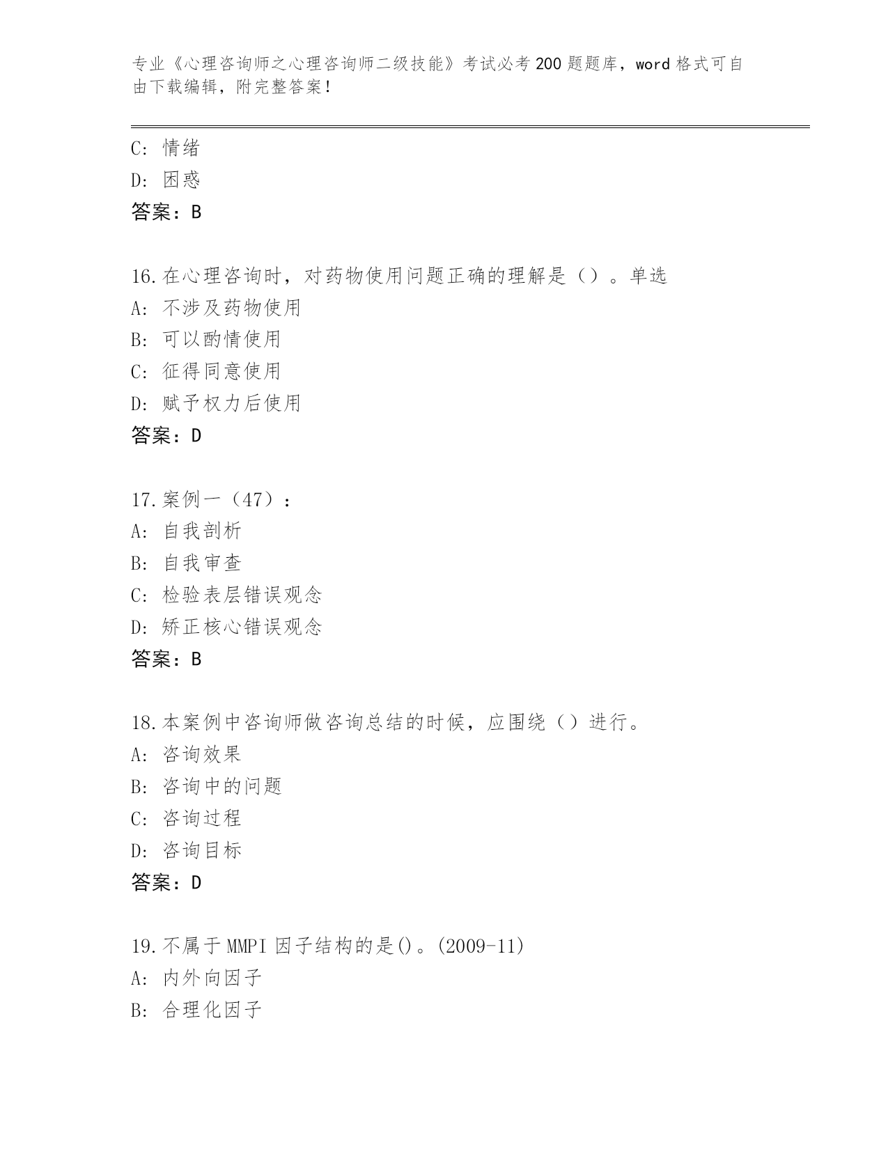 安徽省埇桥区《心理咨询师之心理咨询师二级技能》考试必考200题王牌题库【名师系列】