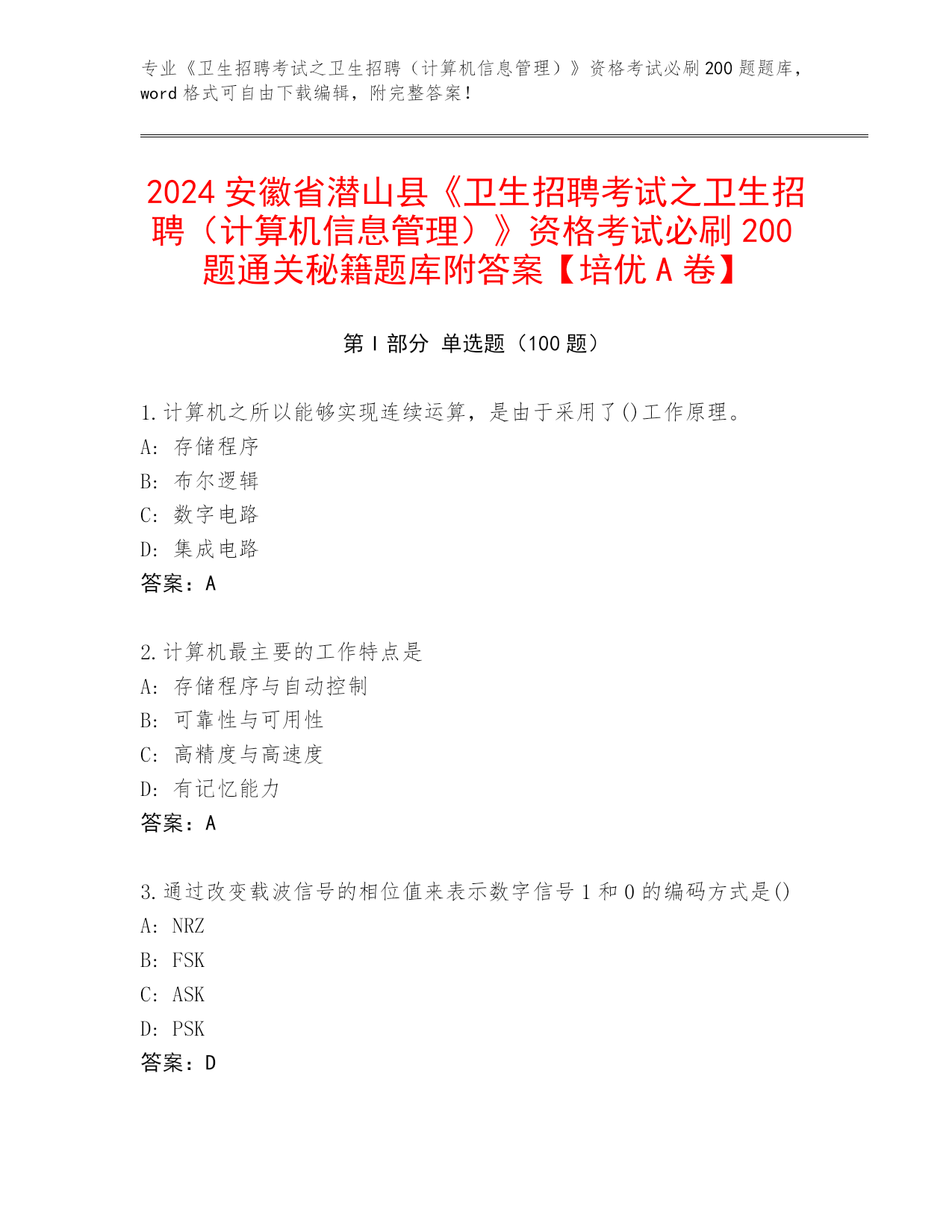 2024安徽省潜山县《卫生招聘考试之卫生招聘(计算机信息管理)》资格考试必刷200题通关秘籍题库附答案【培优A卷】