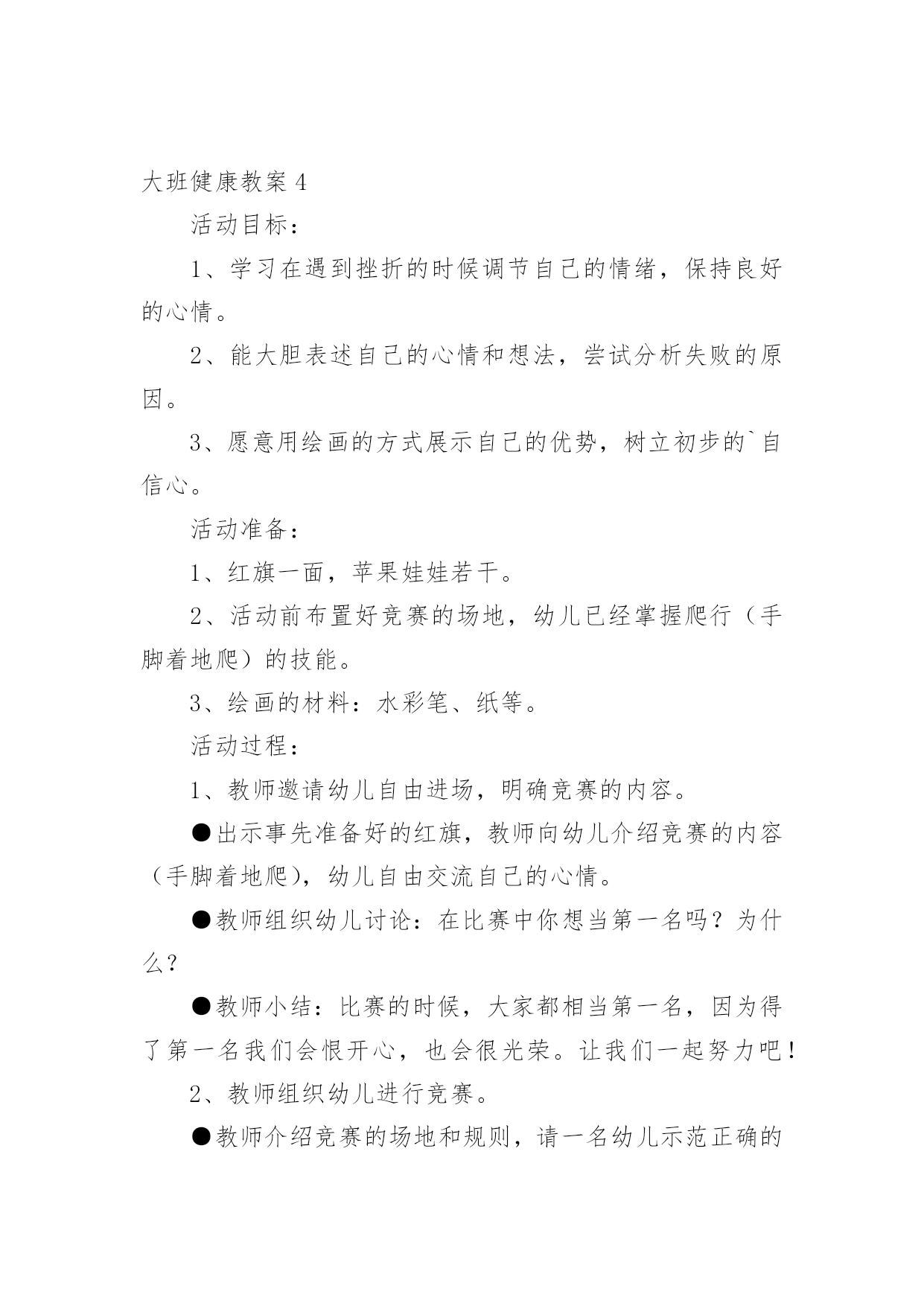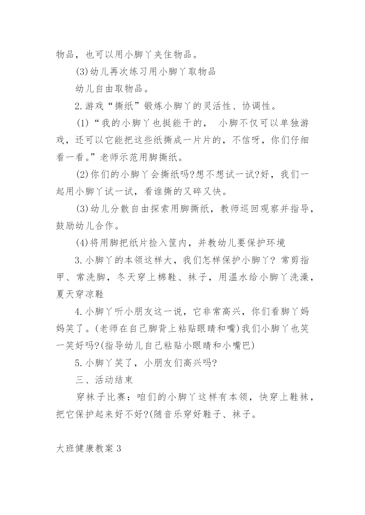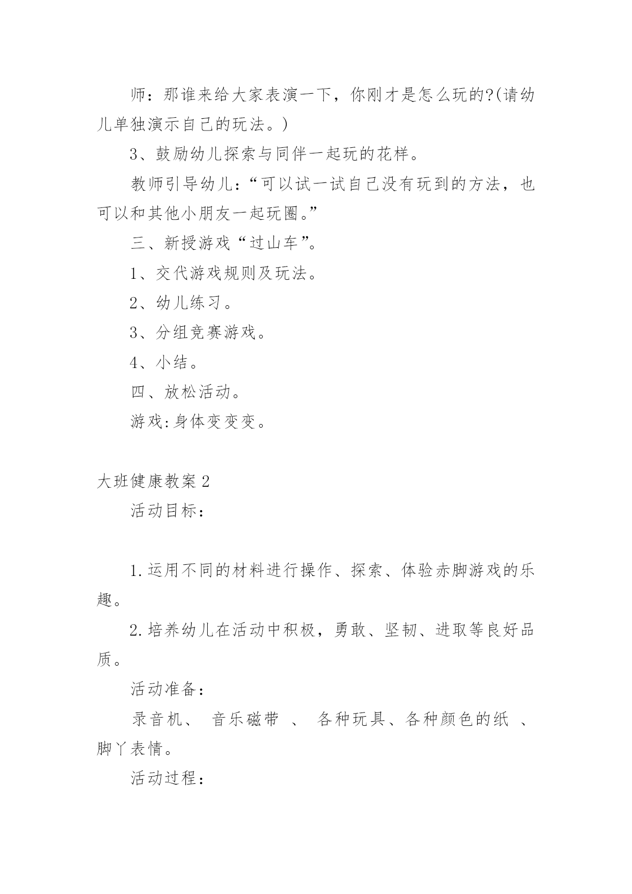 大班健康教案【荐】大班健康教案作为一位杰出的教职工,常常需要准备教案,编写教案有利于我们准确把握教材的重点与难点,进而选择恰当的教学方法。写教案需要注意哪些格式呢?以下是小编精心整理的大班健康教案,欢迎大家分享。大班健康教案1活动目标:1、能主动尝试、探索圈的不同玩法。2、喜欢与同伴合作游戏,愿意与他人交流、分享不同的玩法。3、体验体育活动的乐趣。活动准备:教师和幼儿每人一个呼啦圈、音机、磁带、事先布置好的活动场地。活动过程:一、热身运动:在音乐伴奏下,幼儿同教师做圈操。二、初步探索圈的多种玩法:1、自由探索尝试圈的不同玩法。教师以提问的方式引起幼儿参与活动的`兴趣:“圈有很多玩法,你们想不想和它做游戏?比比看谁的玩法最多。”2、请幼儿展示自己的玩法,大家一起练习。师:那谁来给大家表演一下,你刚才是怎么玩的?(请幼儿单独演示自己的玩法。)3、鼓励幼儿探索与同伴一起玩的花样。教师引导幼儿:“可以试一试自己没有玩到的方法,也可以和其他小朋友一起玩圈。”三、新授游戏“过山车”。1、交代游戏规则及玩法。2、幼儿练习。3、分组竞赛游戏。4、小结。四、放松活动。游戏:身体变变变。大班健康教案2活动目标:1.运用不同的材料进行操作、探索、体验赤脚游戏的乐趣。2.培养幼儿在活动中积极,勇敢、坚韧、进取等良好品质。活动准备:录音机、音乐磁带、各种玩具、各种颜色的纸、脚丫表情。活动过程:一、活动导入1.幼儿听音乐走入活动场地。(脚跟脚尖、跑跑跑)2.幼儿进行脱鞋,脱袜子(教师讲清规则)师:新的一天来到了,小脚丫要开心地出来活动了。请幼儿脱鞋袜,坐在地毯上。(老师也光脚)仔细看一看,我们的小脚丫都有什么呀?自己说一说。脚背(用手拍一拍)、脚趾头(自己动一动)。脚指甲(手指敲一敲)、脚后跟(拳头捶一捶)。3.做脚操:主要做脚腕,脚趾,小腿等部位。把小脚丫伸出来,挠一挠脚心有什么感觉?(痒)幼儿互相挠一挠,抓一抓,用脚趾互相挠一挠,看一看感觉一样不一样。小脚丫伸一伸,小脚趾勾一勾。4.在音乐伴奏下,师生一起用小脚做不同动作。(用脚尖走路、跳舞、见面打招呼、互相拥抱、碰一碰、蹬车等)。二、提供活动材料,幼儿自由探索、交流游戏。1.幼儿创造性地用小脚丫取东西,锻炼小脚的肌肉力量和协调,发展思维(1)练习用小脚取物品:师:今天我为大家准备了好多玩的东西,请你用你的小脚把它送到我这儿来。想一想,你打算怎样做?(2)幼儿自由创造性地用小脚丫送物品,教师巡回指导。小结幼儿的'方法。请一,二个幼儿示范。师:其实每位小朋友的小脚丫都很能干,它可以把不同的物品用不一样的方法送到其它地方去,可以用小脚丫抓住物品,也可以用小脚丫夹住物品。(3)幼儿再次练习用小脚丫取物品幼儿自由取物品。2.游戏“撕纸”锻炼小脚丫的灵活性、协调性。(1)“我的小脚丫也挺能干的,小脚不仅可以单独游戏,还可以它能把这些纸撕成一片片的,不信呀,你们仔细看一看。”老师示范用脚撕纸。(2)你们的小脚丫会撕纸吗?想不想试一试?好,我们一起用小脚丫试一试,看谁撕的又碎又快。(3)幼儿分散自由探索用脚撕纸,教师巡回观察并指导,鼓励幼儿合作。(4)将用脚把纸片捡入筐内,并教幼儿要保护环境3.小脚丫的本领这样大,我们怎样保护小脚丫?常剪指甲、常洗脚,冬天穿上棉鞋、袜子,用温水给小脚丫洗澡,夏天穿凉鞋4.小脚丫听小朋友这一说,它非常高兴,你们看脚丫妈妈笑了。(老师在自己脚背上粘贴眼睛和嘴)我们小脚丫也笑一笑好吗?(指导幼儿自己粘贴小眼睛和小嘴巴)5.小脚丫笑了,小朋友们高兴吗?三、活动结束穿袜子比赛:咱们的小脚丫这样有本领,快穿上鞋袜,把它保护起来好不好?(随音乐穿好鞋子、袜子。大班健康教案3设计背景现在,随着社会物质和文化生活的提高,幼儿阅读、绘画、看电视等学习和娱乐活动已普及和经常化,这给幼儿教师和家长提出了培养幼儿学习卫生习惯的任务。幼儿园健康教育一方面要努力为增进幼儿健康创造良好的客观条件,另一方面要抓好培养幼儿良好的习惯与能力,帮助幼儿掌握生活中最基本的安全知识和技能,提高自我保护能力。在活动设计环节中我采用了游戏教学法,通过摸摸猜猜的方法吸引了幼儿的注意力,幼儿很快就了解了眼睛的重要性。另外,我还增加了幼儿看录像的环节,在这环节中幼儿通过观察和比较,找出了不正确的坐姿,避免了幼儿在以后的生活中做出不正确的做法。活动目标1、初步了解眼睛的结构,知道眼睛的功能。2、初步懂得保护眼睛的重要,注意用眼卫生。3、初步培养幼儿关心、帮助他人的愿望。4、了解主要症状,懂得预防和治疗的自我保护意识。5、初步了解健康的小常识。活动重点、难点重点:懂得保护眼睛的重要,注意用眼卫生。难点:教育幼儿在生活中关心、帮助盲人。活动准备课件《小眼睛,要爱护》、眼罩与幼儿人数相等、五官图片一副活动过程(一)、谜语:“上边毛,下边毛