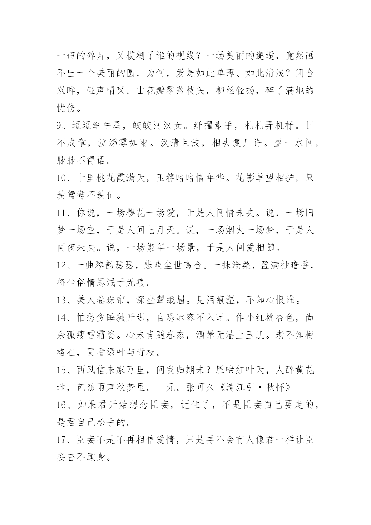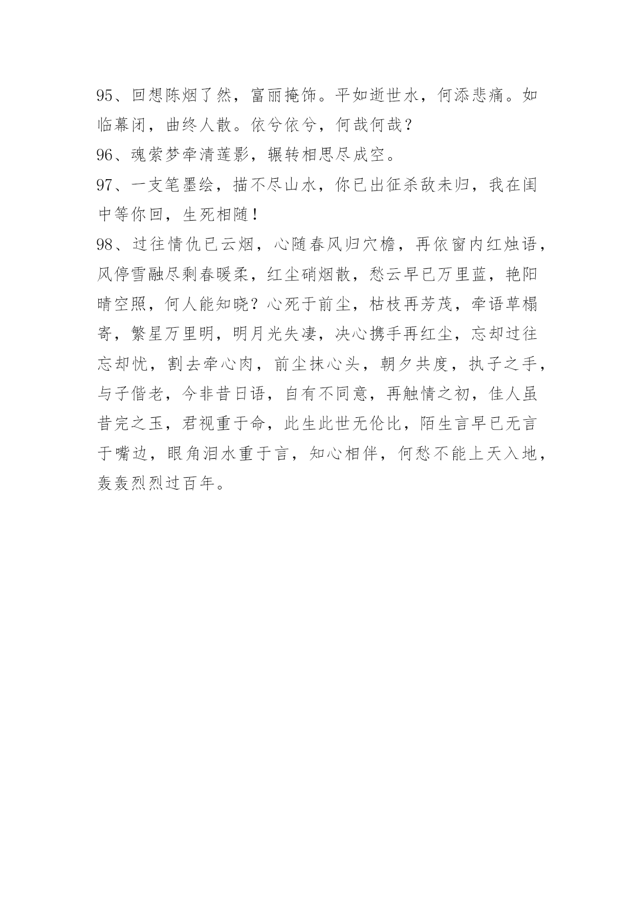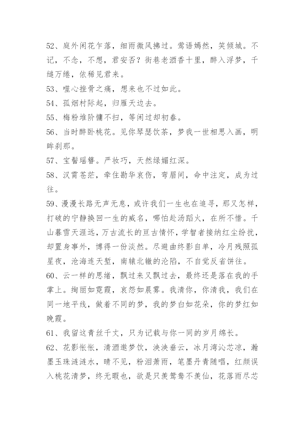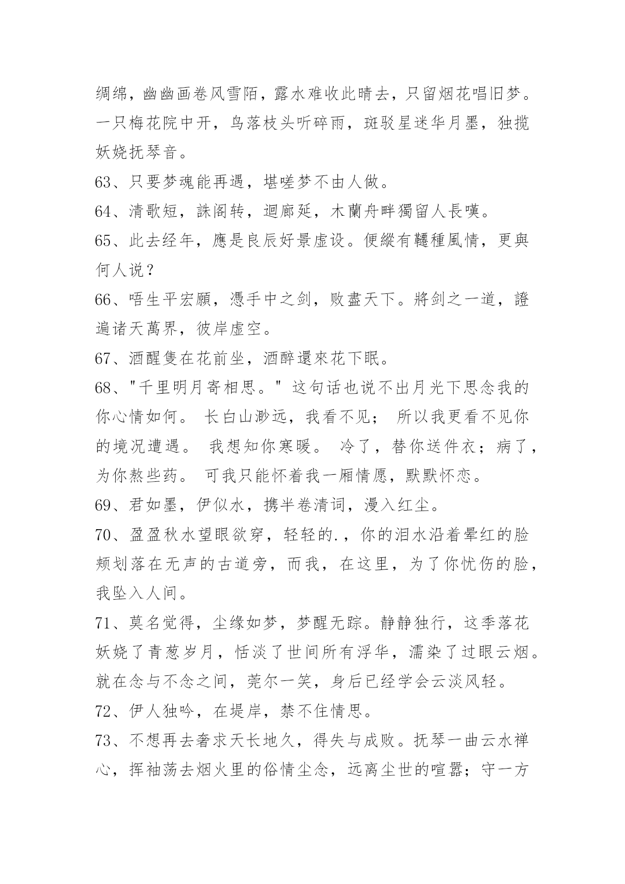 文艺古风句子98条2022年精选文艺古风句子集锦98条臣妾对河外星系一无所知对君,也是一样。以下是小编整理的文艺古风句子98条,仅供参考,希望能够帮助到大家。1、朦胧夙愿,幽幽难书,问情谁在红尘踌躇?月下,默记情愫。轻轻一撩过那些难忘,带着伤痕的脚印,踏上笔尖,流一出一片沧桑,曾月前相约,而今、容与飘落,暗香付阡陌。依稀姿态如昨,千叠素笺成碑刻,却书落英寞。尘嚣渐远、岂无执著,更谢春红、倩风何日重临阁。期待、徘徊、深沉、寂寞着。2、一根香烟一把刀,根根能把寿命削.劝君远离香烟害,身体健康乐逍遥.3、静研墨思,淡描素笺。清风幽梦,入君画香。4、花影压重门,疏帘铺淡月,好黄昏。二年三度负东君,归来也,着意过今春。5、山有木兮木有枝,心悦君兮不复返。水有花兮花有时,心爱君兮君不在。6、秋江楚雁宿沙洲,雁宿沙洲浅水流。流水浅洲沙宿雁,洲沙宿雁楚江秋。7、云淡月婆娑,风来幻境多。薇啼血泪,杜宇动悲歌。雨惊残夜,涓流汇巨波。龙待何日,投笔握长戈。8、凝眸问月,记否?一纸的墨香,曾经清晰了谁的双眸?一帘的碎片,又模糊了谁的视线?一场美丽的邂逅,竟然画不出一个美丽的圆,为何,爱是如此单薄、如此清浅?闭合双眸,轻声喟叹。由花瓣零落枝头,柳丝轻扬,碎了满地的忧伤。9、迢迢牵牛星,皎皎河汉女。纤擢素手,札札弄机杼。日不成章,泣涕零如雨。汉清且浅,相去复几许。盈一水间,脉脉不得语。10、十里桃花霞满天,玉簪暗暗惜年华。花影单望相护,只羡鸳鸯不羡仙。11、你说,一场樱花一场爱,于是人间情未央。说,一场旧梦一场空,于是人间七月天。说,一场烟火一场梦,于是人间夜未央。说,一场繁华一场景,于是人间爱相随。12、一曲琴韵瑟瑟,悲欢尘世离合。一抹沧桑,盈满袖暗香,将尘俗情思泯于无痕。13、美人卷珠帘,深坐颦蛾眉。见泪痕湿,不知心恨谁。14、怕愁贪睡独开迟,自恐冰容不入时。作小红桃杏色,尚余孤瘦雪霜姿。心未肯随春态,酒晕无端上玉肌。老不知梅格在,更看绿叶与青枝。15、西风信来家万里,问我归期未?雁啼红叶天,人醉黄花地,芭蕉雨声秋梦里。—元。张可久《清江引·秋怀》16、如果君开始想念臣妾,记住了,不是臣妾自己要走的,是君自己松手的。17、臣妾不是不再相信爱情,只是再不会有人像君一样让臣妾奋不顾身。18、臣妾才不管这些,臣妾要天下皆在臣妾手,还怕逆不了这小小乾坤。19、臣妾多想住在君心里一辈子,可是臣妾怕君的心是臣妾暂时租来的。20、凭什么臣妾要永远对君保持不灭的热情,毕竟君又没有对臣妾多好。21、箫声幽咽处,灯火已阑珊。月相思何处,倚栏宫商凝露。尽离怀,寄情歌赋,回首往事难驻。开花谢,欲留春长住,奈何,奈何,流年难属。红尘难度,禅语何处。情伤感无数,此生痴恋君心顾。梦一曲春宵度,惊醒缠绵如雾。高水远,寒暑共赴。负,不负,风雨同路。22、一瓣花,一半月。时聚,一生别。杯歌,一盏乐。日圆,一月缺。23、醉听素琴,浅笑诗吟,凄寒半世留殇铭。事霏微,来生青脆,红尘一恋心泣泪。度徘徊望乡边,思玉颜,梦回如前。不愿,刹那永恒,记忆留痕?谁又肯,相别伊人,惜昔回轮清霜喧阗,易碎誓言,忘川漪涟,心丝婵媛,奈何残垣,情逝千年,依稀回旋,红尘旧缘。24、醉漾轻舟,信流引到花深处。缘相误,无计花间住。水茫茫,千里斜阳暮。无数,乱红如雨,不记来时路。25、凭觞静忆去年秋,桐落故溪头。成自写红叶,和恨寄东流。脉脉,水悠悠。多愁。书不到,蝶梦无凭,漫倚高楼。26、玉炉香,红蜡泪,偏照画堂秋思。翠薄,鬓云残,夜长衾枕寒。桐树,三更雨,不道离情正苦。叶叶,一声声,空阶滴到明。27、九泉之下,雨帘,臣妾倾尽所有守护君。28、长长短短的头发,都是臣妾长长短短的心情。29、酒不能让臣妾醉,君却让臣妾心碎。30、君是臣妾一生都在期待的人呵。31、臣妾允许君骗臣妾,但请注意次数。32、叶儿,别忘了,百年之后,臣妾在地府等君。33、朝暮不依长相思,白首不离长相守。34、难过的时候去看烟花吧。看到烟花在天空中绚丽的绽放,臣妾相信只要努力君的生活亦会如此。35、草色没春光,花影曳沉城。36、转身,一缕冷香远,逝雪深,笑意浅。你渡我,可愿?37、我愿为你洗尽铅华,你可否陪我打马天涯。38、那一山清幽为你安藏,那一世情殇为你流放。39、醉看今朝缘,歌尽倾君未眠,独看夜空月圆,怨自优柔寡断,素兮娆媚谁与共流年。40、纸扇轻摇,我为红颜,断弦三千。琴弦微动,你为花开,倾尽天下。41、徐风入夜花影斜,清灯暗许美人歇,几重相思几重叠。42、那一世你惊才绝艳五彩霓裳独冠,我蹉跎半生只求你一眼温情转。43、小桥流水轻轻浅浅地流淌;如瑟瑟秋风中的落叶缤纷,满地黄花,从从容容,随意潇洒;如饮清茶一杯,柔和醇香;是尘埃落定的坦然,是人生岁月的花开,是万丈红尘之中的静雅。44、花陌忧离殇,蝶殇衣舞悲。45、时光泻下年华,岁月叹过离殇