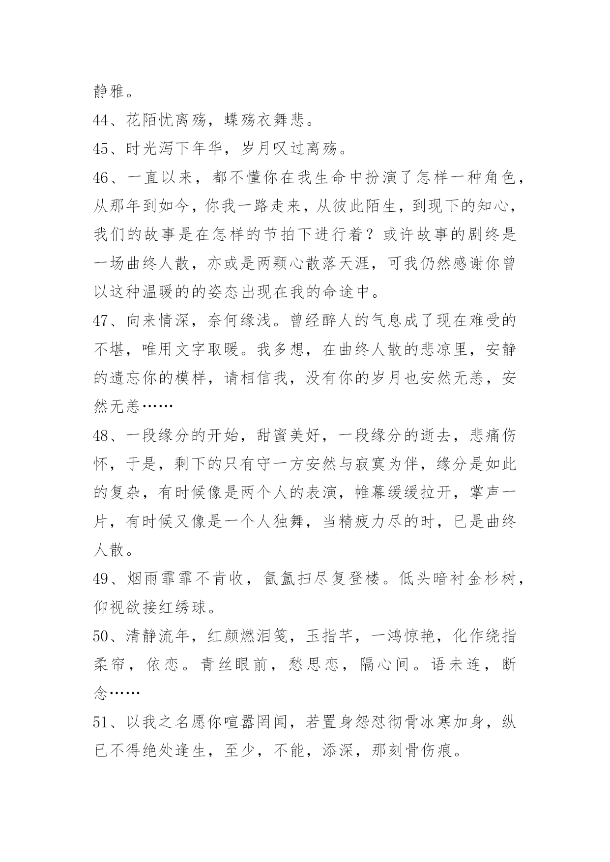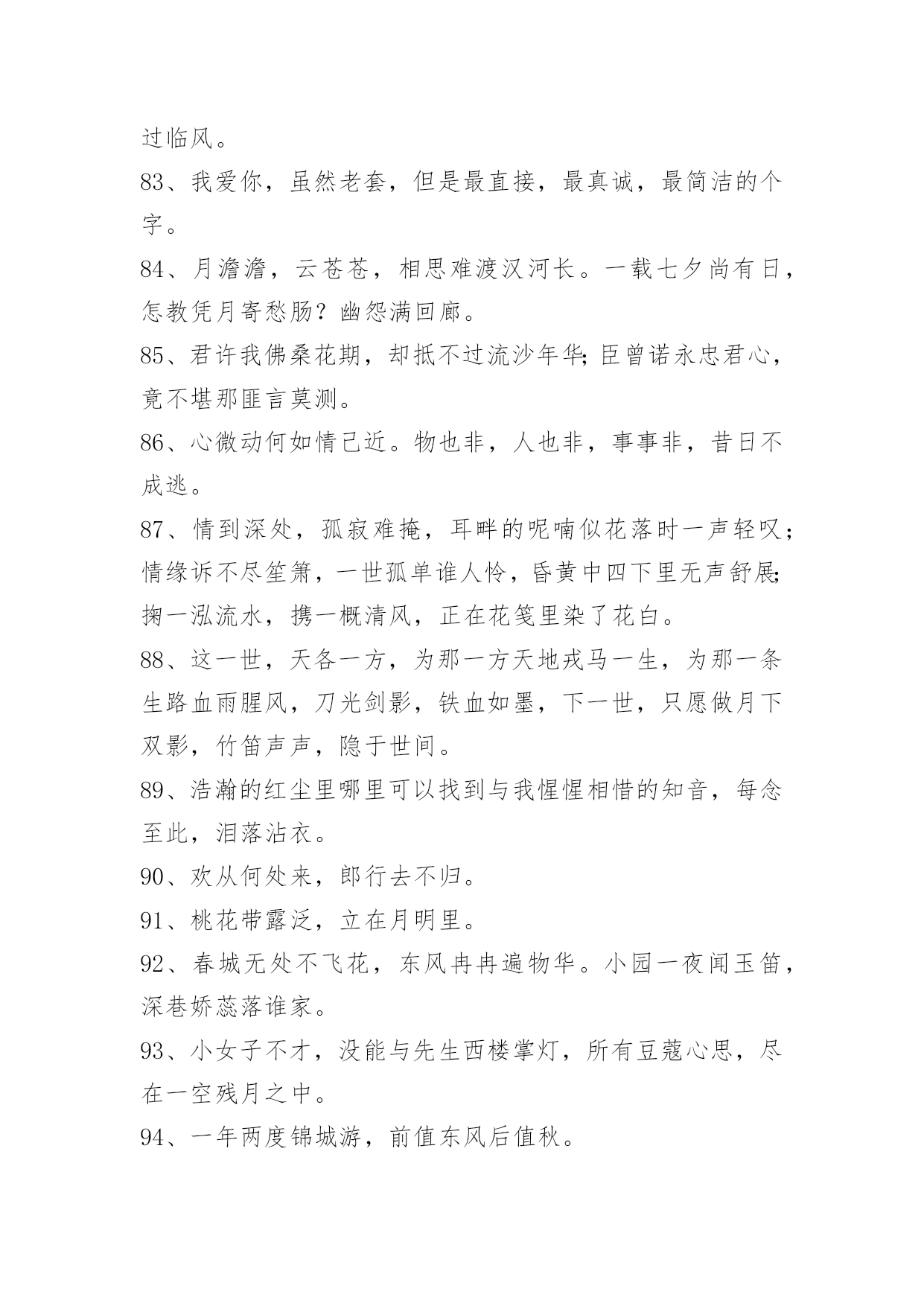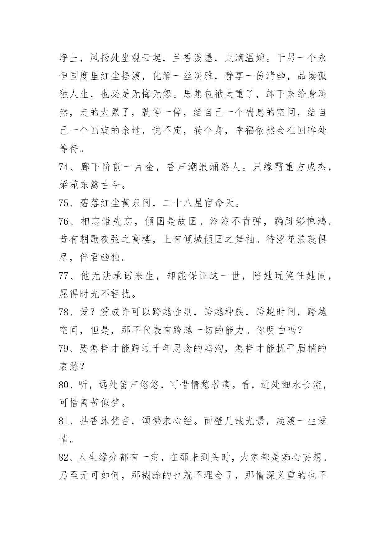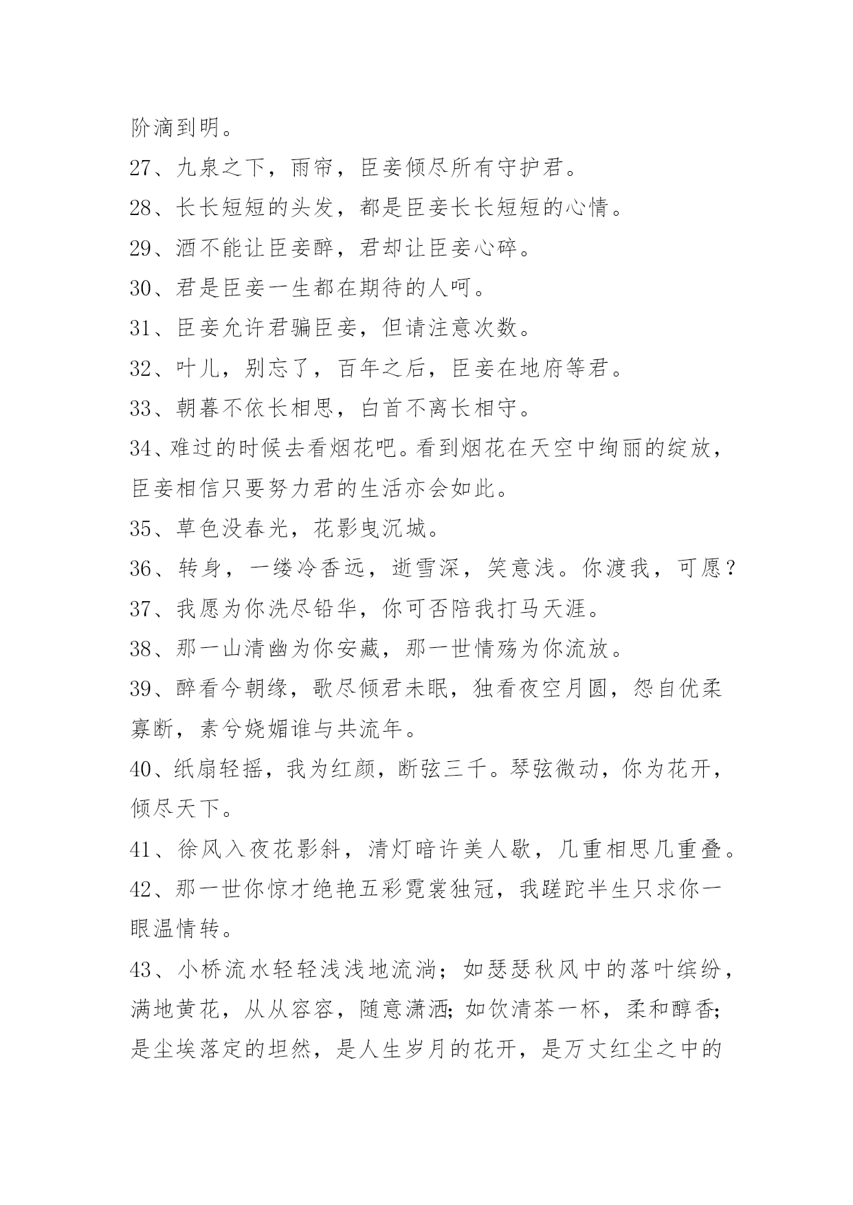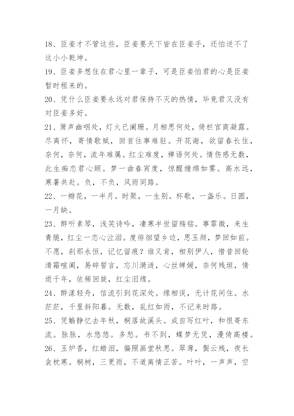 文艺古风句子98条2022年精选文艺古风句子集锦98条臣妾对河外星系一无所知对君,也是一样。以下是小编整理的文艺古风句子98条,仅供参考,希望能够帮助到大家。1、朦胧夙愿,幽幽难书,问情谁在红尘踌躇?月下,默记情愫。轻轻一撩过那些难忘,带着伤痕的脚印,踏上笔尖,流一出一片沧桑,曾月前相约,而今、容与飘落,暗香付阡陌。依稀姿态如昨,千叠素笺成碑刻,却书落英寞。尘嚣渐远、岂无执著,更谢春红、倩风何日重临阁。期待、徘徊、深沉、寂寞着。2、一根香烟一把刀,根根能把寿命削.劝君远离香烟害,身体健康乐逍遥.3、静研墨思,淡描素笺。清风幽梦,入君画香。4、花影压重门,疏帘铺淡月,好黄昏。二年三度负东君,归来也,着意过今春。5、山有木兮木有枝,心悦君兮不复返。水有花兮花有时,心爱君兮君不在。6、秋江楚雁宿沙洲,雁宿沙洲浅水流。流水浅洲沙宿雁,洲沙宿雁楚江秋。7、云淡月婆娑,风来幻境多。薇啼血泪,杜宇动悲歌。雨惊残夜,涓流汇巨波。龙待何日,投笔握长戈。8、凝眸问月,记否?一纸的墨香,曾经清晰了谁的双眸?一帘的碎片,又模糊了谁的视线?一场美丽的邂逅,竟然画不出一个美丽的圆,为何,爱是如此单薄、如此清浅?闭合双眸,轻声喟叹。由花瓣零落枝头,柳丝轻扬,碎了满地的忧伤。9、迢迢牵牛星,皎皎河汉女。纤擢素手,札札弄机杼。日不成章,泣涕零如雨。汉清且浅,相去复几许。盈一水间,脉脉不得语。10、十里桃花霞满天,玉簪暗暗惜年华。花影单望相护,只羡鸳鸯不羡仙。11、你说,一场樱花一场爱,于是人间情未央。说,一场旧梦一场空,于是人间七月天。说,一场烟火一场梦,于是人间夜未央。说,一场繁华一场景,于是人间爱相随。12、一曲琴韵瑟瑟,悲欢尘世离合。一抹沧桑,盈满袖暗香,将尘俗情思泯于无痕。13、美人卷珠帘,深坐颦蛾眉。见泪痕湿,不知心恨谁。14、怕愁贪睡独开迟,自恐冰容不入时。作小红桃杏色,尚余孤瘦雪霜姿。心未肯随春态,酒晕无端上玉肌。老不知梅格在,更看绿叶与青枝。15、西风信来家万里,问我归期未?雁啼红叶天,人醉黄花地,芭蕉雨声秋梦里。—元。张可久《清江引·秋怀》16、如果君开始想念臣妾,记住了,不是臣妾自己要走的,是君自己松手的。17、臣妾不是不再相信爱情,只是再不会有人像君一样让臣妾奋不顾身。18、臣妾才不管这些,臣妾要天下皆在臣妾手,还怕逆不了这小小乾坤。19、臣妾多想住在君心里一辈子,可是臣妾怕君的心是臣妾暂时租来的。20、凭什么臣妾要永远对君保持不灭的热情,毕竟君又没有对臣妾多好。21、箫声幽咽处,灯火已阑珊。月相思何处,倚栏宫商凝露。尽离怀,寄情歌赋,回首往事难驻。开花谢,欲留春长住,奈何,奈何,流年难属。红尘难度,禅语何处。情伤感无数,此生痴恋君心顾。梦一曲春宵度,惊醒缠绵如雾。高水远,寒暑共赴。负,不负,风雨同路。22、一瓣花,一半月。时聚,一生别。杯歌,一盏乐。日圆,一月缺。23、醉听素琴,浅笑诗吟,凄寒半世留殇铭。事霏微,来生青脆,红尘一恋心泣泪。度徘徊望乡边,思玉颜,梦回如前。不愿,刹那永恒,记忆留痕?谁又肯,相别伊人,惜昔回轮清霜喧阗,易碎誓言,忘川漪涟,心丝婵媛,奈何残垣,情逝千年,依稀回旋,红尘旧缘。24、醉漾轻舟,信流引到花深处。缘相误,无计花间住。水茫茫,千里斜阳暮。无数,乱红如雨,不记来时路。25、凭觞静忆去年秋,桐落故溪头。成自写红叶,和恨寄东流。脉脉,水悠悠。多愁。书不到,蝶梦无凭,漫倚高楼。26、玉炉香,红蜡泪,偏照画堂秋思。翠薄,鬓云残,夜长衾枕寒。桐树,三更雨,不道离情正苦。叶叶,一声声,空阶滴到明。27、九泉之下,雨帘,臣妾倾尽所有守护君。28、长长短短的头发,都是臣妾长长短短的心情。29、酒不能让臣妾醉,君却让臣妾心碎。30、君是臣妾一生都在期待的人呵。31、臣妾允许君骗臣妾,但请注意次数。32、叶儿,别忘了,百年之后,臣妾在地府等君。33、朝暮不依长相思,白首不离长相守。34、难过的时候去看烟花吧。看到烟花在天空中绚丽的绽放,臣妾相信只要努力君的生活亦会如此。35、草色没春光,花影曳沉城。36、转身,一缕冷香远,逝雪深,笑意浅。你渡我,可愿?37、我愿为你洗尽铅华,你可否陪我打马天涯。38、那一山清幽为你安藏,那一世情殇为你流放。39、醉看今朝缘,歌尽倾君未眠,独看夜空月圆,怨自优柔寡断,素兮娆媚谁与共流年。40、纸扇轻摇,我为红颜,断弦三千。琴弦微动,你为花开,倾尽天下。41、徐风入夜花影斜,清灯暗许美人歇,几重相思几重叠。42、那一世你惊才绝艳五彩霓裳独冠,我蹉跎半生只求你一眼温情转。43、小桥流水轻轻浅浅地流淌;如瑟瑟秋风中的落叶缤纷,满地黄花,从从容容,随意潇洒;如饮清茶一杯,柔和醇香;是尘埃落定的坦然,是人生岁月的花开,是万丈红尘之中的静雅。44、花陌忧离殇,蝶殇衣舞悲。45、时光泻下年华,岁月叹过离殇
