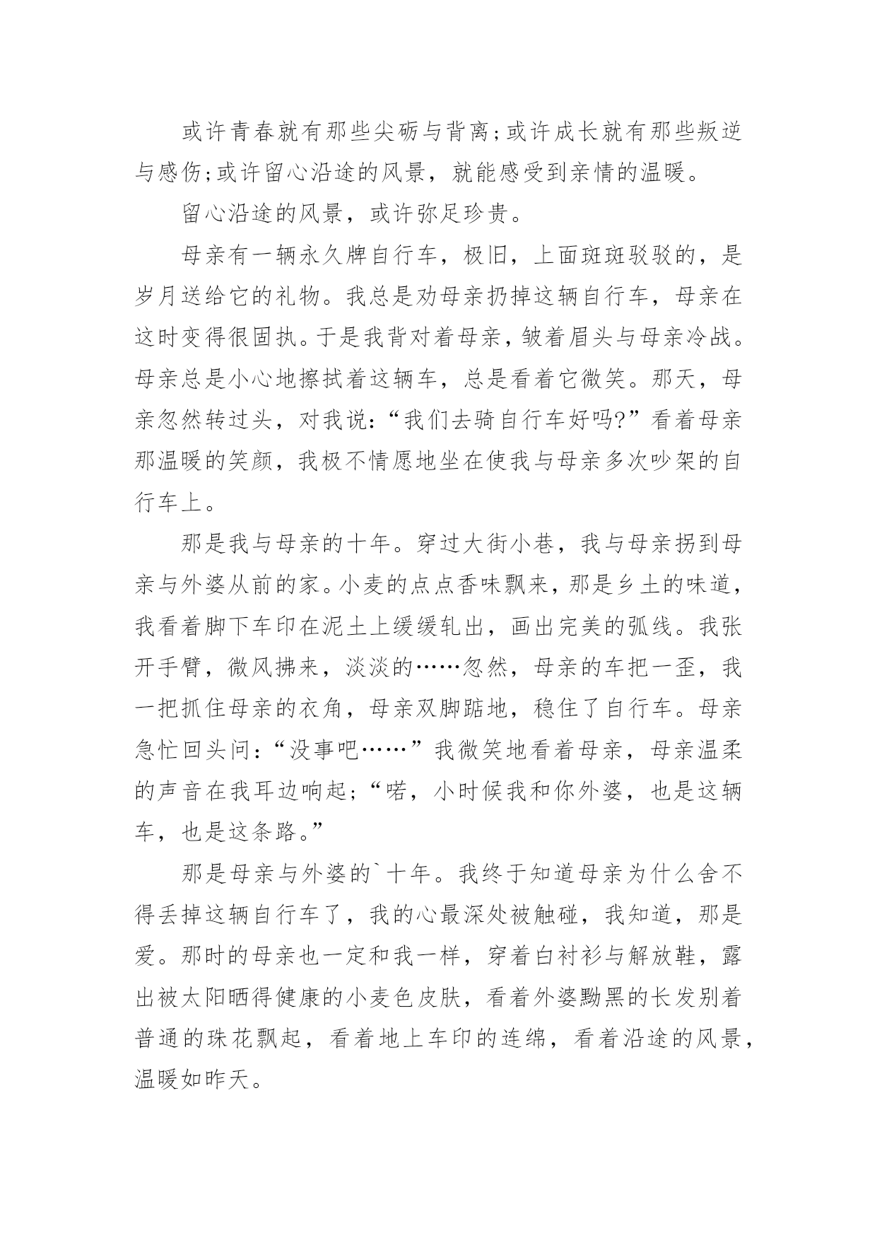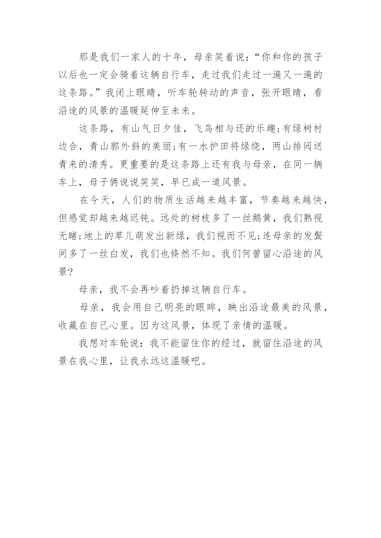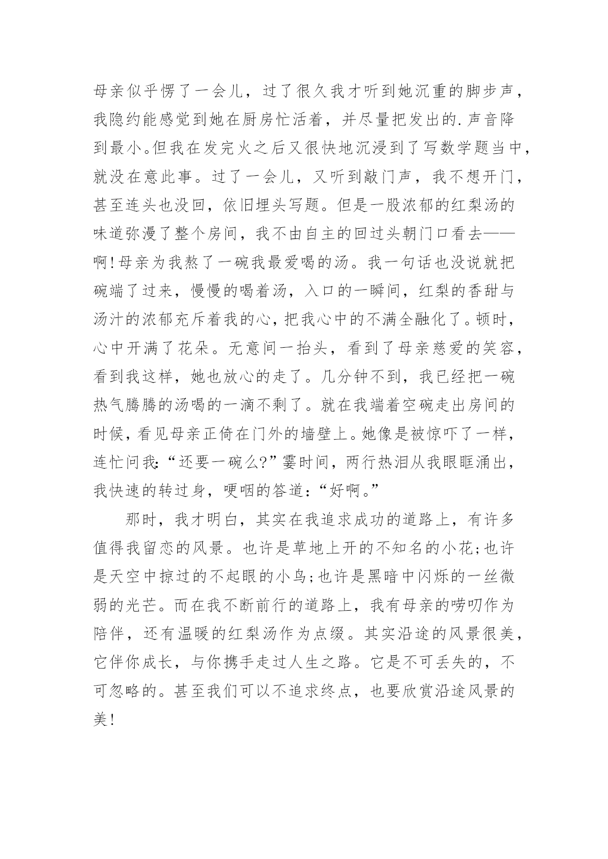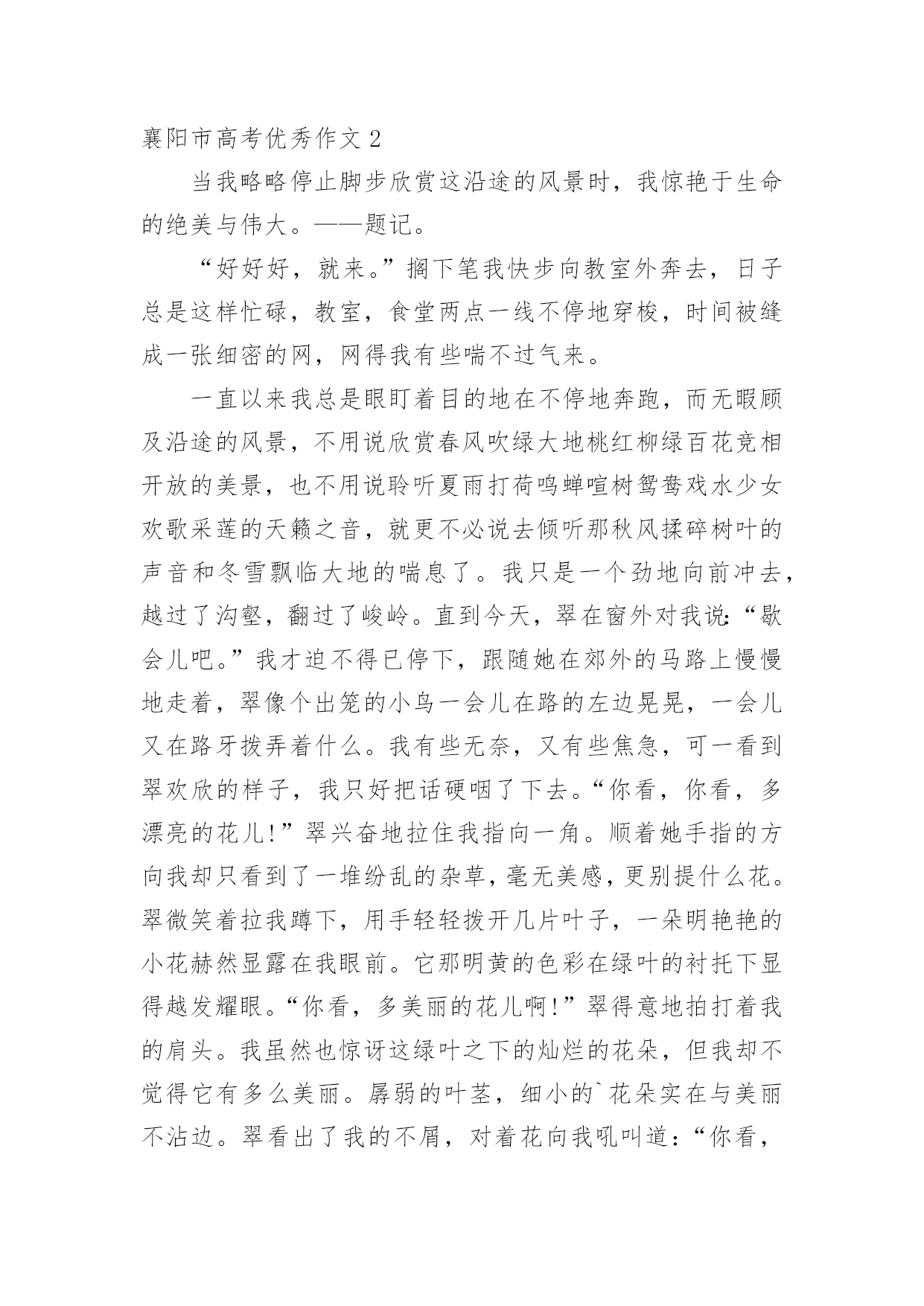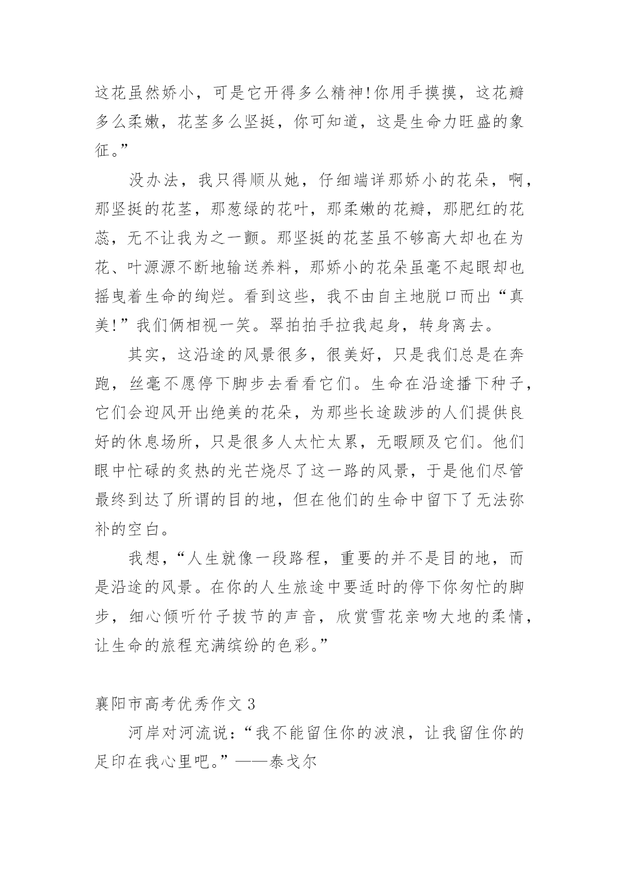 襄阳市高考优秀作文在日常学习、工作或生活中,大家最不陌生的就是作文了吧,作文根据写作时限的不同可以分为限时作文和非限时作文。那么你有了解过作文吗?以下是小编为大家收集的襄阳市高考优秀作文,仅供参考,希望能够帮助到大家。襄阳市高考优秀作文1有人说:“人生就像一段路程,重要的不是目的地,而是沿途的风景。”有的人直奔目的地,忽略了沿途的风景;有的人流连沿途的风景,忘记了目的地;有的人赶路途中,偶尔驻足,美丽的风景让他忘却疲劳更好地奔向目的地。是的,其实,在我们一心前往人生的目的地时,忘记了道路两侧沿途的风景……那时,我正在为了我的奥数比赛不断的努力着,频繁地上课让我头疼,堆积如山的作业更是让我心烦,就在这段时间里,母亲又总在我身边唠叨,更是让我忍无可忍。基本上那几天我不断地重复着几句话:“知道了!”“烦不烦呀!”“都说了几遍了!”母亲总是转身关上门走了,而我也并没在意。窗外下着大雨,夜晚的天空散发出冷冷的一丝微亮,我独自在房间里思考着一道难题,这时门外传来了母亲的声音,是让我去吃饭,而且不断的叫喊声让我爆发了,我把心中的火气全撒了出来,大声喝止母亲,重重的摔了门并反锁上。母亲似乎愣了一会儿,过了很久我才听到她沉重的脚步声,我隐约能感觉到她在厨房忙活着,并尽量把发出的.声音降到最小。但我在发完火之后又很快地沉浸到了写数学题当中,就没在意此事。过了一会儿,又听到敲门声,我不想开门,甚至连头也没回,依旧埋头写题。但是一股浓郁的红梨汤的味道弥漫了整个房间,我不由自主的回过头朝门口看去——啊!母亲为我熬了一碗我最爱喝的汤。我一句话也没说就把碗端了过来,慢慢的喝着汤,入口的一瞬间,红梨的香甜与汤汁的浓郁充斥着我的心,把我心中的不满全融化了。顿时,心中开满了花朵。无意间一抬头,看到了母亲慈爱的笑容,看到我这样,她也放心的走了。几分钟不到,我已经把一碗热气腾腾的汤喝的一滴不剩了。就在我端着空碗走出房间的时候,看见母亲正倚在门外的墙壁上。她像是被惊吓了一样,连忙问我:“还要一碗么?”霎时间,两行热泪从我眼眶涌出,我快速的转过身,哽咽的答道:“好啊。”那时,我才明白,其实在我追求成功的道路上,有许多值得我留恋的风景。也许是草地上开的不知名的小花;也许是天空中掠过的不起眼的小鸟;也许是黑暗中闪烁的一丝微弱的光芒。而在我不断前行的道路上,我有母亲的唠叨作为陪伴,还有温暖的红梨汤作为点缀。其实沿途的风景很美,它伴你成长,与你携手走过人生之路。它是不可丢失的,不可忽略的。甚至我们可以不追求终点,也要欣赏沿途风景的美!襄阳市高考优秀作文2当我略略停止脚步欣赏这沿途的风景时,我惊艳于生命的绝美与伟大。——题记。“好好好,就来。”搁下笔我快步向教室外奔去,日子总是这样忙碌,教室,食堂两点一线不停地穿梭,时间被缝成一张细密的网,网得我有些喘不过气来。一直以来我总是眼盯着目的地在不停地奔跑,而无暇顾及沿途的风景,不用说欣赏春风吹绿大地桃红柳绿百花竞相开放的美景,也不用说聆听夏雨打荷鸣蝉喧树鸳鸯戏水少女欢歌采莲的天籁之音,就更不必说去倾听那秋风揉碎树叶的声音和冬雪飘临大地的喘息了。我只是一个劲地向前冲去,越过了沟壑,翻过了峻岭。直到今天,翠在窗外对我说:“歇会儿吧。”我才迫不得已停下,跟随她在郊外的马路上慢慢地走着,翠像个出笼的小鸟一会儿在路的左边晃晃,一会儿又在路牙拨弄着什么。我有些无奈,又有些焦急,可一看到翠欢欣的样子,我只好把话硬咽了下去。“你看,你看,多漂亮的花儿!”翠兴奋地拉住我指向一角。顺着她手指的方向我却只看到了一堆纷乱的杂草,毫无美感,更别提什么花。翠微笑着拉我蹲下,用手轻轻拨开几片叶子,一朵明艳艳的小花赫然显露在我眼前。它那明黄的色彩在绿叶的衬托下显得越发耀眼。“你看,多美丽的花儿啊!”翠得意地拍打着我的肩头。我虽然也惊讶这绿叶之下的灿烂的花朵,但我却不觉得它有多么美丽。孱弱的叶茎,细小的`花朵实在与美丽不沾边。翠看出了我的不屑,对着花向我吼叫道:“你看,这花虽然娇小,可是它开得多么精神!你用手摸摸,这花瓣多么柔嫩,花茎多么坚挺,你可知道,这是生命力旺盛的象征。”没办法,我只得顺从她,仔细端详那娇小的花朵,啊,那坚挺的花茎,那葱绿的花叶,那柔嫩的花瓣,那肥红的花蕊,无不让我为之一颤。那坚挺的花茎虽不够高大却也在为花、叶源源不断地输送养料,那娇小的花朵虽毫不起眼却也摇曳着生命的绚烂。看到这些,我不由自主地脱口而出“真美!”我们俩相视一笑。翠拍拍手拉我起身,转身离去。其实,这沿途的风景很多,很美好,只是我们总是在奔跑,丝毫不愿停下脚步去看看它们。生命在沿途播下种子,它们会迎风开出绝美的花朵,为那些长途跋涉的人们提供良好的休息场所,只是很多人太忙太累,无暇顾及它们。他们眼中忙碌的炙热的光芒烧尽了这一路的风景,于是他们尽管最终到达了所谓的目的地,但在他们的生
