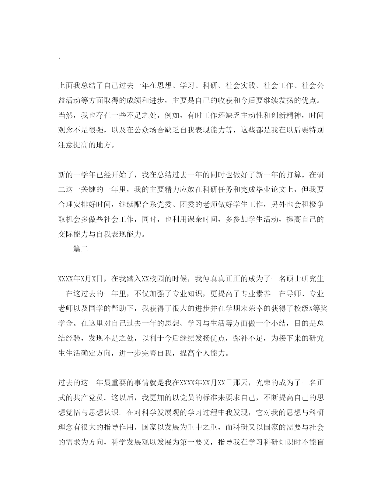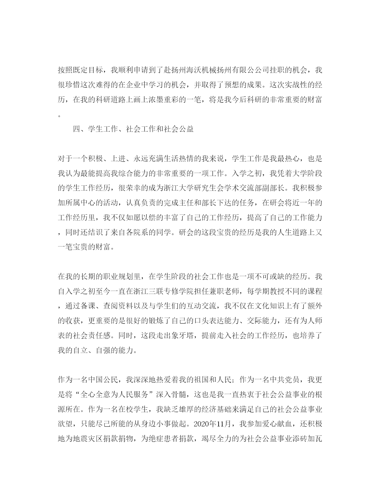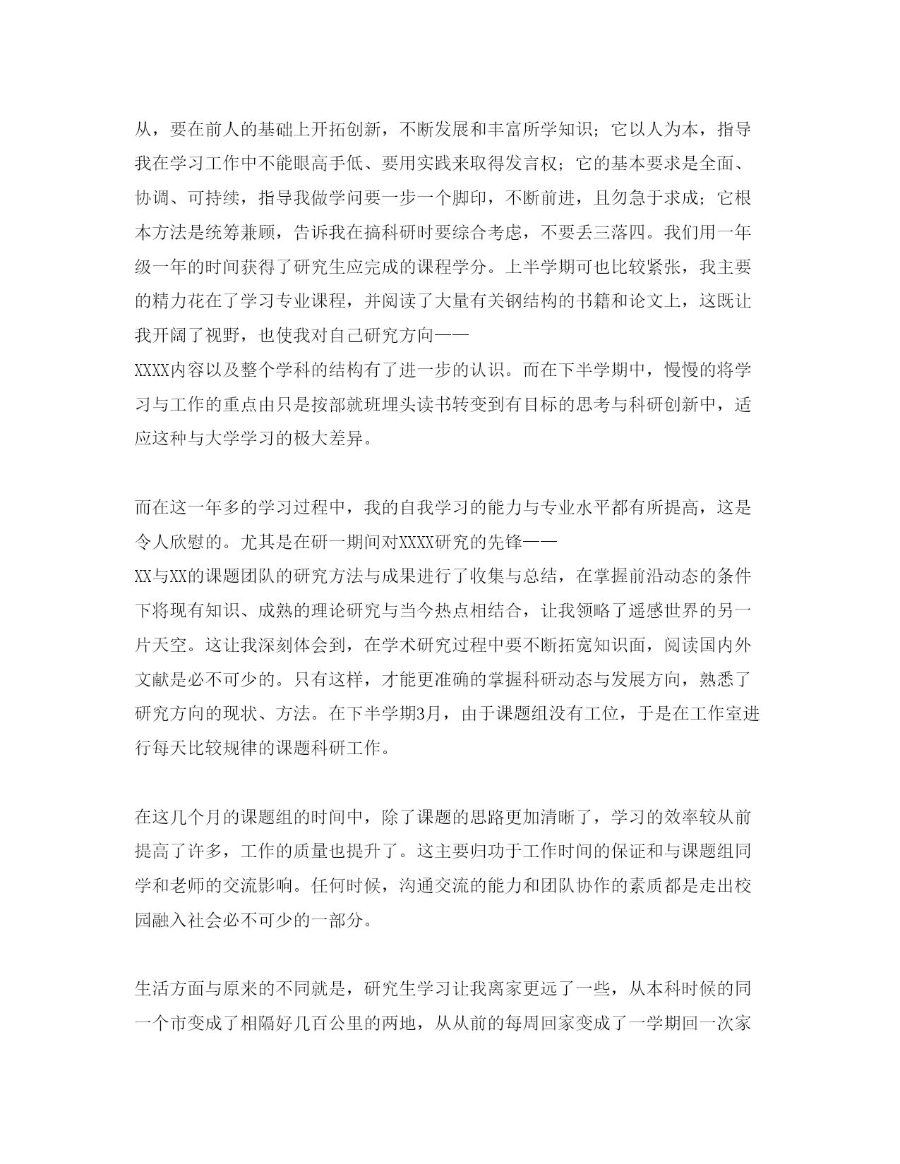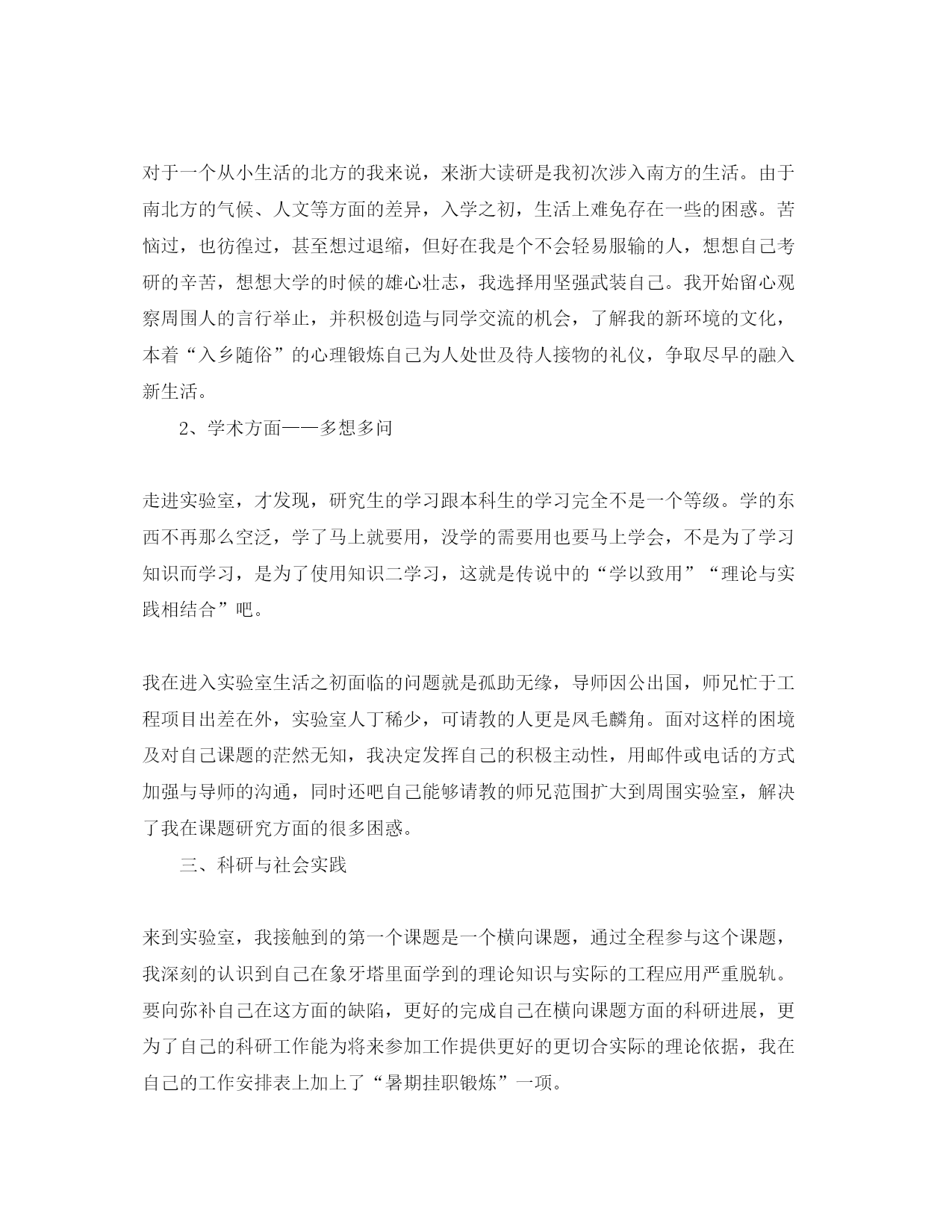 此资料由网络收集而来,如有侵权请告知上传者立即删除。资料共分享,我们负责传递知识。研究生个人学期总结三篇篇一九月初的迎新活动,看到师弟师妹们忙碌的身影,回想当年自己只身来浙大的情景还历历在目,放佛昨日一般。转眼间,已跻身于一名研二的硕士行列。怪不得,人们常感叹“日月如梭,光阴似箭。”回顾这过去的一年的研究生生活,虽然也曾经历过适应新环境的苦恼,也曾经历过学术上茫然无知的彷徨,但总的来说还是充实的、有意义的一年。在新学期伊始,为了正视自己在过去的日子里存在的问题和不足,明确新的一年的努力方向,为将来走向社会做好更充分的准备,下面我从一学年来在思想、学习、科研、社会实践、社会工作、社会公益活动等方面取得的成绩和进步进行总结。一、思想与态度作为一个坚决拥护中国共产党的各项方针政策的中共党员,我非常重视自己的思想政治觉悟的提高。来到新的环境,融入新的支部,我不仅继续保持学习党的理论知识和关注时事的习惯,还积极参加支部组织的各项党建活动,加强与各党员的交流与学习,完善一个优秀共产党员应该具备的综合素质。作为一个浙江大学机械系的硕士研究生,我非常珍惜自己能够拥有的这次学习的机会。在研一秋冬学期的上课阶段,我坚持每一节课都不迟到,不早退,上课认真听讲,并做好课堂笔记;在研一下半年,课程都已结束,我很快的转变角色,投入实验室的科研工作,做好和导师、师兄的交流工作,以健康、端正的态度确保实验室的工作保质保量的完成。二、学习和收获1、生活方面——多听多看对于一个从小生活的北方的我来说,来浙大读研是我初次涉入南方的生活。由于南北方的气候、人文等方面的差异,入学之初,生活上难免存在一些的困惑。苦恼过,也彷徨过,甚至想过退缩,但好在我是个不会轻易服输的人,想想自己考研的辛苦,想想大学的时候的雄心壮志,我选择用坚强武装自己。我开始留心观察周围人的言行举止,并积极创造与同学交流的机会,了解我的新环境的文化,本着“入乡随俗”的心理锻炼自己为人处世及待人接物的礼仪,争取尽早的融入新生活。2、学术方面——多想多问走进实验室,才发现,研究生的学习跟本科生的学习完全不是一个等级。学的东西不再那么空泛,学了马上就要用,没学的需要用也要马上学会,不是为了学习知识而学习,是为了使用知识二学习,这就是传说中的“学以致用”“理论与实践相结合”吧。我在进入实验室生活之初面临的问题就是孤助无缘,导师因公出国,师兄忙于工程项目出差在外,实验室人丁稀少,可请教的人更是凤毛麟角。面对这样的困境及对自己课题的茫然无知,我决定发挥自己的积极主动性,用邮件或电话的方式加强与导师的沟通,同时还吧自己能够请教的师兄范围扩大到周围实验室,解决了我在课题研究方面的很多困惑。三、科研与社会实践来到实验室,我接触到的第一个课题是一个横向课题,通过全程参与这个课题,我深刻的认识到自己在象牙塔里面学到的理论知识与实际的工程应用严重脱轨。要向弥补自己在这方面的缺陷,更好的完成自己在横向课题方面的科研进展,更为了自己的科研工作能为将来参加工作提供更好的更切合实际的理论依据,我在自己的工作安排表上加上了“暑期挂职锻炼”一项。按照既定目标,我顺利申请到了赴扬州海沃机械扬州有限公公司挂职的机会,我很珍惜这次难得的在企业中学习的机会,并取得了预想的成果。这次实战性的经历,在我的科研道路上画上浓墨重彩的一笔,将是我今后科研的非常重要的财富。四、学生工作、社会工作和社会公益对于一个积极、上进、永远充满生活热情的我来说,学生工作是我最热心,也是我认为最能提高我综合能力的非常重要的一项工作。入学之初,我凭着大学阶段的学生工作经历,很荣幸的成为浙江大学研究生会学术交流部副部长。我积极参加所属中心的活动,认真负责的完成主任和部长下达的任务,在研会将近一年的工作经历里,我不仅如愿以偿的丰富了自己的工作经历,提高了自己的工作能力,同时还结识了来自各院系的同学。研会的这段宝贵的经历是我的人生道路上又一笔宝贵的财富。在我的长期的职业规划里,在学生阶段的社会工作也是一项不可或缺的经历。我自入学之初至今一直在浙江三联专修学院担任兼职老师,每学期教授不同的课程,通过备课、查阅资料以及与学生们的互动交流,我不仅在文化知识上有了额外的收获,更重要的是很好的锻炼了自己的口头表达能力、交际能力,还有为人师表的社会责任感。同时,这段走出象牙塔,提前走入社会的工作经历,也培养了我的自立、自强的能力。作为一名中国公民,我深深地热爱着我的祖国和人民;作为一名中共党员,我更是将“全心全意为人民服务”深入骨髓,这也是我一直热衷于社会公益事业的根源所在。作为一名在校学生,我缺乏雄厚的经济基础来满足自己的社会公益事业欲望,只能尽己所能的从身边小事做起。2020年11月,我参加爱心献血,还积极地为地震灾区捐款捐物,为绝症患者捐款,