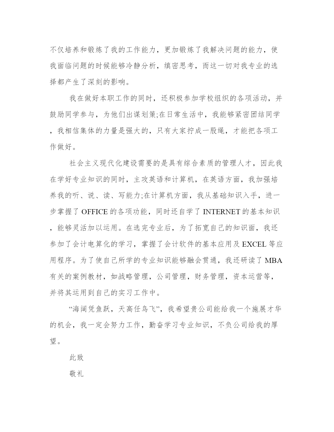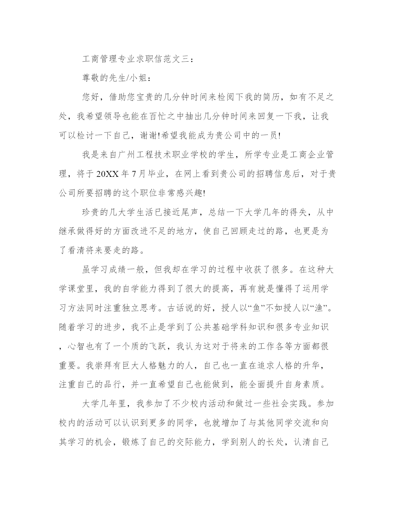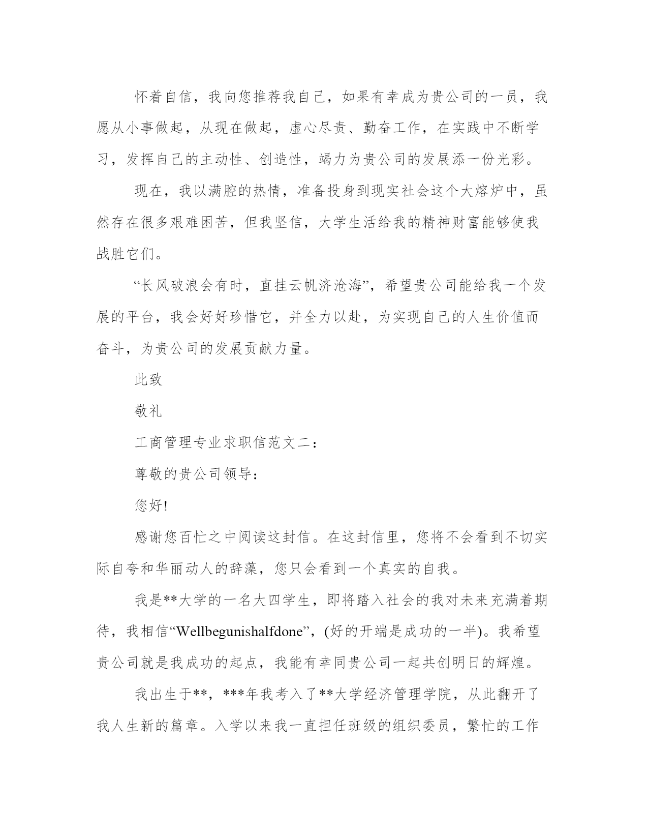 工商管理专业求职信范文工商管理专业求职信范文一:尊敬的领导:您好!衷心的感谢您在百忙之中翻阅我的这份材料,并祝愿贵单位事业欣欣向荣,蒸蒸日上!我是沈阳理工大学应用技术学院工商管理专业11届毕业生周珺,自从进入大学之后,高考后的轻松、获知被录取的喜悦随风而逝,因为我得从新开始,继续努力奋斗,迎接新的挑战。大学四年是我思想、知识结构及心理、生长成熟的四年。惠于安工大浓厚的学习、创新氛围,熔融其中的我成为了一名复合型人才。时光飞逝,我将怀着我童年的梦想、青年的理想离开我的母校,走上工作岗位。我以“严”字当头,在学习上勤奋严谨,对课堂知识不懂就问,力求深刻理解。在掌握了本专业知识的基础上,不忘拓展自己的知识面,对课外知识也有比较广泛的涉猎。我还很重视英语的学习,不断努力扩大词汇量,英语交际能力也有了长足的进步。同时,为了全面提升个人素质,我积极参加各种活动,这些经历使我认识到团结合作的重要性,也学到了很多社交方面的知识,增加了阅历,相信这对我今后投身社会将起重要作用。怀着自信,我向您推荐我自己,如果有幸成为贵公司的一员,我愿从小事做起,从现在做起,虚心尽责、勤奋工作,在实践中不断学习,发挥自己的主动性、创造性,竭力为贵公司的发展添一份光彩。现在,我以满腔的热情,准备投身到现实社会这个大熔炉中,虽然存在很多艰难困苦,但我坚信,大学生活给我的精神财富能够使我战胜它们。“长风破浪会有时,直挂云帆济沧海”,希望贵公司能给我一个发展的平台,我会好好珍惜它,并全力以赴,为实现自己的人生价值而奋斗,为贵公司的发展贡献力量。此致敬礼工商管理专业求职信范文二:尊敬的贵公司领导:您好!感谢您百忙之中阅读这封信。在这封信里,您将不会看到不切实际自夸和华丽动人的辞藻,您只会看到一个真实的自我。我是**大学的一名大四学生,即将踏入社会的我对未来充满着期待,我相信“Wellbegunishalfdone”,(好的开端是成功的一半)。我希望贵公司就是我成功的起点,我能有幸同贵公司一起共创明日的辉煌。我出生于**,***年我考入了**大学经济管理学院,从此翻开了我人生新的篇章。入学以来我一直担任班级的组织委员,繁忙的工作不仅培养和锻炼了我的工作能力,更加锻炼了我解决问题的能力,使我面临问题的时候能够冷静分析,缜密思考,而这一切对我专业的选择都产生了深刻的影响。我在做好本职工作的同时,还积极参加学校组织的各项活动,并鼓励同学参与,为他们出谋划策;在日常生活中,我能够紧密团结同学,我相信集体的力量是强大的,只有大家拧成一股绳,才能把各项工作做好。社会主义现代化建设需要的是具有综合素质的管理人才,因此我在学好专业知识的同时,主攻英语和计算机,在英语方面,我加强培养我的听、说、读、写能力;在计算机方面,我从基础知识入手,进一步掌握了OFFICE的各项功能,同时还自学了INTERNET的基本知识,能够灵活加以运用。在选完专业后,为了拓宽自己的知识面,我还参加了会计电算化的学习,掌握了会计软件的基本应用及EXCEL等应用程序。为了使自己所学的专业知识能够融会贯通,我还研读了MBA有关的案例教材,如战略管理,公司管理,财务管理,资本运营等,并将其运用到自己的实习工作中。“海阔凭鱼跃,天高任鸟飞”,我希望贵公司能给我一个施展才华的机会,我一定会努力工作,勤奋学习专业知识,不负公司给我的厚望。此致敬礼工商管理专业求职信范文三:尊敬的先生/小姐:您好,借助您宝贵的几分钟时间来检阅下我的简历,如有不足之处,我希望领导也能在百忙之中抽出几分钟时间来回复一下我,让我可以检讨一下自己,谢谢!希望我能成为贵公司中的一员!我是来自广州工程技术职业学校的学生,所学专业是工商企业管理,将于20XX年7月毕业,在网上看到贵公司的招聘信息后,对于贵公司所要招聘的这个职位非常感兴趣!珍贵的几大学生活已接近尾声,总结一下大学几年的得失,从中继承做得好的方面改进不足的地方,使自己回顾走过的路,也更是为了看清将来要走的路。虽学习成绩一般,但我却在学习的过程中收获了很多。在这种大学课堂里,我的自学能力得到了很大的提高,再有就是懂得了运用学习方法同时注重独立思考。古话说的好,授人以“鱼”不如授人以“渔”。随着学习的进步,我不止是学到了公共基础学科知识和很多专业知识,心智也有了一个质的飞跃,我认为这对于将来的工作各等方面都很重要。我崇拜有巨大人格魅力的人,自己也一直在追求人格的升华,注重自己的品行,并一直希望自己也能做到,能全面提升自身素质。大学几年里,我参加了不少校内活动和做过一些社会实践。参加校内的活动可以认识到更多的同学,也就增加了与其他同学交流和向其学习的机会,锻炼了自己的交际能力,学到别人的长处,认清自己的短处。参加的社会实践使我尝试到了工作的艰辛,明