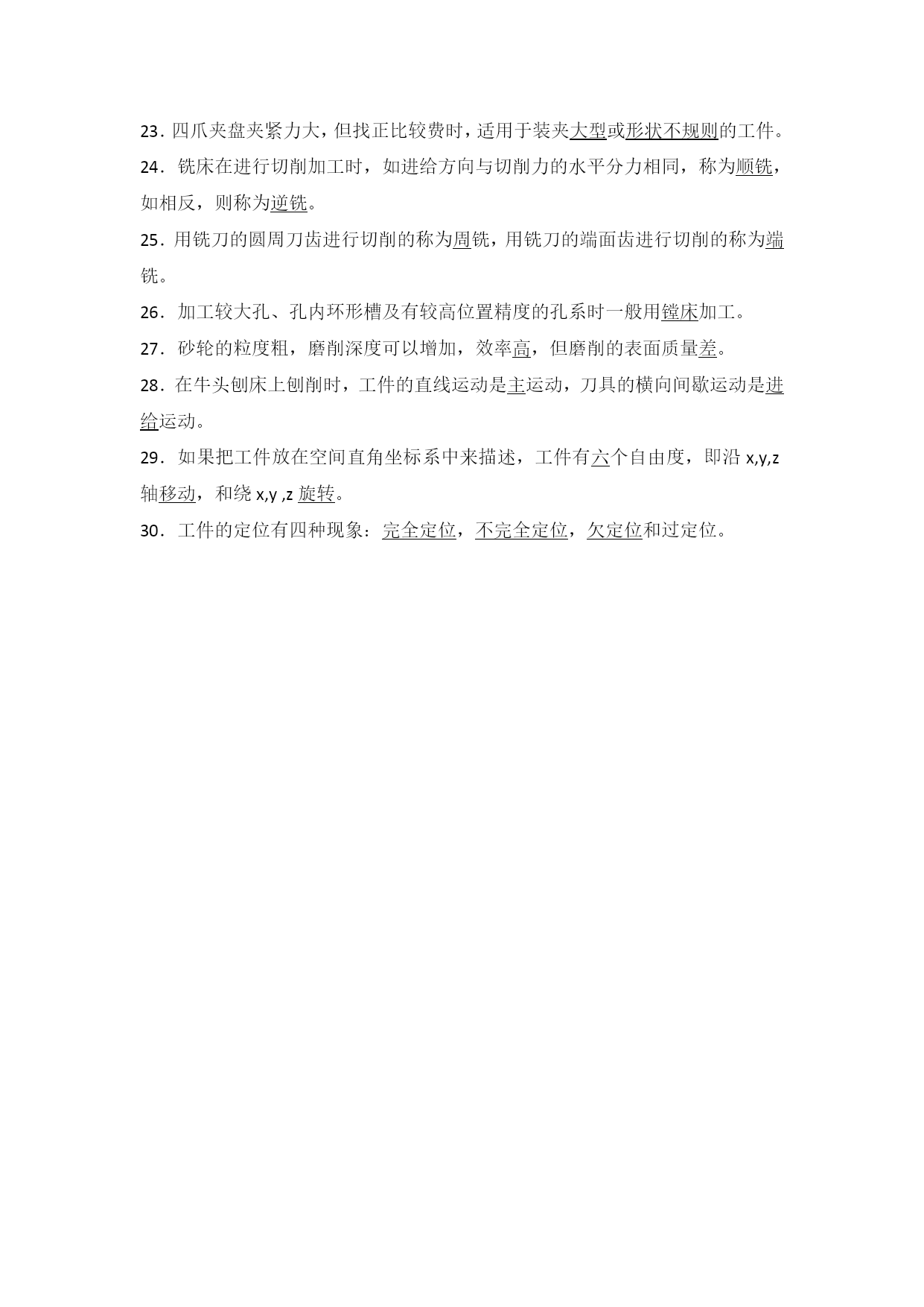 机械制造工艺装备题库——填空题70空X1=70分(7套)1.齿形的切削加工,按加工原理不同可分为两大类成形法加工、展成法加工。2.铣削用量四要素为铣削速度__、铣削宽度_、铣削深度__和进给量_。3.车削加工时,进给量增加会使表面粗糙度_变大_。4.切削液的作用有冷却、润滑、清洗及防锈等作用。5.在受迫振动中,当外激励频率近似等于系统频率时,会发生_共振_现象。6.车削加工时,主偏角增加会使表面粗糙度变大。7.切削运动按其作用可分为主运动和进给运动。8.切削是切削加工过程中的切削速度、进给量、背吃刀量的总称。9.刀具主偏角减小,背向力增大,进给力减少。10.无心磨削的导轮表面应修整成双曲面形状。工件中心应高于砂轮和导轮中心连线。11.固定式钻模用于立式钻床上加工单个较大的孔或在摇臂钻床上加工多个孔。12.平面磨削的方式有周磨和端磨两种。13.生产线上常见的工艺装备有刀具、夹具、量具、模具、辅具及检具。14.机床的主要技术参数包括:主参数、尺寸参数、运动参数及动力参数。15.铣床夹具主要由夹具体、定位装置、夹紧装置、对刀装置及夹具定位键等组成。16.机床夹具设计中,常用的定位元件有支承钉、支承板、定位销及V形块。17.机床的主传动形式有:机械传动、液压传动及电气传动。18.零件的机械加工是在由机床、刀具、夹具和工件组成的工艺系统内完成的。19.切削用量是切削加工过程中的切削速度、进给量、背吃刀量的总称。20.根据变形后形成的切屑的外形不同,通常将切屑分为带状切屑、节状切屑、粒状切屑及崩碎切屑四种类型。21.切削热主要由切屑、工件、刀具和周围介质传导出去。22.CA6140的主要组成部件有主轴箱、进给箱、溜板箱、床鞍、尾座和床身。23.四爪夹盘夹紧力大,但找正比较费时,适用于装夹大型或形状不规则的工件。24.铣床在进行切削加工时,如进给方向与切削力的水平分力相同,称为顺铣,如相反,则称为逆铣。25.用铣刀的圆周刀齿进行切削的称为周铣,用铣刀的端面齿进行切削的称为端铣。26.加工较大孔、孔内环形槽及有较高位置精度的孔系时一般用镗床加工。27.砂轮的粒度粗,磨削深度可以增加,效率高,但磨削的表面质量差。28.在牛头刨床上刨削时,工件的直线运动是主运动,刀具的横向间歇运动是进给运动。29.如果把工件放在空间直角坐标系中来描述,工件有六个自由度,即沿x,y,z轴移动,和绕x,y,z旋转。30.工件的定位有四种现象:完全定位,不完全定位,欠定位和过定位。