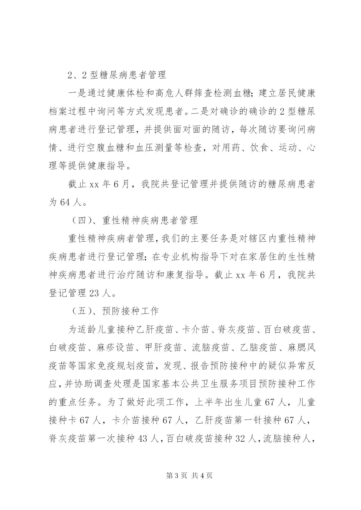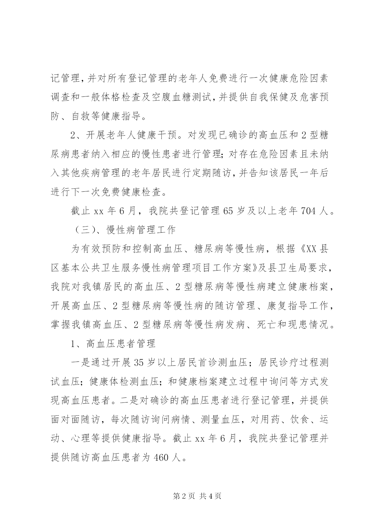 第PAGE\*Arabic\*MERGEFORMAT4页共NUMPAGES\*MERGEFORMAT4页关于公共卫生工作总结范文xx年上半年,我院在卫生局的正确领导下,严格执行《国家基本公共卫生服务规范》认真贯彻落实《XX县区基本公共卫生服务项目工作方案》以及卫生局各类文件精神,加强内部管理,严抓基本公共卫生服务项目工作,充分调动全院职工的工作积极性和主动性,取得了较好效果,现将我院基本公共卫生服务项目半年来工作总结汇报一、基本公共卫生服务项目开展落实情况(一)、居民健康档案工作1、加大宣传力度,提高居民主动建档意识。为提高我辖区居民主动参与建档意识,我院大力宣传发放各类宣传材料,让每一名社区居民了解居民健康档案,积极主动配合我院建档工作小组顺利完成居民建档工作。2、加强人员培训,强化服务意识。为确保居民健康档案保质保量完成,我院对每一名参与居民健康档案建立的工作人员进行了多次业务培训,让每一名工作人员熟悉居民健康档案建立的重要性和必要性,熟悉掌握自己的本职工作和建档程序。(二)、老年人健康管理工作根据《XX县区年基本公共卫生服务老年人健康管理项目工作方案》及县卫生局要求,我院开展了老年人健康管理服务项目。1、结合建立居民健康档案对我镇65岁及以上老年人进行登记管理,并对所有登记管理的老年人免费进行一次健康危险因素调查和一般体格检查及空腹血糖测试,并提供自我保健及危害预防、自救等健康指导。2、开展老年人健康干预。对发现已确诊的高血压和2型糖尿病患者纳入相应的慢性患者进行管理;对存在危险因素且未纳入其他疾病管理的老年居民进行定期随访,并告知该居民一年后进行下一次免费健康检查。截止xx年6月,我院共登记管理65岁及以上老年704人。(三)、慢性病管理工作为有效预防和控制高血压、糖尿病等慢性病,根据《XX县区基本公共卫生服务慢性病管理项目工作方案》及县卫生局要求,我院对我镇居民的高血压、2型糖尿病等慢性病建立健康档案,开展高血压、2型糖尿病等慢性病的随访管理、康复指导工作,掌握我镇高血压、2型糖尿病等慢性病发病、死亡和现患情况。1、高血压患者管理一是通过开展35岁以上居民首诊测血压;居民诊疗过程测试血压;健康体检测血压;和健康档案建立过程中询问等方式发现高血压患者。二是对确诊的高血压患者进行登记管理,并提供面对面随访,每次随访询问病情、测量血压,对用药、饮食、运动、心理等提供健康指导。截止xx年6月,我院共登记管理并提供随访高血压患者为460人。2、2型糖尿病患者管理一是通过健康体检和高危人群筛查检测血糖;建立居民健康档案过程中询问等方式发现患者。二是对确诊的确诊的2型糖尿病患者进行登记管理,并提供面对面的随访,每次随访要询问病情、进行空腹血糖和血压测量等检查,对用药、饮食、运动、心理等提供健康指导。截止xx年6月,我院共登记管理并提供随访的糖尿病患者为64人。(四)、重性精神疾病患者管理重性精神疾病者管理,我们的主要任务是对辖区内重性精神疾病患者进行登记管理;在专业机构指导下对在家居住的生性精神疾病患者进行治疗随访和康复指导。截止xx年6月,我院共登记管理23人。(五)、预防接种工作为适龄儿童接种乙肝疫苗、卡介苗、脊灰疫苗、百白破疫苗、白破疫苗、麻疹设苗、甲肝疫苗、流脑疫苗、乙脑疫苗、麻腮风疫苗等国家免疫规划疫苗,发现、报告预防接种中的疑似异常反应,并协助调查处理是国家基本公共卫生服务项目预防接种工作的重点任务。为了做好此项工作,上半年出生儿童67人,儿童接种卡67人,卡介苗接种67人,乙肝疫苗第一针接种67人,脊灰疫苗第一次接种43人,百白破疫苗接种32人,流脑接种人,麻疹接种人,乙脑接种人。通过接种使个体产生自动或被动免疫力,保护个体和人群不受病原因子的感染和发病,起到消除或消灭所针对的传染病的目的。12