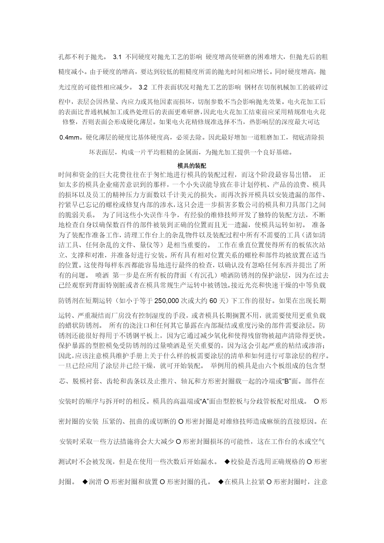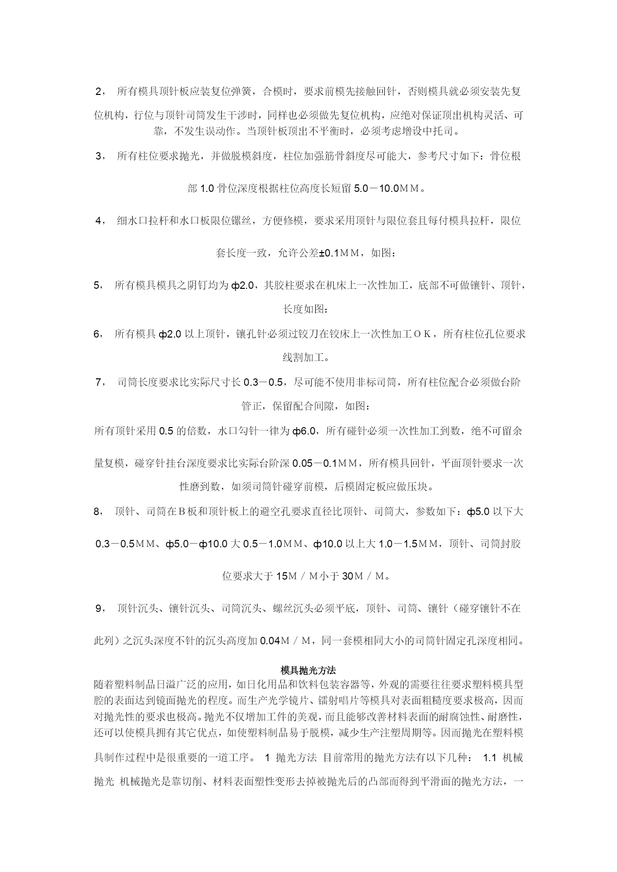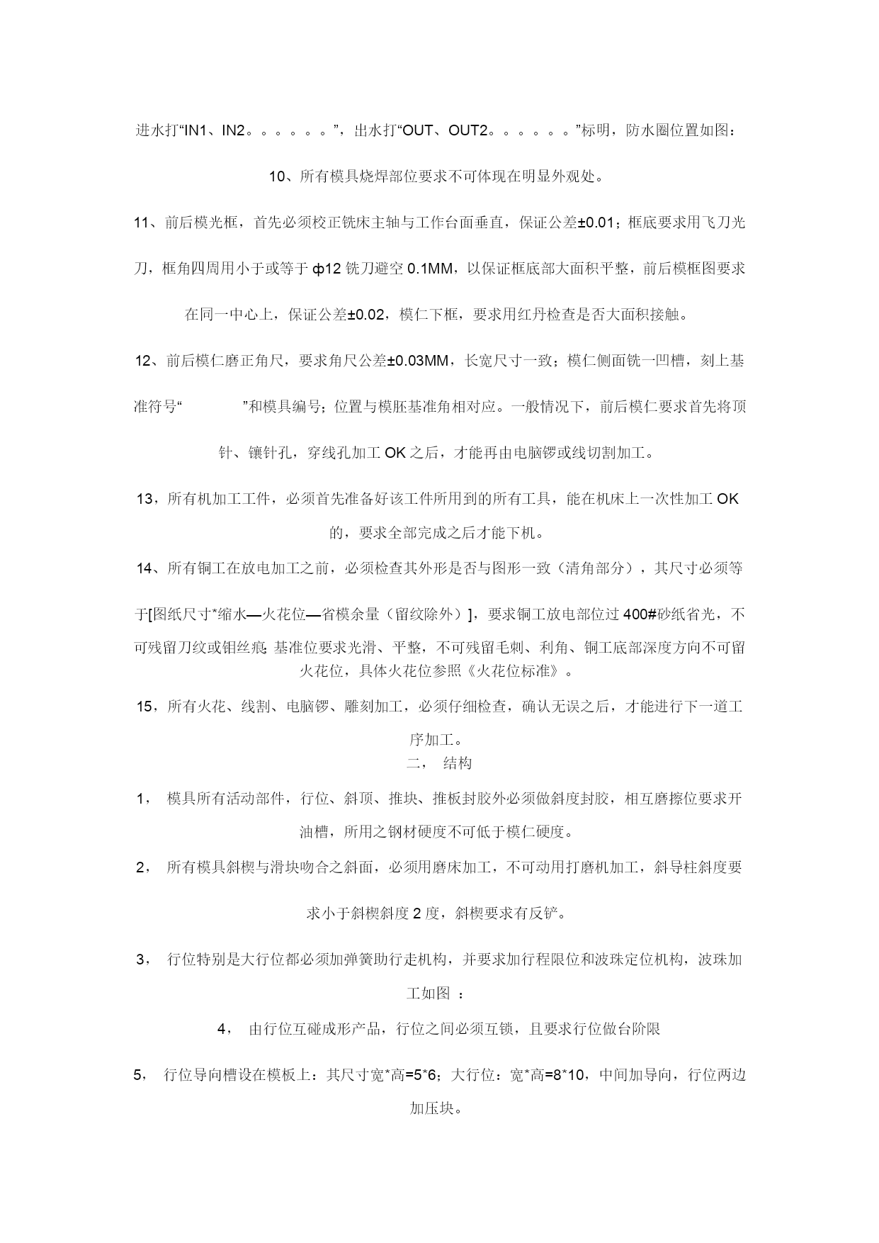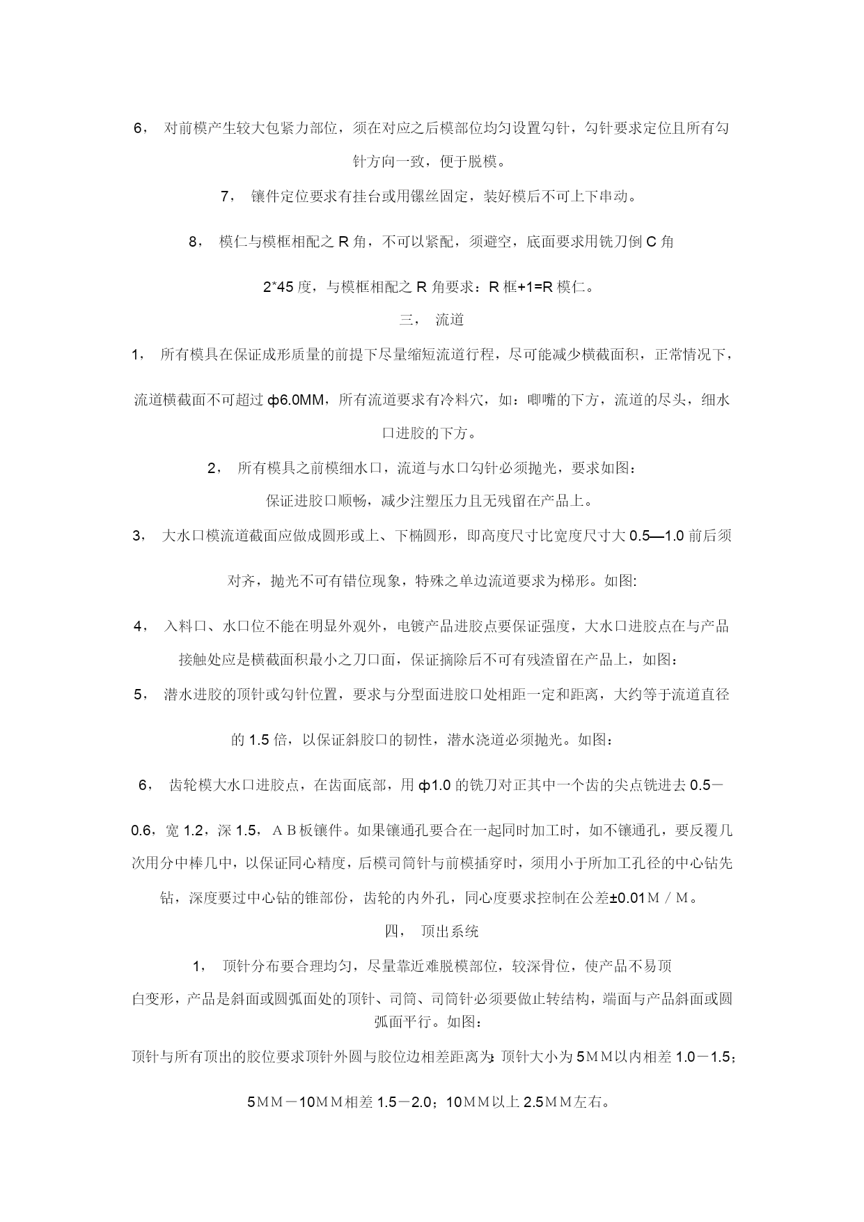 模具制作的要求一、模仁、模胚1,模胚在未拆开之前,检查其型号、尺寸是否与图纸相符,然后在基准角之对角面打上模具编号的模板序号,要求每付模具方铁铣模具编号;每付模具导柱也必须用打磨机刻上模具编号;导套底部开排气槽;B板四个角要求铣撬模坑,尺寸为20×45°×DP5。2,多个产品在同一付模具时,应遵循中间产品大、周边产品小的原则,即压大的产品排位在中间,以便整付模走胶均匀,要求电镀的产品和同样的产品应集中在一起,要求喷油的产品集中在一起。3,分型要求光整漂亮,新模具外观表面尽量不要刮花、生锈,以模具美观整洁。后模仁要求平整,电脑锣刀纹尽可能不损坏,前模型胶位部分省模必须按照粗凿——精凿、粗石油——精石油、粗砂纸——细砂纸的顺序省光后再抛光,晒纹件不须抛光。4,在不影响产品顶出和保证顶针板强度的条件下,要求模具均匀加撑头,并主要考虑在模具的中间,撑头长度:3535以下模胚,撑动高度为方铁高加0.15-0.2,3535以上模胚撑头高度为方铁高加0.2-0.3,撑头要求固定在B板上。5,产品外观或产品装配好后,手可触摸到的地方不可有利角。6,唧嘴要求做定位止转,出胶口要求分型面平0.5M/M-1M/M,唧嘴的长度尽可能做短,以减少注射力,唧嘴定位台阶面不可接触到模仁或镶件。7,模胚顶棍孔与唧嘴孔必须在同一中心上,顶棍孔直径为ф40,模胚在55以上顶棍孔为3个,中心数为100,顶针底板要求均匀设置垃圾钉,垃圾钉高度必须一致。8,所有模具必须加工码模孔,中心距为“7英寸”、“10英寸”、“12英寸”且直身模要求铣码模坑,深25、宽25,长依模板大小而定。9,所有模具之模仁、大镶件要求通冷却运水,特别是胶位比较深、厚的地方,水路直径ф8.0,安全距离为4.0M/M离胶位至少保留5.0M/M,尽量避免局部模温过高,水路堵铜位置必须做台阶,模仁和镶件的冷却水路用防水圈从模胚对接出来,如前模通框,水管可直接通过模胚,接在模胚上,水管要求在A,B板的同一端上,水管接在模具的上面或注塑机操作者的另一边,水管进水打“IN1、IN2。。。。。。”,出水打“OUT、OUT2。。。。。。”标明,防水圈位置如图:10、所有模具烧焊部位要求不可体现在明显外观处。11、前后模光框,首先必须校正铣床主轴与工作台面垂直,保证公差±0.01;框底要求用飞刀光刀,框角四周用小于或等于ф12铣刀避空0.1MM,以保证框底部大面积平整,前后模框图要求在同一中心上,保证公差±0.02,模仁下框,要求用红丹检查是否大面积接触。12、前后模仁磨正角尺,要求角尺公差±0.03MM,长宽尺寸一致;模仁侧面铣一凹槽,刻上基准符号“”和模具编号;位置与模胚基准角相对应。一般情况下,前后模仁要求首先将顶针、镶针孔,穿线孔加工OK之后,才能再由电脑锣或线切割加工。13,所有机加工工件,必须首先准备好该工件所用到的所有工具,能在机床上一次性加工OK的,要求全部完成之后才能下机。14、所有铜工在放电加工之前,必须检查其外形是否与图形一致(清角部分),其尺寸必须等于[图纸尺寸*缩水—火花位—省模余量(留纹除外)],要求铜工放电部位过400#砂纸省光,不可残留刀纹或钼丝痕;基准位要求光滑、平整,不可残留毛刺、利角、铜工底部深度方向不可留火花位,具体火花位参照《火花位标准》。15,所有火花、线割、电脑锣、雕刻加工,必须仔细检查,确认无误之后,才能进行下一道工序加工。二,结构1,模具所有活动部件,行位、斜顶、推块、推板封胶外必须做斜度封胶,相互磨擦位要求开油槽,所用之钢材硬度不可低于模仁硬度。2,所有模具斜楔与滑块吻合之斜面,必须用磨床加工,不可动用打磨机加工,斜导柱斜度要求小于斜楔斜度2度,斜楔要求有反铲。3,行位特别是大行位都必须加弹簧助行走机构,并要求加行程限位和波珠定位机构,波珠加工如图:4,由行位互碰成形产品,行位之间必须互锁,且要求行位做台阶限5,行位导向槽设在模板上:其尺寸宽*高=5*6;大行位:宽*高=8*10,中间加导向,行位两边加压块。6,对前模产生较大包紧力部位,须在对应之后模部位均匀设置勾针,勾针要求定位且所有勾针方向一致,便于脱模。7,镶件定位要求有挂台或用镙丝固定,装好模后不可上下串动。8,模仁与模框相配之R角,不可以紧配,须避空,底面要求用铣刀倒C角2*45度,与模框相配之R角要求:R框+1=R模仁。三,流道1,所有模具在保证成形质量的前提下尽量缩短流道行程,尽可能减少横截面积,正常情况下,流道横截面不可超过ф6.0MM,所有流道要求有冷料穴,如:唧嘴的下方,流道的尽头,细水口进胶的下方。2,所有模具之前模细水口,流道与水口勾针必须抛光,要求如图:保证进胶口顺畅,减少注塑压力且无残留在产品上。3,大水口模流道截面应做成圆形或上、下椭圆形,即高度尺寸比宽度尺寸大0.5—1.0前