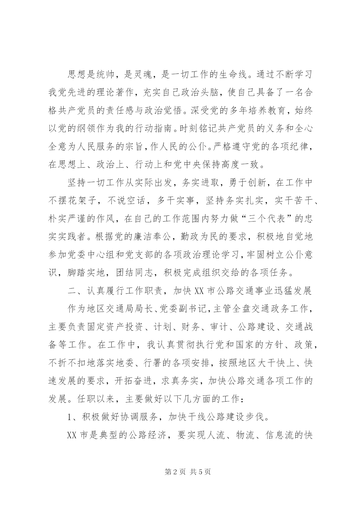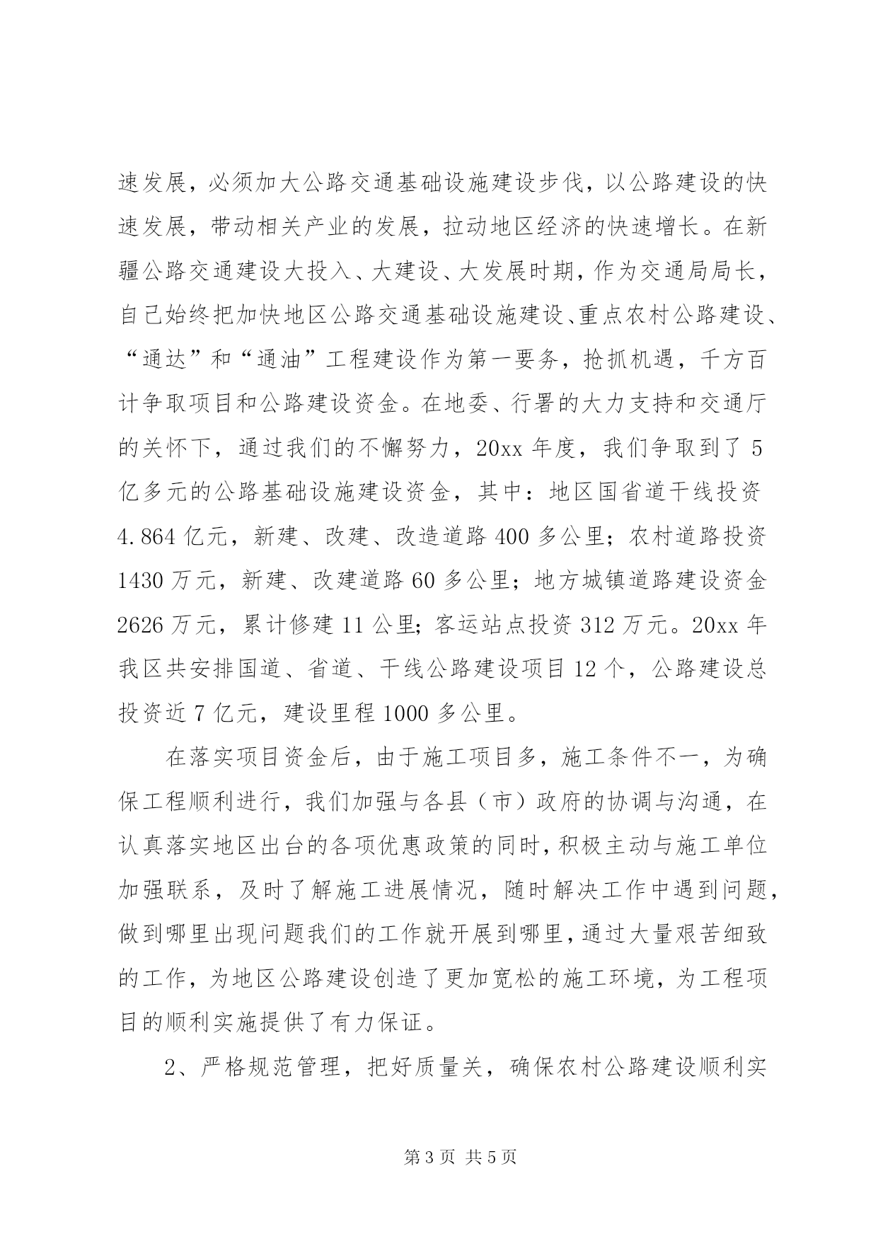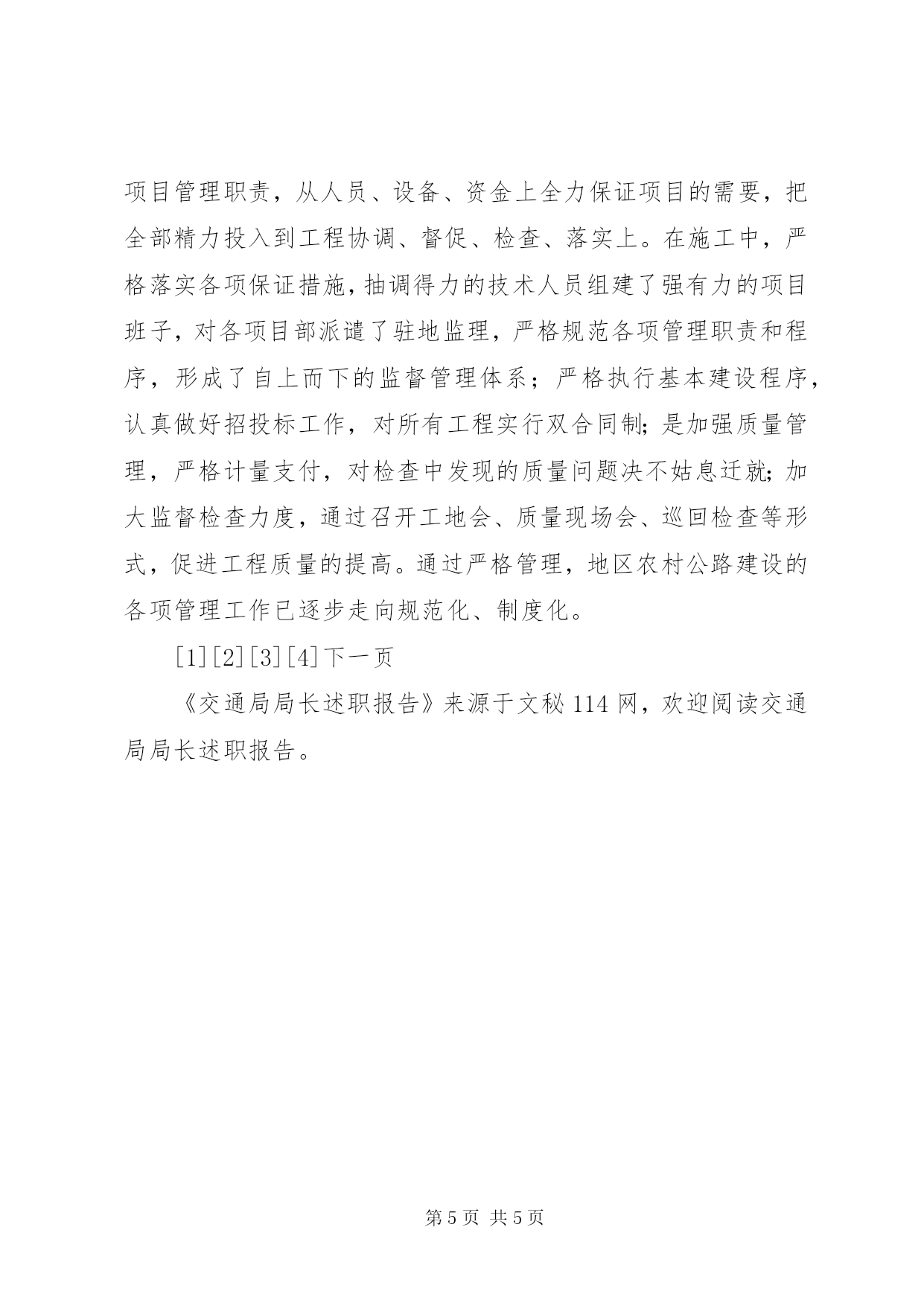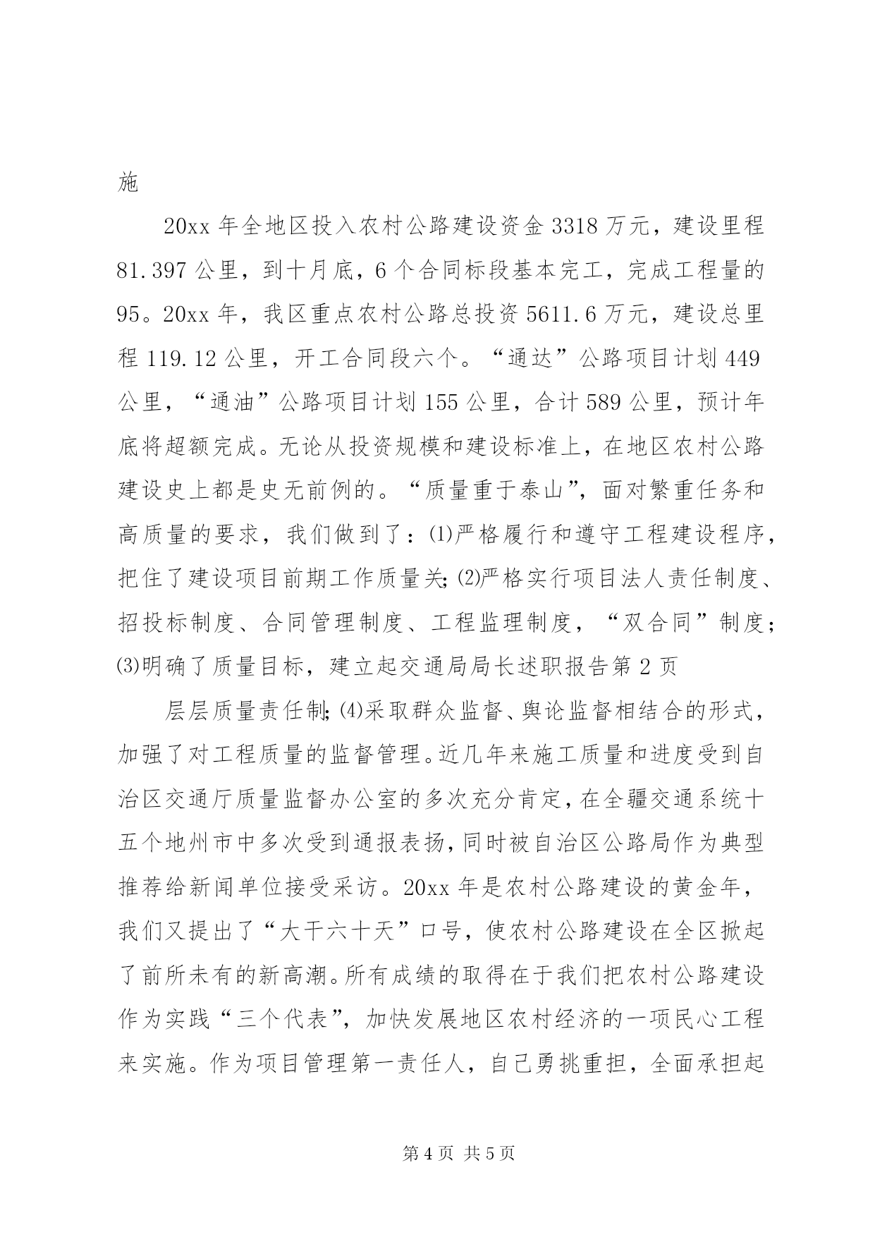 第PAGE\*Arabic\*MERGEFORMAT5页共NUMPAGES\*MERGEFORMAT5页交通局局长述职报告文章标题:交通局局长述职报告本人任职以来,在马列主义、毛泽东思想、邓小平理论和“三个代表”重要思想的指引下,以只争朝夕的精神努力工作,恪尽职守,勤勉自立,为XX市交通事业的发展作出了自己的努力。特别是这两年自治区对农村公路建设投资逐年成倍增加,面对千载难逢的历史机遇和繁重的公路建设任务,作为地区交通局局长,自己深感肩负的责任重大。几年来,在地委行署的正确领导下,自己以发展地区交通事业、促进地区经济发展为已任,团结交通局领导班子全体成员,积极与有关部门协调配合,充分调动广大干部的积极性、创造性,抢抓机遇,开拓奋进,以强烈的责任感和使命感投身于地区交通事业的发展。通过艰苦付出和不懈努力,各项工作取得了显著的成效。农村公路建设任务每年都能在保证质量的前提下足额完成。并受到自治区交通厅通报表扬。公路规划工作在全疆交通系统十五个地州市中名列榜首,创建文明行业、纠风工作分别在全疆交通系统进行经验交流,运输市场秩序进一步规范,安全生产工作深入扎实地开展,交通工作呈现出良好的发展局面。取得成绩的同时,当然也存在一些不足。下面就任职以来所做的主要工作作以下总结。一、政治思想上始终保持与党一致,工作作风保持朴实、严谨。思想是统帅,是灵魂,是一切工作的生命线。通过不断学习我党先进的理论著作,充实自己政治头脑,使自己具备了一名合格共产党员的责任感与政治觉悟。深受党的多年培养教育,始终以党的纲领作为我的行动指南。时刻铭记共产党员的义务和全心全意为人民服务的宗旨,作人民的公仆。严格遵守党的各项纪律,在思想上、政治上、行动上和党中央保持高度一致。坚持一切工作从实际出发,务实进取,勇于创新,在工作中不摆花架子,不说空话,多干实事,坚持务实扎实,实干苦干、朴实严谨的作风,在自己的工作范围内努力做“三个代表”的忠实实践者。根据党的廉洁奉公,勤政为民的要求,积极地自觉地参加党委中心组和党支部的各项政治理论学习,牢固树立公仆意识,脚踏实地,团结同志,积极完成组织交给的各项任务。二、认真履行工作职责,加快XX市公路交通事业迅猛发展作为地区交通局局长、党委副书记,主管全盘交通政务工作,主要负责固定资产投资、计划、财务、审计、公路建设、交通战备等工作。在工作中,我认真贯彻执行党和国家的方针、政策,不折不扣地落实地委、行署的各项安排,按照地区大干快上、快速发展的要求,开拓奋进,求真务实,加快公路交通各项工作的发展。任职以来,主要做好以下几方面的工作:1、积极做好协调服务,加快干线公路建设步伐。XX市是典型的公路经济,要实现人流、物流、信息流的快速发展,必须加大公路交通基础设施建设步伐,以公路建设的快速发展,带动相关产业的发展,拉动地区经济的快速增长。在新疆公路交通建设大投入、大建设、大发展时期,作为交通局局长,自己始终把加快地区公路交通基础设施建设、重点农村公路建设、“通达”和“通油”工程建设作为第一要务,抢抓机遇,千方百计争取项目和公路建设资金。在地委、行署的大力支持和交通厅的关怀下,通过我们的不懈努力,20xx年度,我们争取到了5亿多元的公路基础设施建设资金,其中:地区国省道干线投资4.864亿元,新建、改建、改造道路400多公里;农村道路投资1430万元,新建、改建道路60多公里;地方城镇道路建设资金2626万元,累计修建11公里;客运站点投资312万元。20xx年我区共安排国道、省道、干线公路建设项目12个,公路建设总投资近7亿元,建设里程1000多公里。在落实项目资金后,由于施工项目多,施工条件不一,为确保工程顺利进行,我们加强与各县(市)政府的协调与沟通,在认真落实地区出台的各项优惠政策的同时,积极主动与施工单位加强联系,及时了解施工进展情况,随时解决工作中遇到问题,做到哪里出现问题我们的工作就开展到哪里,通过大量艰苦细致的工作,为地区公路建设创造了更加宽松的施工环境,为工程项目的顺利实施提供了有力保证。2、严格规范管理,把好质量关,确保农村公路建设顺利实施20xx年全地区投入农村公路建设资金3318万元,建设里程81.397公里,到十月底,6个合同标段基本完工,完成工程量的95。20xx年,我区重点农村公路总投资5611.6万元,建设总里程119.12公里,开工合同段六个。“通达”公路项目计划449公里,“通油”公路项目计划155公里,合计589公里,预计年底将超额完成。无论从投资规模和建设标准上,在地区农村公路建设史上都是史无前例的。“质量重于泰山”,面对繁重任务和高质量的要求,我们做到了:⑴严格履行和遵守工程建设程序,把住了建设项目前期工作质量关;⑵严格实行项目法人责任制度、招投标制度、合同管理制度、工程监理制