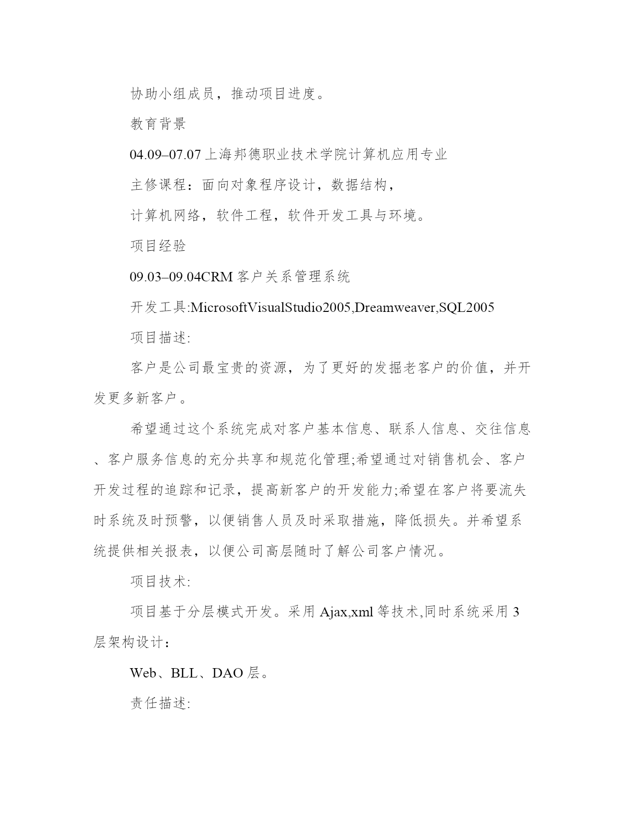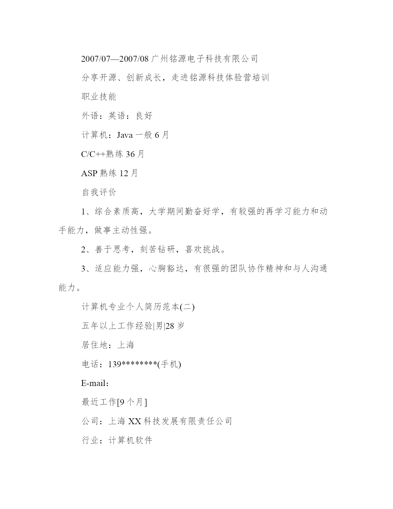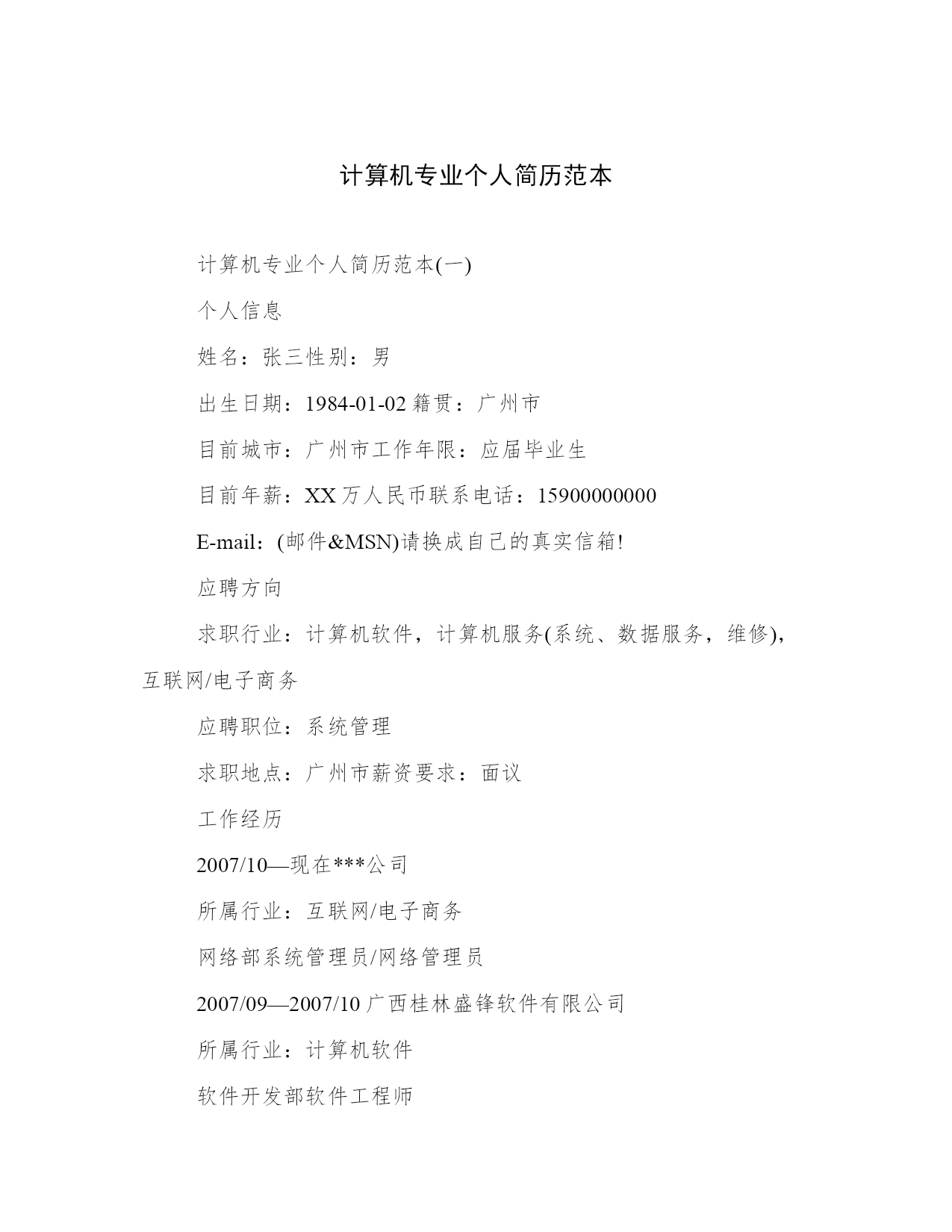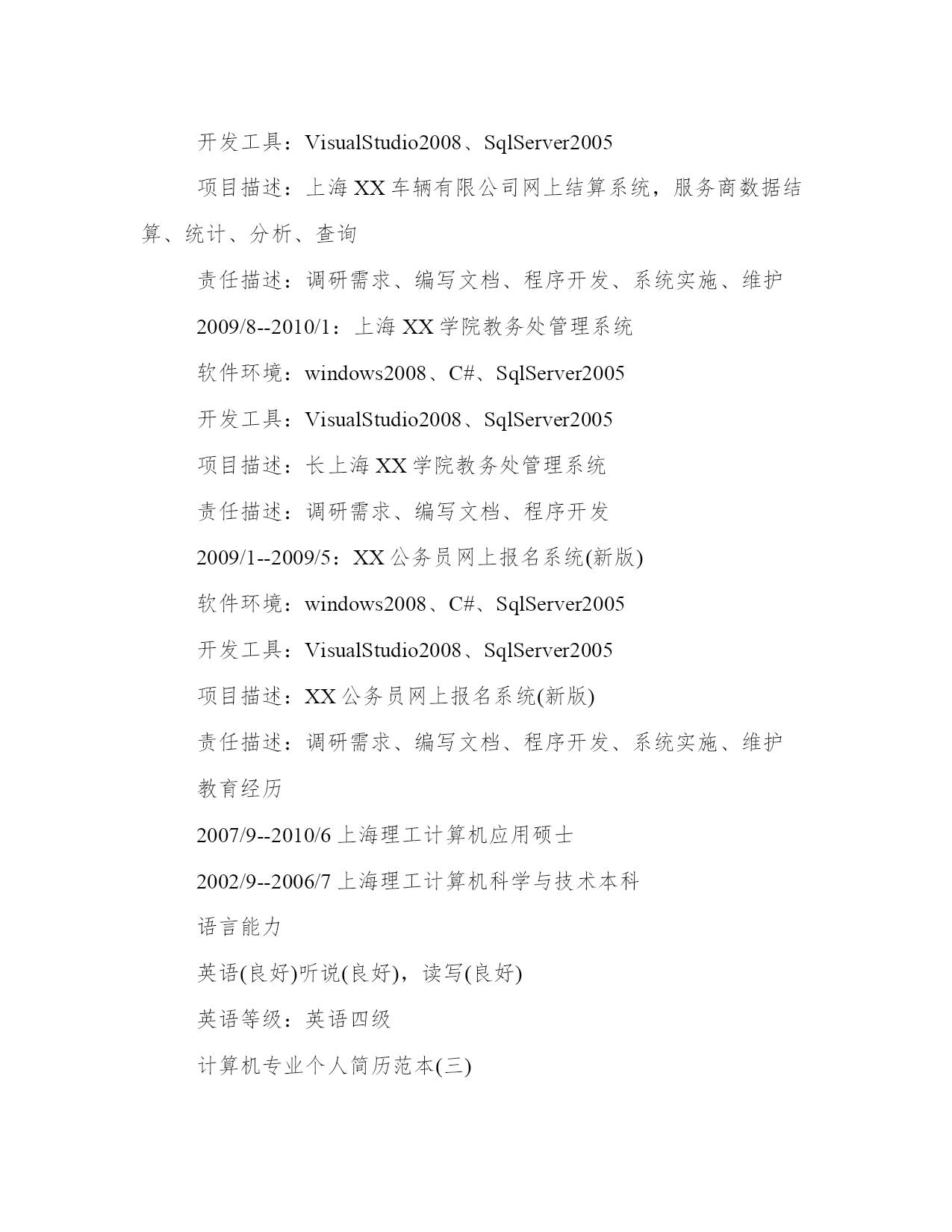 计算机专业个人简历范本计算机专业个人简历范本(一)个人信息姓名:张三性别:男出生日期:1984-01-02籍贯:广州市目前城市:广州市工作年限:应届毕业生目前年薪:XX万人民币联系电话:15900000000E-mail:(邮件&MSN)请换成自己的真实信箱!应聘方向求职行业:计算机软件,计算机服务(系统、数据服务,维修),互联网/电子商务应聘职位:系统管理求职地点:广州市薪资要求:面议工作经历2007/10—现在***公司所属行业:互联网/电子商务网络部系统管理员/网络管理员2007/09—2007/10广西桂林盛锋软件有限公司所属行业:计算机软件软件开发部软件工程师主要职责:见习,深入了解软件开发过程。2007/09—2007/10广西桂林生产桂林漓江信息产业集团公司所属行业:电子技术/半导体/集成电路技术开发部其他2007/07—2007/08广州市铭源电子科技有限公司所属行业:计算机服务(系统、数据服务,维修)技术支持部技术支持工程师主要职责:在公司实习的内容包括计算机有关linux装系统和应用软件的基本操作,在linux与windows系统上大型数据库oracle的安装及基本操作,oracle在企业使用情况,金融业及政府的IT环境,power的小型机及其操作系统AIX,IBM在存储备份上的架构,另外还有商业计划书和体验团队精神,团队合作训练等,公司还安排了参观活动,如参观著名企业IBM,公益活动,如广州海珠儿童康复中心,各式各样的讲座,如与铭源公司经理人,IBM经理的交流,学习了职业规划等等……深入了解了企业级的运行模式,为踏出社会更易于投入工作角色。在实习期间有强烈的求知欲,勤奋好学,表现良好,能够在指定时间内完成安排的工作,热心助任人,善于与同事沟通。项目经验2007/03—2007/06客户关系管(CRM)系统1、软件环境:WindowsXP/2003+ASP+SQLServer2000+IIS2、项目描述:本系统是我的毕业设计,已经做出来了,并得到老师们的一致好评,论文成绩86,通过对本系统的总体设计方案,以及技术平台的选择、开发框架、数据库设计的开发。实现了以下几个功能(客户管理模块,库存管理模块,服务管理模块,分析管理模块等)。使用本系统能够对客户资源进行有效管理,为企业带来参考价值,提高公司的经济效益。3、责任描述:负责整个系统的设计及测试2006/11—2006/12图书管理系统1、软件环境:WindowsXP2、开发工具:VisualFoxPro6.03、项目描述:引入计算机软件进行管理图书,可以大大提高工作人员的工作效率,方便读者借书,还书,续借和查询等…服务,大大减少读者借阅图书的时间,使图书的管理有序,高效化。为此,本小组组织开发了小型图书管理借阅系统。4、获得荣誉:学院软件系统开发大赛一等奖,校第六届电脑作品创作大赛二等奖5、责任描述:我负责系统的学生读者管理模块设计及测试,体验团队合作的精神教育培训2004/09—2008/06湛江师范学院信息与计算科学本科2007/07—2007/08广州铭源电子科技有限公司分享开源、创新成长,走进铭源科技体验营培训职业技能外语:英语:良好计算机:Java一般6月C/C++熟练36月ASP熟练12月自我评价1、综合素质高,大学期间勤奋好学,有较强的再学习能力和动手能力,做事主动性强。2、善于思考,刻苦钻研,喜欢挑战。3、适应能力强,心胸豁达,有很强的团队协作精神和与人沟通能力。计算机专业个人简历范本(二)五年以上工作经验|男|28岁居住地:上海电话:139********(手机)E-mail:最近工作[9个月]公司:上海XX科技发展有限责任公司行业:计算机软件职位:高级软件工程师最高学历学历:硕士专业:计算机应用学校:上海理工自我评价本人为人踏实、勤奋,严格要求自己,工作积极,一丝不苟,对新事物有较强的接受能力。对自己已掌握的技术敢于创新,精益求精,能够妥善的处理周围的人际关系,团结同事,并具有极强的团队合作精神。求职意向到岗时间:即时工作性质:全职希望行业:金融/投资/证券目标地点:沈阳期望月薪:面议/月目标职能:其他工作经验2009/1--至今:上海XX科技发展有限责任公司所属行业:计算机软件开发部高级软件工程师独立负责并完成:软件开发整体项目的规划、框架设计、软件开发工作;公司内部系统的维护、升级、数据资料的存储备份等。2005/6--2008/12:XX网(某知名网站)所属行业:互联网/电子商务技术部BI工程师XX网商业智能(BI)团队核心人员,参与开发维护XX网数据仓库;负责