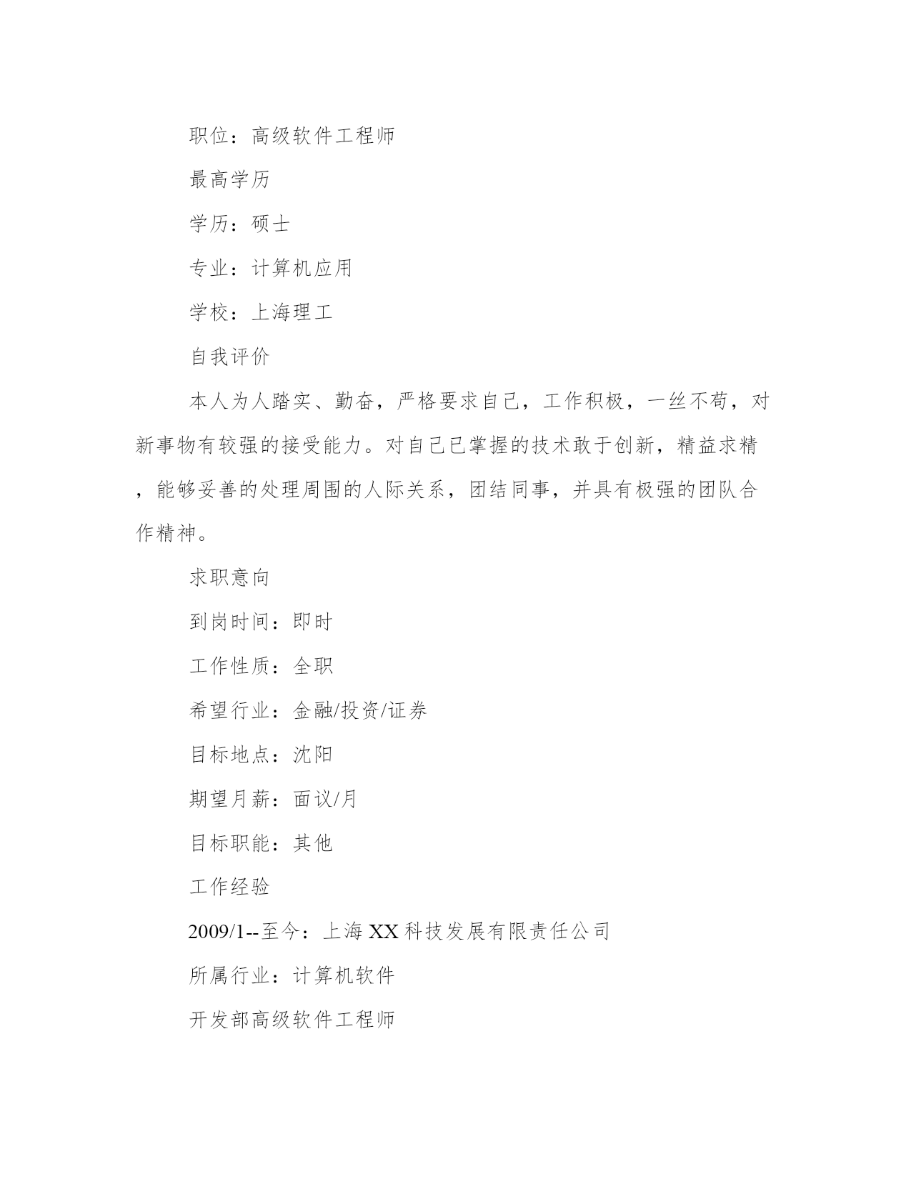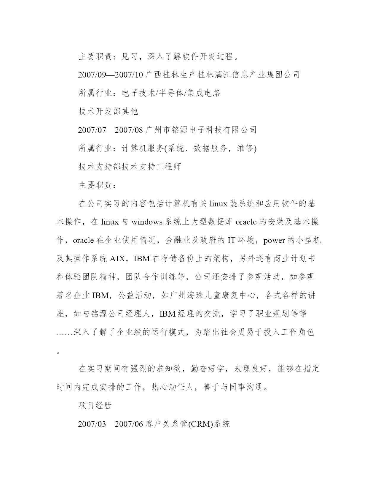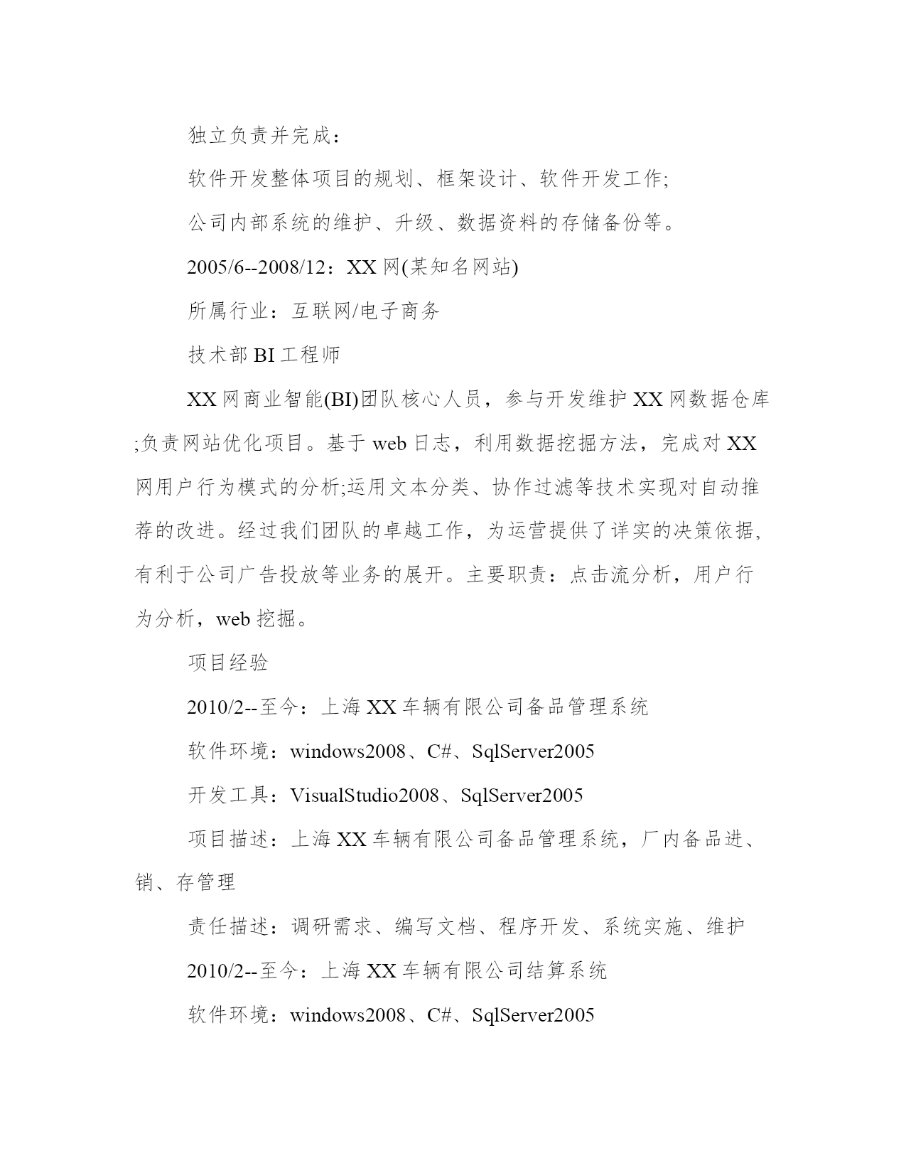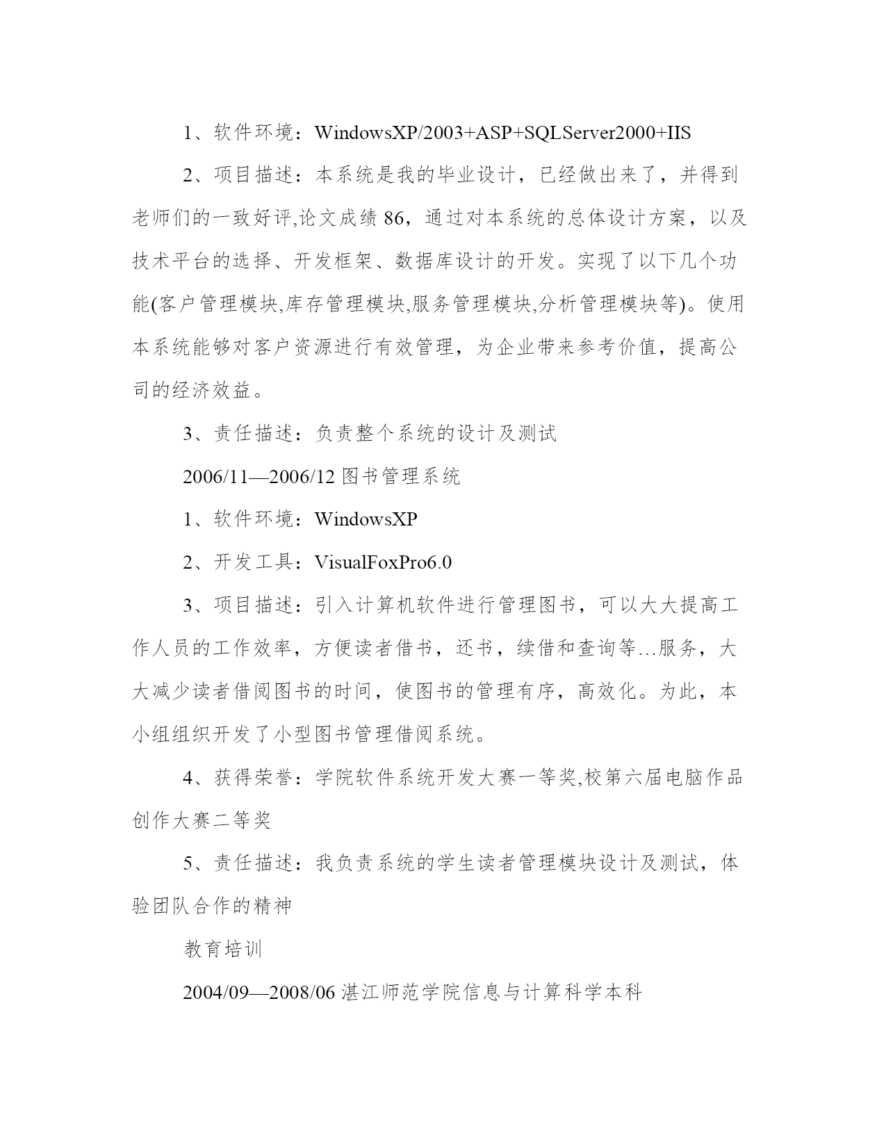 计算机专业个人简历范本计算机专业个人简历范本(一)个人信息姓名:张三性别:男出生日期:1984-01-02籍贯:广州市目前城市:广州市工作年限:应届毕业生目前年薪:XX万人民币联系电话:15900000000E-mail:(邮件&MSN)请换成自己的真实信箱!应聘方向求职行业:计算机软件,计算机服务(系统、数据服务,维修),互联网/电子商务应聘职位:系统管理求职地点:广州市薪资要求:面议工作经历2007/10—现在***公司所属行业:互联网/电子商务网络部系统管理员/网络管理员2007/09—2007/10广西桂林盛锋软件有限公司所属行业:计算机软件软件开发部软件工程师主要职责:见习,深入了解软件开发过程。2007/09—2007/10广西桂林生产桂林漓江信息产业集团公司所属行业:电子技术/半导体/集成电路技术开发部其他2007/07—2007/08广州市铭源电子科技有限公司所属行业:计算机服务(系统、数据服务,维修)技术支持部技术支持工程师主要职责:在公司实习的内容包括计算机有关linux装系统和应用软件的基本操作,在linux与windows系统上大型数据库oracle的安装及基本操作,oracle在企业使用情况,金融业及政府的IT环境,power的小型机及其操作系统AIX,IBM在存储备份上的架构,另外还有商业计划书和体验团队精神,团队合作训练等,公司还安排了参观活动,如参观著名企业IBM,公益活动,如广州海珠儿童康复中心,各式各样的讲座,如与铭源公司经理人,IBM经理的交流,学习了职业规划等等……深入了解了企业级的运行模式,为踏出社会更易于投入工作角色。在实习期间有强烈的求知欲,勤奋好学,表现良好,能够在指定时间内完成安排的工作,热心助任人,善于与同事沟通。项目经验2007/03—2007/06客户关系管(CRM)系统1、软件环境:WindowsXP/2003+ASP+SQLServer2000+IIS2、项目描述:本系统是我的毕业设计,已经做出来了,并得到老师们的一致好评,论文成绩86,通过对本系统的总体设计方案,以及技术平台的选择、开发框架、数据库设计的开发。实现了以下几个功能(客户管理模块,库存管理模块,服务管理模块,分析管理模块等)。使用本系统能够对客户资源进行有效管理,为企业带来参考价值,提高公司的经济效益。3、责任描述:负责整个系统的设计及测试2006/11—2006/12图书管理系统1、软件环境:WindowsXP2、开发工具:VisualFoxPro6.03、项目描述:引入计算机软件进行管理图书,可以大大提高工作人员的工作效率,方便读者借书,还书,续借和查询等…服务,大大减少读者借阅图书的时间,使图书的管理有序,高效化。为此,本小组组织开发了小型图书管理借阅系统。4、获得荣誉:学院软件系统开发大赛一等奖,校第六届电脑作品创作大赛二等奖5、责任描述:我负责系统的学生读者管理模块设计及测试,体验团队合作的精神教育培训2004/09—2008/06湛江师范学院信息与计算科学本科2007/07—2007/08广州铭源电子科技有限公司分享开源、创新成长,走进铭源科技体验营培训职业技能外语:英语:良好计算机:Java一般6月C/C++熟练36月ASP熟练12月自我评价1、综合素质高,大学期间勤奋好学,有较强的再学习能力和动手能力,做事主动性强。2、善于思考,刻苦钻研,喜欢挑战。3、适应能力强,心胸豁达,有很强的团队协作精神和与人沟通能力。计算机专业个人简历范本(二)五年以上工作经验|男|28岁居住地:上海电话:139********(手机)E-mail:最近工作[9个月]公司:上海XX科技发展有限责任公司行业:计算机软件职位:高级软件工程师最高学历学历:硕士专业:计算机应用学校:上海理工自我评价本人为人踏实、勤奋,严格要求自己,工作积极,一丝不苟,对新事物有较强的接受能力。对自己已掌握的技术敢于创新,精益求精,能够妥善的处理周围的人际关系,团结同事,并具有极强的团队合作精神。求职意向到岗时间:即时工作性质:全职希望行业:金融/投资/证券目标地点:沈阳期望月薪:面议/月目标职能:其他工作经验2009/1--至今:上海XX科技发展有限责任公司所属行业:计算机软件开发部高级软件工程师独立负责并完成:软件开发整体项目的规划、框架设计、软件开发工作;公司内部系统的维护、升级、数据资料的存储备份等。2005/6--2008/12:XX网(某知名网站)所属行业:互联网/电子商务技术部BI工程师XX网商业智能(BI)团队核心人员,参与开发维护XX网数据仓库;负责