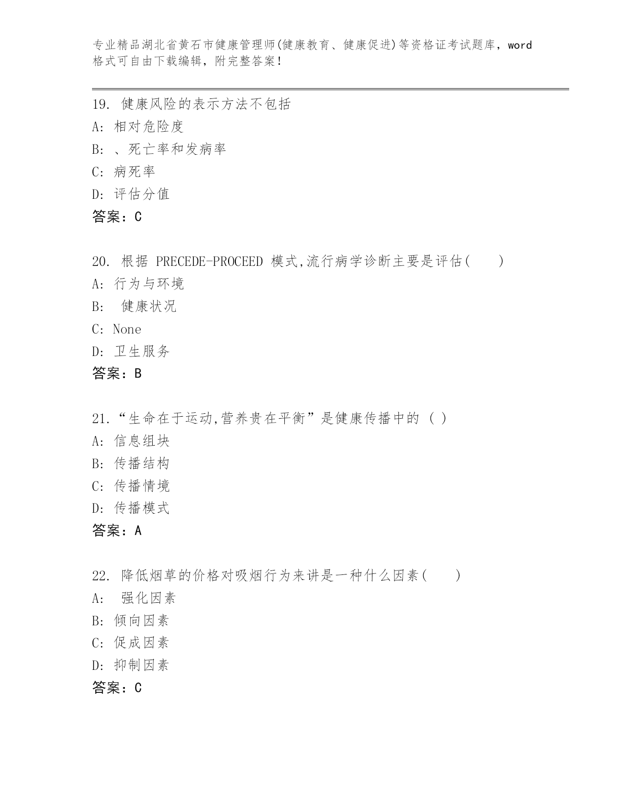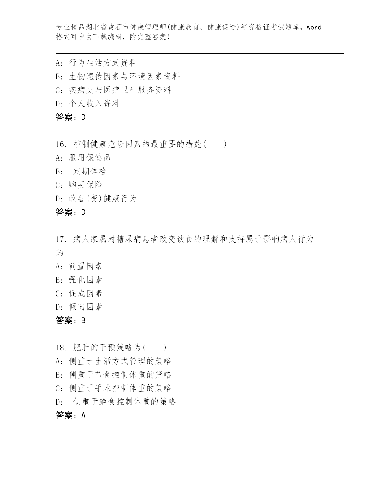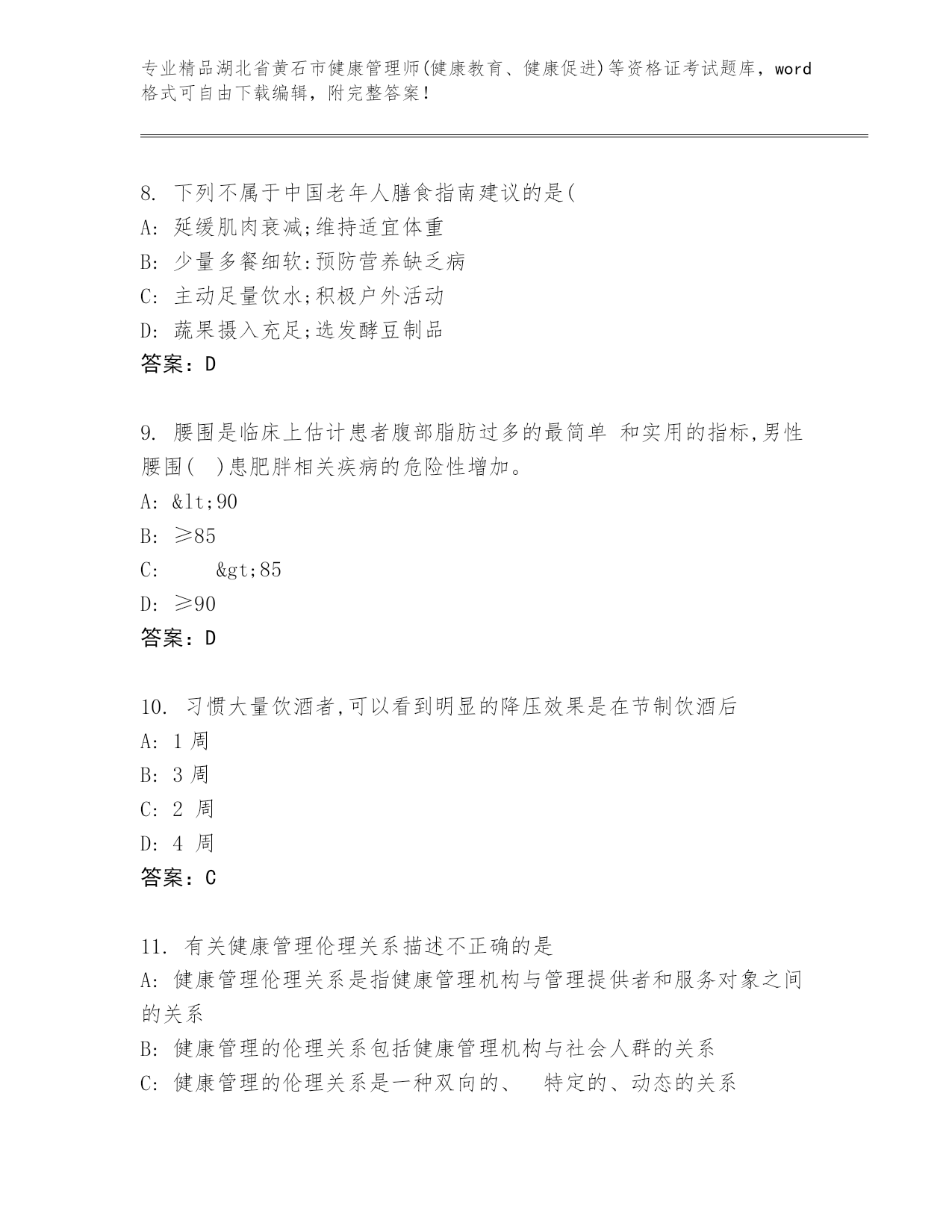 历年湖北省黄石市健康管理师(健康教育、健康促进)等资格证考试优选题库及答案(新).docx
