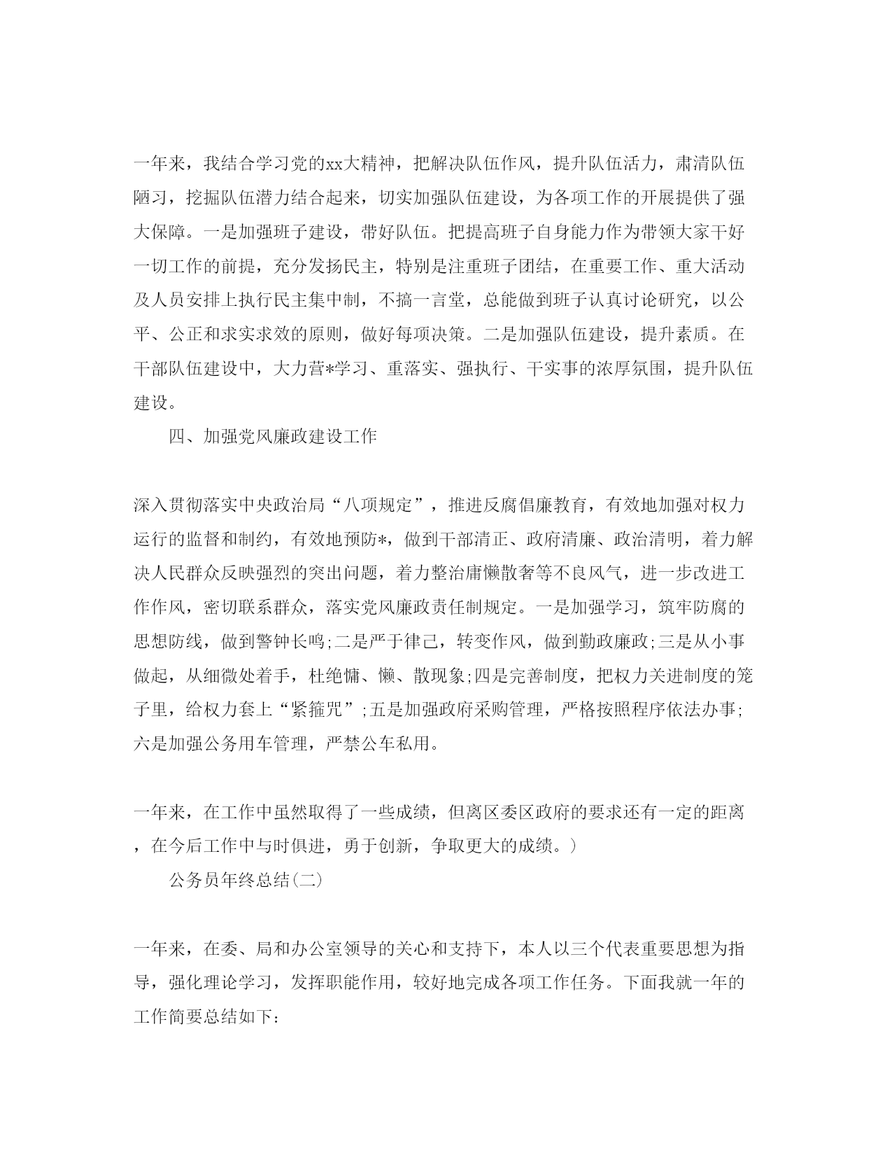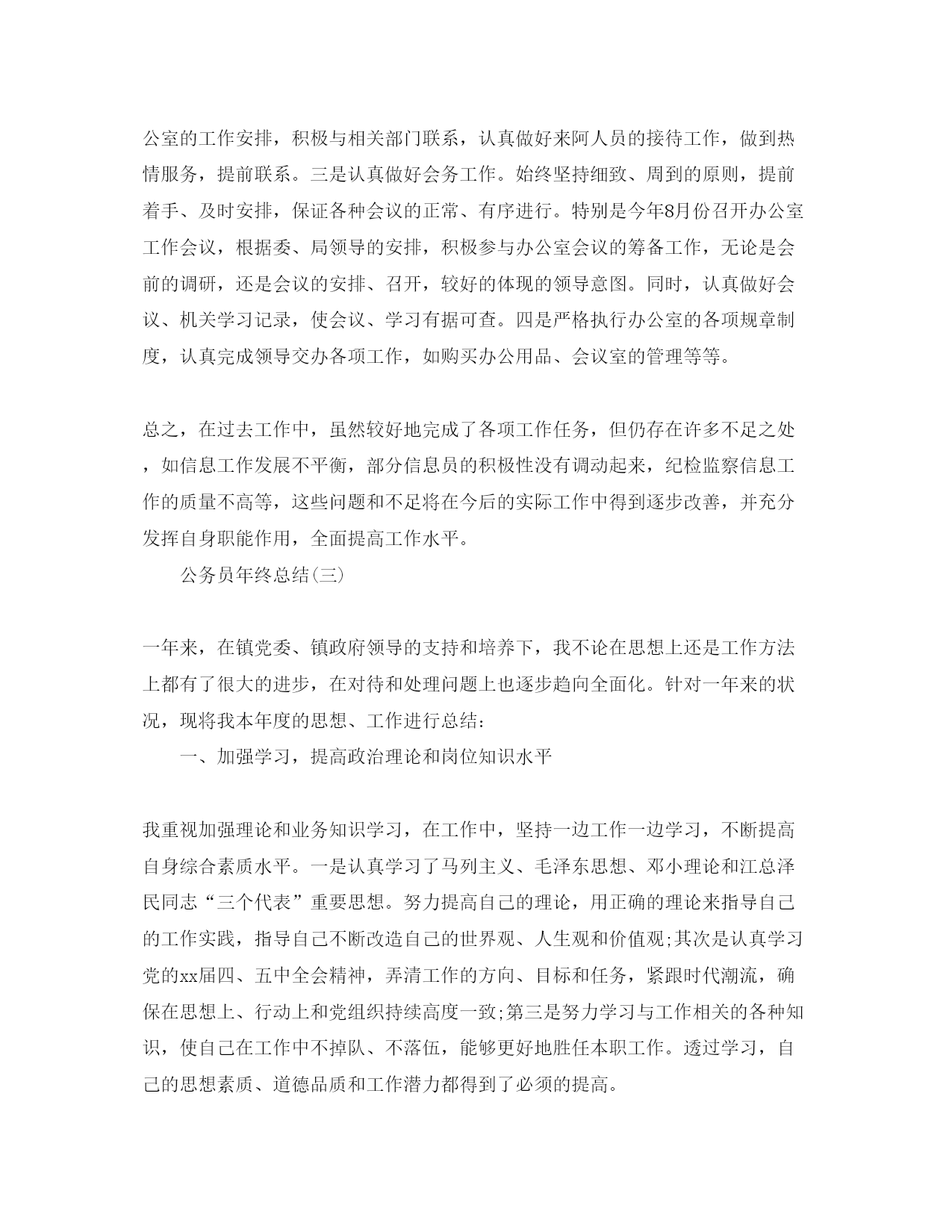 此资料由网络收集而来,如有侵权请告知上传者立即删除。资料共分享,我们负责传递知识。公务员的个人年终总结书写工作总结要用第一人称。即要从本单位、本部门的角度来撰写。下面小编就和大家分享公务员年终总结,来欣赏一下吧。公务员年终总结(一)一年来,我在区委、区政府领导的正确领导下,继续深入学习贯彻党的xx大、xx届xxxx全会精神,严格执行中央八项规定,坚持围绕中心、服务大局的工作思路,扎实开展各项工作并取得了一些成绩,现简单总结如下:一、强化思想教育,提高综合素质。我注重理论与业务知识学习,带领全体干部职工牢固树立大局意识、责任意识、服务意识,严格执行中央八项规定,认真学习贯彻《机关事务管理条例》,深入学习《党政机关厉行节约反对浪费条例》、《党政机关公务接待管理规定》、《公共机构节能管理条例》、《道路交通安全法》、《食品安全法》、党风廉政教育、《廉洁从政若干准则》等政治理论和业务知识,全局上下形成了浓厚的学习氛围。通过学习,干部职工的思想观念得到进一步升华,“三个意识”及办事能力明显提高;本人的政策理论水平和把握大局能力有效提高,筑牢了思想道德和党纪国法两道防线,树立了正确的世界观、人生观和价值观。二、扎实开展工作,积极完成各项工作任务。今年上半年在文体局工作中,着力抓好以下工作:一是以文化惠民为己任,精心开展各类群众活动;二是不断提升xxxx文化品牌;三是不断完善公共文化服务体系建设。做好公共图书馆、文化馆、文化站免费开放工作,开展“两馆一站”免费开放的督查,不断提升为群众服务水平。四是做好文化遗产保护工作;五是确保文化市场的繁荣稳定;六是加强文化队伍的建设。今年5月底,经组织安排调到机关事务局工作。主要做了以下工作:一是公共机构节能工作。我们围绕意识节能、管理节能、技术节能三条主线,充分发挥政府机关节能降耗示范和导向作用,把公共机构节能工作作为节约型机关的重头戏,大处谋划,小处入手,全面推进公共机构节能工作,取得明显成效。xxxx年公共机构人均综合能耗、水耗同比分别下降4%,单位建筑面积能耗同比下降3.2%,达到了预期目标。二是加强了机关车队管理。认真贯彻落实中央“八项规定”,树立节俭意识,培养精打细算、勤俭节约的良好习惯,坚持原则,依法办事。重点加强车辆经费管理,对车辆经费发票的核销,严格执行审批制度,杜绝浪费和违纪现象的发生。狠抓交通安全教育工作,增强安全意识。我区机关车队驾驶员安全行车,没有发生重大的交通责任事故。三是抓好会务服务工作。不断建立和完善会务服务机制,提升会务服务质量和水平。圆满完成我区今年800多场(次)会务工作。四是抓好综合保障工作。水、电、空调等设备的维修、维护和节能降耗等各项工作正常开展。精心抓好区行政中心的清洁、花木养护工作。在做好区行政中心以及负责的责任区清洁工作的同时,积极开展“美丽xxxx·清洁乡村”活动,亲自带队,组织精干力量参与挂村工作。多次组织干部职工深入到挂点村屯开展清洁乡村活动,并从有限的工作经费中挤出4000元支持挂点乡镇工作。加强机关食堂监管工作。严格管理,着力抓好食品安全,杜绝食物中毒事故发生;把好饭菜质量关,不断改善机关干部职工饮食。加强机关安全保卫工作。加强保安队伍建设,狠抓思想教育工作,提高安全意识、责任意识。三、加强领导干部作风建设,树立良好形象一年来,我结合学习党的xx大精神,把解决队伍作风,提升队伍活力,肃清队伍陋习,挖掘队伍潜力结合起来,切实加强队伍建设,为各项工作的开展提供了强大保障。一是加强班子建设,带好队伍。把提高班子自身能力作为带领大家干好一切工作的前提,充分发扬民主,特别是注重班子团结,在重要工作、重大活动及人员安排上执行民主集中制,不搞一言堂,总能做到班子认真讨论研究,以公平、公正和求实求效的原则,做好每项决策。二是加强队伍建设,提升素质。在干部队伍建设中,大力营*学习、重落实、强执行、干实事的浓厚氛围,提升队伍建设。四、加强党风廉政建设工作深入贯彻落实中央政治局“八项规定”,推进反腐倡廉教育,有效地加强对权力运行的监督和制约,有效地预防*,做到干部清正、政府清廉、政治清明,着力解决人民群众反映强烈的突出问题,着力整治庸懒散奢等不良风气,进一步改进工作作风,密切联系群众,落实党风廉政责任制规定。一是加强学习,筑牢防腐的思想防线,做到警钟长鸣;二是严于律己,转变作风,做到勤政廉政;三是从小事做起,从细微处着手,杜绝慵、懒、散现象;四是完善制度,把权力关进制度的笼子里,给权力套上“紧箍咒”;五是加强政府采购管理,严格按照程序依法办事;六是加强公务用车管理,严禁公车私用。一年来,在工作中虽然取得了一些成绩,但离区委区政府的要求还有一定的距离,在今后工作中与时俱进,勇于创新,争取更大的成绩。)公务员年终总结(二)一年来,