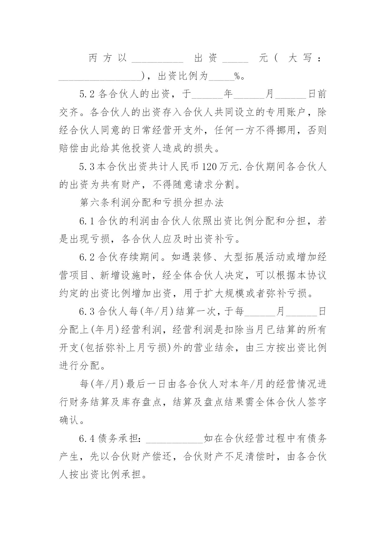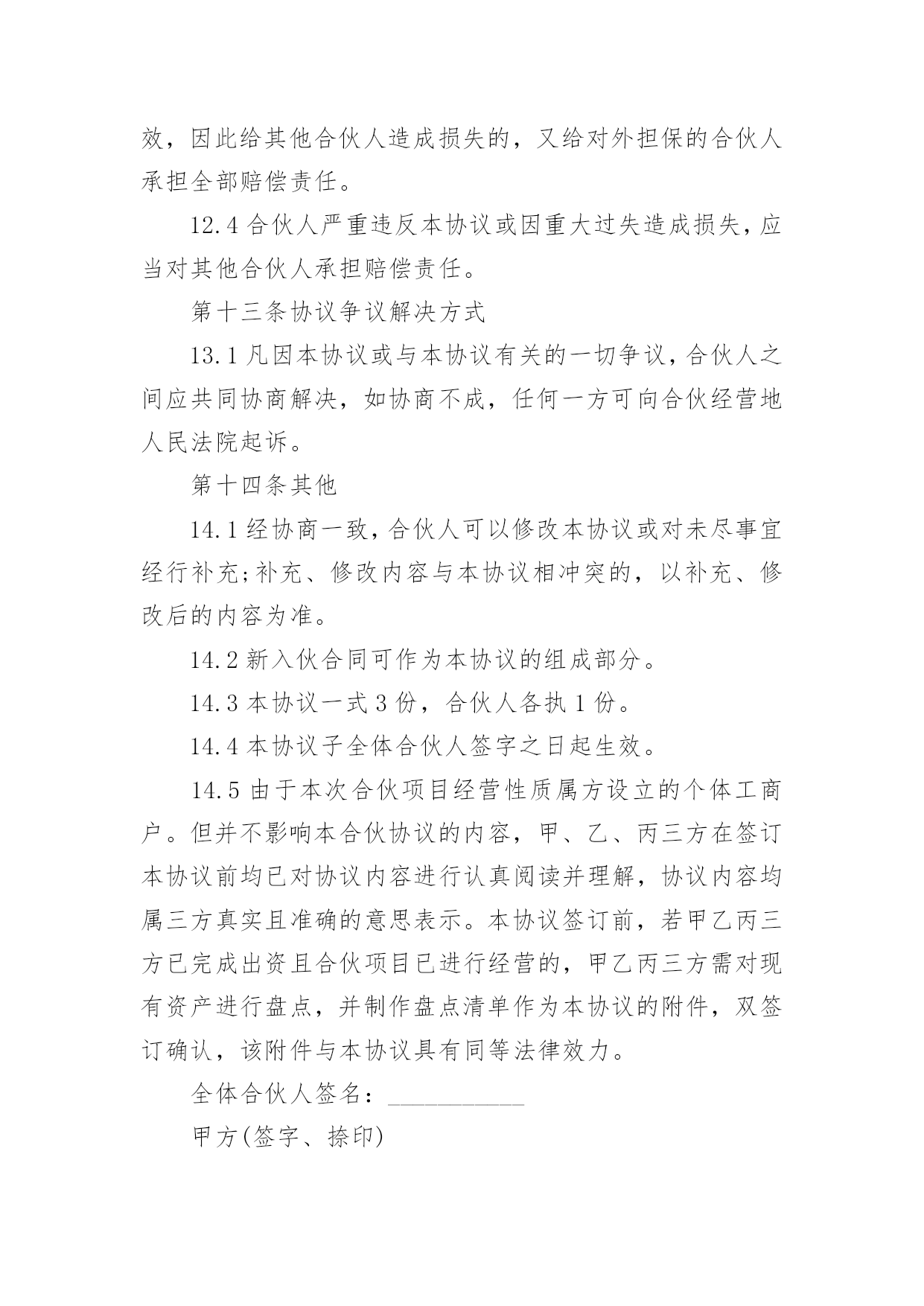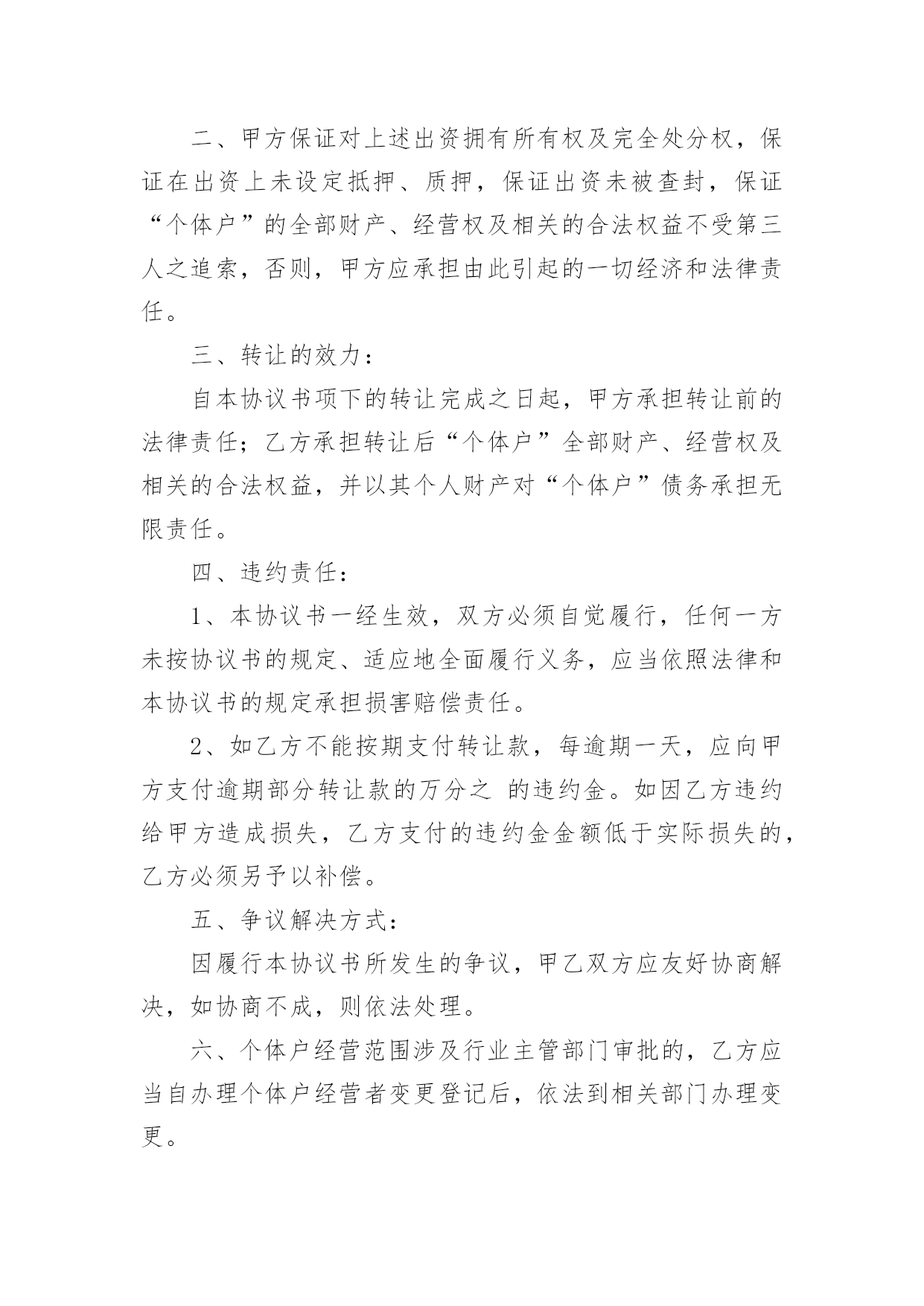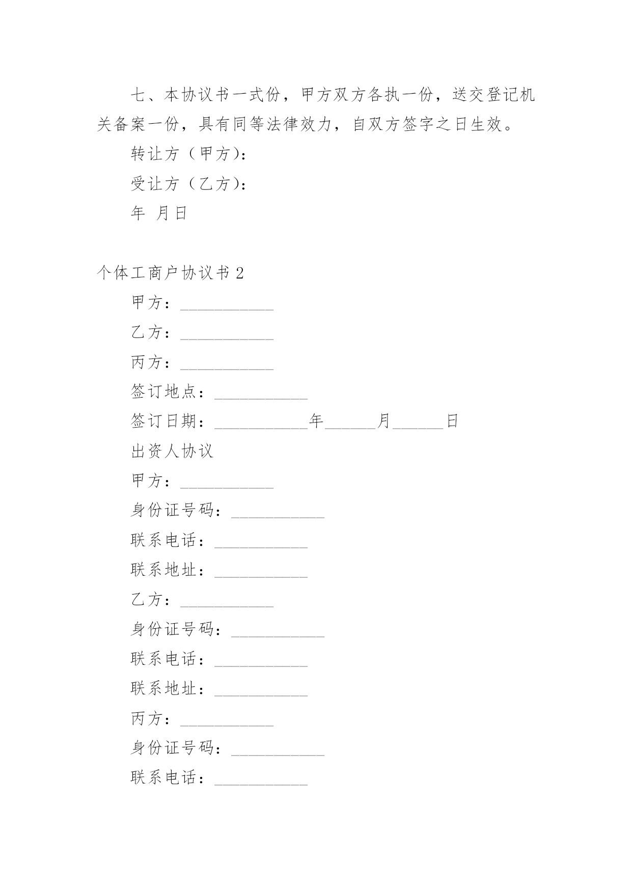 个体工商户协议书在发展不断提速的社会中,协议在生活中的使用越来越广泛,签订签订协议可以使事务的结果更加完美化。那么什么样的协议才是有效的呢?下面是小编精心整理的个体工商户协议书,欢迎大家分享。个体工商户协议书1转让协议书转让方(甲方):身份证号码:地址:受让方(乙方):身份证号码:地址:个体工商户(以下简称“个体户”)于年月日在深圳市设立,由甲方个人投资并经营,“个体户”全部财产属甲方个人所有,并拥有完全的处分权。甲方愿意将其在“个体户”的全部财产、经营权及相关的合法权益转让给乙方,乙方愿意受让。现甲乙双方根据有关法律法规及政府文件的规定,经协商一致,就转让事宜,达成如下协议:一、转让价格:甲方以人民币元的.价格将其在“个体户”的全部财产、经营权及相关的合法权益转让给乙方。二、甲方保证对上述出资拥有所有权及完全处分权,保证在出资上未设定抵押、质押,保证出资未被查封,保证“个体户”的全部财产、经营权及相关的合法权益不受第三人之追索,否则,甲方应承担由此引起的一切经济和法律责任。三、转让的效力:自本协议书项下的转让完成之日起,甲方承担转让前的法律责任;乙方承担转让后“个体户”全部财产、经营权及相关的合法权益,并以其个人财产对“个体户”债务承担无限责任。四、违约责任:1、本协议书一经生效,双方必须自觉履行,任何一方未按协议书的规定、适应地全面履行义务,应当依照法律和本协议书的规定承担损害赔偿责任。2、如乙方不能按期支付转让款,每逾期一天,应向甲方支付逾期部分转让款的万分之的违约金。如因乙方违约给甲方造成损失,乙方支付的违约金金额低于实际损失的,乙方必须另予以补偿。五、争议解决方式:因履行本协议书所发生的争议,甲乙双方应友好协商解决,如协商不成,则依法处理。六、个体户经营范围涉及行业主管部门审批的,乙方应当自办理个体户经营者变更登记后,依法到相关部门办理变更。七、本协议书一式份,甲方双方各执一份,送交登记机关备案一份,具有同等法律效力,自双方签字之日生效。转让方(甲方):受让方(乙方):年月日个体工商户协议书2甲方:___________乙方:___________丙方:___________签订地点:___________签订日期:___________年______月______日出资人协议甲方:___________身份证号码:___________联系电话:___________联系地址:___________乙方:___________身份证号码:___________联系电话:___________联系地址:___________丙方:___________身份证号码:___________联系电话:___________联系地址:___________鉴于:___________现甲乙丙三方当事人在平等自愿、友好协商的基础上,依照《中华人民共和国公司法》、《中华人民共和国民法典》等法律规定,就合伙经营酒店项目事宜达成如下合伙协议:第一条合伙字号、主要经营地1.1合伙字号:___________。1.2经营场所位于:___________市路号。第二条合伙经营项目和范围2.1经营项目:___________2.2范围包括:___________(以工商行政管理局核准范围为准)第三条合伙的组织形式3.1酒店的组织形式是个体工商户,以方名义注册酒店,甲乙丙三方对酒店承担无限连带责任。第四条合伙期限4.1合伙期限为______年,自______年______月______日至______年______月______日止。第五条出资额、方式、期限5.1甲乙丙三方出资额和出资方式为:___________甲方以__________出资_____元(大写:________________元),出资比例为_____%。乙方以__________出资_____元(大写:________________元),出资比例为_____%。丙方以__________出资_____元(大写:________________),出资比例为_____%。5.2各合伙人的出资,于______年______月______日前交齐。各合伙人的出资存入合伙人共同设立的专用账户,除经合伙人同意的日常经营开支外,任何一方不得挪用,否则赔偿由此给其他投资人造成的损失。5.3本合伙出资共计人民币120万元.合伙期间各合伙人的出资为共有财产,不得随意请求分割。第六条利润分配和亏损分担办法6.1合伙的利润由合伙人依照出资比例分配和分担,若是出现亏损,各合伙人应及时出资补亏。6.2合伙存续期间。如遇装修、大型拓展活动或增加经营项目、新增设施时,经全体合伙人决定,可以根据本协议约定的出资比例增加出资,用于扩大规模或者弥补亏损。6.3合伙人每(年/月)结算一次,于每_____