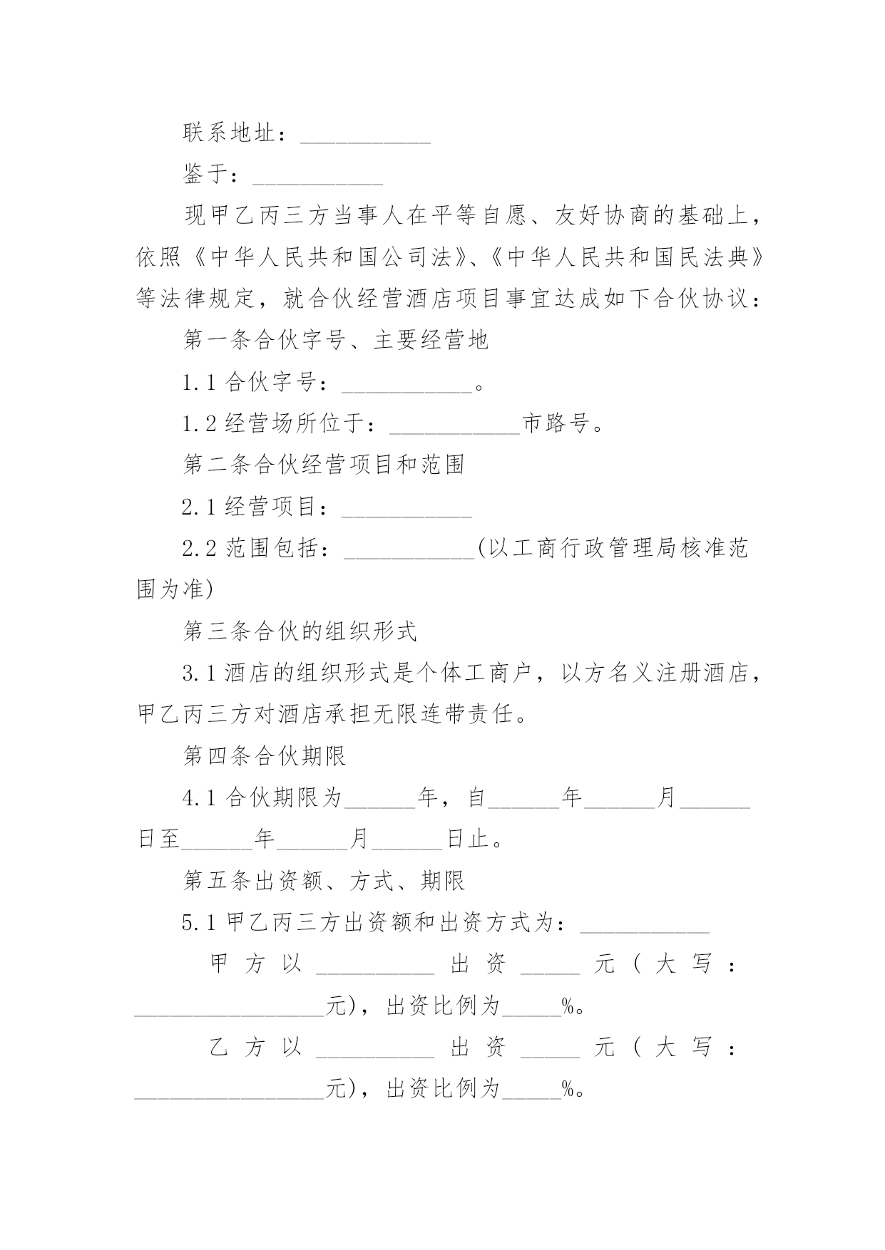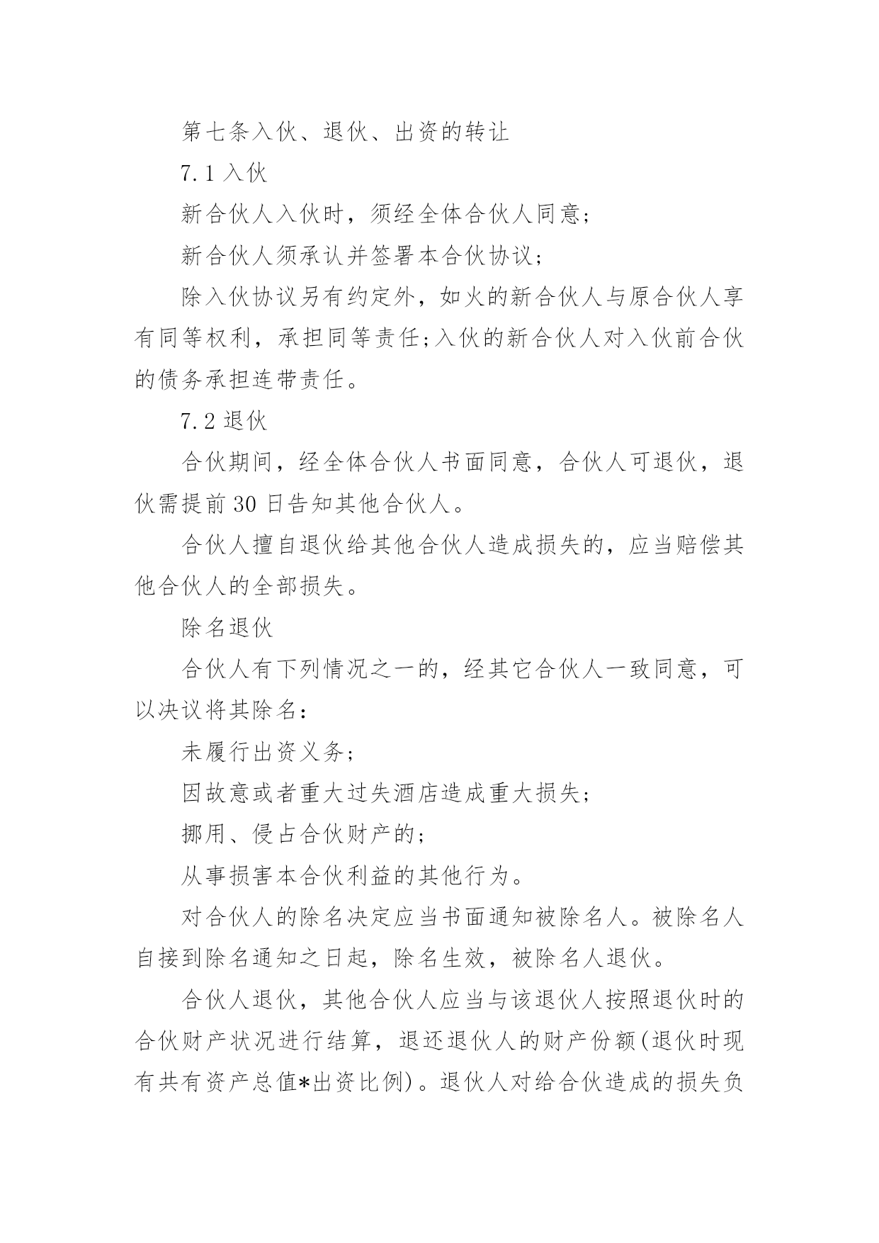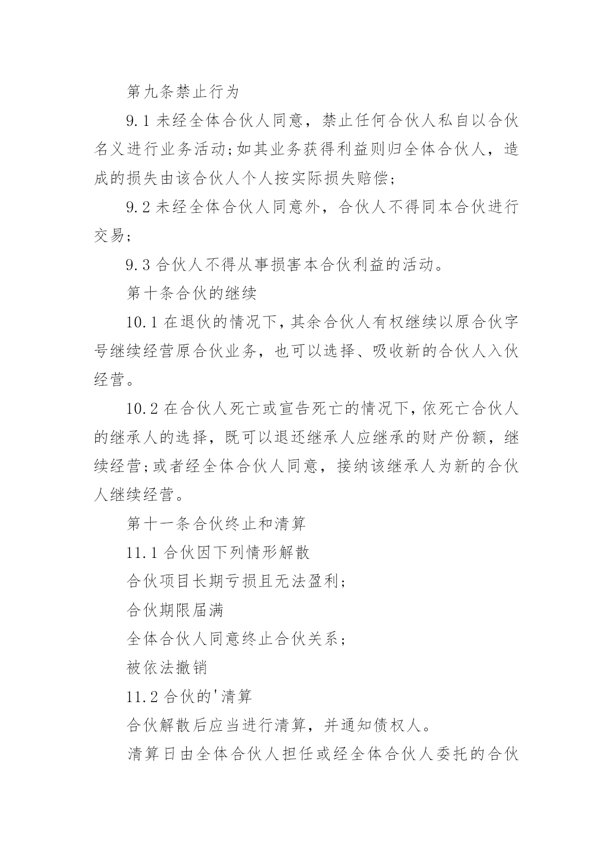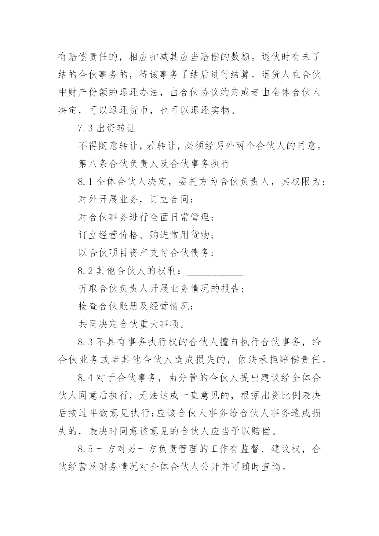 个体工商户协议书在发展不断提速的社会中,协议在生活中的使用越来越广泛,签订签订协议可以使事务的结果更加完美化。那么什么样的协议才是有效的呢?下面是小编精心整理的个体工商户协议书,欢迎大家分享。个体工商户协议书1转让协议书转让方(甲方):身份证号码:地址:受让方(乙方):身份证号码:地址:个体工商户(以下简称“个体户”)于年月日在深圳市设立,由甲方个人投资并经营,“个体户”全部财产属甲方个人所有,并拥有完全的处分权。甲方愿意将其在“个体户”的全部财产、经营权及相关的合法权益转让给乙方,乙方愿意受让。现甲乙双方根据有关法律法规及政府文件的规定,经协商一致,就转让事宜,达成如下协议:一、转让价格:甲方以人民币元的.价格将其在“个体户”的全部财产、经营权及相关的合法权益转让给乙方。二、甲方保证对上述出资拥有所有权及完全处分权,保证在出资上未设定抵押、质押,保证出资未被查封,保证“个体户”的全部财产、经营权及相关的合法权益不受第三人之追索,否则,甲方应承担由此引起的一切经济和法律责任。三、转让的效力:自本协议书项下的转让完成之日起,甲方承担转让前的法律责任;乙方承担转让后“个体户”全部财产、经营权及相关的合法权益,并以其个人财产对“个体户”债务承担无限责任。四、违约责任:1、本协议书一经生效,双方必须自觉履行,任何一方未按协议书的规定、适应地全面履行义务,应当依照法律和本协议书的规定承担损害赔偿责任。2、如乙方不能按期支付转让款,每逾期一天,应向甲方支付逾期部分转让款的万分之的违约金。如因乙方违约给甲方造成损失,乙方支付的违约金金额低于实际损失的,乙方必须另予以补偿。五、争议解决方式:因履行本协议书所发生的争议,甲乙双方应友好协商解决,如协商不成,则依法处理。六、个体户经营范围涉及行业主管部门审批的,乙方应当自办理个体户经营者变更登记后,依法到相关部门办理变更。七、本协议书一式份,甲方双方各执一份,送交登记机关备案一份,具有同等法律效力,自双方签字之日生效。转让方(甲方):受让方(乙方):年月日个体工商户协议书2甲方:___________乙方:___________丙方:___________签订地点:___________签订日期:___________年______月______日出资人协议甲方:___________身份证号码:___________联系电话:___________联系地址:___________乙方:___________身份证号码:___________联系电话:___________联系地址:___________丙方:___________身份证号码:___________联系电话:___________联系地址:___________鉴于:___________现甲乙丙三方当事人在平等自愿、友好协商的基础上,依照《中华人民共和国公司法》、《中华人民共和国民法典》等法律规定,就合伙经营酒店项目事宜达成如下合伙协议:第一条合伙字号、主要经营地1.1合伙字号:___________。1.2经营场所位于:___________市路号。第二条合伙经营项目和范围2.1经营项目:___________2.2范围包括:___________(以工商行政管理局核准范围为准)第三条合伙的组织形式3.1酒店的组织形式是个体工商户,以方名义注册酒店,甲乙丙三方对酒店承担无限连带责任。第四条合伙期限4.1合伙期限为______年,自______年______月______日至______年______月______日止。第五条出资额、方式、期限5.1甲乙丙三方出资额和出资方式为:___________甲方以__________出资_____元(大写:________________元),出资比例为_____%。乙方以__________出资_____元(大写:________________元),出资比例为_____%。丙方以__________出资_____元(大写:________________),出资比例为_____%。5.2各合伙人的出资,于______年______月______日前交齐。各合伙人的出资存入合伙人共同设立的专用账户,除经合伙人同意的日常经营开支外,任何一方不得挪用,否则赔偿由此给其他投资人造成的损失。5.3本合伙出资共计人民币120万元.合伙期间各合伙人的出资为共有财产,不得随意请求分割。第六条利润分配和亏损分担办法6.1合伙的利润由合伙人依照出资比例分配和分担,若是出现亏损,各合伙人应及时出资补亏。6.2合伙存续期间。如遇装修、大型拓展活动或增加经营项目、新增设施时,经全体合伙人决定,可以根据本协议约定的出资比例增加出资,用于扩大规模或者弥补亏损。6.3合伙人每(年/月)结算一次,于每_____