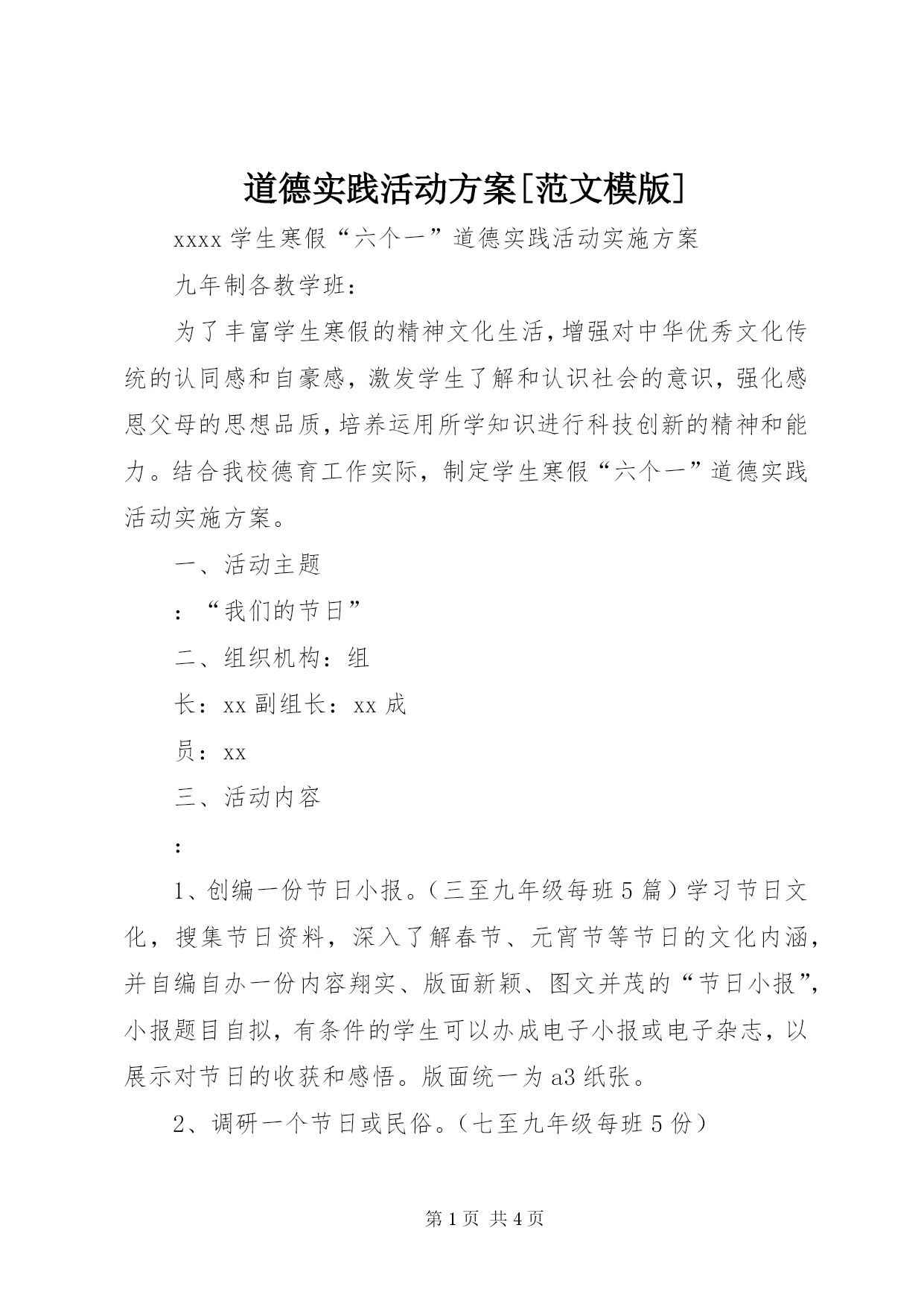 第PAGE\*Arabic\*MERGEFORMAT4页共NUMPAGES\*MERGEFORMAT4页道德实践活动方案[范文模版]xxxx学生寒假“六个一”道德实践活动实施方案九年制各教学班:为了丰富学生寒假的精神文化生活,增强对中华优秀文化传统的认同感和自豪感,激发学生了解和认识社会的意识,强化感恩父母的思想品质,培养运用所学知识进行科技创新的精神和能力。结合我校德育工作实际,制定学生寒假“六个一”道德实践活动实施方案。一、活动主题:“我们的节日”二、组织机构:组长:xx副组长:xx成员:xx三、活动内容:1、创编一份节日小报。(三至九年级每班5篇)学习节日文化,搜集节日资料,深入了解春节、元宵节等节日的文化内涵,并自编自办一份内容翔实、版面新颖、图文并茂的“节日小报”,小报题目自拟,有条件的学生可以办成电子小报或电子杂志,以展示对节日的收获和感悟。版面统一为a3纸张。2、调研一个节日或民俗。(七至九年级每班5份)积极参加有利于学生身心健康的民俗活动,并通过查阅资料、走访邻里街坊等方式,全面、充分了解元宵节、春节等节日的来历、以及与节日有关的各种民俗活动,感受和领悟其中包含的传统文化的特点和精神实质,增强民族自豪感。撰写成书面调研报告。3、为父母洗一次脚,完成孝道作业五个一。(一至九年级,备注:一二三年级完成孝道作业,并要求拍摄照片。每班至少上报5人次,每人次5张照片;四至九年级每班上交5份心得体会)在假期,至少为父母洗一次脚、剪一次指甲。在洗脚过程中,注意观察父母手脚的特点,并与父母积极真诚地交流。透过父母的手脚,了解父母为了家庭的幸福美满所付出的艰辛劳动,感受父母为了子女的健康成长所付出的心血,并懂得以后以实际行动回报和感恩父母。撰写成书面材料,详尽记录洗脚的过程、写出自己的心得体会,并让父母阅读、签字。4、制做一件科技作品。(四至九年级每班五件)运用自己所学的知识,结合生活、学习及社会活动的实际需要,制做一件科技作品,比如机械玩具、遥控玩具、手工布艺玩具、生物标本、节能环保小发明、生活小发明、学习小发明、科技小发明、遥控机器人等,并附卡片,简要写出所用的材料、功能、基本原理等。5、撰写一篇社会实践调研报告,或社会实践活动报告、科技小论文。(七至九年级每班5篇)针对当地社会、经济发展过程中存在的突出的或热点的问题,以及自己假期所参加的社会实践活动,自己在科技制作过程中收集材料、实际制作、思维探索等一系列活动,选择撰写一篇社会实践调研报告、社会实践活动报告、科技小论文等,以培养学生了解社会、探求知识、科技创新的意识和能力。6、读一本好书。每班按照要求每人在校图书室借阅一本图书,并按要求做好读书笔记和撰写读书心得体会。(一至九年级全体学生完成;四至六年级按要求上交《小学生阅读登记手册》)四、有关要求:1、各班主任要高度重视学生假期道德实践活动的重要性,根据学校的安排和要求,将以上六项基本活动逐一进行落实,有关科任教师要对活动的过程、撰写的书面报告或论文的格式等,进行具体地指导,以利于学生积极、有效地开展实践活动。2、各班在安排“六个一”道德实践活动时,要开拓思路,将诵读古今经典、参加社会公益活动、开展地方特色的文化活动等活动,有机地纳入其中,把学生的德育工作和创新精神的培养,与学生的实际、当地的文化活动、假期文化生活紧密结合起来,使学校教育延伸到课外和假期生活,全面提升未成年人思想道德建设和文明校园建设的水平和成效。3、寒假结束后,下一学期开学报到注册时,各班主任和下班教师负责收缴学生的活动书面材料和作品,分项目登记和统计,班级内进行总结、评比。学校将对各班活动开展情况进行评比,对优秀的报告、论文、作品等进行展览,并把此项活动纳入班级考核工作之中。xxxxxx年xx月xx日