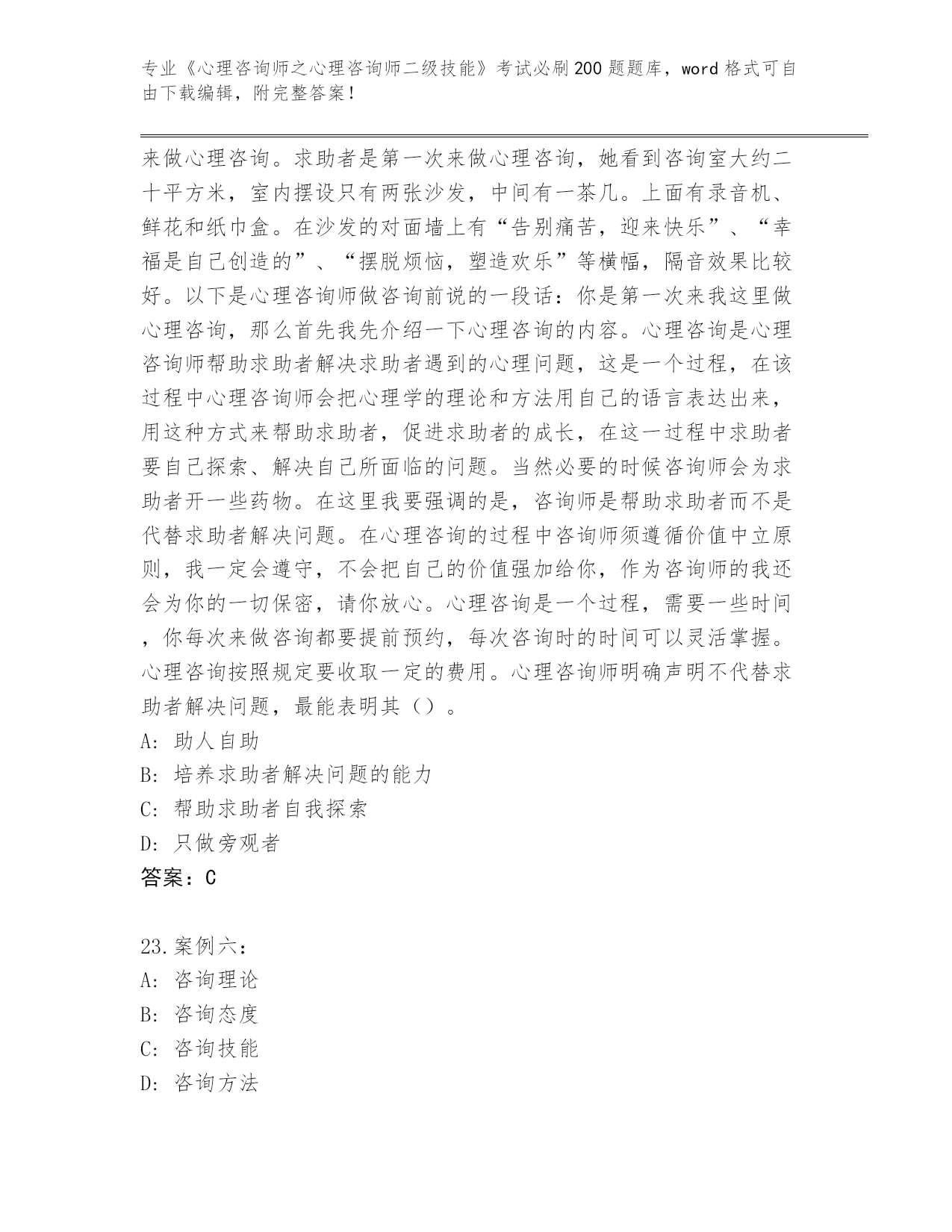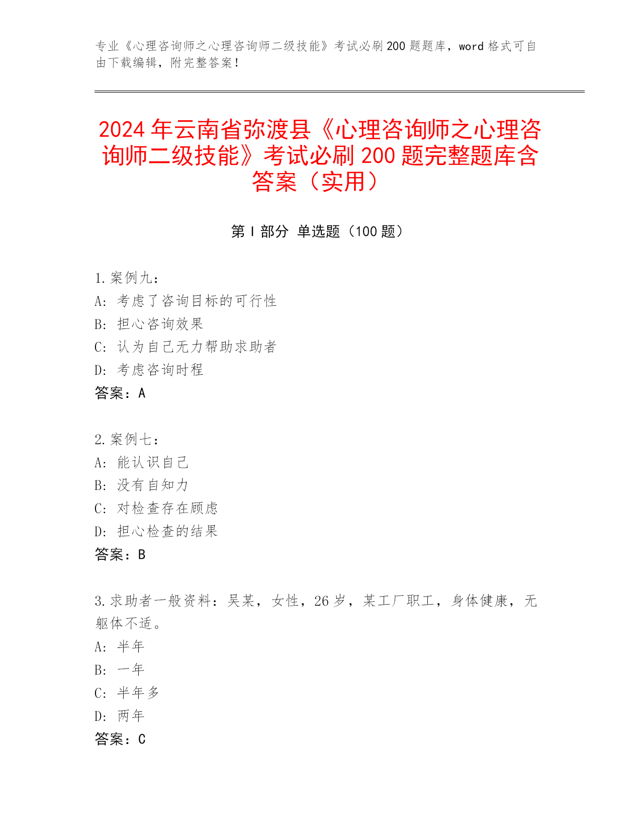 2024年云南省弥渡县《心理咨询师之心理咨询师二级技能》考试必刷200题完整题库含答案(实用)
