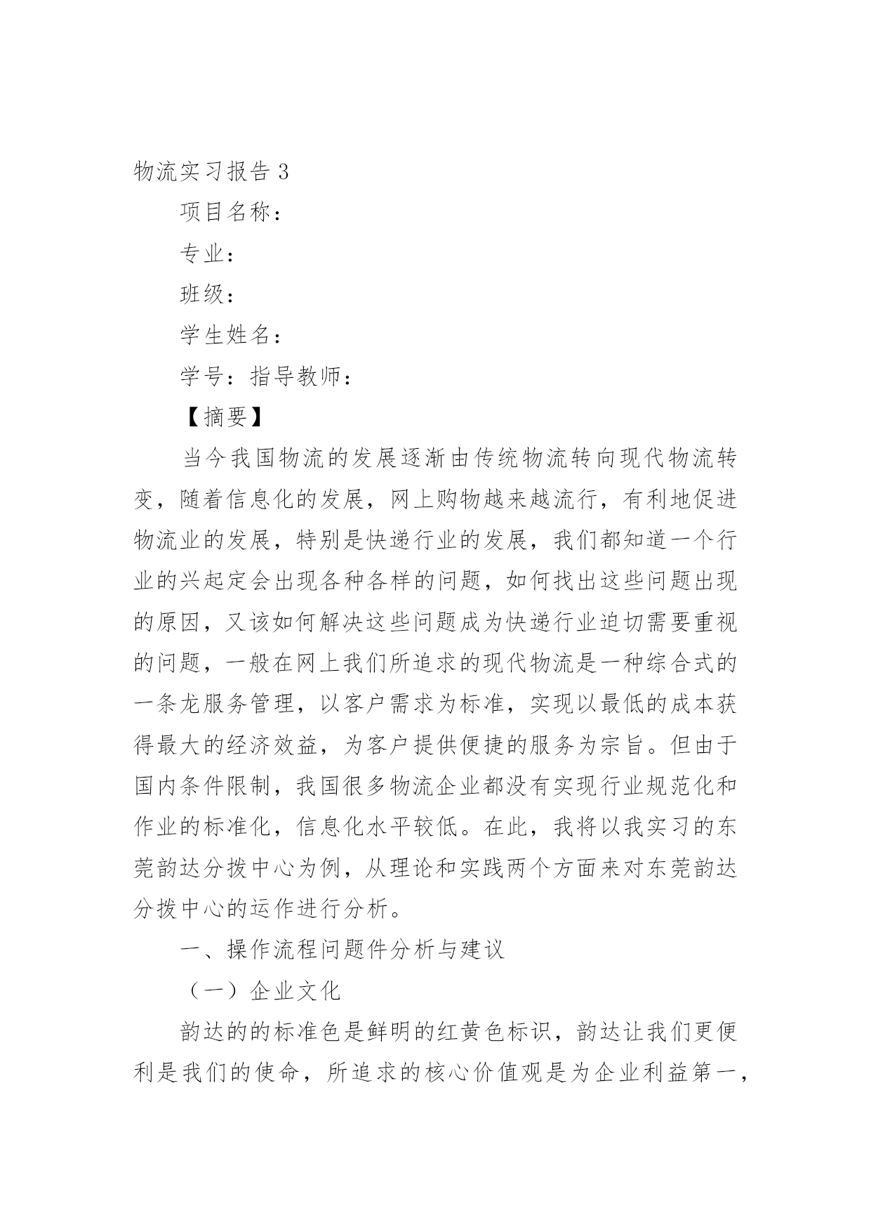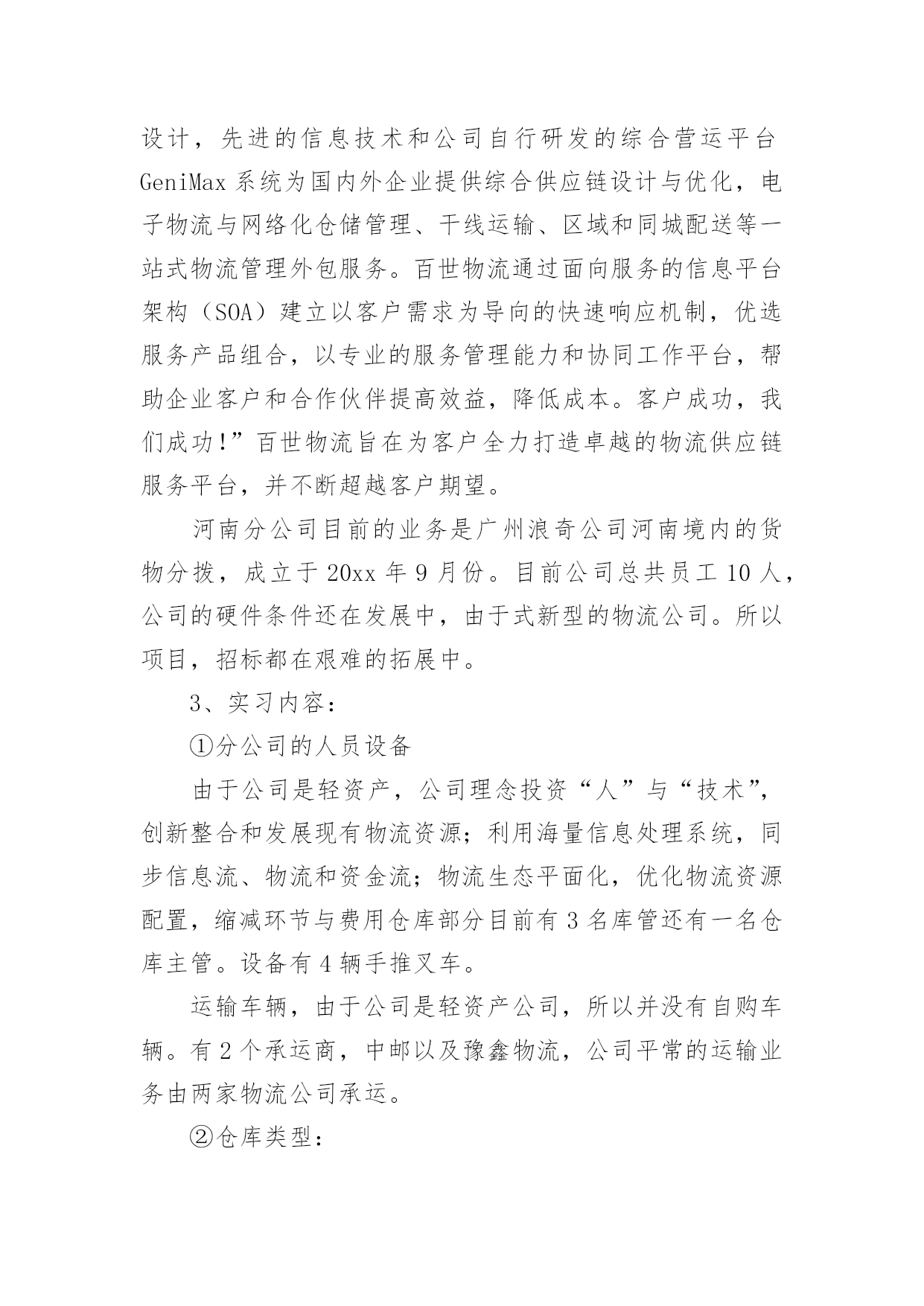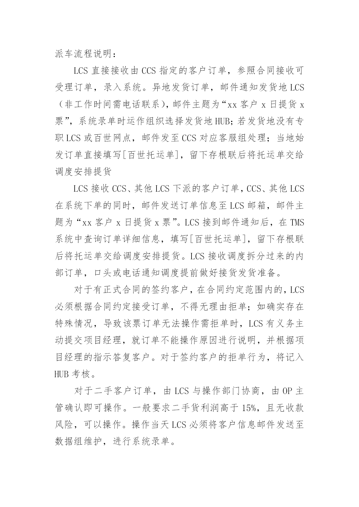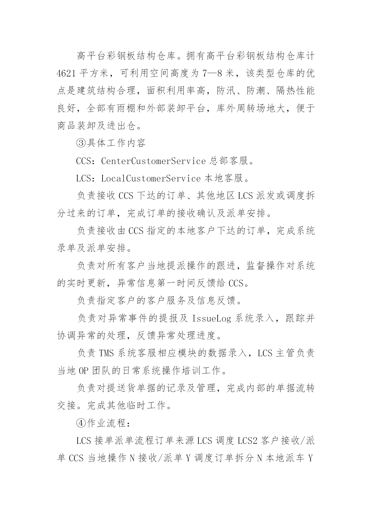物流实习报告物流实习报告【荐】在人们越来越注重自身素养的今天,报告对我们来说并不陌生,报告成为了一种新兴产业。那么一般报告是怎么写的呢?下面是小编帮大家整理的物流实习报告,仅供参考,希望能够帮助到大家。物流实习报告11、实习目的:通过大学四年的系统学习,对于物流的一些理论知识有了一定的了解,但是,这只是停留在脑海中的,对于这个行业还是感觉很陌生,现实中竟要做些什么,物流公司是怎么运营呢?信息部又充当什么角色,还是说物流公司都有自己的车,仓库等实体资产。当然最想弄清楚,自己所选的毕业论文,公司对于提高仓库利用率了采用哪些方法,或者能有什么方法。2、公司概况:百世物流科技有限公司是由信息技术和物流供应链资深专业人士联合组建的创新型综合物流供应链服务提供商。公司注册在香港,中国区总部设在杭州,已在全国范围内建立多级营运中心,配送网络覆盖全国四、五级城市。通过完整、系统的合作伙伴认证管理体系,专业的供应链解决方案设计,先进的信息技术和公司自行研发的综合营运平台GeniMax系统为国内外企业提供综合供应链设计与优化,电子物流与网络化仓储管理、干线运输、区域和同城配送等一站式物流管理外包服务。百世物流通过面向服务的信息平台架构(SOA)建立以客户需求为导向的快速响应机制,优选服务产品组合,以专业的服务管理能力和协同工作平台,帮助企业客户和合作伙伴提高效益,降低成本。客户成功,我们成功!”百世物流旨在为客户全力打造卓越的物流供应链服务平台,并不断超越客户期望。河南分公司目前的业务是广州浪奇公司河南境内的货物分拨,成立于20xx年9月份。目前公司总共员工10人,公司的硬件条件还在发展中,由于式新型的物流公司。所以项目,招标都在艰难的拓展中。3、实习内容:①分公司的人员设备由于公司是轻资产,公司理念投资“人”与“技术”,创新整合和发展现有物流资源;利用海量信息处理系统,同步信息流、物流和资金流;物流生态平面化,优化物流资源配置,缩减环节与费用仓库部分目前有3名库管还有一名仓库主管。设备有4辆手推叉车。运输车辆,由于公司是轻资产公司,所以并没有自购车辆。有2个承运商,中邮以及豫鑫物流,公司平常的运输业务由两家物流公司承运。②仓库类型:高平台彩钢板结构仓库。拥有高平台彩钢板结构仓库计4621平方米,可利用空间高度为7—8米,该类型仓库的优点是建筑结构合理,面积利用率高,防汛、防潮、隔热性能良好,全部有雨棚和外部装卸平台,库外周转场地大,便于商品装卸及进出仓。③具体工作内容CCS:CenterCustomerService总部客服。LCS:LocalCustomerService本地客服。负责接收CCS下达的订单、其他地区LCS派发或调度拆分过来的订单,完成订单的接收确认及派单安排。负责接收由CCS指定的本地客户下达的订单,完成系统录单及派单安排。负责对所有客户当地提派操作的跟进,监督操作对系统的实时更新,异常信息第一时间反馈给CCS。负责指定客户的客户服务及信息反馈。负责对异常事件的提报及IssueLog系统录入,跟踪并协调异常的处理,反馈异常处理进度。负责TMS系统客服相应模块的数据录入,LCS主管负责当地OP团队的日常系统操作培训工作。负责对提送货单据的记录及管理,完成内部的单据流转交接。完成其他临时工作。④作业流程:LCS接单派单流程订单来源LCS调度LCS2客户接收/派单CCS当地操作N接收/派单Y调度订单拆分N本地派车Y派车流程说明:LCS直接接收由CCS指定的客户订单,参照合同接收可受理订单,录入系统。异地发货订单,邮件通知发货地LCS(非工作时间需电话联系),邮件主题为“xx客户x日提货x票”,系统录单时运作组织选择发货地HUB;若发货地没有专职LCS或百世网点,邮件发至CCS对应客服组处理;当地始发订单直接填写[百世托运单],留下存根联后将托运单交给调度安排提货LCS接收CCS、其他LCS下派的客户订单,CCS、其他LCS在系统下单的同时,邮件发送订单信息至LCS邮箱,邮件主题为“xx客户x日提货x票”。LCS接到邮件通知后,在TMS系统中查询订单详细信息,填写[百世托运单],留下存根联后将托运单交给调度安排提货。LCS接收调度拆分过来的内部订单,口头或电话通知调度提前做好接货发货准备。对于有正式合同的签约客户,在合同约定范围内的,LCS必须根据合同约定接受订单,不得无理由拒单;如确实存在特殊情况,导致该票订单无法操作需拒单时,LCS有义务主动提交项目经理,就订单不能操作原因进行说明,并根据项目经理的指示答复客户。对于签约客户的拒单行为,将记入HUB考核。对于二手客户订单,由LCS与操作部门协商,由OP主管确认即可操作。一般要求二手货利润高于15%,且无收款风险,可以操作。操作当天LCS必须将客户信息邮件发送至数据组维护,进行系