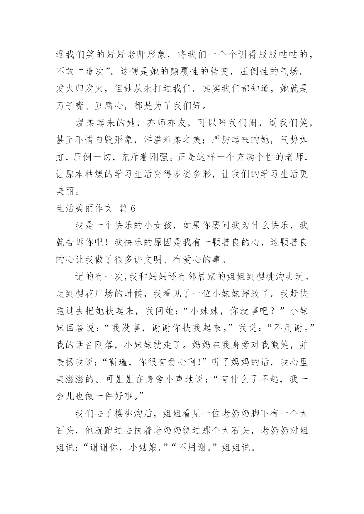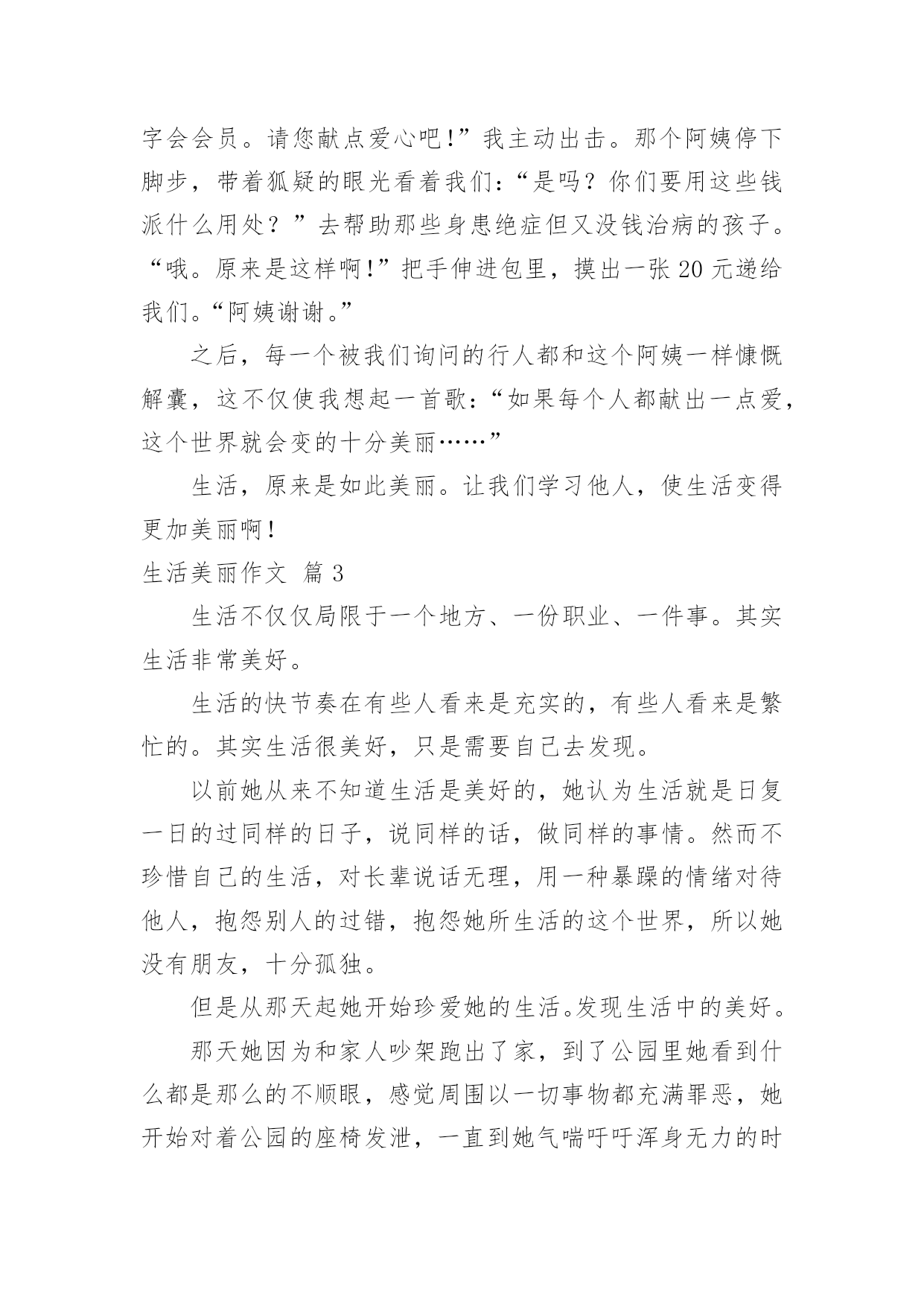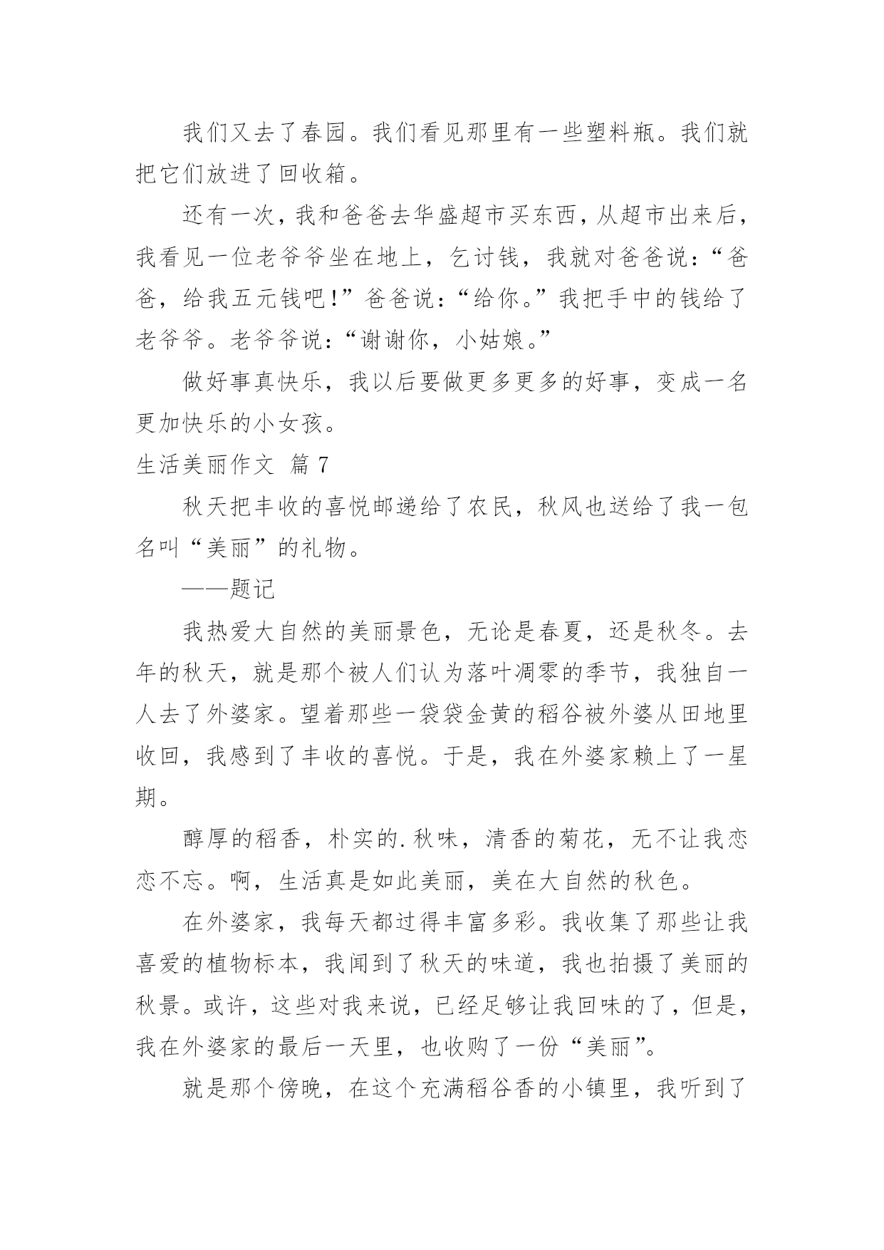 生活美丽作文生活美丽作文锦集8篇无论在学习、工作或是生活中,说到作文,大家肯定都不陌生吧,作文是由文字组成,经过人的思想考虑,通过语言组织来表达一个主题意义的文体。那么一般作文是怎么写的呢?以下是小编为大家收集的生活美丽作文8篇,供大家参考借鉴,希望可以帮助到有需要的朋友。生活美丽作文篇1如果生活是一本书,那么诚信就是其中最精彩的插图。如果生活是一片沙滩,那么诚信就是沙滩上最耀眼的钻石。如果生活是一片夜空,那么诚信就是夜空中最璀璨的星星。生活因诚信而精彩!三杯吐然诺,五岳倒为轻。诚信,沿历史的长流,浩浩汤汤,注入黄河长江。万丈豪情融入血液沸腾的你我,五千年的文化是生生不息的脉搏。荀子云:“君子养心莫过于诚。”诚信,犹如树高千丈,却仰赖于树根的滋养,我们向往的笔直脊梁,要靠诚信支撑的力量。拥有诚信,脚下可踏一方净土;坚守诚信,必有问心无愧的归宿。敬仰诚信,夯筑人生的铁壁铜墙,播种诚信,收获信任的海洋。有了诚信,才有了商鞅城门立木的一诺千金;有了诚信,才有了过五关前“赤兔胭脂兽”的一骑绝尘;有了诚信,才有了“君子一言、驷马难追”的承诺;有了诚信,才有了焚画酬知己的苏曼殊。相信诚信的力量,它可以点石成金,触木为玉。因为诚信,“文不能安邦,武不能服众”的宋江才能坐上聚义厅的头把交椅,将替天行道的大旗扯得迎风飘扬。因为诚信,平遥小城诞生出来的“日升昌”,才将分号开遍大江南北,将半个中国的财富汇集一堂。“诚者,天之道也;诚之者,人之道也”。诚信是人和人之间最美的语言。”与朋友交,言而有信“会让你拥有更多的朋友。”君子一言,驷马难追“会让你得到更多的信任”。因为生活因诚实而美丽,生活因诚信而精彩!生活美丽作文篇2生活,充满着美丽的事情。它们如同天上那条五颜六色的彩虹,让人看过就难以忘怀。是的,生活就是常常如此美丽。那是在前一段时间,我连着好几天因为生病而没去上学,拉下好几天的作业。我躺在床上心急如焚。于是马上打电话给小A同学。小A同学一听是我,便关切地询问我的病情,又耐心仔细地告诉我当天作业,并解答我不会的难题。这电话一打就是半小时,但从她的口气中听不出丝毫的不耐烦。这使我非常感动。不仅同学之间的友谊是如此美丽,社会上陌生人的心灵也是这样。上个星期六下午,我校为帮助那些身患绝症的孩子们治病,代表红十字会向行人们劝募。活动开始了,我和同学拿着捐款袋,描准了目标___一个阿姨。“阿姨好,我们是红十字会会员。请您献点爱心吧!”我主动出击。那个阿姨停下脚步,带着狐疑的眼光看着我们:“是吗?你们要用这些钱派什么用处?”去帮助那些身患绝症但又没钱治病的孩子。“哦。原来是这样啊!”把手伸进包里,摸出一张20元递给我们。“阿姨谢谢。”之后,每一个被我们询问的行人都和这个阿姨一样慷慨解囊,这不仅使我想起一首歌:“如果每个人都献出一点爱,这个世界就会变的十分美丽……”生活,原来是如此美丽。让我们学习他人,使生活变得更加美丽啊!生活美丽作文篇3生活不仅仅局限于一个地方、一份职业、一件事。其实生活非常美好。生活的快节奏在有些人看来是充实的,有些人看来是繁忙的。其实生活很美好,只是需要自己去发现。以前她从来不知道生活是美好的,她认为生活就是日复一日的过同样的日子,说同样的话,做同样的事情。然而不珍惜自己的生活,对长辈说话无理,用一种暴躁的情绪对待他人,抱怨别人的过错,抱怨她所生活的这个世界,所以她没有朋友,十分孤独。但是从那天起她开始珍爱她的生活。发现生活中的美好。那天她因为和家人吵架跑出了家,到了公园里她看到什么都是那么的不顺眼,感觉周围以一切事物都充满罪恶,她开始对着公园的座椅发泄,一直到她气喘吁吁浑身无力的时候她才罢休,她瘫坐在座椅上,迎面走过来一位看似比她小的女孩,小姑娘问道:“姐姐,你怎么了?为什么那么生气啊!”面对小女孩的问题,她感到羞愧“没什么。”她回答道。小女孩说:“姐姐,我们交个朋友好吗,我家就住在公园旁边。妈妈平常不让我出来玩,让我在家里做一些题,我每天看到外面奔跑的小朋友很是羡慕……但我知道妈妈是为我好,我想你是不是也这样啊!”“好吧。”听了小女孩的话,她感觉自己的父母不会做伤害自己的事,什么事都是为她在考虑。她回到家中,看到家人在等她,“对不起妈妈,我惹你生气了!”“没事,下次不要这样就行了!”一家人留下高兴的泪水。原来,生活如此美好。我的家乡真美丽作文荷叶也美丽作文秋天真美丽作文生活美丽作文篇4在我们的生活中,会因为生命而美丽呢?有人会说因为有钱,微笑,而我则认为,生活因文明而美丽。文明,人人都可以做到,它跟生活条件没有必然的关系。一个富翁可能乱丢垃圾,而一个穷苦的人可能举止文雅。要做一个文明的人不需要什么必要的条件,只要愿意文明,世界上所有人都能做一个文明人。文明是一种美德。人多拥挤的时候习惯性地自觉排队、在公共场合的安静,都可以让人