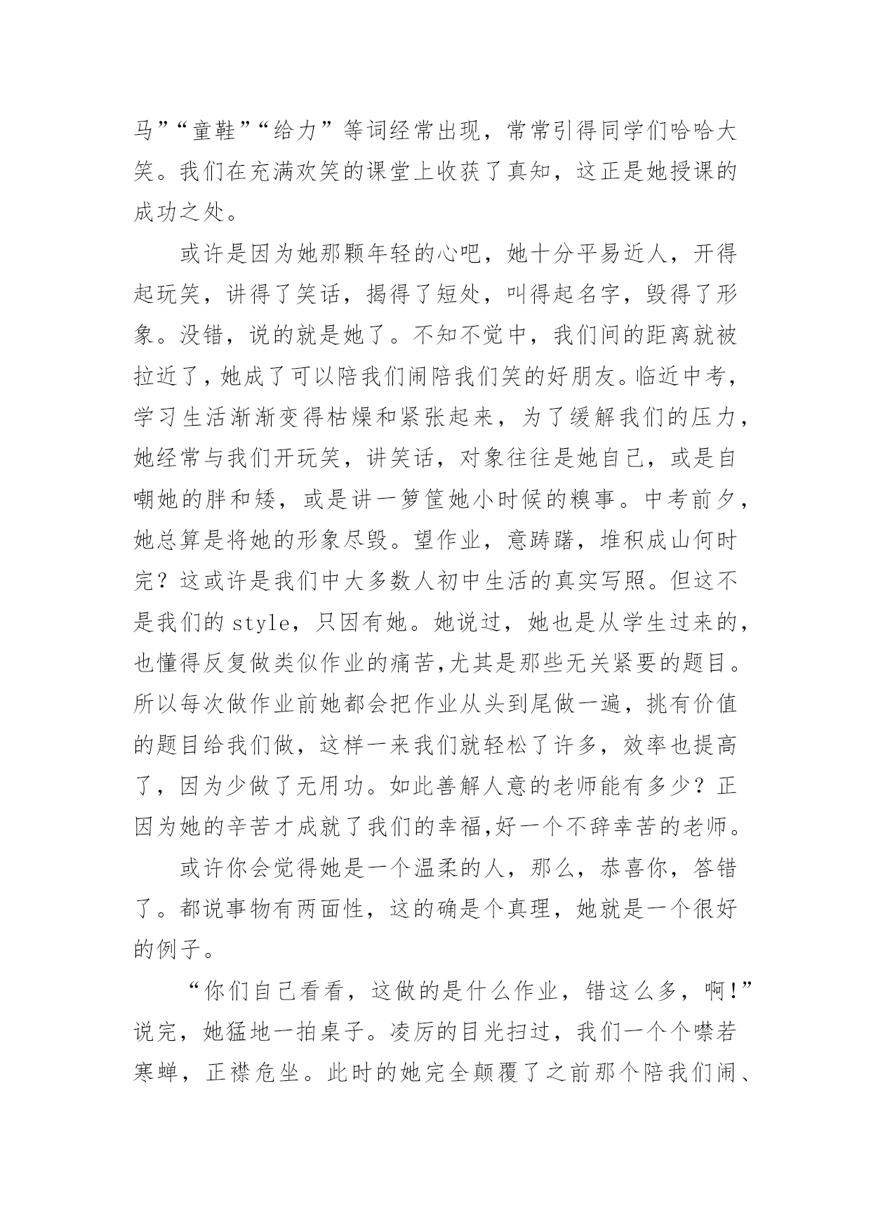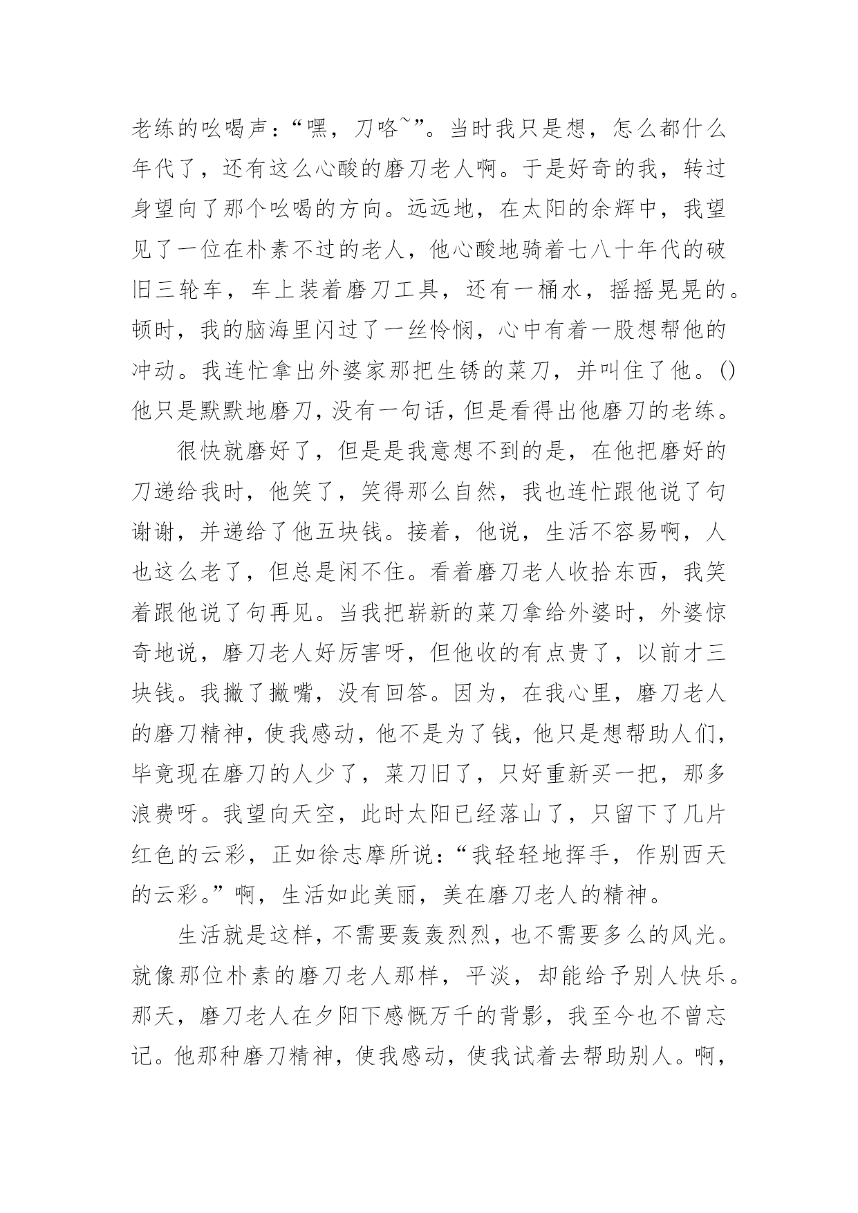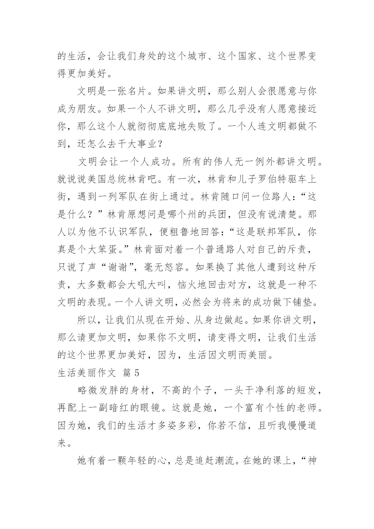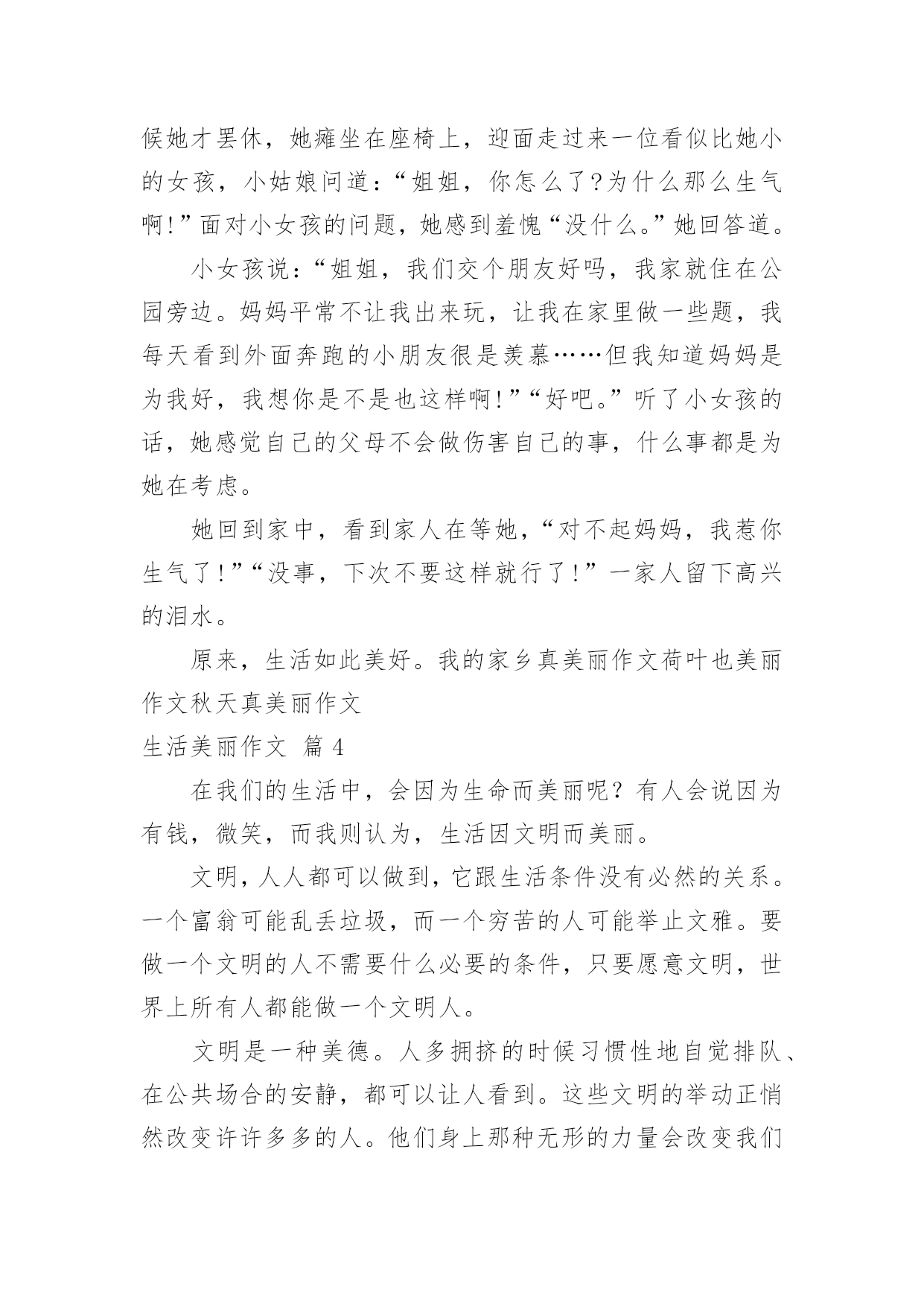 生活美丽作文生活美丽作文锦集8篇无论在学习、工作或是生活中,说到作文,大家肯定都不陌生吧,作文是由文字组成,经过人的思想考虑,通过语言组织来表达一个主题意义的文体。那么一般作文是怎么写的呢?以下是小编为大家收集的生活美丽作文8篇,供大家参考借鉴,希望可以帮助到有需要的朋友。生活美丽作文篇1如果生活是一本书,那么诚信就是其中最精彩的插图。如果生活是一片沙滩,那么诚信就是沙滩上最耀眼的钻石。如果生活是一片夜空,那么诚信就是夜空中最璀璨的星星。生活因诚信而精彩!三杯吐然诺,五岳倒为轻。诚信,沿历史的长流,浩浩汤汤,注入黄河长江。万丈豪情融入血液沸腾的你我,五千年的文化是生生不息的脉搏。荀子云:“君子养心莫过于诚。”诚信,犹如树高千丈,却仰赖于树根的滋养,我们向往的笔直脊梁,要靠诚信支撑的力量。拥有诚信,脚下可踏一方净土;坚守诚信,必有问心无愧的归宿。敬仰诚信,夯筑人生的铁壁铜墙,播种诚信,收获信任的海洋。有了诚信,才有了商鞅城门立木的一诺千金;有了诚信,才有了过五关前“赤兔胭脂兽”的一骑绝尘;有了诚信,才有了“君子一言、驷马难追”的承诺;有了诚信,才有了焚画酬知己的苏曼殊。相信诚信的力量,它可以点石成金,触木为玉。因为诚信,“文不能安邦,武不能服众”的宋江才能坐上聚义厅的头把交椅,将替天行道的大旗扯得迎风飘扬。因为诚信,平遥小城诞生出来的“日升昌”,才将分号开遍大江南北,将半个中国的财富汇集一堂。“诚者,天之道也;诚之者,人之道也”。诚信是人和人之间最美的语言。”与朋友交,言而有信“会让你拥有更多的朋友。”君子一言,驷马难追“会让你得到更多的信任”。因为生活因诚实而美丽,生活因诚信而精彩!生活美丽作文篇2生活,充满着美丽的事情。它们如同天上那条五颜六色的彩虹,让人看过就难以忘怀。是的,生活就是常常如此美丽。那是在前一段时间,我连着好几天因为生病而没去上学,拉下好几天的作业。我躺在床上心急如焚。于是马上打电话给小A同学。小A同学一听是我,便关切地询问我的病情,又耐心仔细地告诉我当天作业,并解答我不会的难题。这电话一打就是半小时,但从她的口气中听不出丝毫的不耐烦。这使我非常感动。不仅同学之间的友谊是如此美丽,社会上陌生人的心灵也是这样。上个星期六下午,我校为帮助那些身患绝症的孩子们治病,代表红十字会向行人们劝募。活动开始了,我和同学拿着捐款袋,描准了目标___一个阿姨。“阿姨好,我们是红十字会会员。请您献点爱心吧!”我主动出击。那个阿姨停下脚步,带着狐疑的眼光看着我们:“是吗?你们要用这些钱派什么用处?”去帮助那些身患绝症但又没钱治病的孩子。“哦。原来是这样啊!”把手伸进包里,摸出一张20元递给我们。“阿姨谢谢。”之后,每一个被我们询问的行人都和这个阿姨一样慷慨解囊,这不仅使我想起一首歌:“如果每个人都献出一点爱,这个世界就会变的十分美丽……”生活,原来是如此美丽。让我们学习他人,使生活变得更加美丽啊!生活美丽作文篇3生活不仅仅局限于一个地方、一份职业、一件事。其实生活非常美好。生活的快节奏在有些人看来是充实的,有些人看来是繁忙的。其实生活很美好,只是需要自己去发现。以前她从来不知道生活是美好的,她认为生活就是日复一日的过同样的日子,说同样的话,做同样的事情。然而不珍惜自己的生活,对长辈说话无理,用一种暴躁的情绪对待他人,抱怨别人的过错,抱怨她所生活的这个世界,所以她没有朋友,十分孤独。但是从那天起她开始珍爱她的生活。发现生活中的美好。那天她因为和家人吵架跑出了家,到了公园里她看到什么都是那么的不顺眼,感觉周围以一切事物都充满罪恶,她开始对着公园的座椅发泄,一直到她气喘吁吁浑身无力的时候她才罢休,她瘫坐在座椅上,迎面走过来一位看似比她小的女孩,小姑娘问道:“姐姐,你怎么了?为什么那么生气啊!”面对小女孩的问题,她感到羞愧“没什么。”她回答道。小女孩说:“姐姐,我们交个朋友好吗,我家就住在公园旁边。妈妈平常不让我出来玩,让我在家里做一些题,我每天看到外面奔跑的小朋友很是羡慕……但我知道妈妈是为我好,我想你是不是也这样啊!”“好吧。”听了小女孩的话,她感觉自己的父母不会做伤害自己的事,什么事都是为她在考虑。她回到家中,看到家人在等她,“对不起妈妈,我惹你生气了!”“没事,下次不要这样就行了!”一家人留下高兴的泪水。原来,生活如此美好。我的家乡真美丽作文荷叶也美丽作文秋天真美丽作文生活美丽作文篇4在我们的生活中,会因为生命而美丽呢?有人会说因为有钱,微笑,而我则认为,生活因文明而美丽。文明,人人都可以做到,它跟生活条件没有必然的关系。一个富翁可能乱丢垃圾,而一个穷苦的人可能举止文雅。要做一个文明的人不需要什么必要的条件,只要愿意文明,世界上所有人都能做一个文明人。文明是一种美德。人多拥挤的时候习惯性地自觉排队、在公共场合的安静,都可以让人