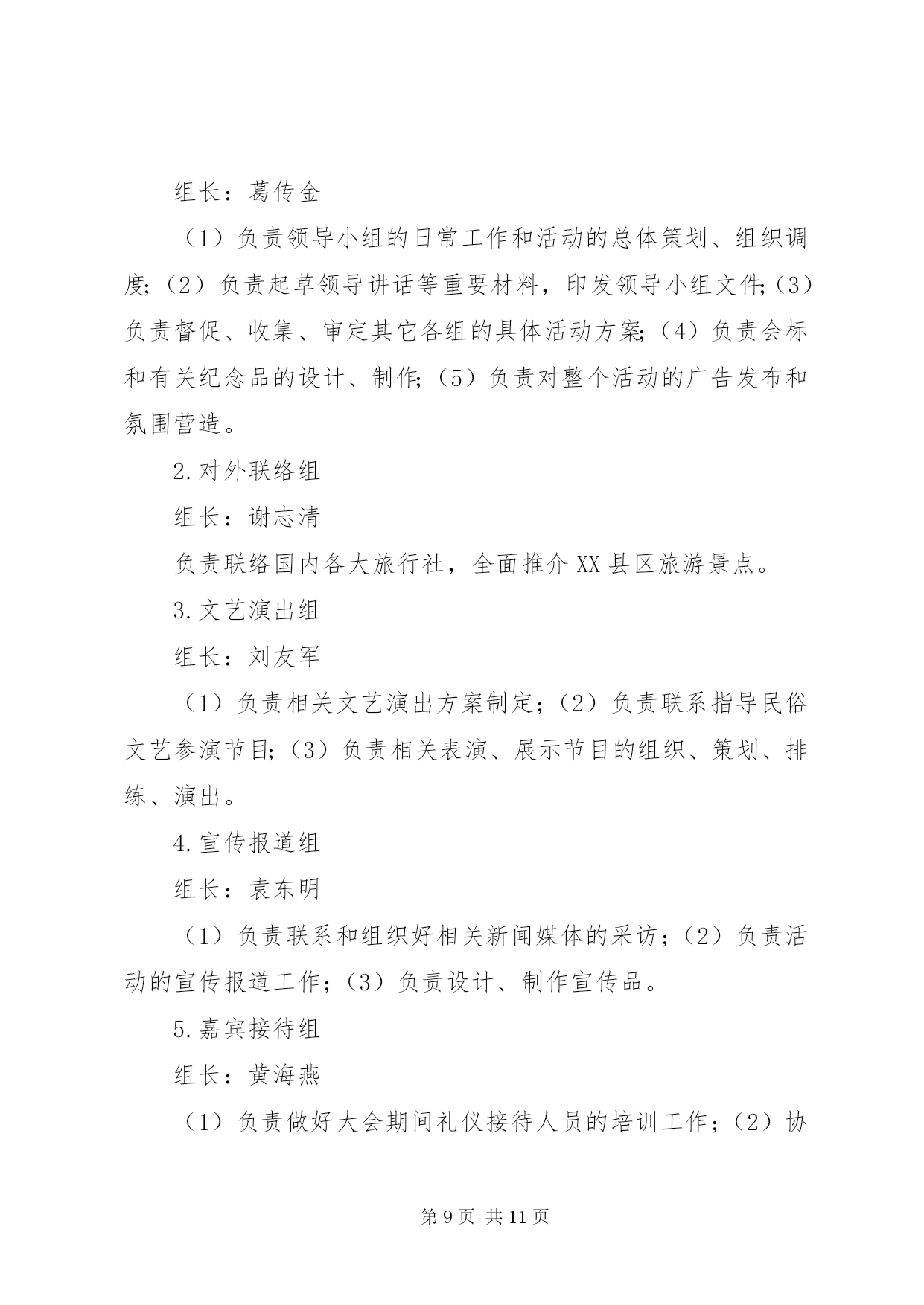 第PAGE\*Arabic\*MERGEFORMAT11页共NUMPAGES\*MERGEFORMAT11页旅游节活动方案为大力弘扬客家文化,充分展示XX县区良好形象,做强做大我县旅游产业,进一步推介XX县区、宣传XX县区,扩大XX县区知名度,加强我县与海内外的交流与合作,将举办xx中国(赣州)客家生态文化旅游节活动。为确保活动顺利开展,特制定活动方案如下:一、活动主题打响“世界客家摇篮休闲养生福地”旅游品牌,吸引更多的人了解、关注和发展XX县区。二、活动时间xx年3月—12月。集中活动时间为xx年3月20日至3月22日(共三天)。三、活动安排1.xx中国(赣州)客家生态文化旅游节暨XX县区樱花节新闻发布会活动时间:3月上旬活动地点:客家文化城活动内容。邀请国内各大媒体对此活动进行宣传造势,同时邀请珠三角地区和XX市各大旅行社参加新闻发布会。牵头单位:县委宣传部、县旅游局2.xx中国(赣州)客家生态文化旅游节启动仪式暨XX县区樱花节(1)开幕式活动时间:3月20日上午活动地点:客家文化城活动内容:举办盛大的启动仪式牵头单位:县委宣传部责任单位:县委办、县政府办、县委宣传部、县文广局、县城乡规划建设局(2)开(竣)工典礼①文昌阁竣工典礼活动时间:3月20日上午(启动仪式结束后)活动地点:文昌阁建设现场活动内容:举行文昌阁竣工并对游人开放典礼牵头单位:县城南片区建设指挥部②将军堂、进士堂开馆仪式活动时间:3月20日上午(启动仪式结束后)活动地点:XX县区客家名人公园活动内容:将军堂、进士堂、蒋经国在赣南展开展牵头单位:县城南片区建设指挥部、县文广局、县委党史办③狮子岩、燕子岩风景区奠基仪式活动时间:3月20日上午(启动仪式结束后)活动地点:狮子岩、燕子岩风景区牵头单位:县旅游局、储潭乡政府④宝莲山风景区奠基仪式活动时间:3月20日上午(启动仪式结束后)活动地点:宝莲山风景区牵头单位:县旅游局、宝莲山风景区管委会⑤客家文化风情街竣工及客家特色文化展揭牌仪式活动时间:3月20日上午(启动仪式结束后)活动地点:客家文化城牵头单位:县客家文化城管理局、县文广局、县文联、县工商局(3)赏樱踏青花车游园活动活动时间:3月20日上午(启动仪式结束后)活动地点:樱花锦绣公园活动内容。组织千人徒步游,花车环城行,体验樱花盛开的浪漫,感受城市建设的巨变。牵头单位。县文广局、县体育局、城南片区建设指挥部、各乡镇。(4)百位名家书“赣”、“客”活动活动时间:3月20日下午活动地点:客家文化城活动内容。邀请百位知名书法家同时书写“赣”、“客”字、对联、牌匾等作品。牵头单位:县文联(5)樱花诗会活动时间:3月21日下午活动地点:客家文化城活动内容。邀请省、市诗词协会参加樱花节,对我县樱花美景进行诗词创作。牵头单位:县文联(6)“爱在樱花浪漫时”百对新人集体婚礼活动时间:3月22日上午活动地点:客家名人公园活动内容。在客家名人公园举办百对新人集体婚礼。牵头单位:团县委、县妇联、县民政局(7)樱花摄影节活动时间。樱花节期间。活动地点:全县主要旅游景点活动内容。邀请省、市知名摄影书画名家到我县客家文化城、名人公园及白鹭、湖江、田村等旅游景点进行采风活动,用书法、绘画和镜头彰显XX县区魅力所在,同时在客家文化城内展出我县近年来各项成果展。牵头单位:县文联(8)客家采茶戏表演活动时间:樱花节期间活动地点:客家文化城博物馆、十里樱花带活动内容。优秀采茶剧目等文艺表演。牵头单位:县文广局(9)客家美食、奇石、根雕展活动时间:樱花节期间活动地点:客家文化风情街活动内容。开展客家特色美食、奇石、根雕、古玩展。牵头单位:县工商局、旅游局(10)招商引资洽谈会活动时间:樱花节期间活动地点:县梅苑宾馆活动内容:客商座谈、签约项目牵头单位:县商务局、县接待办3.储潭油菜花节活动时间:3月活动地点:客家文化城→储君庙→储潭油菜花基地活动内容。联合周边县市户外俱乐部,通过千人徒步健身活动宣传储君胜地及储潭油菜花美景。牵头单位:县体育局、储潭乡政府4.湖江桃花节活动时间:4月活动地点:客家文化城→储潭→湖江活动内容。联合周边县市自行车俱乐部,举办骑自行车游览活动,以此宣传我县的旅游风光。牵头单位:县体育局、湖江乡政府5.登麂山活动活动时间:5月活动地点:南塘麂山活动内容。通过登山活动推介我县南塘麂山的美丽风光及农家乐休闲活动。牵头单位:县体育局、南塘镇政府6.吉埠杨梅节活动活动时间:6月活动地点:吉埠镇活动内容。组织广大游客到吉埠千亩杨梅基地进行现场采摘活动,感受农家游乐趣。牵头单位:县旅游局、县果业局、吉埠镇政府7.大型山水实景打击乐《客家摇篮·千鼓盛宴》文体表演活动及夏浒古村开放仪式活动时间:7至10月活动地点:湖江夏浒活动内容。以打击乐为主的展示客家风俗民情