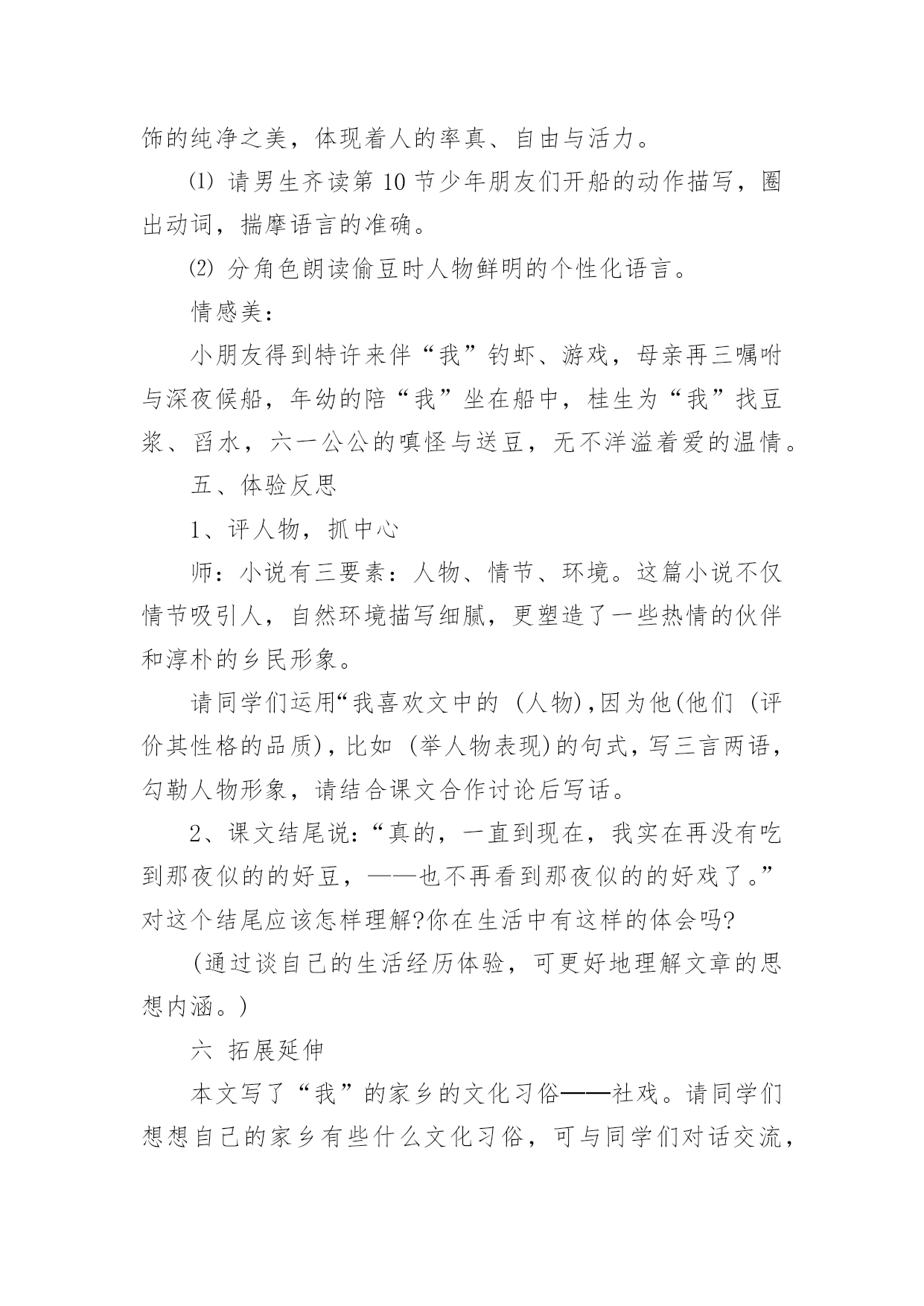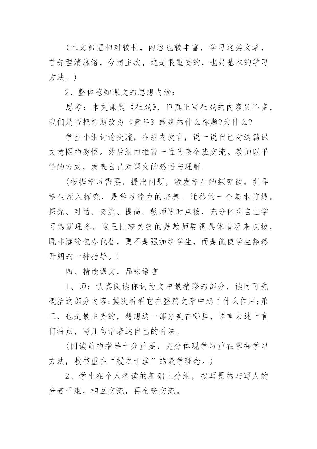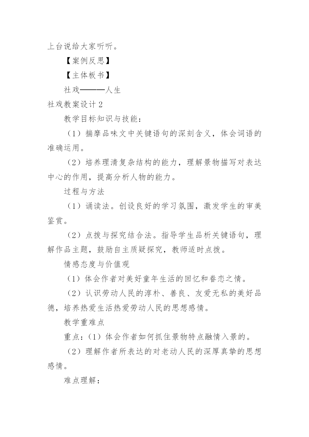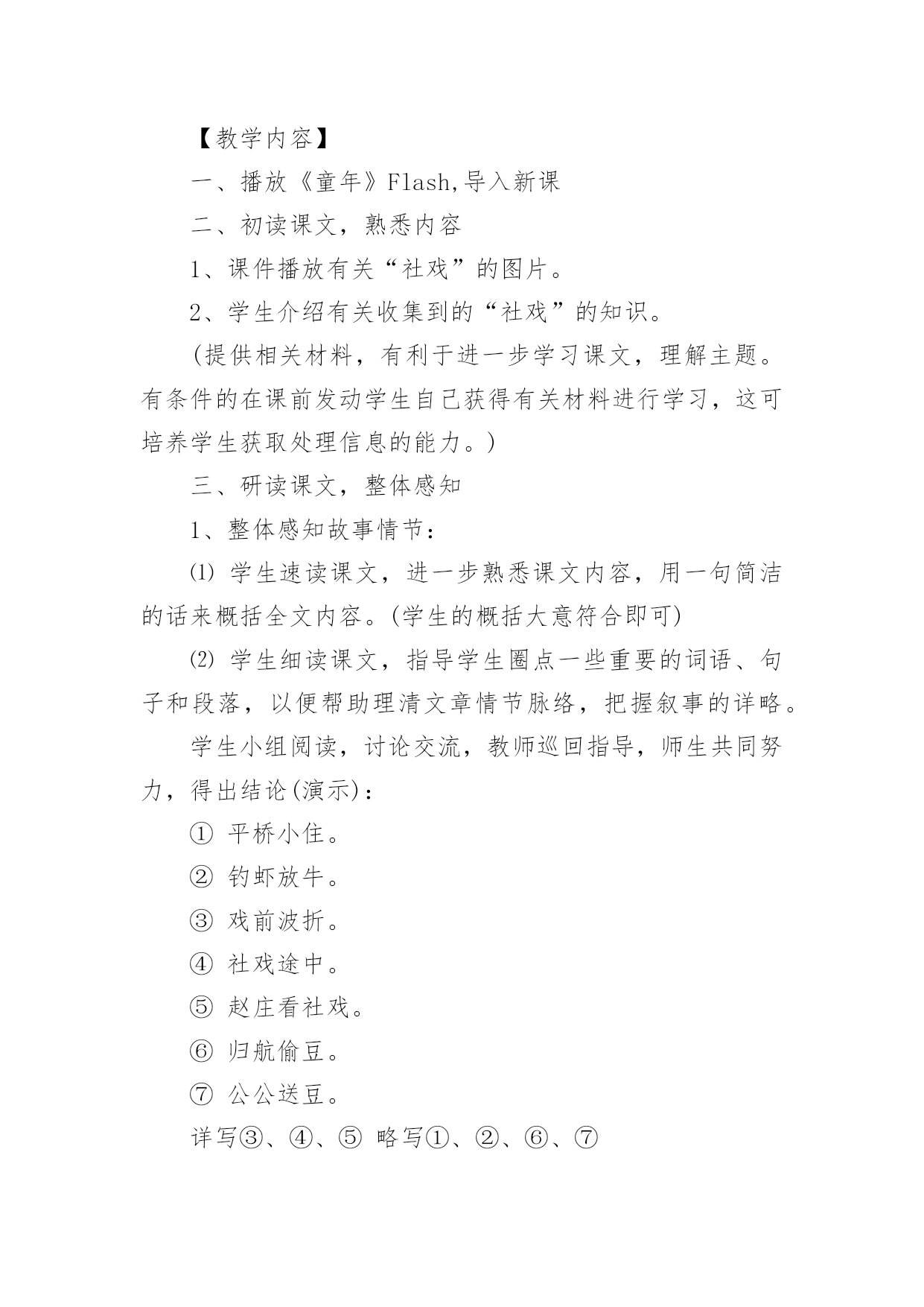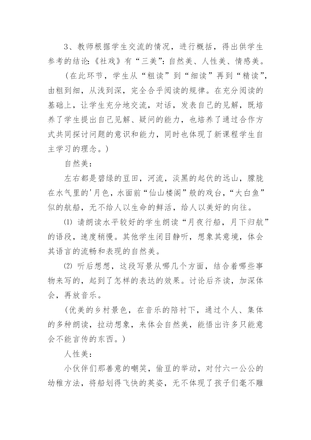 社戏教案设计社戏教案设计作为一位兢兢业业的人民教师,时常需要编写教案,编写教案助于积累教学经验,不断提高教学质量。那么问题来了,教案应该怎么写?下面是小编收集整理的社戏教案设计,欢迎大家分享。社戏教案设计1【导语】“鱼”、“渔”兼得。【案例】谈“读”在自主性学习中的演绎。〖案例背景〗长时期以来,学生已经习惯于“老师教学生听”的课堂模式。课堂上,老师激情四溢,滔滔不绝。甚至把一篇完好无损的课文犹如“庖丁解牛”肢解得支离破碎。学生要么就佩服其师口才之绝,要么就“昏昏”甚至“欲睡”。老师的“主导”完全霸占了学生的“主体”,一堂课下来,老师“累”的死,学生“昏”得慌。静下心来,扪心自问,有和收获?空空如也!而我校现在七年级学生的学习状态也是如此,尤其是太阳山附近的学生的学习主动性不够。课前不预习,课中不积极思考,课后不加大阅读量,扩充自己阅读视野等等这些现象比较严重。仍习惯于“一切”听老师的,甘当茶杯不愿当茶壶,愿“接”不愿“倒”。一堂课下来,基本的生字词不认识,不会写;课文分析不是人云亦云,就是三缄其口;课后练习不是抄写现成答案就是文不对题。一期这样下来其结局呢?稍微生僻的生字词不会读、不会写,课文默写不完整,课外名著阅读可以说一片贫瘠。更大的问题是,学生的写作水平迟迟得不到比较显著的提高。错别字、病句现象严重。“立意不深、文辞不美、构思不新”等现象明显。这些问题的存在,细思量。其实就是学生学习主动性不够,学习的自主能动性发挥不够,不懂装懂。这种被动的学习方式所培养出来的学生最终就宛如一只被驯养的小鸟,一旦打开鸟笼,却不知飞向何处,到何处觅食。当代我国著名思想史教授许纪霖在《中国语文教育的误区》一文中指出,这样的教育、学习方式,“看起来只是个教育问题,实际上影响着我们全民族的思维、思考和表达方式”。为了纠正这种不正确的教育、学习方式,提高学生学习语文的效率,本人针对语文学科的特征,倡导学生以“读”促学,自主学习,在“读”的方式中充分调动学生学习语文的积极性。〖案例依据〗朱熹曾说过,“古人云:读书千遍,其义自见。谓读得熟,则不待解说,自晓其义也。余偿谓,读书有三到,谓心到、眼到、口到。心不在此,则眼不看仔细,心眼既不专一,却只漫浪诵读,决不能记,记亦不能久也。三到之中,心到既矣,眼口岂不到乎?”这段话,对“读”的重要性、方法、意义再清楚不过了。书“读”好拉,感悟有拉,理解也就有拉。而理解不是一次完成,允许多次读,多重读。《学会学习:教育世界的今天和明天》一文中指出,“未来学校必须把教育的对象变成自己教育的主体,受教育的人必须成为教育他自己的主人;别人的教育必须成为这个人自己的教育”,学习者应该说成为“他们获得知识的最高主人而你是知识的接受者”。现代意义的阅读教学应以学生为先,把学生推到阅读的前沿阵地,通过提高学生自主阅读的意识和能力提高阅读教学的质量。所谓自主,通俗一点说就是一个人的自我认识、自我超越、自我发展。学生通过自主阅读,获取自身的、真实的情感体验,不人云亦云,不做知识的“传声筒”。朱熹曾说过,“古人云:读书千遍,其义自见。谓读得熟,则不待解说,自晓其义也。余偿谓,读书有三到,谓心到、眼到、口到。心不在此,则眼不看仔细,心眼既不专一,却只漫浪诵读,决不能记,记亦不能久也。三到之中,心到既矣,眼口岂不到乎?”这段话,对“读”的重要性、方法、意义再清楚不过了。书“读”好拉,感悟有拉,理解也就有拉。而理解不是一次完成,允许多次读,多重读。新课程标准指出:教学活动是一种双向认知活动,有效教学行为应指向于多元化的教学目标和学生全面发展的教学期望,它是教学的社会价值和个体价值的双重体现。语文新课程标准中明确提出:“语文教学就是教师对学生进行语文素养培养的一种认知过程,语文教学的目标是要培养学生的语文素养,指导学生正确地理解和应用祖国语言,丰富语言的积累,培养语感,发展思维,使他们具有适应实际需要的识字写字能力、阅读能力、写作能力、口语交际能力。同时还要重视提高学生的品德修养和审美情趣,使他们逐步形成良好的个性和健全的人格,促进德、智、体、美的和谐发展”。基于此,教学方式应变传统的以“教师为主体”为以“学生为主体”,变以“教”为中心为以“学”为中心;学习方式也应以“要我学”向“我要学”转变;育人理念也应以“应试”转向“应世”。教会学生学会学习,学会做人。倡导“自主、合作、探究”的新型学习方式。〖案例目标〗在本案例中,以“读”凸显学生自主性学习,通过以“初读”、“研读”、“精读”、再“拓展读”的方式,让学生“读中有品、品中有悟、悟中有得”。更重要的是学生通过老师所指导的阅读方法,能诗意的解读课文,诗意的流淌在课文的字里行间,从中感受到亲炙文字而又能走出那份快意和惬意。长期有意识的训练,达到真正意义上的“学以致用”,“鱼”、“渔”兼得。〖案