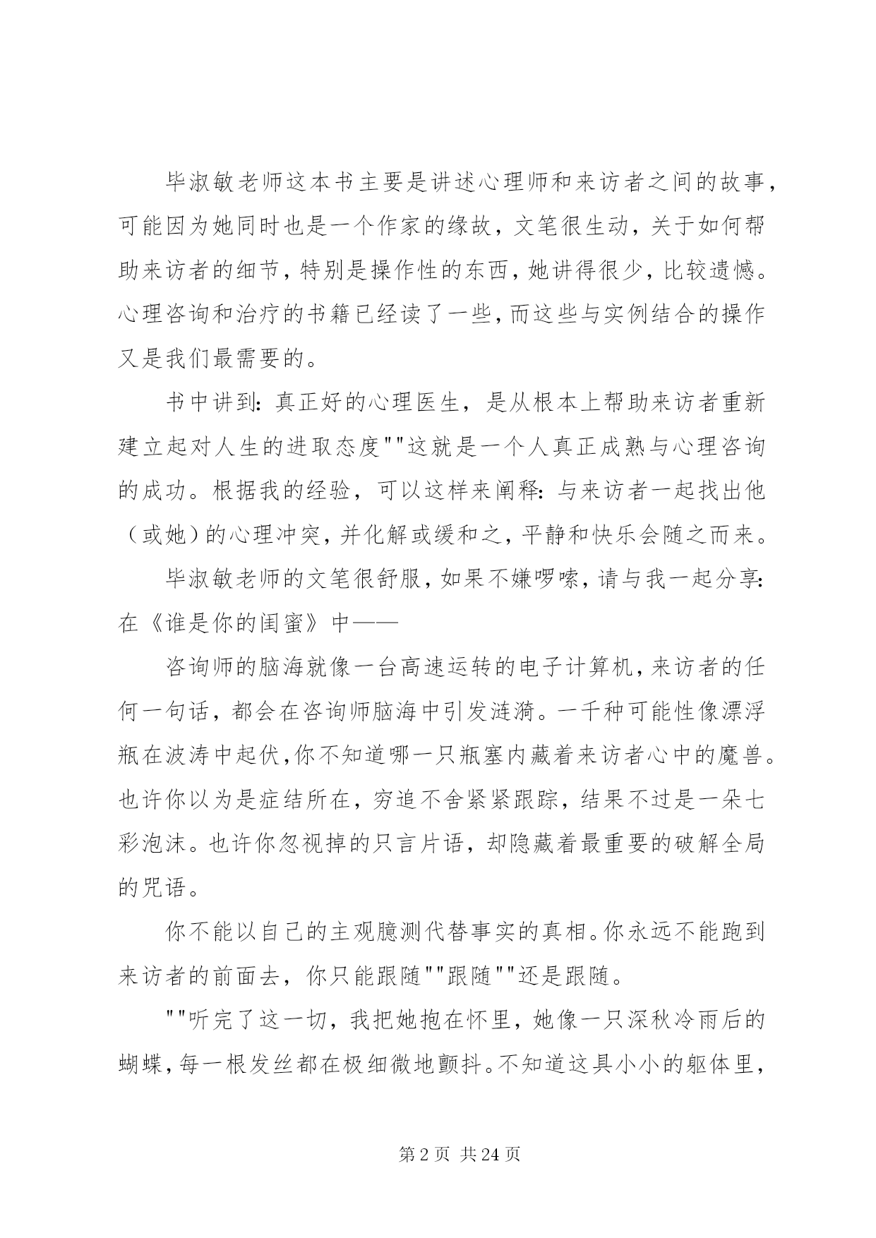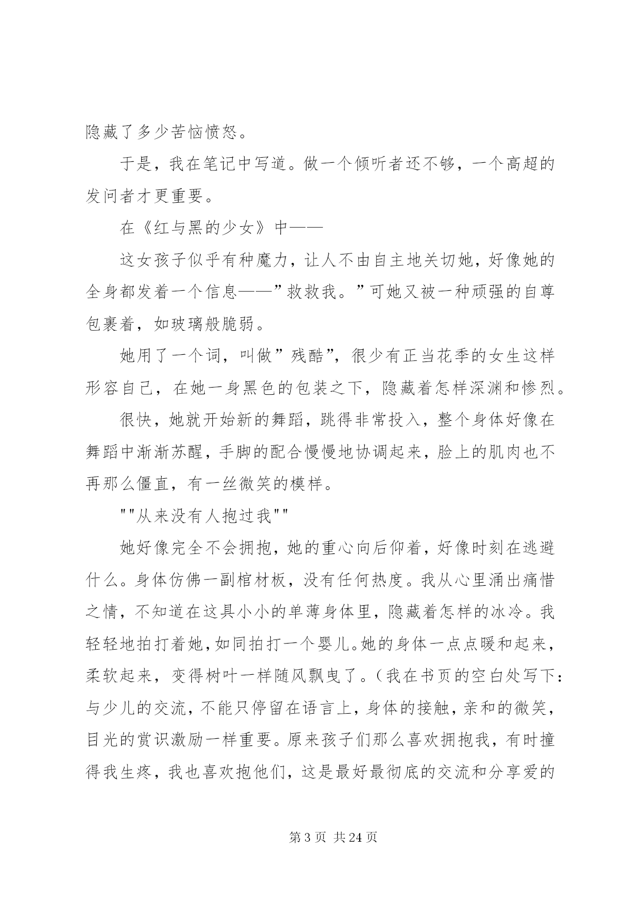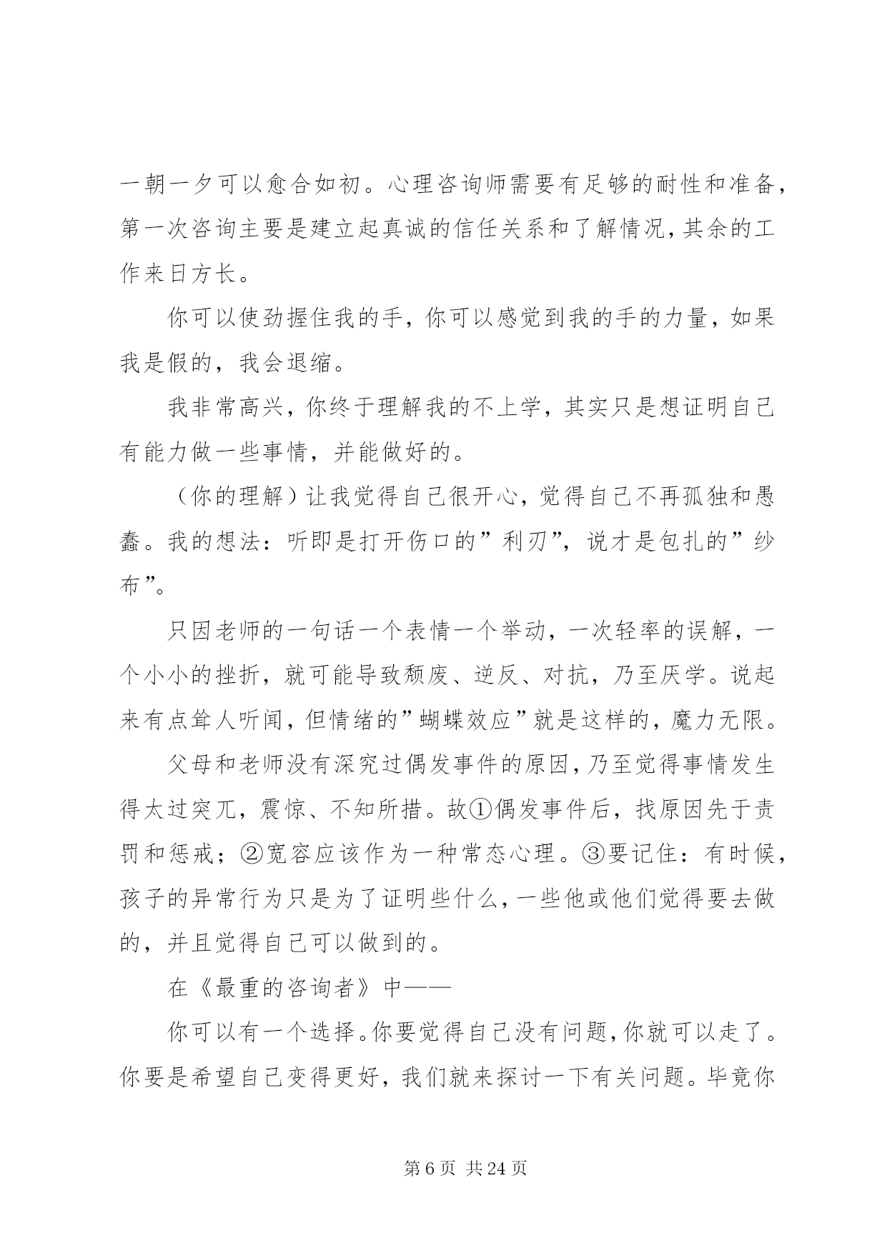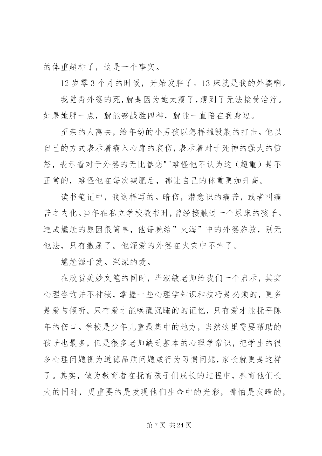 第PAGE\*Arabic\*MERGEFORMAT24页共NUMPAGES\*MERGEFORMAT24页读《毕淑敏心理咨询手记》有感——读《毕淑敏心理咨询手记》有感在国家的战略思想里面提出了建设文化强国的经略,青年人作为时代的弄潮儿,就应该行动起来,但是我们反观世上忙碌的人们,如今读书成了一件奢侈的事情,与教育行业以外的朋友交流到“读书”这个话题,他们都会说“读书,那是好久以前的事情了。”我读了《毕淑敏心理咨询手记》,其中一句话给了我们很好的答案——人是追求目标的动物,必须要有精神的指引,追索自己存在的价值。人的最终目标是争取幸福,而幸福不是金钱的成就,是灵魂的成就。读到这儿,我在读书笔记上写道:只为精神目标活着,未尝不是一种痛苦的磨砺,但是目标都没有,就成了行尸走肉,更痛苦。毕淑敏老师在题记中说到。我想,也许要换一种方式,把我的种种感悟,特别是许多来访者所给予我的宝贵的精神馈赠,用文字来表达,去传递一种友爱和成长的信念。如果有人看到这本书的时候,书中的某句话轻轻地碰撞了一下他的心,引发了一点点思考,就是我莫大的喜悦了。这段话引发了我的一些思考,我从事教育十几年了,教一届学生最长也就三年,如果在我教育他们成长的过程中能够给他们一些知识,解决他们一些困惑,启发他们一些思考,多年后还能令他们回味,那“就是我莫大的喜悦了”。毕淑敏老师这本书主要是讲述心理师和来访者之间的故事,可能因为她同时也是一个作家的缘故,文笔很生动,关于如何帮助来访者的细节,特别是操作性的东西,她讲得很少,比较遗憾。心理咨询和治疗的书籍已经读了一些,而这些与实例结合的操作又是我们最需要的。书中讲到:真正好的心理医生,是从根本上帮助来访者重新建立起对人生的进取态度""这就是一个人真正成熟与心理咨询的成功。根据我的经验,可以这样来阐释:与来访者一起找出他(或她)的心理冲突,并化解或缓和之,平静和快乐会随之而来。毕淑敏老师的文笔很舒服,如果不嫌啰嗦,请与我一起分享:在《谁是你的闺蜜》中——咨询师的脑海就像一台高速运转的电子计算机,来访者的任何一句话,都会在咨询师脑海中引发涟漪。一千种可能性像漂浮瓶在波涛中起伏,你不知道哪一只瓶塞内藏着来访者心中的魔兽。也许你以为是症结所在,穷追不舍紧紧跟踪,结果不过是一朵七彩泡沫。也许你忽视掉的只言片语,却隐藏着最重要的破解全局的咒语。你不能以自己的主观臆测代替事实的真相。你永远不能跑到来访者的前面去,你只能跟随""跟随""还是跟随。""听完了这一切,我把她抱在怀里,她像一只深秋冷雨后的蝴蝶,每一根发丝都在极细微地颤抖。不知道这具小小的躯体里,隐藏了多少苦恼愤怒。于是,我在笔记中写道。做一个倾听者还不够,一个高超的发问者才更重要。在《红与黑的少女》中——这女孩子似乎有种魔力,让人不由自主地关切她,好像她的全身都发着一个信息——”救救我。”可她又被一种顽强的自尊包裹着,如玻璃般脆弱。她用了一个词,叫做”残酷”,很少有正当花季的女生这样形容自己,在她一身黑色的包装之下,隐藏着怎样深渊和惨烈。很快,她就开始新的舞蹈,跳得非常投入,整个身体好像在舞蹈中渐渐苏醒,手脚的配合慢慢地协调起来,脸上的肌肉也不再那么僵直,有一丝微笑的模样。""从来没有人抱过我""她好像完全不会拥抱,她的重心向后仰着,好像时刻在逃避什么。身体仿佛一副棺材板,没有任何热度。我从心里涌出痛惜之情,不知道在这具小小的单薄身体里,隐藏着怎样的冰冷。我轻轻地拍打着她,如同拍打一个婴儿。她的身体一点点暖和起来,柔软起来,变得树叶一样随风飘曳了。(我在书页的空白处写下:与少儿的交流,不能只停留在语言上,身体的接触,亲和的微笑,目光的赏识激励一样重要。原来孩子们那么喜欢拥抱我,有时撞得我生疼,我也喜欢抱他们,这是最好最彻底的交流和分享爱的感受,不需要语言。)她未完成的愿望就是那一场精心准备的舞蹈,谁来欣赏。她无法挣扎出来,找不到自己存在的价值和重新生活的方向。我很佩服”体会”这个词,身体里储藏很多记忆,身体释放了,心灵也就慢慢地松弛了。在《出卖冥位的女生》中——冥位就是埋葬人的地方,可以是一块地,也可以是一棵树,一个花坛,也可能是灵塔上的一个格子。""我只是用我的方式来纪念我的父亲。那就是思索和死亡有关的一切。比如,我认为死后是有灵魂的。我认为人是应该留下一点痕迹的。不然的话,我们的哀伤就找不到地方寄托。出售灵位是为了让同样遭遇的人,可以找到寄托自己哀思的地方。其实,你最希望的是知道你父亲居住的地方。这种没有经过处理的哀伤,一直潜伏在她的内心深处,所以才有了这种怪异的行为。我的感悟。一切行为都有潜意识的诱因,只是有些角落没有照到温暖的阳光。在《再选你的父母》中——从某种程度上说,我们是凭借着他们的喜爱和给予,才得以延续自己幼小的生命。那样平凡贫困的父母,在