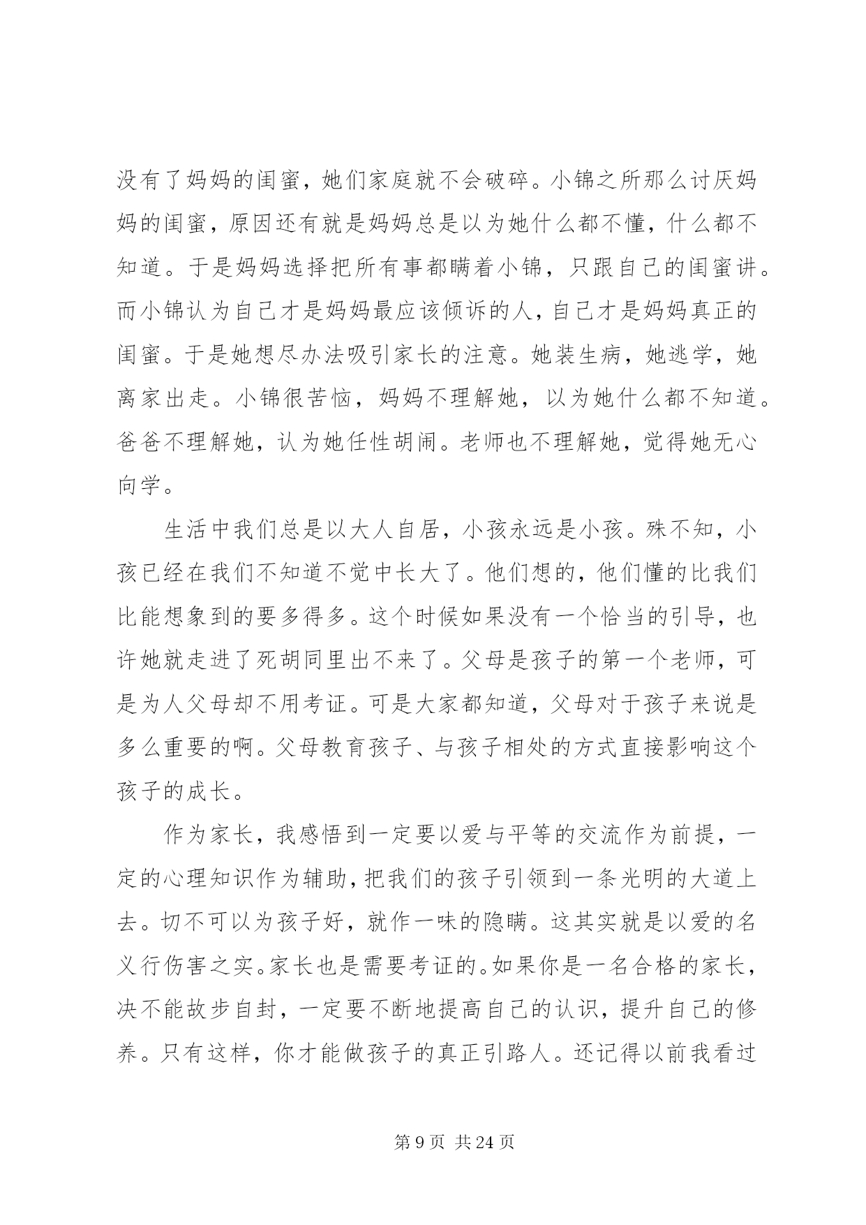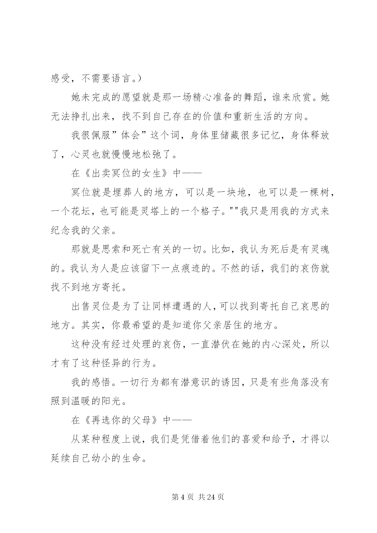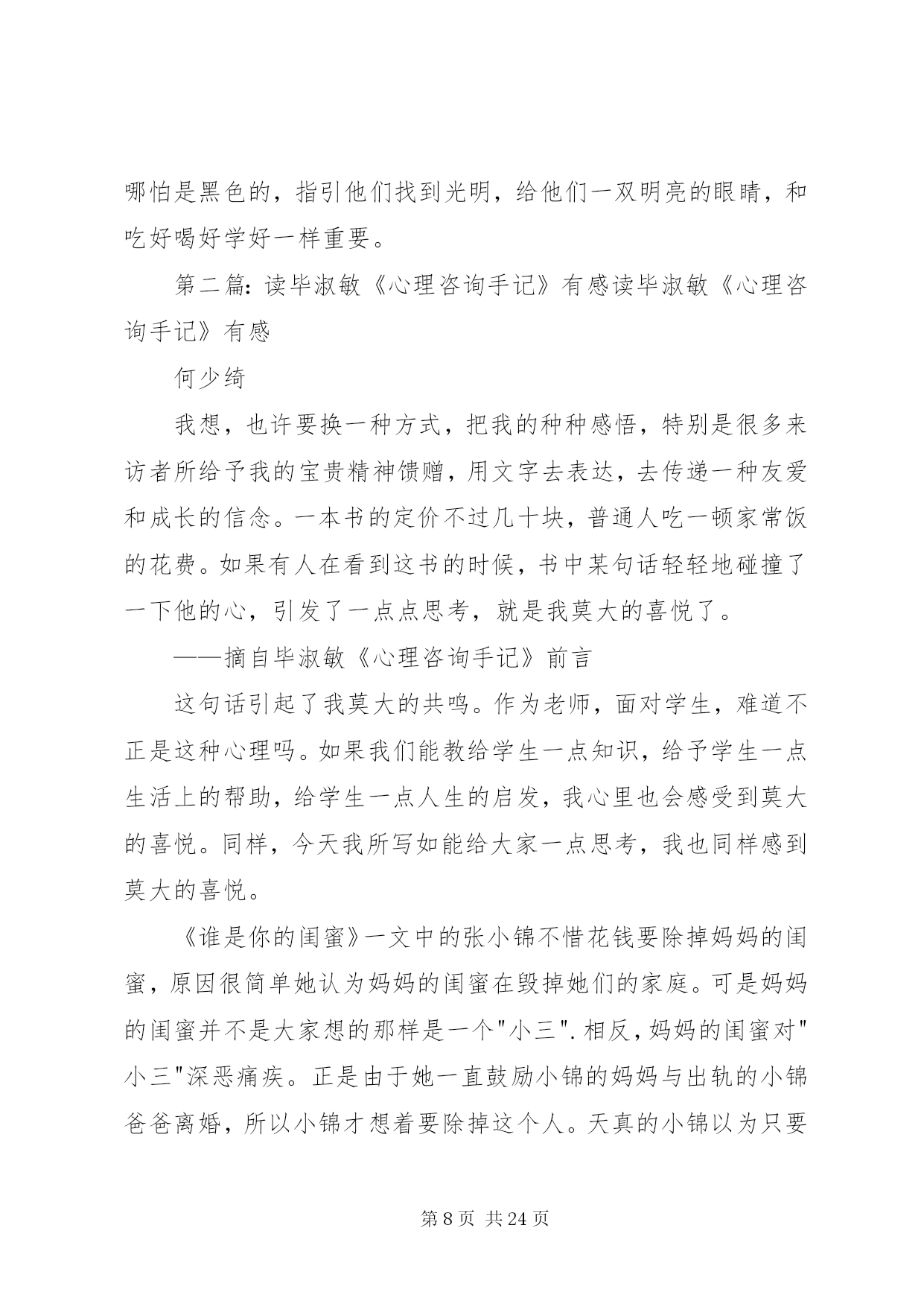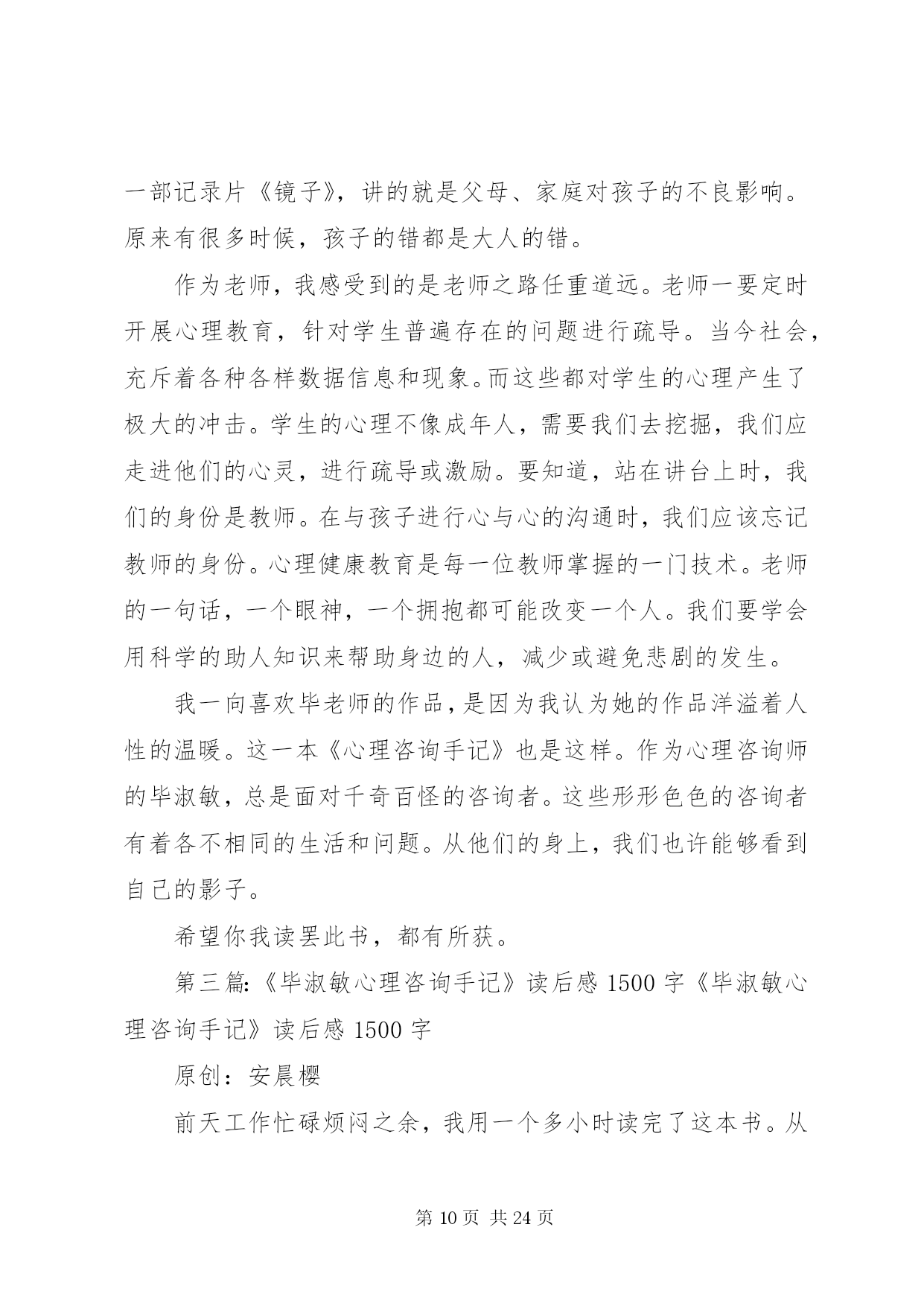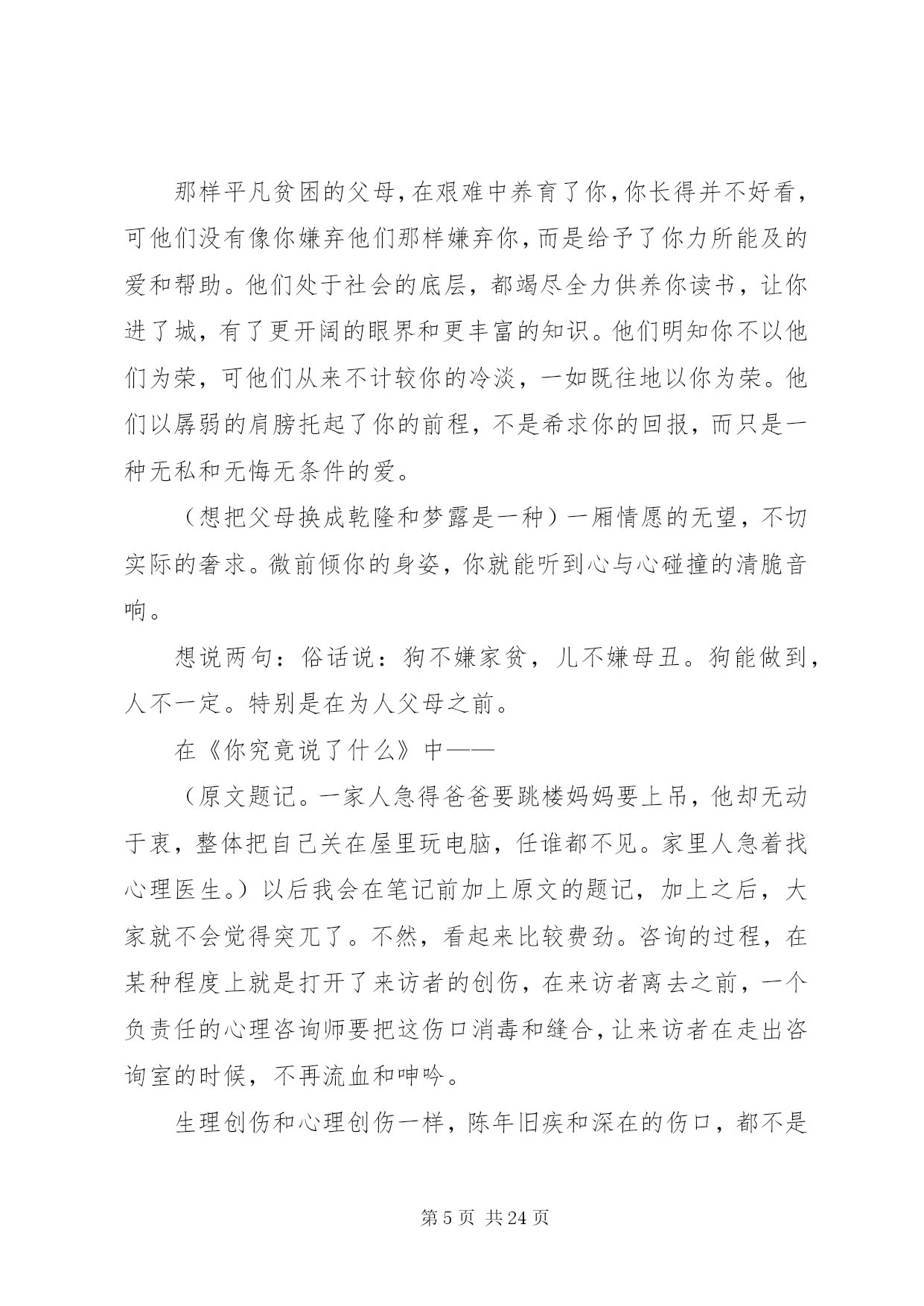 第PAGE\*Arabic\*MERGEFORMAT24页共NUMPAGES\*MERGEFORMAT24页读《毕淑敏心理咨询手记》有感——读《毕淑敏心理咨询手记》有感在国家的战略思想里面提出了建设文化强国的经略,青年人作为时代的弄潮儿,就应该行动起来,但是我们反观世上忙碌的人们,如今读书成了一件奢侈的事情,与教育行业以外的朋友交流到“读书”这个话题,他们都会说“读书,那是好久以前的事情了。”我读了《毕淑敏心理咨询手记》,其中一句话给了我们很好的答案——人是追求目标的动物,必须要有精神的指引,追索自己存在的价值。人的最终目标是争取幸福,而幸福不是金钱的成就,是灵魂的成就。读到这儿,我在读书笔记上写道:只为精神目标活着,未尝不是一种痛苦的磨砺,但是目标都没有,就成了行尸走肉,更痛苦。毕淑敏老师在题记中说到。我想,也许要换一种方式,把我的种种感悟,特别是许多来访者所给予我的宝贵的精神馈赠,用文字来表达,去传递一种友爱和成长的信念。如果有人看到这本书的时候,书中的某句话轻轻地碰撞了一下他的心,引发了一点点思考,就是我莫大的喜悦了。这段话引发了我的一些思考,我从事教育十几年了,教一届学生最长也就三年,如果在我教育他们成长的过程中能够给他们一些知识,解决他们一些困惑,启发他们一些思考,多年后还能令他们回味,那“就是我莫大的喜悦了”。毕淑敏老师这本书主要是讲述心理师和来访者之间的故事,可能因为她同时也是一个作家的缘故,文笔很生动,关于如何帮助来访者的细节,特别是操作性的东西,她讲得很少,比较遗憾。心理咨询和治疗的书籍已经读了一些,而这些与实例结合的操作又是我们最需要的。书中讲到:真正好的心理医生,是从根本上帮助来访者重新建立起对人生的进取态度""这就是一个人真正成熟与心理咨询的成功。根据我的经验,可以这样来阐释:与来访者一起找出他(或她)的心理冲突,并化解或缓和之,平静和快乐会随之而来。毕淑敏老师的文笔很舒服,如果不嫌啰嗦,请与我一起分享:在《谁是你的闺蜜》中——咨询师的脑海就像一台高速运转的电子计算机,来访者的任何一句话,都会在咨询师脑海中引发涟漪。一千种可能性像漂浮瓶在波涛中起伏,你不知道哪一只瓶塞内藏着来访者心中的魔兽。也许你以为是症结所在,穷追不舍紧紧跟踪,结果不过是一朵七彩泡沫。也许你忽视掉的只言片语,却隐藏着最重要的破解全局的咒语。你不能以自己的主观臆测代替事实的真相。你永远不能跑到来访者的前面去,你只能跟随""跟随""还是跟随。""听完了这一切,我把她抱在怀里,她像一只深秋冷雨后的蝴蝶,每一根发丝都在极细微地颤抖。不知道这具小小的躯体里,隐藏了多少苦恼愤怒。于是,我在笔记中写道。做一个倾听者还不够,一个高超的发问者才更重要。在《红与黑的少女》中——这女孩子似乎有种魔力,让人不由自主地关切她,好像她的全身都发着一个信息——”救救我。”可她又被一种顽强的自尊包裹着,如玻璃般脆弱。她用了一个词,叫做”残酷”,很少有正当花季的女生这样形容自己,在她一身黑色的包装之下,隐藏着怎样深渊和惨烈。很快,她就开始新的舞蹈,跳得非常投入,整个身体好像在舞蹈中渐渐苏醒,手脚的配合慢慢地协调起来,脸上的肌肉也不再那么僵直,有一丝微笑的模样。""从来没有人抱过我""她好像完全不会拥抱,她的重心向后仰着,好像时刻在逃避什么。身体仿佛一副棺材板,没有任何热度。我从心里涌出痛惜之情,不知道在这具小小的单薄身体里,隐藏着怎样的冰冷。我轻轻地拍打着她,如同拍打一个婴儿。她的身体一点点暖和起来,柔软起来,变得树叶一样随风飘曳了。(我在书页的空白处写下:与少儿的交流,不能只停留在语言上,身体的接触,亲和的微笑,目光的赏识激励一样重要。原来孩子们那么喜欢拥抱我,有时撞得我生疼,我也喜欢抱他们,这是最好最彻底的交流和分享爱的感受,不需要语言。)她未完成的愿望就是那一场精心准备的舞蹈,谁来欣赏。她无法挣扎出来,找不到自己存在的价值和重新生活的方向。我很佩服”体会”这个词,身体里储藏很多记忆,身体释放了,心灵也就慢慢地松弛了。在《出卖冥位的女生》中——冥位就是埋葬人的地方,可以是一块地,也可以是一棵树,一个花坛,也可能是灵塔上的一个格子。""我只是用我的方式来纪念我的父亲。那就是思索和死亡有关的一切。比如,我认为死后是有灵魂的。我认为人是应该留下一点痕迹的。不然的话,我们的哀伤就找不到地方寄托。出售灵位是为了让同样遭遇的人,可以找到寄托自己哀思的地方。其实,你最希望的是知道你父亲居住的地方。这种没有经过处理的哀伤,一直潜伏在她的内心深处,所以才有了这种怪异的行为。我的感悟。一切行为都有潜意识的诱因,只是有些角落没有照到温暖的阳光。在《再选你的父母》中——从某种程度上说,我们是凭借着他们的喜爱和给予,才得以延续自己幼小的生命。那样平凡贫困的父母,在