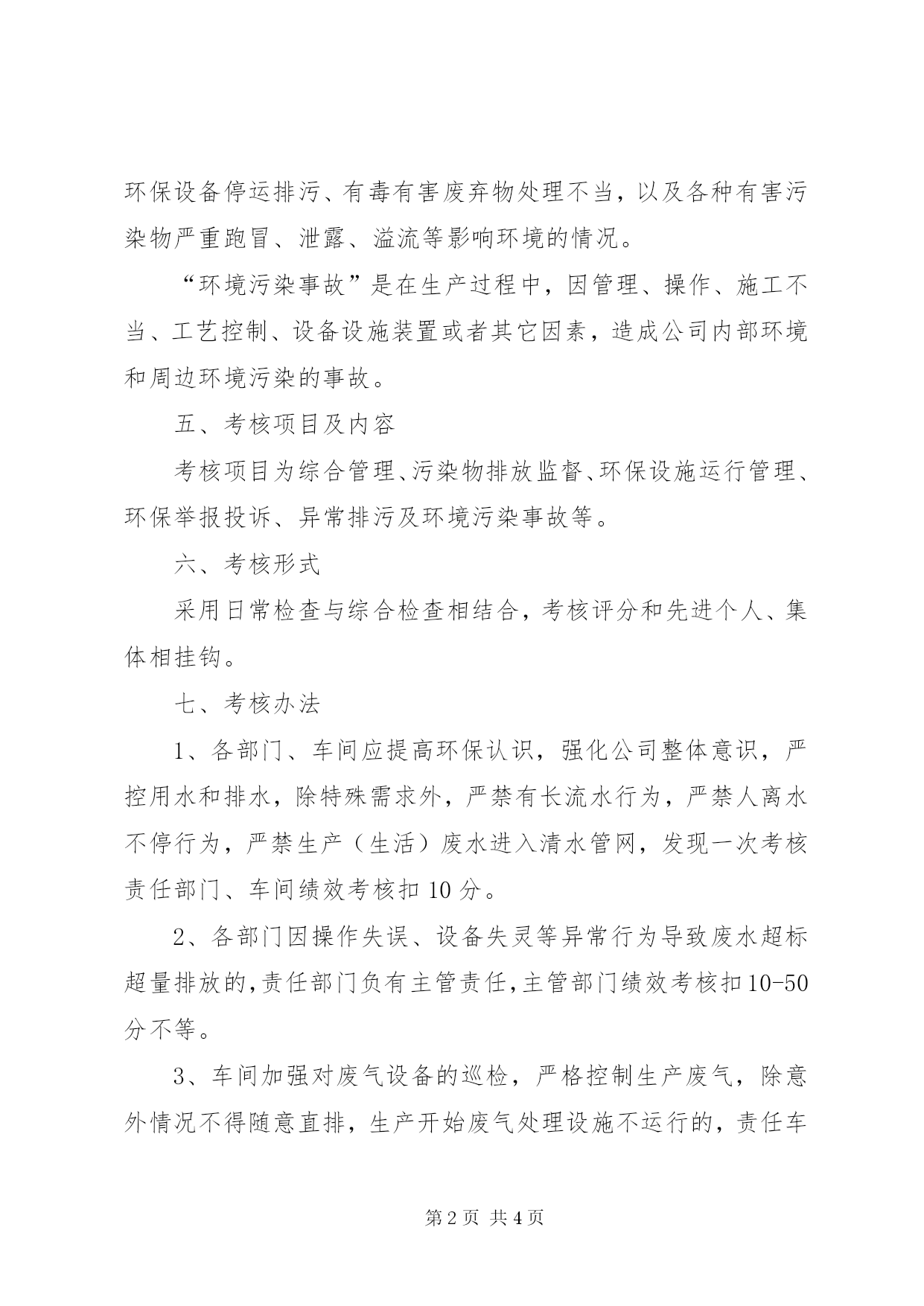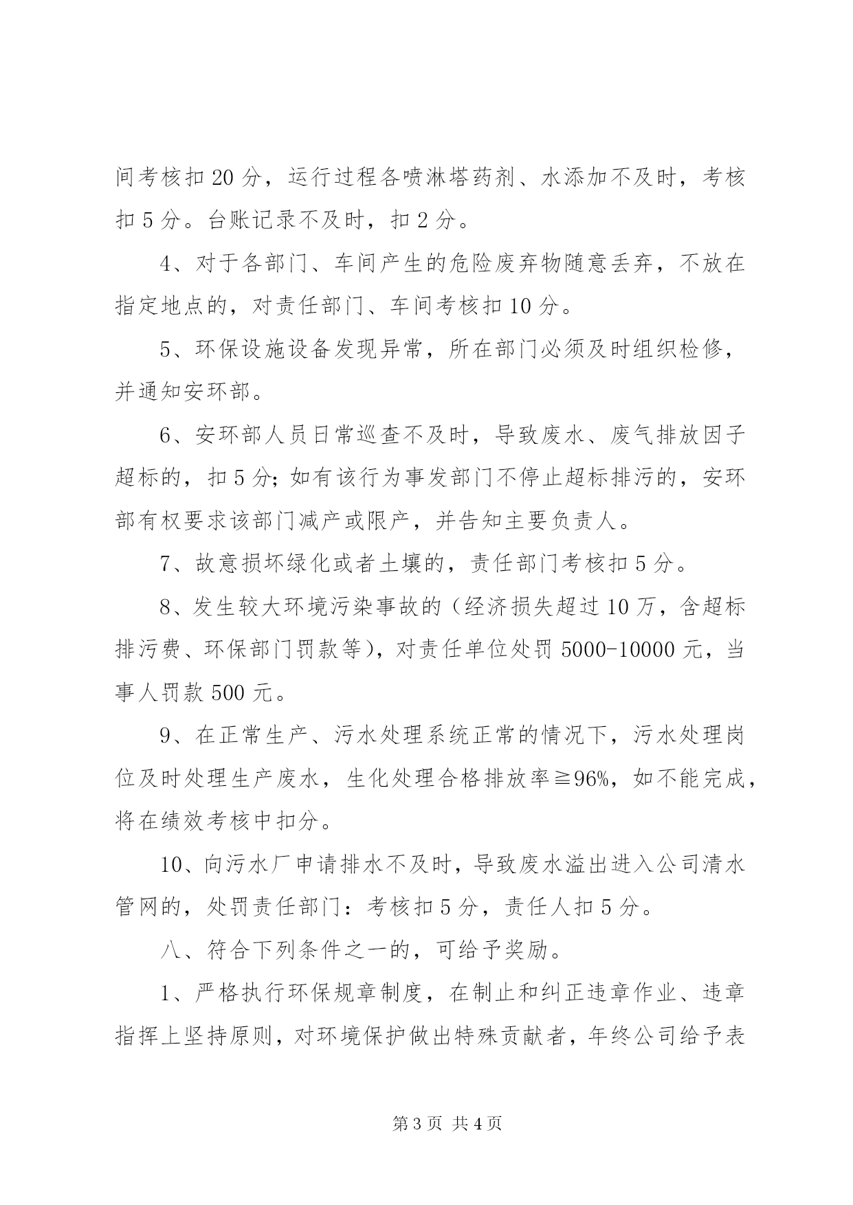 第PAGE\*Arabic\*MERGEFORMAT4页共NUMPAGES\*MERGEFORMAT4页安全环保奖惩制度环境保护奖惩管理制度一、目的为进一步加强公司环境保护监督管理,提高员工环保意识,防止污染事故发生,保护员工身体健康,强化责任到部门、责任到人,根据《中华人民共和国环境保护法》及南通、如东环保部门文件规定,制定本制度。二、范围凡本公司所属各生产车间、职能部门、辅助车间均在管理范围之内。三、职责1、安环部负责环境保护考核的归口管理,会同设备工程部、质量管理部、生产技术部、综合管理部等管理部门对公司内的环境管理运行和活动情况进行监督。检查和考核,负责提出考核意见,实施考核。2、人事部会同财务部根据考核结果进行扣分。3、各部门负责本部门环境保护及环境风险活动的管理,接受安环部对环境保护及环境风险的整改要求和考核,并对本部门违反管理规定的人员进行考核。四、定义“异常排污”是指生产过程中发生的超标排放、无组织排放、环保设备停运排污、有毒有害废弃物处理不当,以及各种有害污染物严重跑冒、泄露、溢流等影响环境的情况。“环境污染事故”是在生产过程中,因管理、操作、施工不当、工艺控制、设备设施装置或者其它因素,造成公司内部环境和周边环境污染的事故。五、考核项目及内容考核项目为综合管理、污染物排放监督、环保设施运行管理、环保举报投诉、异常排污及环境污染事故等。六、考核形式采用日常检查与综合检查相结合,考核评分和先进个人、集体相挂钩。七、考核办法1、各部门、车间应提高环保认识,强化公司整体意识,严控用水和排水,除特殊需求外,严禁有长流水行为,严禁人离水不停行为,严禁生产(生活)废水进入清水管网,发现一次考核责任部门、车间绩效考核扣10分。2、各部门因操作失误、设备失灵等异常行为导致废水超标超量排放的,责任部门负有主管责任,主管部门绩效考核扣10-50分不等。3、车间加强对废气设备的巡检,严格控制生产废气,除意外情况不得随意直排,生产开始废气处理设施不运行的,责任车间考核扣20分,运行过程各喷淋塔药剂、水添加不及时,考核扣5分。台账记录不及时,扣2分。4、对于各部门、车间产生的危险废弃物随意丢弃,不放在指定地点的,对责任部门、车间考核扣10分。5、环保设施设备发现异常,所在部门必须及时组织检修,并通知安环部。6、安环部人员日常巡查不及时,导致废水、废气排放因子超标的,扣5分;如有该行为事发部门不停止超标排污的,安环部有权要求该部门减产或限产,并告知主要负责人。7、故意损坏绿化或者土壤的,责任部门考核扣5分。8、发生较大环境污染事故的(经济损失超过10万,含超标排污费、环保部门罚款等),对责任单位处罚5000-10000元,当事人罚款500元。9、在正常生产、污水处理系统正常的情况下,污水处理岗位及时处理生产废水,生化处理合格排放率≧96%,如不能完成,将在绩效考核中扣分。10、向污水厂申请排水不及时,导致废水溢出进入公司清水管网的,处罚责任部门:考核扣5分,责任人扣5分。八、符合下列条件之一的,可给予奖励。1、严格执行环保规章制度,在制止和纠正违章作业、违章指挥上坚持原则,对环境保护做出特殊贡献者,年终公司给予表彰和奖励。2、精心操作,保持生产稳定,认真巡回检查,发现环境污染重大隐患、事故及时处理和上报的员工,公司一次性给予50-500元奖励。3、对积极提出环境保护合理化建议的,公司应一次性奖励50-500元。4、对积极参加环境污染事故抢险的,公司一次性奖励100-1000元。5、对他人污染环境行为进行举报的,公司一次性奖励50元。