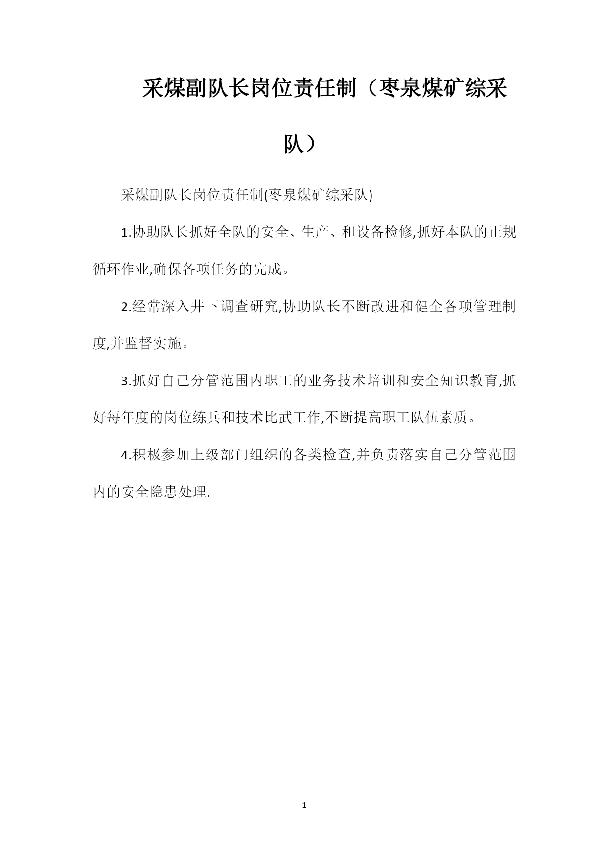 PAGEPAGE1采煤副队长岗位责任制(枣泉煤矿综采队)采煤副队长岗位责任制(枣泉煤矿综采队)1.协助队长抓好全队的安全、生产、和设备检修,抓好本队的正规循环作业,确保各项任务的完成。2.经常深入井下调查研究,协助队长不断改进和健全各项管理制度,并监督实施。3.抓好自己分管范围内职工的业务技术培训和安全知识教育,抓好每年度的岗位练兵和技术比武工作,不断提高职工队伍素质。4.积极参加上级部门组织的各类检查,并负责落实自己分管范围内的安全隐患处理.