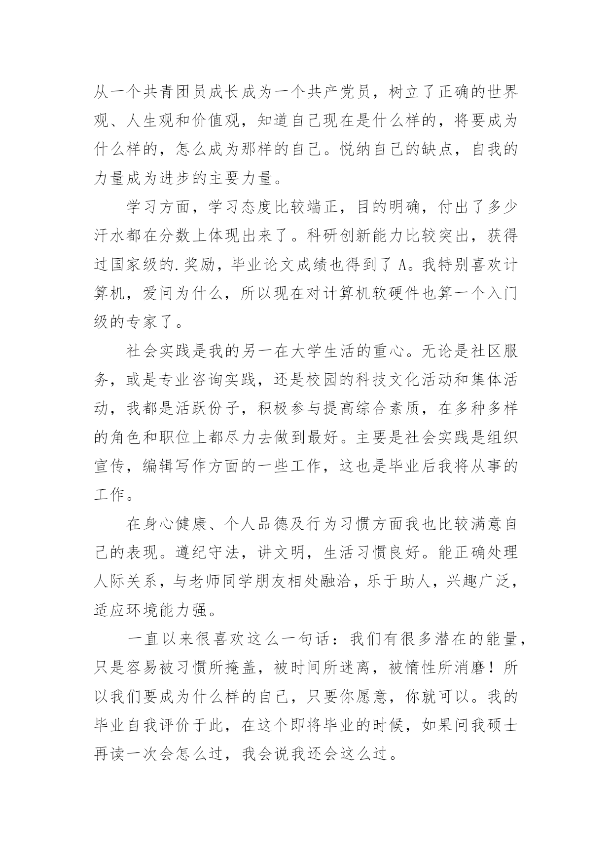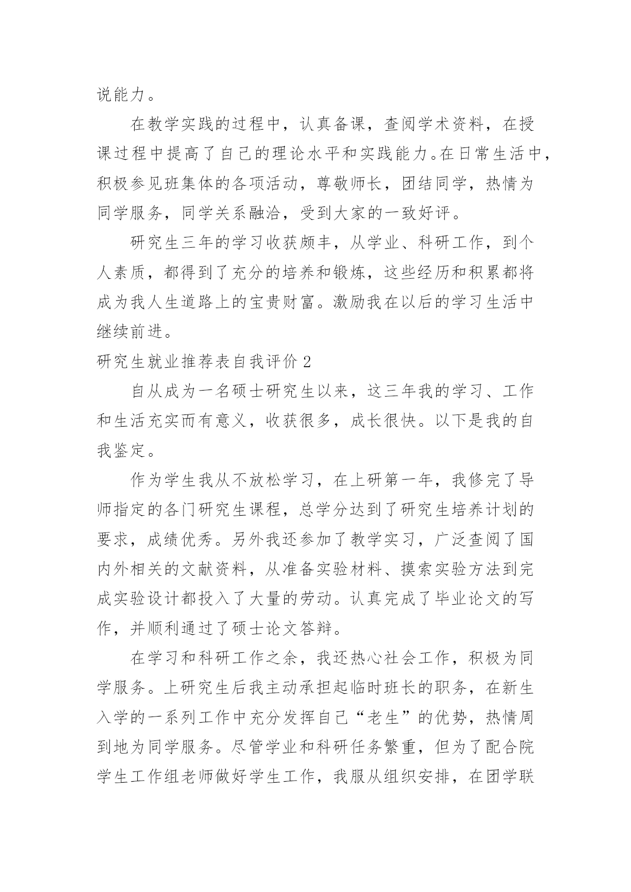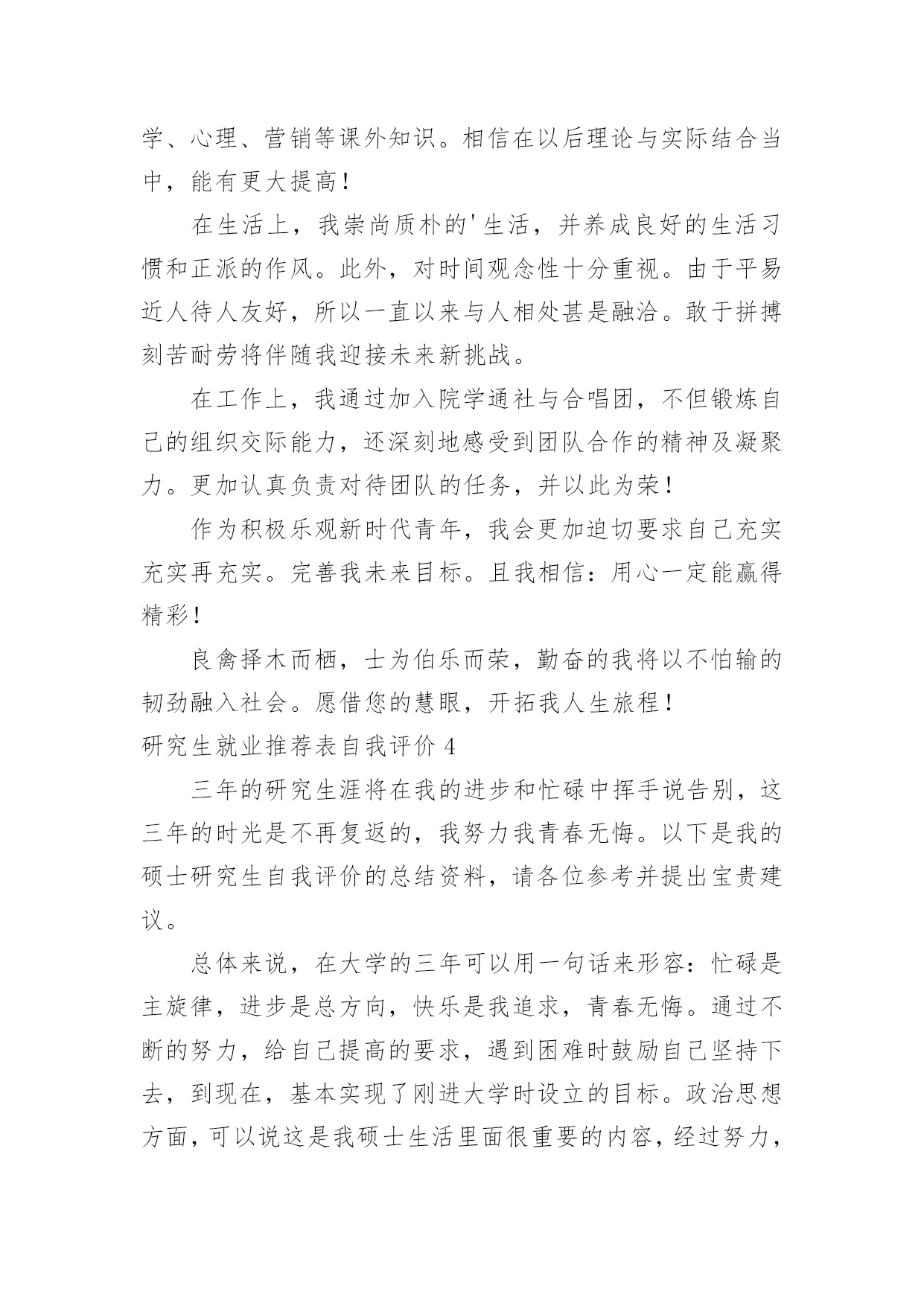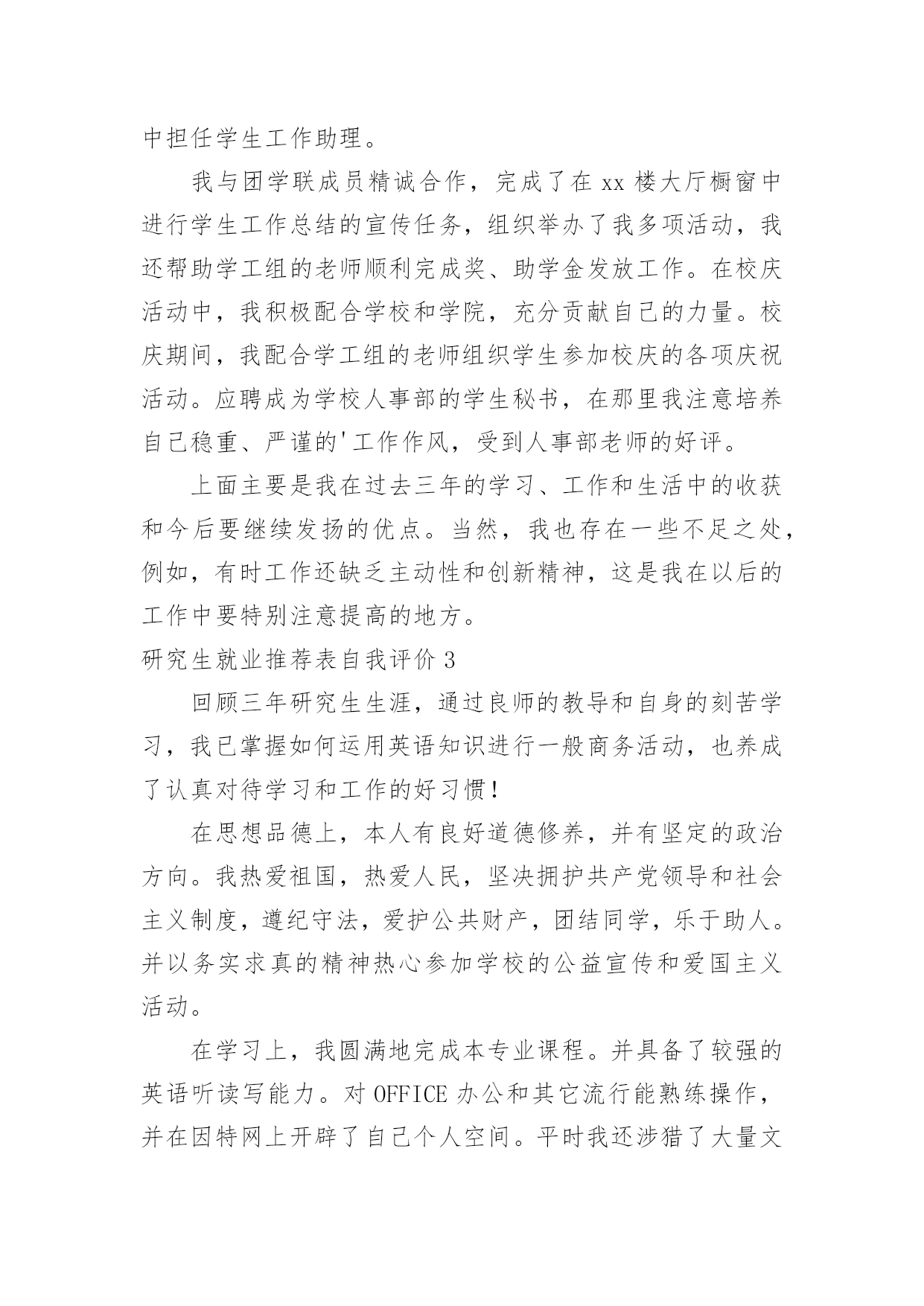 研究生就业表自我评价研究生就业推荐表自我评价无论是身处学校还是步入社会,我们经常遇到需要写自我评价的情况,自我评价是自我诊断、自我调节、自我完善的过程。你知道自我评价怎样写才规范吗?下面是小编整理的研究生就业推荐表自我评价,仅供参考,希望能够帮助到大家。研究生就业推荐表自我评价1三年的研究生学习生活匆匆而过,在这三年从不曾懈怠对自己的要求。在思想上严格以党员的标准要求自己,学习党的经典著作,不断提高自己的理论水平。作为其他同学的入党培养人,多次与培养对象交流、探讨,帮助他们提高思想认识。积极的参加党组织的各项活动,认真学习科学发展观,以科学发展观指导自己的`学习科研活动。在科研上,一方面认真学习专业基础课程,掌握专业基本理论,夯实专业基础,拓宽知识领域,为自己的科研工作打下扎实基础;另一方面根据自己研究方向,有针对性的进行学习和研究,探寻本专业的学科前沿领域,积极研究并发表学术论文。除此之外还广泛涉猎了各方面知识,开阔视野。在英语学习方面,通过了大学英语六级考试,具备了较强的英语听说能力。在教学实践的过程中,认真备课,查阅学术资料,在授课过程中提高了自己的理论水平和实践能力。在日常生活中,积极参见班集体的各项活动,尊敬师长,团结同学,热情为同学服务,同学关系融洽,受到大家的一致好评。研究生三年的学习收获颇丰,从学业、科研工作,到个人素质,都得到了充分的培养和锻炼,这些经历和积累都将成为我人生道路上的宝贵财富。激励我在以后的学习生活中继续前进。研究生就业推荐表自我评价2自从成为一名硕士研究生以来,这三年我的学习、工作和生活充实而有意义,收获很多,成长很快。以下是我的自我鉴定。作为学生我从不放松学习,在上研第一年,我修完了导师指定的各门研究生课程,总学分达到了研究生培养计划的要求,成绩优秀。另外我还参加了教学实习,广泛查阅了国内外相关的文献资料,从准备实验材料、摸索实验方法到完成实验设计都投入了大量的劳动。认真完成了毕业论文的写作,并顺利通过了硕士论文答辩。在学习和科研工作之余,我还热心社会工作,积极为同学服务。上研究生后我主动承担起临时班长的职务,在新生入学的一系列工作中充分发挥自己“老生”的优势,热情周到地为同学服务。尽管学业和科研任务繁重,但为了配合院学生工作组老师做好学生工作,我服从组织安排,在团学联中担任学生工作助理。我与团学联成员精诚合作,完成了在xx楼大厅橱窗中进行学生工作总结的宣传任务,组织举办了我多项活动,我还帮助学工组的老师顺利完成奖、助学金发放工作。在校庆活动中,我积极配合学校和学院,充分贡献自己的力量。校庆期间,我配合学工组的老师组织学生参加校庆的各项庆祝活动。应聘成为学校人事部的学生秘书,在那里我注意培养自己稳重、严谨的'工作作风,受到人事部老师的好评。上面主要是我在过去三年的学习、工作和生活中的收获和今后要继续发扬的优点。当然,我也存在一些不足之处,例如,有时工作还缺乏主动性和创新精神,这是我在以后的工作中要特别注意提高的地方。研究生就业推荐表自我评价3回顾三年研究生生涯,通过良师的教导和自身的刻苦学习,我已掌握如何运用英语知识进行一般商务活动,也养成了认真对待学习和工作的好习惯!在思想品德上,本人有良好道德修养,并有坚定的政治方向。我热爱祖国,热爱人民,坚决拥护共产党领导和社会主义制度,遵纪守法,爱护公共财产,团结同学,乐于助人。并以务实求真的精神热心参加学校的公益宣传和爱国主义活动。在学习上,我圆满地完成本专业课程。并具备了较强的英语听读写能力。对OFFICE办公和其它流行能熟练操作,并在因特网上开辟了自己个人空间。平时我还涉猎了大量文学、心理、营销等课外知识。相信在以后理论与实际结合当中,能有更大提高!在生活上,我崇尚质朴的'生活,并养成良好的生活习惯和正派的作风。此外,对时间观念性十分重视。由于平易近人待人友好,所以一直以来与人相处甚是融洽。敢于拼搏刻苦耐劳将伴随我迎接未来新挑战。在工作上,我通过加入院学通社与合唱团,不但锻炼自己的组织交际能力,还深刻地感受到团队合作的精神及凝聚力。更加认真负责对待团队的任务,并以此为荣!作为积极乐观新时代青年,我会更加迫切要求自己充实充实再充实。完善我未来目标。且我相信:用心一定能赢得精彩!良禽择木而栖,士为伯乐而荣,勤奋的我将以不怕输的韧劲融入社会。愿借您的慧眼,开拓我人生旅程!研究生就业推荐表自我评价4三年的研究生涯将在我的进步和忙碌中挥手说告别,这三年的时光是不再复返的,我努力我青春无悔。以下是我的硕士研究生自我评价的总结资料,请各位参考并提出宝贵建议。总体来说,在大学的三年可以用一句话来形容:忙碌是主旋律,进步是总方向,快乐是我追求,青春无悔。通过不断的努力,给自己提高的要求,遇到困难时鼓励自己坚持下去,到现在,基本实现了刚进大学时设立的目标。政治