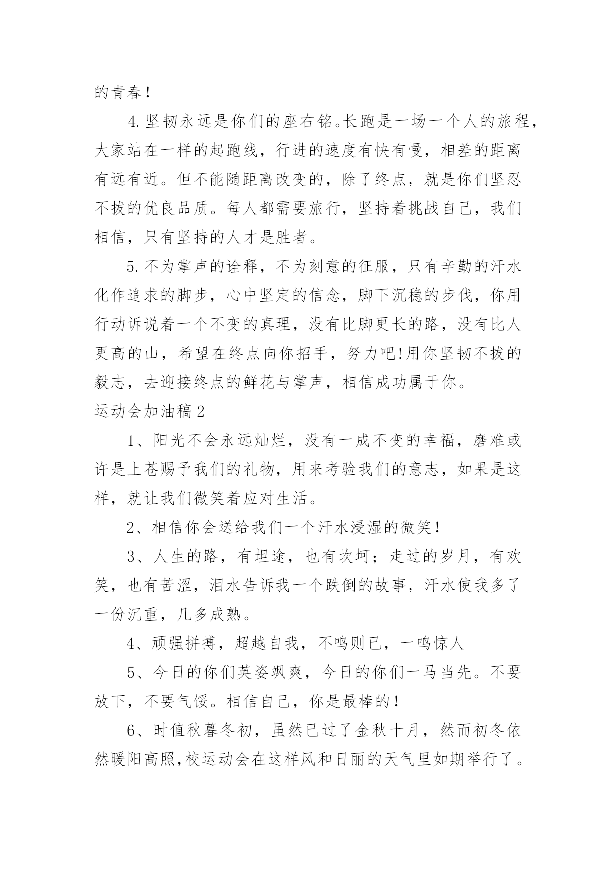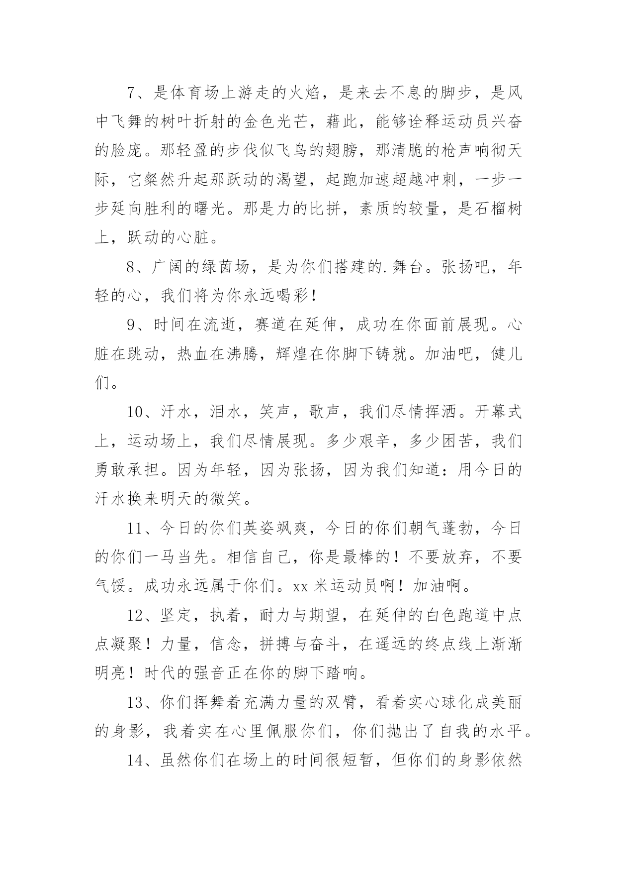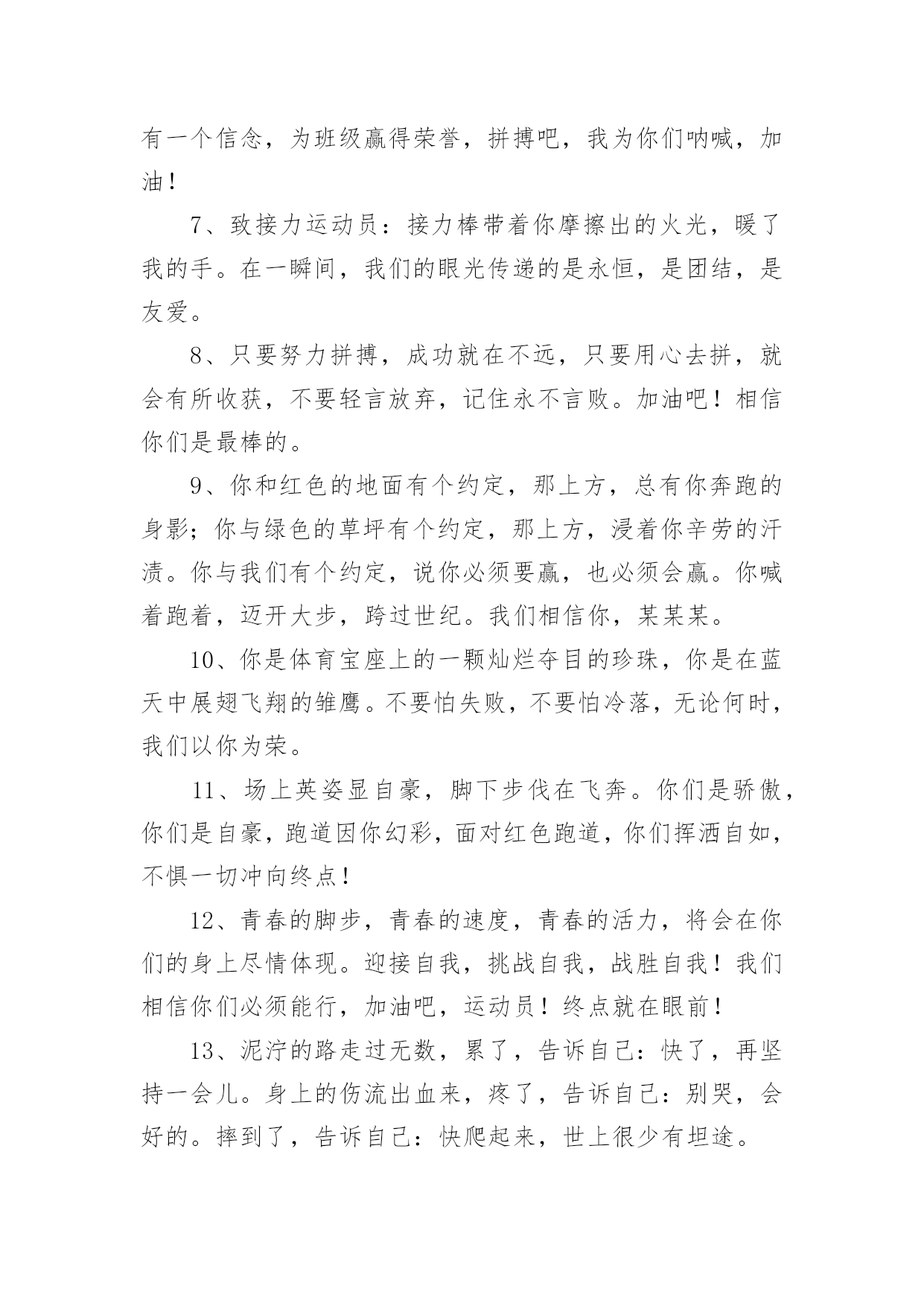 运动会加油稿运动会加油稿在当今社会生活中,我们都可能会用到加油稿,加油稿可以起到鼓励场上的人、增添其信心的作用。那要怎么写好加油稿呢?下面是小编精心整理的运动会加油稿,欢迎阅读,希望大家能够喜欢。运动会加油稿11.喜人的成绩证明了你们的努力,热烈的祝贺报答了你们的成功。每个人都是优秀的你们的见证者,见证你们在竞争中成长,在互助中完善自我。但短暂的成功并不能代表你们以后的状态,请你们加油,不停地努力,努力学习,强身健体,让我们看到,一个完美的未来。2.我们看到:在微凉的清风中,你们迎风起跳,在舒适的风中飞跃,飞越出人生的高度。我们没看到的是每天课间与体育课时你们更多次的腾空而起。训练的过程会很艰苦,甚至可能因此受伤,但你们依然不断地挑战着自己高度的极限。我们都要学会,超越自己,再去超越他人。向你们致敬!3.巾帼不让须眉,身为女子,你们却仍有不输男子的气概与爆发力。平日柔弱的身姿亦能爆发出强劲的冲击。超负荷的发力,更超过你们所可以承受的力量。但你们并不畏惧,勇往直前。拼搏吧,拼尽一身的.力气,让生命绽放在无悔的青春!4.坚韧永远是你们的座右铭。长跑是一场一个人的旅程,大家站在一样的起跑线,行进的速度有快有慢,相差的距离有远有近。但不能随距离改变的,除了终点,就是你们坚忍不拔的优良品质。每人都需要旅行,坚持着挑战自己,我们相信,只有坚持的人才是胜者。5.不为掌声的诠释,不为刻意的征服,只有辛勤的汗水化作追求的脚步,心中坚定的信念,脚下沉稳的步伐,你用行动诉说着一个不变的真理,没有比脚更长的路,没有比人更高的山,希望在终点向你招手,努力吧!用你坚韧不拔的毅志,去迎接终点的鲜花与掌声,相信成功属于你。运动会加油稿21、阳光不会永远灿烂,没有一成不变的幸福,磨难或许是上苍赐予我们的礼物,用来考验我们的意志,如果是这样,就让我们微笑着应对生活。2、相信你会送给我们一个汗水浸湿的微笑!3、人生的路,有坦途,也有坎坷;走过的岁月,有欢笑,也有苦涩,泪水告诉我一个跌倒的故事,汗水使我多了一份沉重,几多成熟。4、顽强拼搏,超越自我,不鸣则已,一鸣惊人5、今日的你们英姿飒爽,今日的你们一马当先。不要放下,不要气馁。相信自己,你是最棒的!6、时值秋暮冬初,虽然已过了金秋十月,然而初冬依然暖阳高照,校运动会在这样风和日丽的天气里如期举行了。7、是体育场上游走的火焰,是来去不息的脚步,是风中飞舞的树叶折射的金色光芒,藉此,能够诠释运动员兴奋的脸庞。那轻盈的步伐似飞鸟的翅膀,那清脆的枪声响彻天际,它粲然升起那跃动的渴望,起跑加速超越冲刺,一步一步延向胜利的曙光。那是力的比拼,素质的较量,是石榴树上,跃动的心脏。8、广阔的绿茵场,是为你们搭建的.舞台。张扬吧,年轻的心,我们将为你永远喝彩!9、时间在流逝,赛道在延伸,成功在你面前展现。心脏在跳动,热血在沸腾,辉煌在你脚下铸就。加油吧,健儿们。10、汗水,泪水,笑声,歌声,我们尽情挥洒。开幕式上,运动场上,我们尽情展现。多少艰辛,多少困苦,我们勇敢承担。因为年轻,因为张扬,因为我们知道:用今日的汗水换来明天的微笑。11、今日的你们英姿飒爽,今日的你们朝气蓬勃,今日的你们一马当先。相信自己,你是最棒的!不要放弃,不要气馁。成功永远属于你们。xx米运动员啊!加油啊。12、坚定,执着,耐力与期望,在延伸的白色跑道中点点凝聚!力量,信念,拼搏与奋斗,在遥远的终点线上渐渐明亮!时代的强音正在你的脚下踏响。13、你们挥舞着充满力量的双臂,看着实心球化成美丽的身影,我着实在心里佩服你们,你们抛出了自我的水平。14、虽然你们在场上的时间很短暂,但你们的身影依然停留在人们的脑海里,因为你们是赛场上最可爱的人!15、坚定,执着,耐力与期望,在延伸的白色跑道中点点凝聚!力量,信念,拼搏与奋斗,在遥远的终点线上渐渐明亮!时代的强音正在你的脚下踏响!运动会加油稿31、坚定而又有力量,眼睛看着的不是眼前的跑道,而是那最终的目标,不管汗洒如雨,步伐迟缓退后,不退缩,不气馁,加油,健儿!2、你用行动述说着过程的重要,没有无尽的终点,没有无法攀登的险峰,希望载着终点在向你微笑,拼搏吧!经历是一种精彩,迸发你全部的能量,成功是你汗水的写照。3、真的,人生要是能有一个草稿,能再誊写一次,那该多好!我们会绝对认真地叙写自己的人生,也许不必须比别人写得更好,但肯定要比自己第一次写得漂亮。或许,人生不可能像自己想象的那样完美,一生的路也不可能都是平坦的,人的情绪也不会永远静如止水。4、面对艰苦的征程,你们毫不畏惧,接力棒在你们手中传递着团体的力量,听,我们在为你呐喊,你们诠释着奥运的精神,你们是我们心中的骄傲。5、循环式的训练,是为了离成功更进一步。付出总会有收获,愿你们的付出会换来你们期望的结果。6、运动场上有你们的飒爽英姿,运动场上有你们拼搏的身影