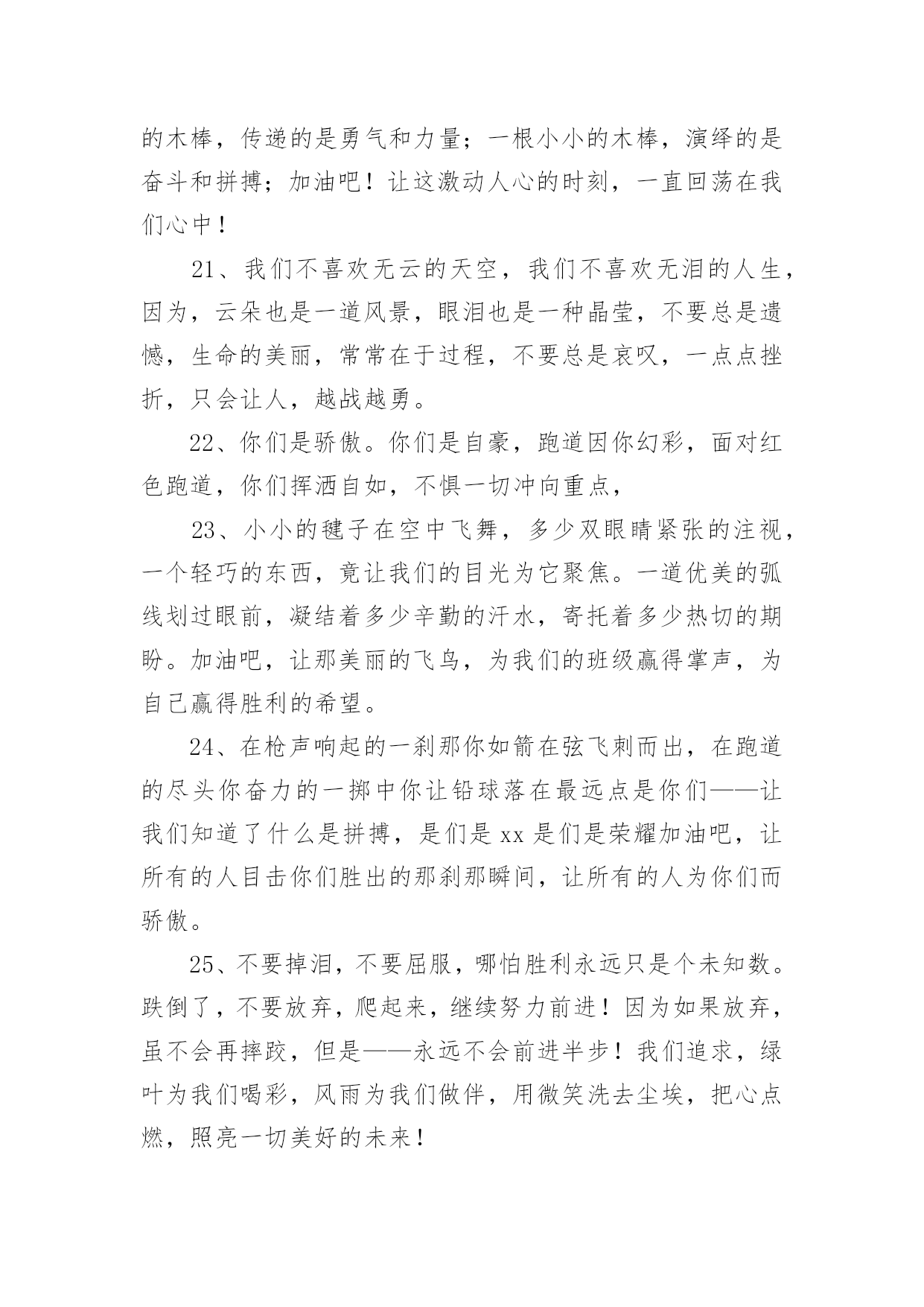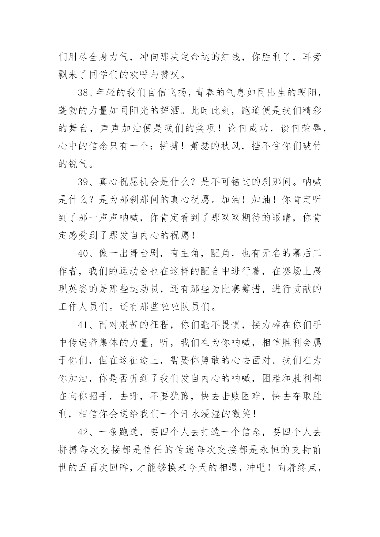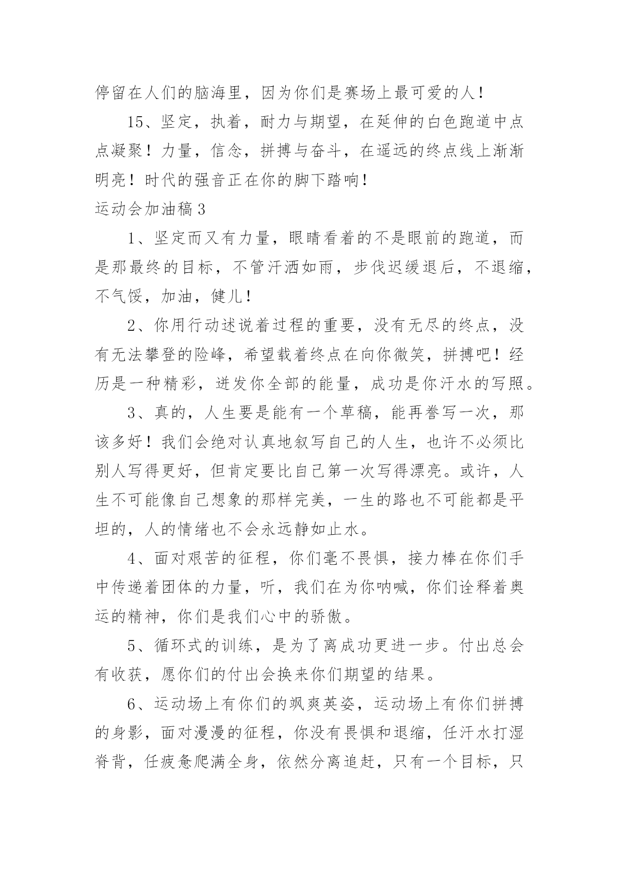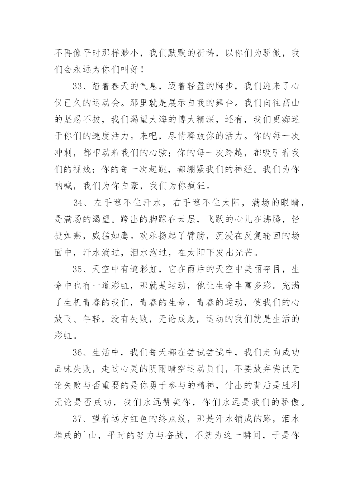 运动会加油稿运动会加油稿在当今社会生活中,我们都可能会用到加油稿,加油稿可以起到鼓励场上的人、增添其信心的作用。那要怎么写好加油稿呢?下面是小编精心整理的运动会加油稿,欢迎阅读,希望大家能够喜欢。运动会加油稿11.喜人的成绩证明了你们的努力,热烈的祝贺报答了你们的成功。每个人都是优秀的你们的见证者,见证你们在竞争中成长,在互助中完善自我。但短暂的成功并不能代表你们以后的状态,请你们加油,不停地努力,努力学习,强身健体,让我们看到,一个完美的未来。2.我们看到:在微凉的清风中,你们迎风起跳,在舒适的风中飞跃,飞越出人生的高度。我们没看到的是每天课间与体育课时你们更多次的腾空而起。训练的过程会很艰苦,甚至可能因此受伤,但你们依然不断地挑战着自己高度的极限。我们都要学会,超越自己,再去超越他人。向你们致敬!3.巾帼不让须眉,身为女子,你们却仍有不输男子的气概与爆发力。平日柔弱的身姿亦能爆发出强劲的冲击。超负荷的发力,更超过你们所可以承受的力量。但你们并不畏惧,勇往直前。拼搏吧,拼尽一身的.力气,让生命绽放在无悔的青春!4.坚韧永远是你们的座右铭。长跑是一场一个人的旅程,大家站在一样的起跑线,行进的速度有快有慢,相差的距离有远有近。但不能随距离改变的,除了终点,就是你们坚忍不拔的优良品质。每人都需要旅行,坚持着挑战自己,我们相信,只有坚持的人才是胜者。5.不为掌声的诠释,不为刻意的征服,只有辛勤的汗水化作追求的脚步,心中坚定的信念,脚下沉稳的步伐,你用行动诉说着一个不变的真理,没有比脚更长的路,没有比人更高的山,希望在终点向你招手,努力吧!用你坚韧不拔的毅志,去迎接终点的鲜花与掌声,相信成功属于你。运动会加油稿21、阳光不会永远灿烂,没有一成不变的幸福,磨难或许是上苍赐予我们的礼物,用来考验我们的意志,如果是这样,就让我们微笑着应对生活。2、相信你会送给我们一个汗水浸湿的微笑!3、人生的路,有坦途,也有坎坷;走过的岁月,有欢笑,也有苦涩,泪水告诉我一个跌倒的故事,汗水使我多了一份沉重,几多成熟。4、顽强拼搏,超越自我,不鸣则已,一鸣惊人5、今日的你们英姿飒爽,今日的你们一马当先。不要放下,不要气馁。相信自己,你是最棒的!6、时值秋暮冬初,虽然已过了金秋十月,然而初冬依然暖阳高照,校运动会在这样风和日丽的天气里如期举行了。7、是体育场上游走的火焰,是来去不息的脚步,是风中飞舞的树叶折射的金色光芒,藉此,能够诠释运动员兴奋的脸庞。那轻盈的步伐似飞鸟的翅膀,那清脆的枪声响彻天际,它粲然升起那跃动的渴望,起跑加速超越冲刺,一步一步延向胜利的曙光。那是力的比拼,素质的较量,是石榴树上,跃动的心脏。8、广阔的绿茵场,是为你们搭建的.舞台。张扬吧,年轻的心,我们将为你永远喝彩!9、时间在流逝,赛道在延伸,成功在你面前展现。心脏在跳动,热血在沸腾,辉煌在你脚下铸就。加油吧,健儿们。10、汗水,泪水,笑声,歌声,我们尽情挥洒。开幕式上,运动场上,我们尽情展现。多少艰辛,多少困苦,我们勇敢承担。因为年轻,因为张扬,因为我们知道:用今日的汗水换来明天的微笑。11、今日的你们英姿飒爽,今日的你们朝气蓬勃,今日的你们一马当先。相信自己,你是最棒的!不要放弃,不要气馁。成功永远属于你们。xx米运动员啊!加油啊。12、坚定,执着,耐力与期望,在延伸的白色跑道中点点凝聚!力量,信念,拼搏与奋斗,在遥远的终点线上渐渐明亮!时代的强音正在你的脚下踏响。13、你们挥舞着充满力量的双臂,看着实心球化成美丽的身影,我着实在心里佩服你们,你们抛出了自我的水平。14、虽然你们在场上的时间很短暂,但你们的身影依然停留在人们的脑海里,因为你们是赛场上最可爱的人!15、坚定,执着,耐力与期望,在延伸的白色跑道中点点凝聚!力量,信念,拼搏与奋斗,在遥远的终点线上渐渐明亮!时代的强音正在你的脚下踏响!运动会加油稿31、坚定而又有力量,眼睛看着的不是眼前的跑道,而是那最终的目标,不管汗洒如雨,步伐迟缓退后,不退缩,不气馁,加油,健儿!2、你用行动述说着过程的重要,没有无尽的终点,没有无法攀登的险峰,希望载着终点在向你微笑,拼搏吧!经历是一种精彩,迸发你全部的能量,成功是你汗水的写照。3、真的,人生要是能有一个草稿,能再誊写一次,那该多好!我们会绝对认真地叙写自己的人生,也许不必须比别人写得更好,但肯定要比自己第一次写得漂亮。或许,人生不可能像自己想象的那样完美,一生的路也不可能都是平坦的,人的情绪也不会永远静如止水。4、面对艰苦的征程,你们毫不畏惧,接力棒在你们手中传递着团体的力量,听,我们在为你呐喊,你们诠释着奥运的精神,你们是我们心中的骄傲。5、循环式的训练,是为了离成功更进一步。付出总会有收获,愿你们的付出会换来你们期望的结果。6、运动场上有你们的飒爽英姿,运动场上有你们拼搏的身影