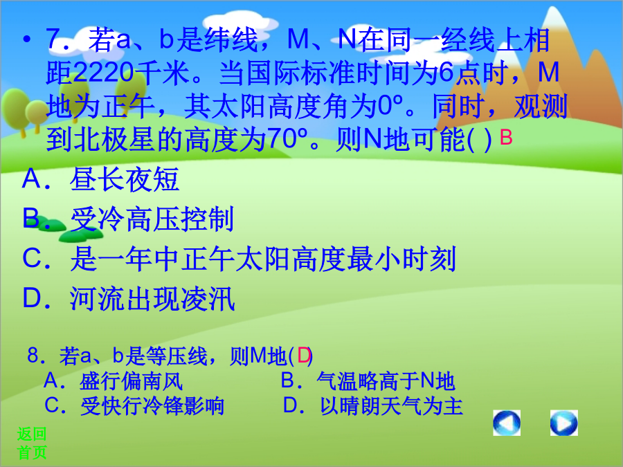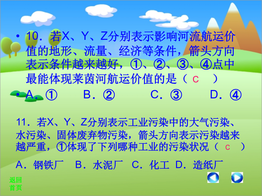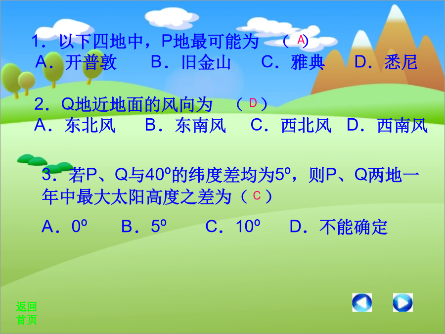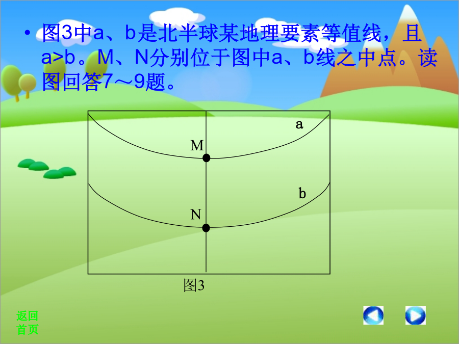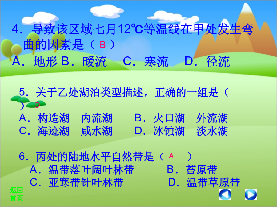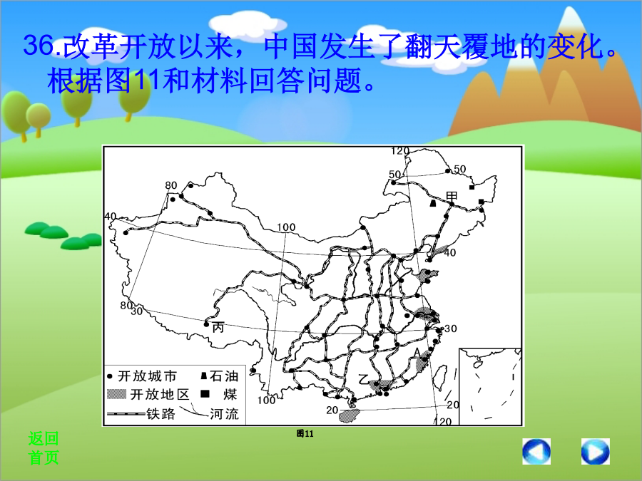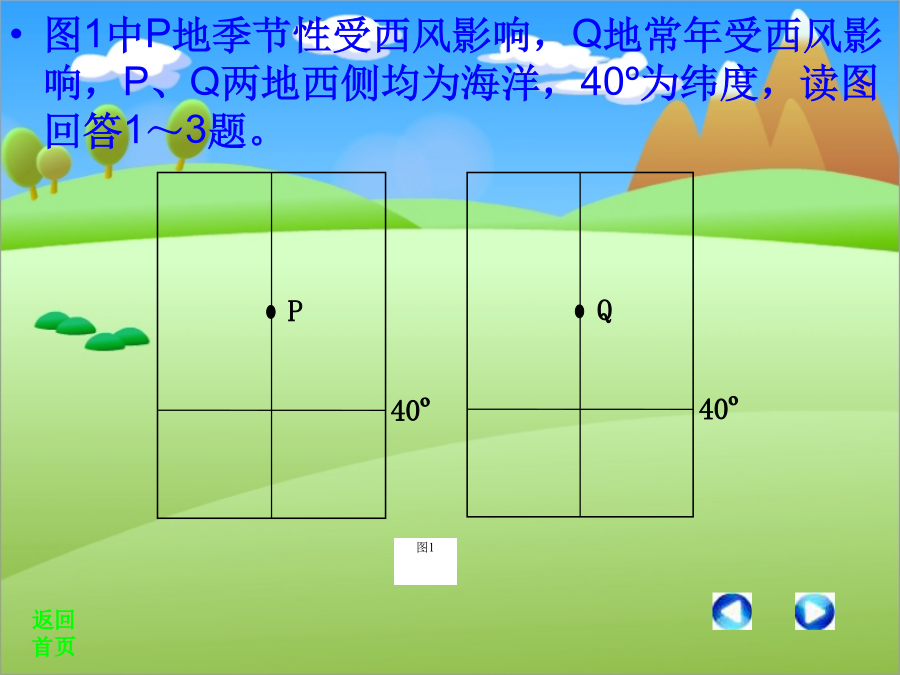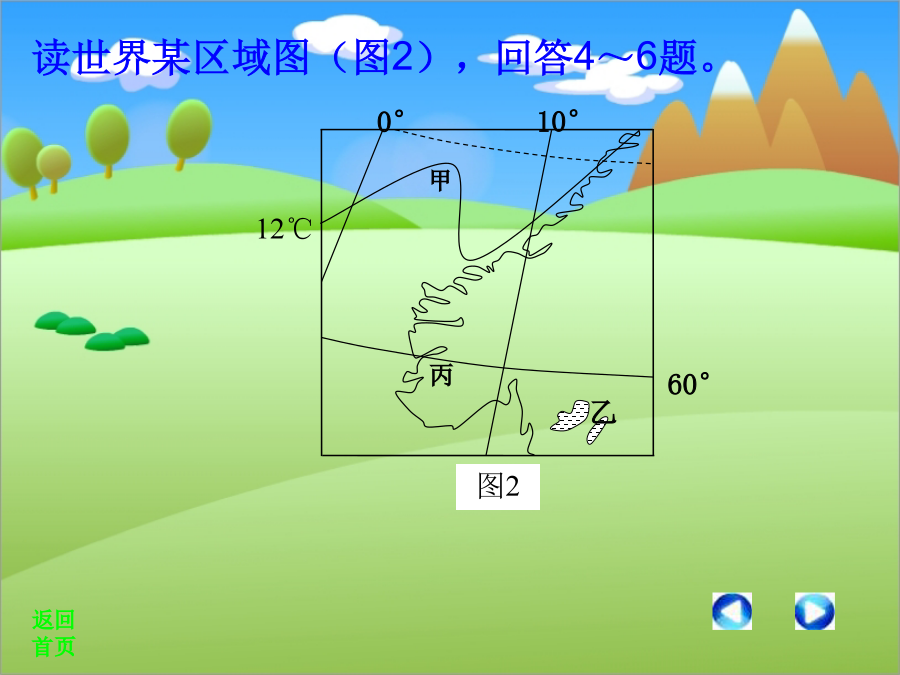2011高地理复习图1中P地季节性受西风影响,Q地常年受西风影响,P、Q两地西侧均为海洋,40º为纬度,读图回答1~3题。1.以下四地中,P地最可能为()A.开普敦B.旧金山C.雅典D.悉尼读世界某区域图(图2),回答4~6题。4.导致该区域七月12℃等温线在甲处发生弯曲的因素是()A.地形B.暖流C.寒流D.径流图3中a、b是北半球某地理要素等值线,且a>b。M、N分别位于图中a、b线之中点。读图回答7~9题。7.若a、b是纬线,M、N在同一经线上相距2220千米。当国际标准时间为6点时,M地为正午,其太阳高度角为0º。同时,观测到北极星的高度为70º。则N地可能()A.昼长夜短B.受冷高压控制C.是一年中正午太阳高度最小时刻D.河流出现凌汛读三维坐标图(图4),回答10~11题。10.若X、Y、Z分别表示影响河流航运价值的地形、流量、经济等条件,箭头方向表示条件越来越好,①、②、③、④点中最能体现莱茵河航运价值的是()A.①B.②C.③D.④36.改革开放以来,中国发生了翻天覆地的变化。根据图11和材料回答问题。(2)A开放地区大量出口农产品,简答该地发展农业的有利自然条件。(6分)(3)从社会经济方面,简要分析甲、乙、丙三城市对外开放区位优势的主要差异。(10分)39.阅读分析资料,结合所学知识,完成下列各题。材料一:黄河是中国历史上决口、改道最多的河流。春秋以前,黄河下游流经河北平原入海,河道无所约束,漫流改徙无定,时常多股河道并存。战国时期,黄河下游两岸筑堤,河道逐渐稳定。由于中游植被破坏,水土流失严重,“河水浊重,号为一石水而六斗泥”。汉文帝时黄河下游出现大规模决口。东汉初年,王景治河,随地势高低,裁弯取直,修筑堤防,开辟了一条新的河道。其后,北方游牧民族入居黄河中游,大片土地由耕转牧,水土流失相对减缓。至唐末,800年间黄河下游河道相对稳定。北宋初年,随着黄河下游河道逐渐淤高,出现悬河,“高民屋殆逾文”。1128年,宋东京留守杜充为阻止金兵南下,于李固渡扒开河堤。黄河决口,东京豫东北、鲁西南地区,汇泗入淮。此后七百多年间,黄河不再进入河北平原,夺淮入海,多次决口、改道,改变了黄淮平原的原有水系。水患遍及黄淮平原,洪水吞没大片土地,夺去千百万人的生命和财产。洪水过后形成的许多沙丘和沙垅,吞噬大量农田、房屋,淤没城市,淤塞运河,阻塞交通。明清时期,黄淮平原“农业生产日趋衰落,成为全国贫困地区之一”。(1)据《河防一览》记载,黄河平时“沙居其六”,伏汛时“水居其二”,试说明原因。(8分)同学们再见!