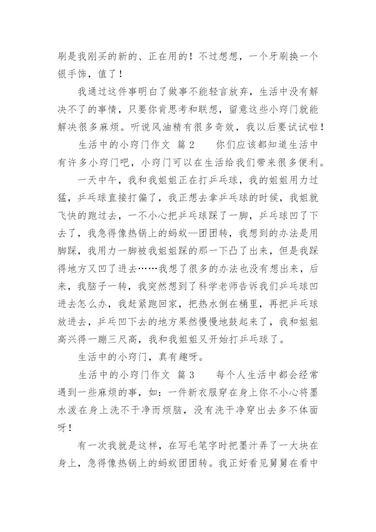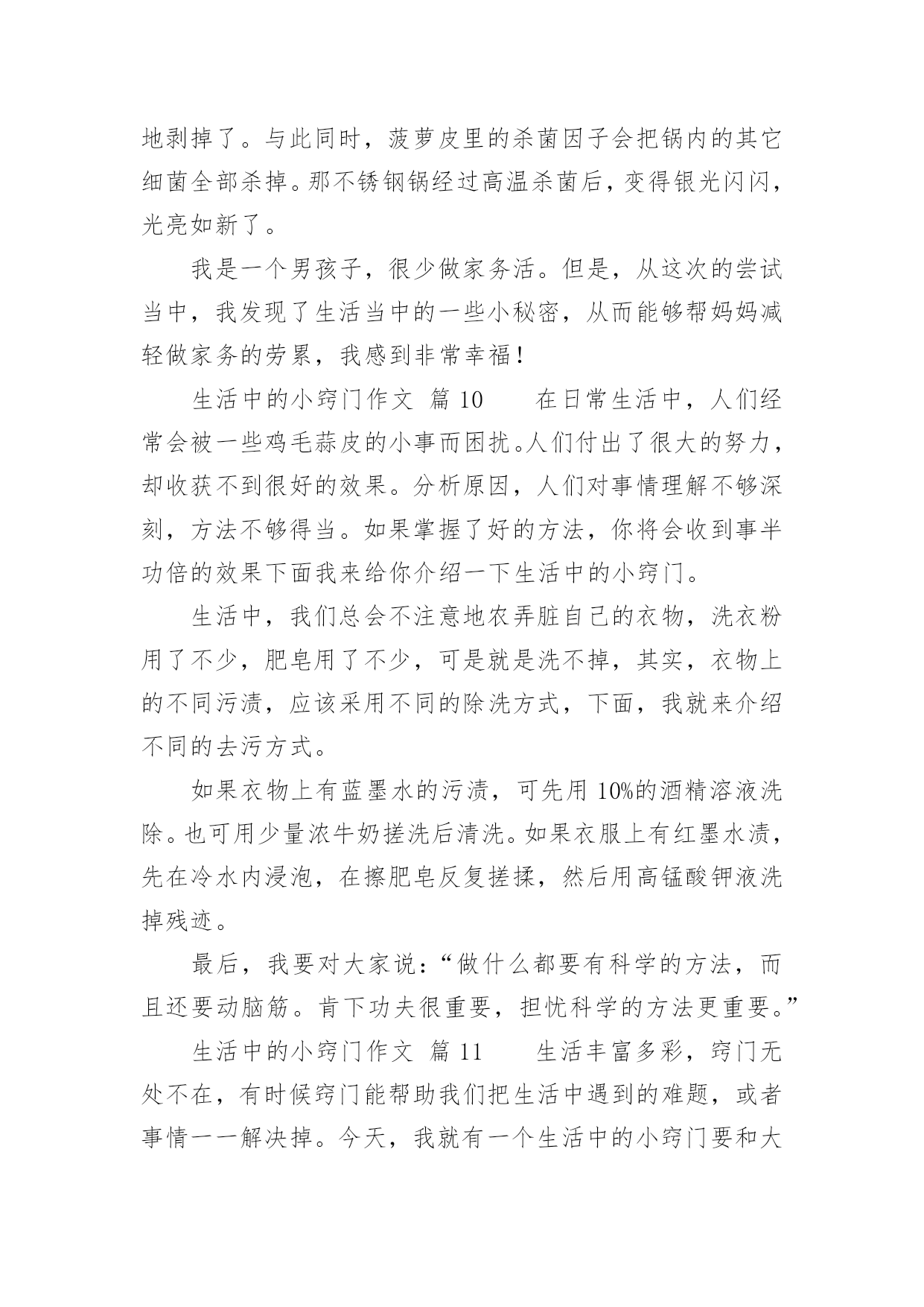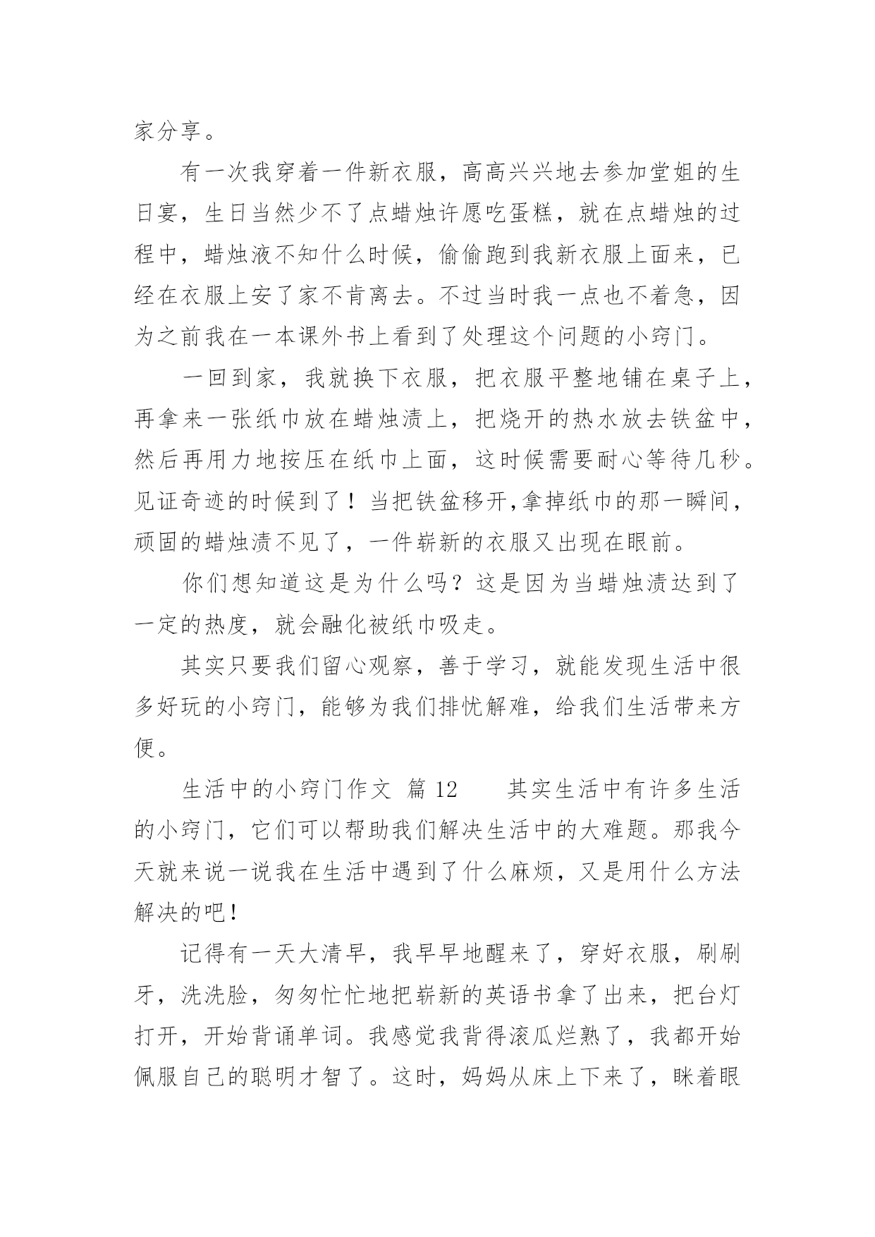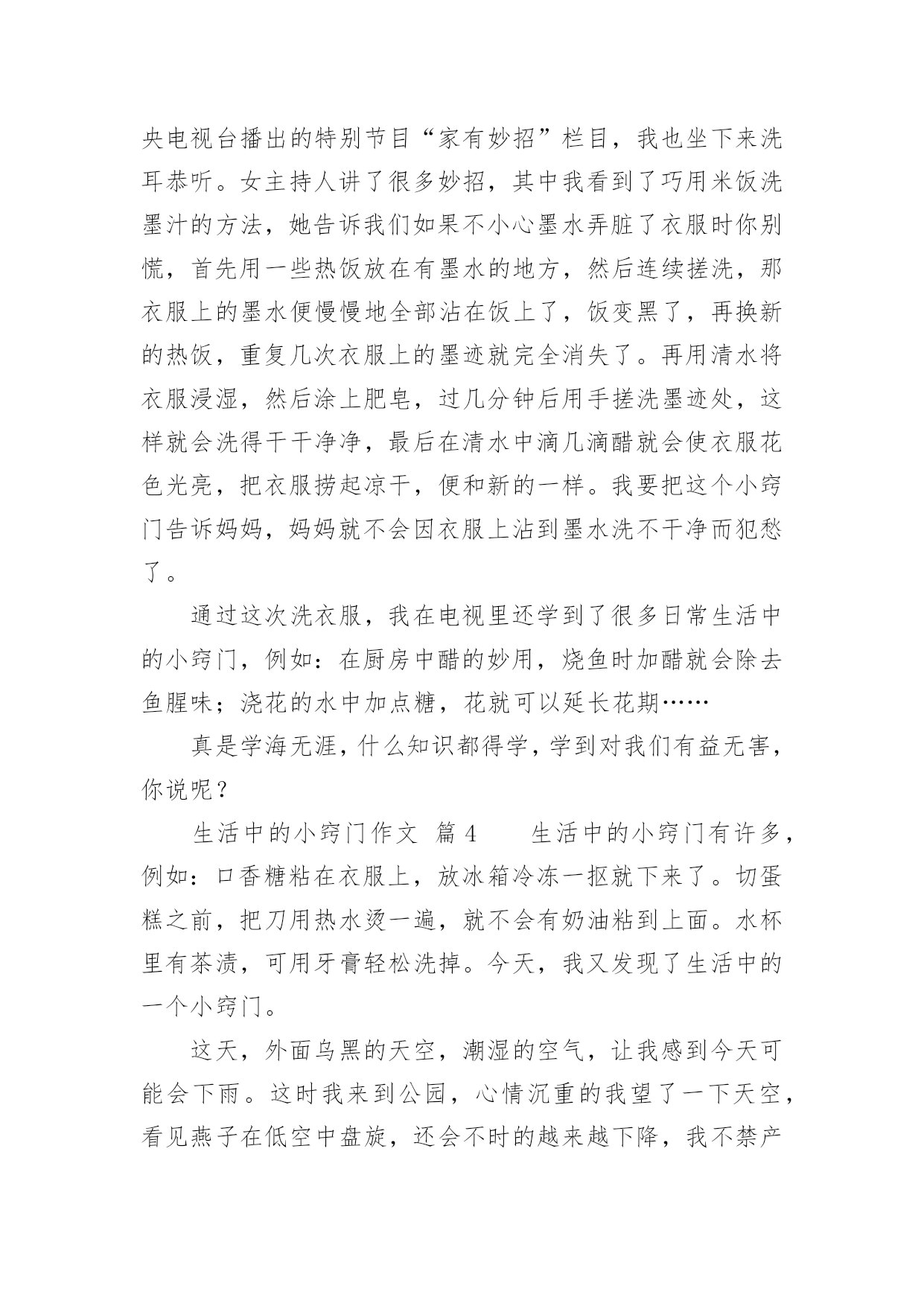 生活中的小窍门作文生活中的小窍门作文450字(通用47篇)在日复一日的学习、工作或生活中,大家都不可避免地会接触到作文吧,作文根据写作时限的不同可以分为限时作文和非限时作文。那么问题来了,到底应如何写一篇优秀的作文呢?下面是小编为大家收集的生活中的小窍门作文450字(通用47篇),希望对大家有所帮助。生活中的小窍门作文篇1生活中有许许多多小窍门,今天就给你讲讲我生活的小窍门吧。有一次,我妈妈的银首饰被氧化变脏了,黑乎乎的,看起来可不好看啦,我便下定决心要想办法把首饰擦干净。我使出常规的“武器”,准备和“敌方”大干一场。我先拿出抹布和水盆,擦了半天没有用,心想“白费劲儿!没擦掉一点!说完我把抹布扔在一边,气得直跺脚,这时我瞟见脚上那白白的旅游鞋,两眼发亮,便有了灵感,快使出“秘密武器”。我跑进卫生间、拿出牙刷和牙膏,以前妈妈用这个擦我的白鞋,又白又亮,这个说不定可以有用。于是,我把一大块牙膏挤在牙刷上,准备行动,我左边抹抹,右边刷刷,银手镯变得亮光光的啦!我把它仔细观察了一番,发现还有边边角角处没弄干净。于是,我又用秘密武器“杀”了他个片甲不留,我把它放进水池冲了冲,干净了!突然,我好像又发现了什么似的大叫了起来。原来,牙刷是我刚买的新的、正在用的!不过想想,一个牙刷换一个银手饰,值了!我通过这件事明白了做事不能轻言放弃,生活中没有解决不了的事情,只要你肯思考和联想,留意这些小窍门就能解决很多麻烦。听说风油精有很多奇效,我以后要试试啦!生活中的小窍门作文篇2你们应该都知道生活中有许多小窍门吧,小窍门可以在生活给我们带来很多便利。一天中午,我和我姐姐正在打乒乓球,我的姐姐用力过猛,乒乓球直接打偏了,我正想去拿乒乓球的时候,我姐就飞快的跑过去,一不小心把乒乓球踩了一脚,乒乓球凹了下去了,我急得像热锅上的蚂蚁—团团转,我想到的办法是用脚踩,我用力一脚被我姐姐踩的那一下凸了出来,但是我踩得地方又凹了进去……我想了很多的办法也没有想出来,后来,我脑子一转,我突然想到了科学老师告诉我们乒乓球凹进去怎么办,我赶紧跑回家,把热水倒在桶里,再把乒乓球放进去,乒乓凹下去的地方果然慢慢地鼓起来了,我和姐姐高兴得一蹦三尺高,我和我姐姐又开始打乒乓球了。生活中的小窍门,真有趣呀。生活中的小窍门作文篇3每个人生活中都会经常遇到一些麻烦的事,如:一件新衣服穿在身上你不小心将墨水泼在身上洗不干净而烦脑,没有洗干净穿出去多不体面呀!有一次我就是这样,在写毛笔字时把墨汁弄了一大块在身上,急得像热锅上的蚂蚁团团转。我正好看见舅舅在看中央电视台播出的特别节目“家有妙招”栏目,我也坐下来洗耳恭听。女主持人讲了很多妙招,其中我看到了巧用米饭洗墨汁的方法,她告诉我们如果不小心墨水弄脏了衣服时你别慌,首先用一些热饭放在有墨水的地方,然后连续搓洗,那衣服上的墨水便慢慢地全部沾在饭上了,饭变黑了,再换新的热饭,重复几次衣服上的墨迹就完全消失了。再用清水将衣服浸湿,然后涂上肥皂,过几分钟后用手搓洗墨迹处,这样就会洗得干干净净,最后在清水中滴几滴醋就会使衣服花色光亮,把衣服捞起凉干,便和新的一样。我要把这个小窍门告诉妈妈,妈妈就不会因衣服上沾到墨水洗不干净而犯愁了。通过这次洗衣服,我在电视里还学到了很多日常生活中的小窍门,例如:在厨房中醋的妙用,烧鱼时加醋就会除去鱼腥味;浇花的水中加点糖,花就可以延长花期……真是学海无涯,什么知识都得学,学到对我们有益无害,你说呢?生活中的小窍门作文篇4生活中的小窍门有许多,例如:口香糖粘在衣服上,放冰箱冷冻一抠就下来了。切蛋糕之前,把刀用热水烫一遍,就不会有奶油粘到上面。水杯里有茶渍,可用牙膏轻松洗掉。今天,我又发现了生活中的一个小窍门。这天,外面乌黑的天空,潮湿的空气,让我感到今天可能会下雨。这时我来到公园,心情沉重的我望了一下天空,看见燕子在低空中盘旋,还会不时的越来越下降,我不禁产生疑问,为什么燕子要低飞呢?于是我跟着燕子一路走,就在此时我惊奇的发现:燕子每当接近一个黑点的时候,都会张嘴把黑点吃掉。为了知道黑点是什么,我便近距离观察起来。终于功夫不负有心人,通过我的观察和学习,知道了天空要下雨的时候蚊子也在低空中飞行,而燕子为了吃蚊子,就跟着蚊子一样盘旋在低空追着蚊子吃。以后如果看到这样的情况,就知道天气将会下雨,我们也能及时带上雨伞以防淋湿。通过这次对燕子习性的了解,让我又掌握了一项生活小窍门,还知道功夫不负有心人,平时多观察多学习,做一个有心的人。生活中的小窍门作文篇5家庭中有很多东西,从大用到小,可是剩下的小块不好用,丢掉又可惜。真是左右为难!比如肥皂,每家每户都会有很多小肥皂头,可是真正要用的时候得再拿出一块新肥皂来。这可怎没办?真是伤脑筋啊!正在我不知所措时,眼前突然一亮,在以前看电视时,好像介绍关于肥皂大的方法,我又想了想,想