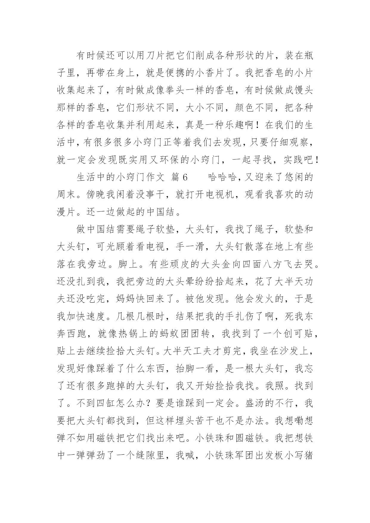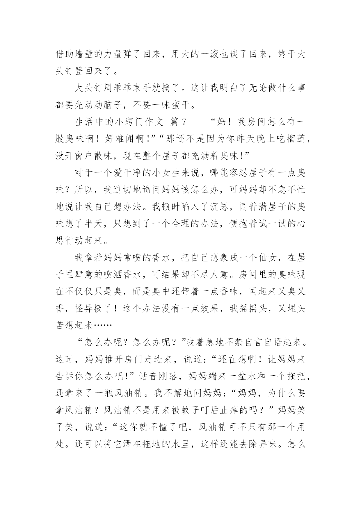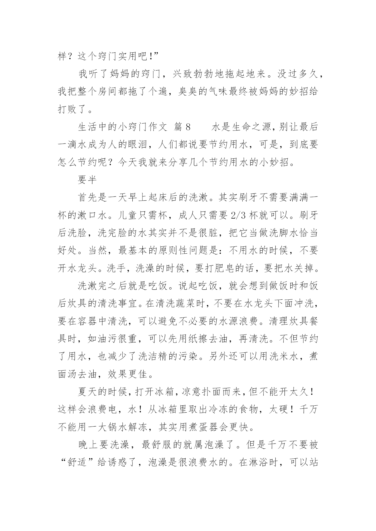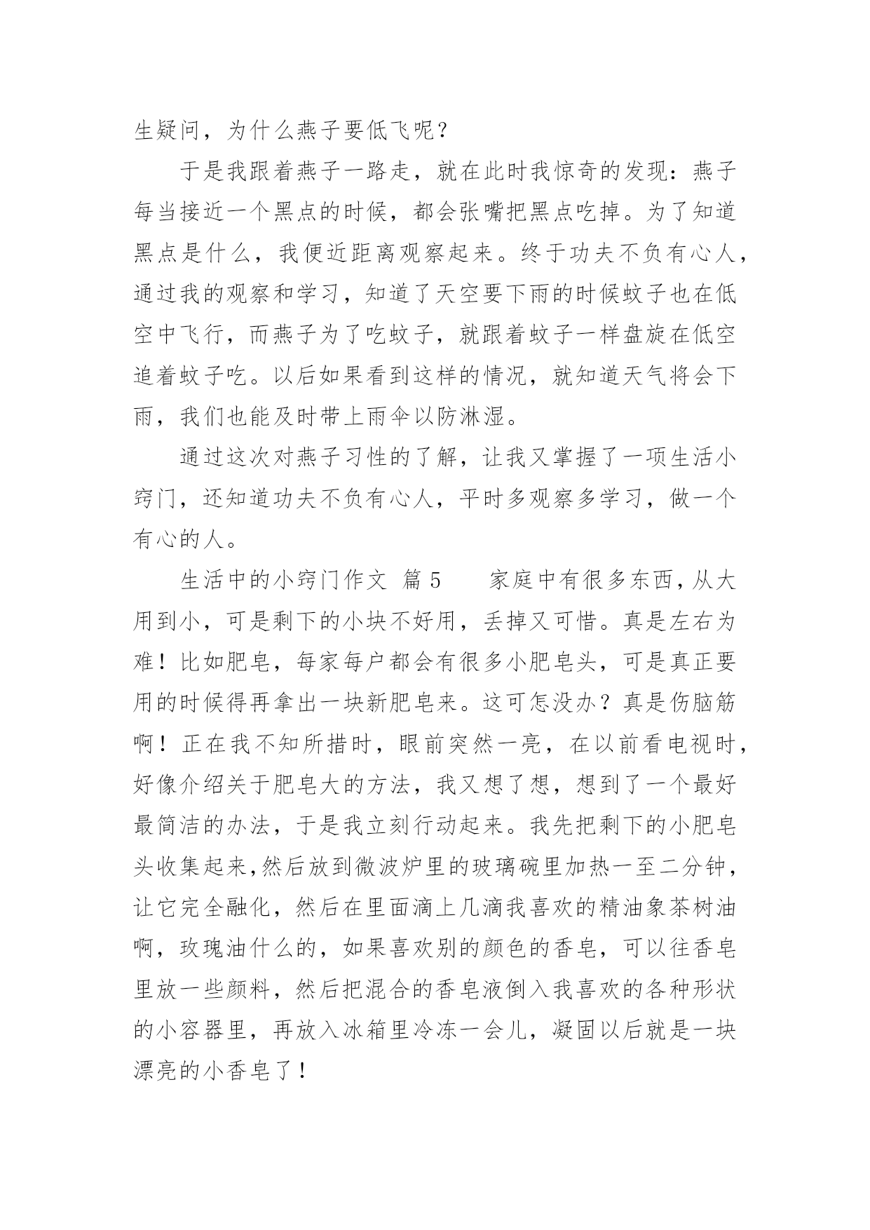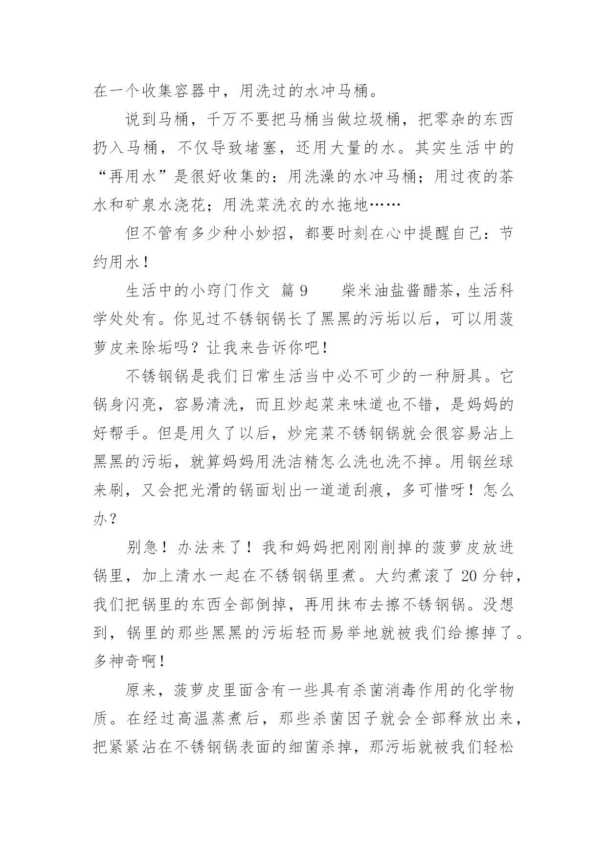 生活中的小窍门作文生活中的小窍门作文450字(通用47篇)在日复一日的学习、工作或生活中,大家都不可避免地会接触到作文吧,作文根据写作时限的不同可以分为限时作文和非限时作文。那么问题来了,到底应如何写一篇优秀的作文呢?下面是小编为大家收集的生活中的小窍门作文450字(通用47篇),希望对大家有所帮助。生活中的小窍门作文篇1生活中有许许多多小窍门,今天就给你讲讲我生活的小窍门吧。有一次,我妈妈的银首饰被氧化变脏了,黑乎乎的,看起来可不好看啦,我便下定决心要想办法把首饰擦干净。我使出常规的“武器”,准备和“敌方”大干一场。我先拿出抹布和水盆,擦了半天没有用,心想“白费劲儿!没擦掉一点!说完我把抹布扔在一边,气得直跺脚,这时我瞟见脚上那白白的旅游鞋,两眼发亮,便有了灵感,快使出“秘密武器”。我跑进卫生间、拿出牙刷和牙膏,以前妈妈用这个擦我的白鞋,又白又亮,这个说不定可以有用。于是,我把一大块牙膏挤在牙刷上,准备行动,我左边抹抹,右边刷刷,银手镯变得亮光光的啦!我把它仔细观察了一番,发现还有边边角角处没弄干净。于是,我又用秘密武器“杀”了他个片甲不留,我把它放进水池冲了冲,干净了!突然,我好像又发现了什么似的大叫了起来。原来,牙刷是我刚买的新的、正在用的!不过想想,一个牙刷换一个银手饰,值了!我通过这件事明白了做事不能轻言放弃,生活中没有解决不了的事情,只要你肯思考和联想,留意这些小窍门就能解决很多麻烦。听说风油精有很多奇效,我以后要试试啦!生活中的小窍门作文篇2你们应该都知道生活中有许多小窍门吧,小窍门可以在生活给我们带来很多便利。一天中午,我和我姐姐正在打乒乓球,我的姐姐用力过猛,乒乓球直接打偏了,我正想去拿乒乓球的时候,我姐就飞快的跑过去,一不小心把乒乓球踩了一脚,乒乓球凹了下去了,我急得像热锅上的蚂蚁—团团转,我想到的办法是用脚踩,我用力一脚被我姐姐踩的那一下凸了出来,但是我踩得地方又凹了进去……我想了很多的办法也没有想出来,后来,我脑子一转,我突然想到了科学老师告诉我们乒乓球凹进去怎么办,我赶紧跑回家,把热水倒在桶里,再把乒乓球放进去,乒乓凹下去的地方果然慢慢地鼓起来了,我和姐姐高兴得一蹦三尺高,我和我姐姐又开始打乒乓球了。生活中的小窍门,真有趣呀。生活中的小窍门作文篇3每个人生活中都会经常遇到一些麻烦的事,如:一件新衣服穿在身上你不小心将墨水泼在身上洗不干净而烦脑,没有洗干净穿出去多不体面呀!有一次我就是这样,在写毛笔字时把墨汁弄了一大块在身上,急得像热锅上的蚂蚁团团转。我正好看见舅舅在看中央电视台播出的特别节目“家有妙招”栏目,我也坐下来洗耳恭听。女主持人讲了很多妙招,其中我看到了巧用米饭洗墨汁的方法,她告诉我们如果不小心墨水弄脏了衣服时你别慌,首先用一些热饭放在有墨水的地方,然后连续搓洗,那衣服上的墨水便慢慢地全部沾在饭上了,饭变黑了,再换新的热饭,重复几次衣服上的墨迹就完全消失了。再用清水将衣服浸湿,然后涂上肥皂,过几分钟后用手搓洗墨迹处,这样就会洗得干干净净,最后在清水中滴几滴醋就会使衣服花色光亮,把衣服捞起凉干,便和新的一样。我要把这个小窍门告诉妈妈,妈妈就不会因衣服上沾到墨水洗不干净而犯愁了。通过这次洗衣服,我在电视里还学到了很多日常生活中的小窍门,例如:在厨房中醋的妙用,烧鱼时加醋就会除去鱼腥味;浇花的水中加点糖,花就可以延长花期……真是学海无涯,什么知识都得学,学到对我们有益无害,你说呢?生活中的小窍门作文篇4生活中的小窍门有许多,例如:口香糖粘在衣服上,放冰箱冷冻一抠就下来了。切蛋糕之前,把刀用热水烫一遍,就不会有奶油粘到上面。水杯里有茶渍,可用牙膏轻松洗掉。今天,我又发现了生活中的一个小窍门。这天,外面乌黑的天空,潮湿的空气,让我感到今天可能会下雨。这时我来到公园,心情沉重的我望了一下天空,看见燕子在低空中盘旋,还会不时的越来越下降,我不禁产生疑问,为什么燕子要低飞呢?于是我跟着燕子一路走,就在此时我惊奇的发现:燕子每当接近一个黑点的时候,都会张嘴把黑点吃掉。为了知道黑点是什么,我便近距离观察起来。终于功夫不负有心人,通过我的观察和学习,知道了天空要下雨的时候蚊子也在低空中飞行,而燕子为了吃蚊子,就跟着蚊子一样盘旋在低空追着蚊子吃。以后如果看到这样的情况,就知道天气将会下雨,我们也能及时带上雨伞以防淋湿。通过这次对燕子习性的了解,让我又掌握了一项生活小窍门,还知道功夫不负有心人,平时多观察多学习,做一个有心的人。生活中的小窍门作文篇5家庭中有很多东西,从大用到小,可是剩下的小块不好用,丢掉又可惜。真是左右为难!比如肥皂,每家每户都会有很多小肥皂头,可是真正要用的时候得再拿出一块新肥皂来。这可怎没办?真是伤脑筋啊!正在我不知所措时,眼前突然一亮,在以前看电视时,好像介绍关于肥皂大的方法,我又想了想,想
