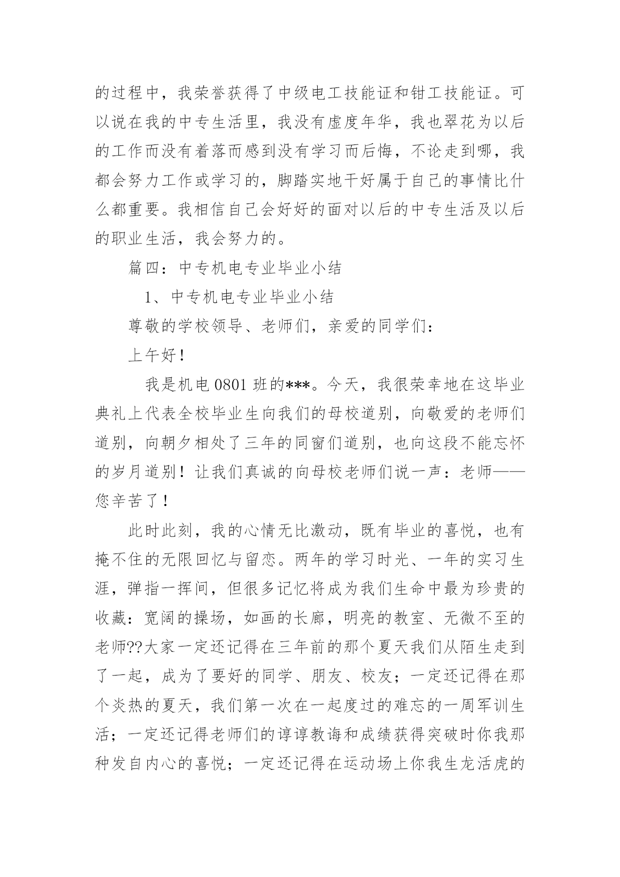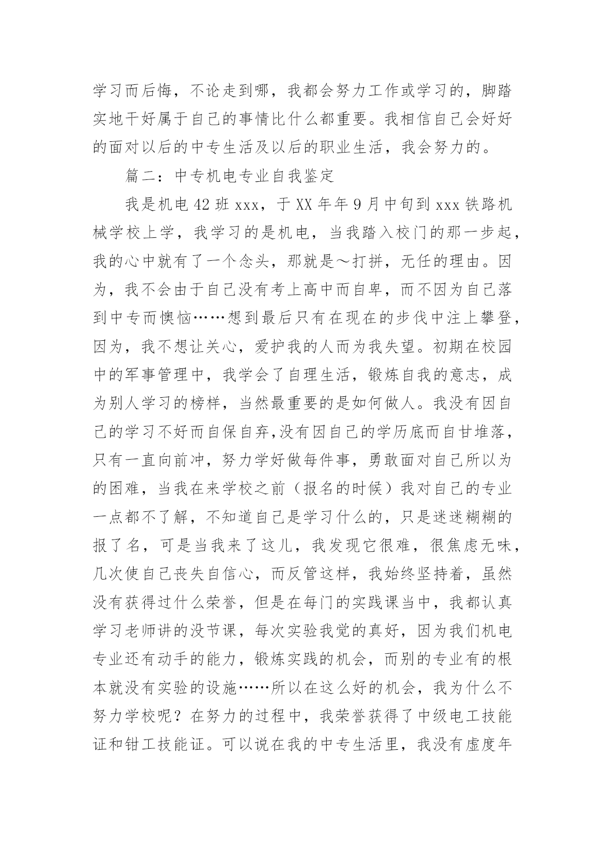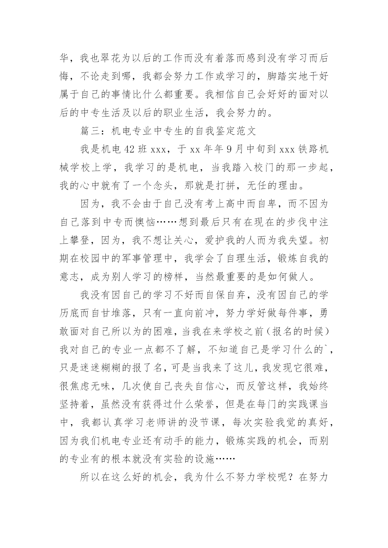 中专机电专业自我鉴定及毕业总结篇一:中专机电专业自我鉴定我是机电42班[xxxxx],于XX年年9月中旬到[xxxxx]铁路机械学校上学,我学习的是机电,当我踏入校门的那一步起,我的心中就有了一个念头,那就是~打拼,无任的理由。因为,我不会由于自己没有考上高中而自卑,而不因为自己落到中专而懊恼……想到最后只有在现在的步伐中注上攀登,因为,我不想让关心,爱护我的人而为我失望。初期在校园中的军事管理中,我学会了自理生活,锻炼自我的意志,成为别人学习的榜样,当然最重要的是如何做人。我没有因自己的学习不好而自保自弃,没有因自己的学历底而自甘堆落,只有一直向前冲,努力学好做每件事,勇敢面对自己所以为的困难,当我在来学校之前(报名的时候)我对自己的专业一点都不了解,不知道自己是学习什么的,只是迷迷糊糊的报了名,可是当我来了这儿,我发现它很难,很焦虑无味,几次使自己丧失自信心,而反管这样,我始终坚持着,虽然没有获得过什么荣誉,但是在每门的实践课当中,我都认真学习老师讲的没节课,每次实验我觉的真好,因为我们机电专业还有动手的能力,锻炼实践的机会,而别的专业有的根本就没有实验的设施……所以在这么好的机会,我为什么不努力学校呢?在努力的过程中,我荣誉获得了中级电工技能证和钳工技能证。可以说在我的中专生活里,我没有虚度年华,我也翠花为以后的工作而没有着落而感到没有学习而后悔,不论走到哪,我都会努力工作或学习的,脚踏实地干好属于自己的事情比什么都重要。我相信自己会好好的面对以后的中专生活及以后的职业生活,我会努力的。篇二:中专机电专业自我鉴定我是机电42班xxx,于XX年年9月中旬到xxx铁路机械学校上学,我学习的是机电,当我踏入校门的那一步起,我的心中就有了一个念头,那就是~打拼,无任的理由。因为,我不会由于自己没有考上高中而自卑,而不因为自己落到中专而懊恼……想到最后只有在现在的步伐中注上攀登,因为,我不想让关心,爱护我的人而为我失望。初期在校园中的军事管理中,我学会了自理生活,锻炼自我的意志,成为别人学习的榜样,当然最重要的是如何做人。我没有因自己的学习不好而自保自弃,没有因自己的学历底而自甘堆落,只有一直向前冲,努力学好做每件事,勇敢面对自己所以为的困难,当我在来学校之前(报名的时候)我对自己的专业一点都不了解,不知道自己是学习什么的,只是迷迷糊糊的报了名,可是当我来了这儿,我发现它很难,很焦虑无味,几次使自己丧失自信心,而反管这样,我始终坚持着,虽然没有获得过什么荣誉,但是在每门的实践课当中,我都认真学习老师讲的没节课,每次实验我觉的真好,因为我们机电专业还有动手的能力,锻炼实践的机会,而别的专业有的根本就没有实验的设施……所以在这么好的机会,我为什么不努力学校呢?在努力的过程中,我荣誉获得了中级电工技能证和钳工技能证。可以说在我的中专生活里,我没有虚度年华,我也翠花为以后的工作而没有着落而感到没有学习而后悔,不论走到哪,我都会努力工作或学习的,脚踏实地干好属于自己的事情比什么都重要。我相信自己会好好的面对以后的中专生活及以后的职业生活,我会努力的。篇三:机电专业中专生的自我鉴定范文我是机电42班xxx,于xx年年9月中旬到xxx铁路机械学校上学,我学习的是机电,当我踏入校门的那一步起,我的心中就有了一个念头,那就是打拼,无任的理由。因为,我不会由于自己没有考上高中而自卑,而不因为自己落到中专而懊恼……想到最后只有在现在的步伐中注上攀登,因为,我不想让关心,爱护我的人而为我失望。初期在校园中的军事管理中,我学会了自理生活,锻炼自我的意志,成为别人学习的榜样,当然最重要的是如何做人。我没有因自己的学习不好而自保自弃,没有因自己的学历底而自甘堆落,只有一直向前冲,努力学好做每件事,勇敢面对自己所以为的困难,当我在来学校之前(报名的时候)我对自己的专业一点都不了解,不知道自己是学习什么的`,只是迷迷糊糊的报了名,可是当我来了这儿,我发现它很难,很焦虑无味,几次使自己丧失自信心,而反管这样,我始终坚持着,虽然没有获得过什么荣誉,但是在每门的实践课当中,我都认真学习老师讲的没节课,每次实验我觉的真好,因为我们机电专业还有动手的能力,锻炼实践的机会,而别的专业有的根本就没有实验的设施……所以在这么好的机会,我为什么不努力学校呢?在努力的过程中,我荣誉获得了中级电工技能证和钳工技能证。可以说在我的中专生活里,我没有虚度年华,我也翠花为以后的工作而没有着落而感到没有学习而后悔,不论走到哪,我都会努力工作或学习的,脚踏实地干好属于自己的事情比什么都重要。我相信自己会好好的面对以后的中专生活及以后的职业生活,我会努力的。篇四:中专机电专业毕业小结1、中专机电专业毕业小结尊敬的学校领导、老师们,亲爱的同学们:上午好!我是机电0801班的***。今天,我很荣幸