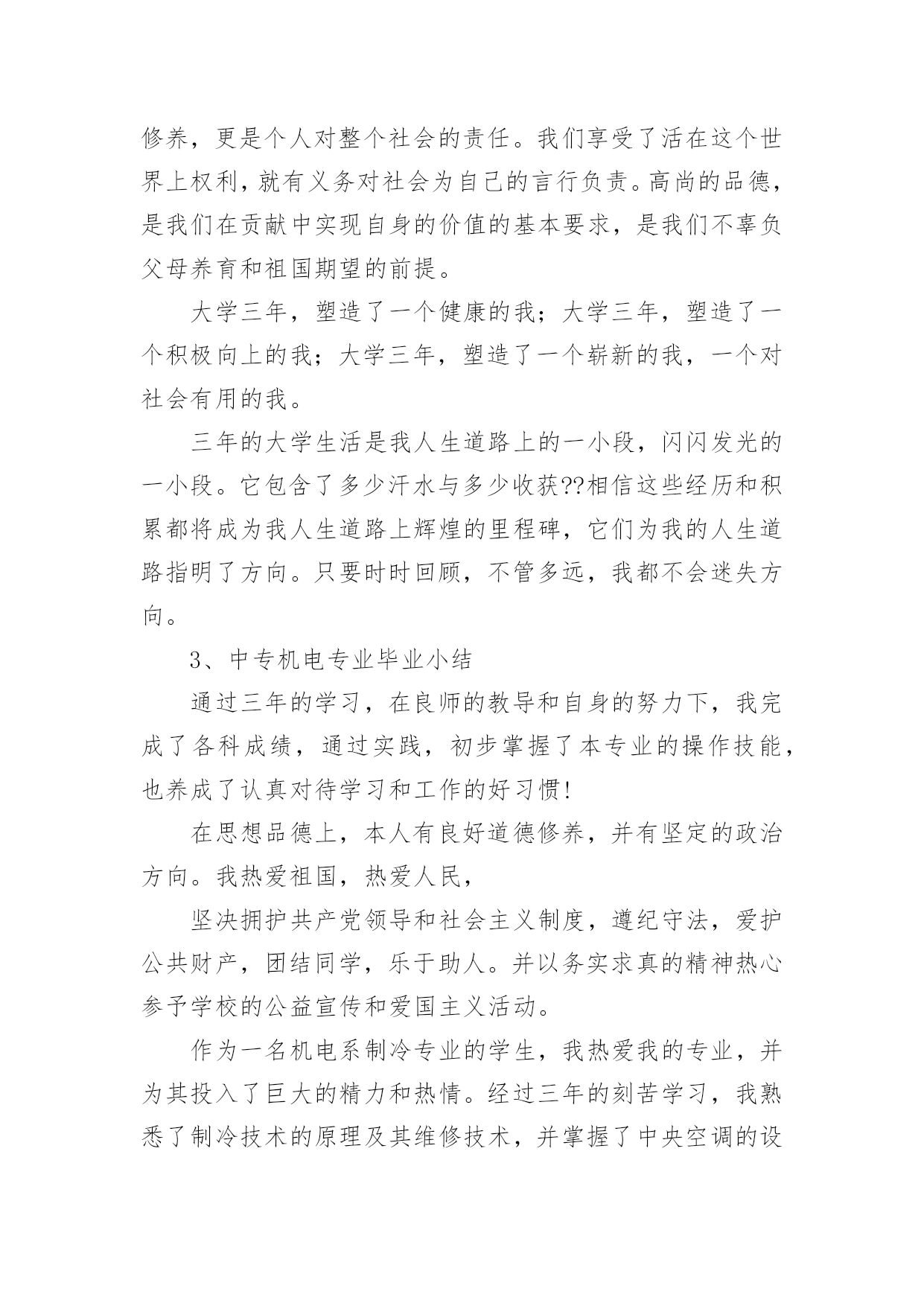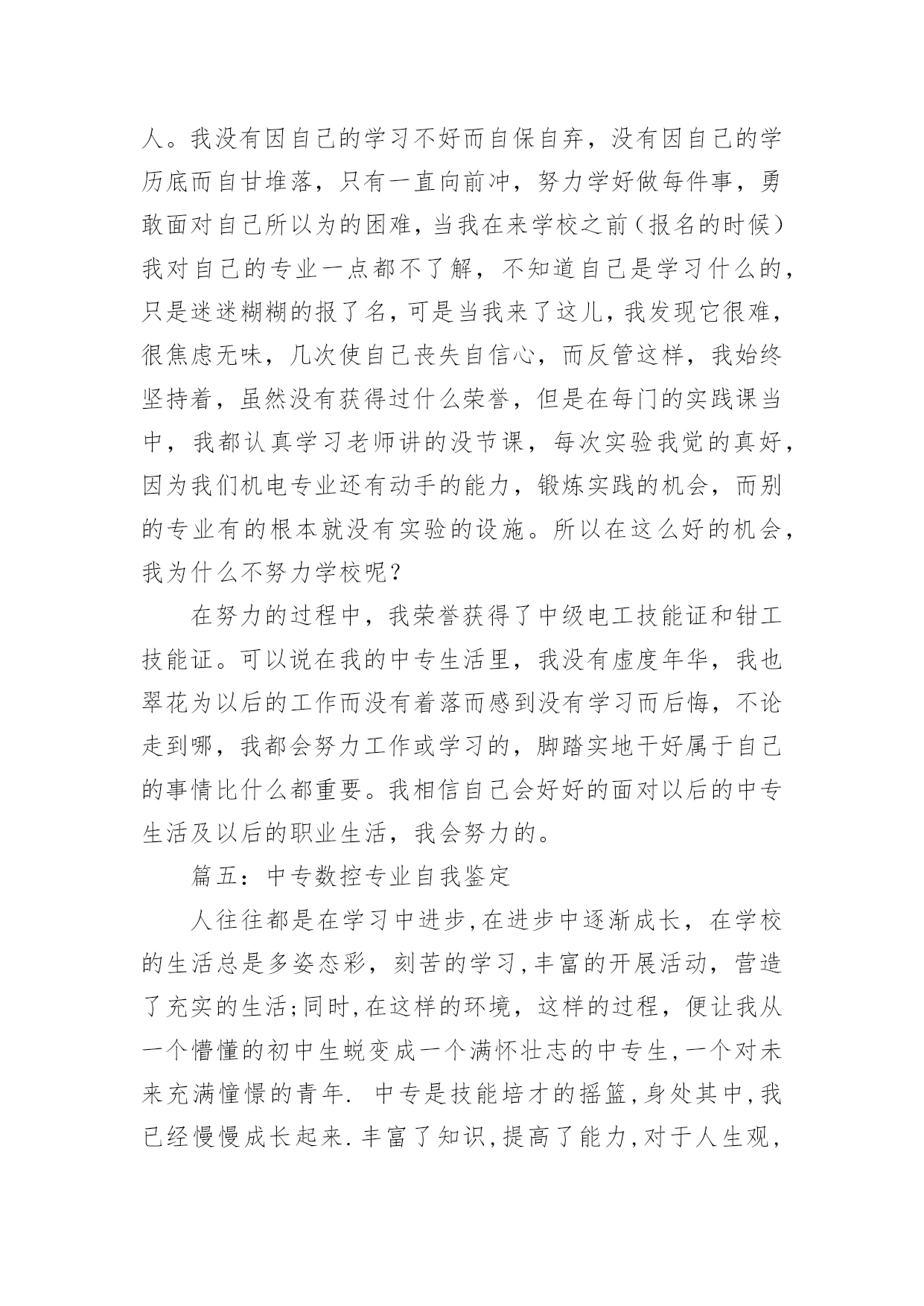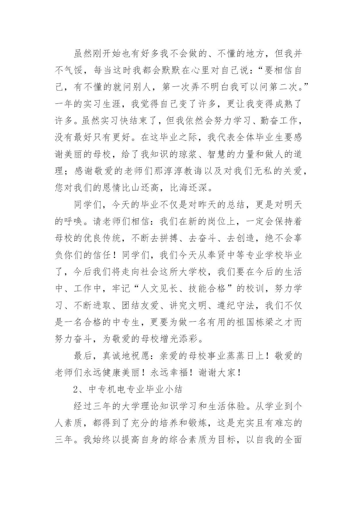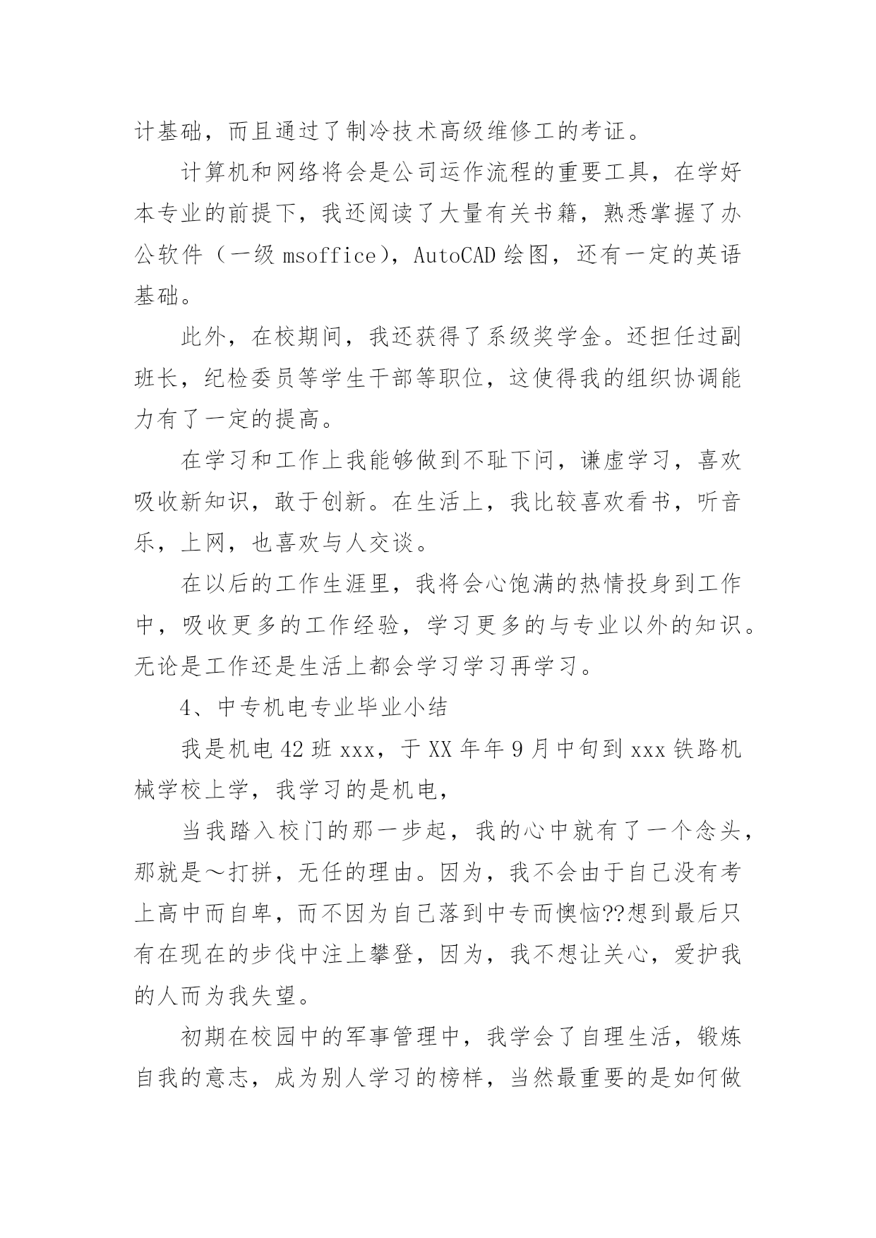 中专机电专业自我鉴定及毕业总结篇一:中专机电专业自我鉴定我是机电42班[xxxxx],于XX年年9月中旬到[xxxxx]铁路机械学校上学,我学习的是机电,当我踏入校门的那一步起,我的心中就有了一个念头,那就是~打拼,无任的理由。因为,我不会由于自己没有考上高中而自卑,而不因为自己落到中专而懊恼……想到最后只有在现在的步伐中注上攀登,因为,我不想让关心,爱护我的人而为我失望。初期在校园中的军事管理中,我学会了自理生活,锻炼自我的意志,成为别人学习的榜样,当然最重要的是如何做人。我没有因自己的学习不好而自保自弃,没有因自己的学历底而自甘堆落,只有一直向前冲,努力学好做每件事,勇敢面对自己所以为的困难,当我在来学校之前(报名的时候)我对自己的专业一点都不了解,不知道自己是学习什么的,只是迷迷糊糊的报了名,可是当我来了这儿,我发现它很难,很焦虑无味,几次使自己丧失自信心,而反管这样,我始终坚持着,虽然没有获得过什么荣誉,但是在每门的实践课当中,我都认真学习老师讲的没节课,每次实验我觉的真好,因为我们机电专业还有动手的能力,锻炼实践的机会,而别的专业有的根本就没有实验的设施……所以在这么好的机会,我为什么不努力学校呢?在努力的过程中,我荣誉获得了中级电工技能证和钳工技能证。可以说在我的中专生活里,我没有虚度年华,我也翠花为以后的工作而没有着落而感到没有学习而后悔,不论走到哪,我都会努力工作或学习的,脚踏实地干好属于自己的事情比什么都重要。我相信自己会好好的面对以后的中专生活及以后的职业生活,我会努力的。篇二:中专机电专业自我鉴定我是机电42班xxx,于XX年年9月中旬到xxx铁路机械学校上学,我学习的是机电,当我踏入校门的那一步起,我的心中就有了一个念头,那就是~打拼,无任的理由。因为,我不会由于自己没有考上高中而自卑,而不因为自己落到中专而懊恼……想到最后只有在现在的步伐中注上攀登,因为,我不想让关心,爱护我的人而为我失望。初期在校园中的军事管理中,我学会了自理生活,锻炼自我的意志,成为别人学习的榜样,当然最重要的是如何做人。我没有因自己的学习不好而自保自弃,没有因自己的学历底而自甘堆落,只有一直向前冲,努力学好做每件事,勇敢面对自己所以为的困难,当我在来学校之前(报名的时候)我对自己的专业一点都不了解,不知道自己是学习什么的,只是迷迷糊糊的报了名,可是当我来了这儿,我发现它很难,很焦虑无味,几次使自己丧失自信心,而反管这样,我始终坚持着,虽然没有获得过什么荣誉,但是在每门的实践课当中,我都认真学习老师讲的没节课,每次实验我觉的真好,因为我们机电专业还有动手的能力,锻炼实践的机会,而别的专业有的根本就没有实验的设施……所以在这么好的机会,我为什么不努力学校呢?在努力的过程中,我荣誉获得了中级电工技能证和钳工技能证。可以说在我的中专生活里,我没有虚度年华,我也翠花为以后的工作而没有着落而感到没有学习而后悔,不论走到哪,我都会努力工作或学习的,脚踏实地干好属于自己的事情比什么都重要。我相信自己会好好的面对以后的中专生活及以后的职业生活,我会努力的。篇三:机电专业中专生的自我鉴定范文我是机电42班xxx,于xx年年9月中旬到xxx铁路机械学校上学,我学习的是机电,当我踏入校门的那一步起,我的心中就有了一个念头,那就是打拼,无任的理由。因为,我不会由于自己没有考上高中而自卑,而不因为自己落到中专而懊恼……想到最后只有在现在的步伐中注上攀登,因为,我不想让关心,爱护我的人而为我失望。初期在校园中的军事管理中,我学会了自理生活,锻炼自我的意志,成为别人学习的榜样,当然最重要的是如何做人。我没有因自己的学习不好而自保自弃,没有因自己的学历底而自甘堆落,只有一直向前冲,努力学好做每件事,勇敢面对自己所以为的困难,当我在来学校之前(报名的时候)我对自己的专业一点都不了解,不知道自己是学习什么的`,只是迷迷糊糊的报了名,可是当我来了这儿,我发现它很难,很焦虑无味,几次使自己丧失自信心,而反管这样,我始终坚持着,虽然没有获得过什么荣誉,但是在每门的实践课当中,我都认真学习老师讲的没节课,每次实验我觉的真好,因为我们机电专业还有动手的能力,锻炼实践的机会,而别的专业有的根本就没有实验的设施……所以在这么好的机会,我为什么不努力学校呢?在努力的过程中,我荣誉获得了中级电工技能证和钳工技能证。可以说在我的中专生活里,我没有虚度年华,我也翠花为以后的工作而没有着落而感到没有学习而后悔,不论走到哪,我都会努力工作或学习的,脚踏实地干好属于自己的事情比什么都重要。我相信自己会好好的面对以后的中专生活及以后的职业生活,我会努力的。篇四:中专机电专业毕业小结1、中专机电专业毕业小结尊敬的学校领导、老师们,亲爱的同学们:上午好!我是机电0801班的***。今天,我很荣幸