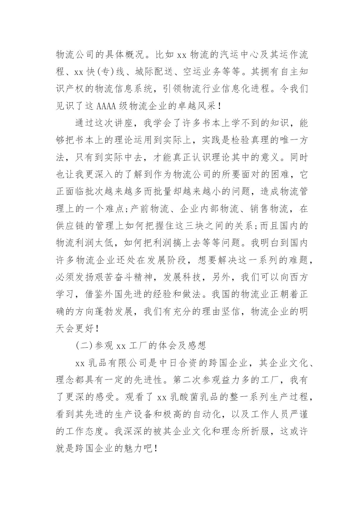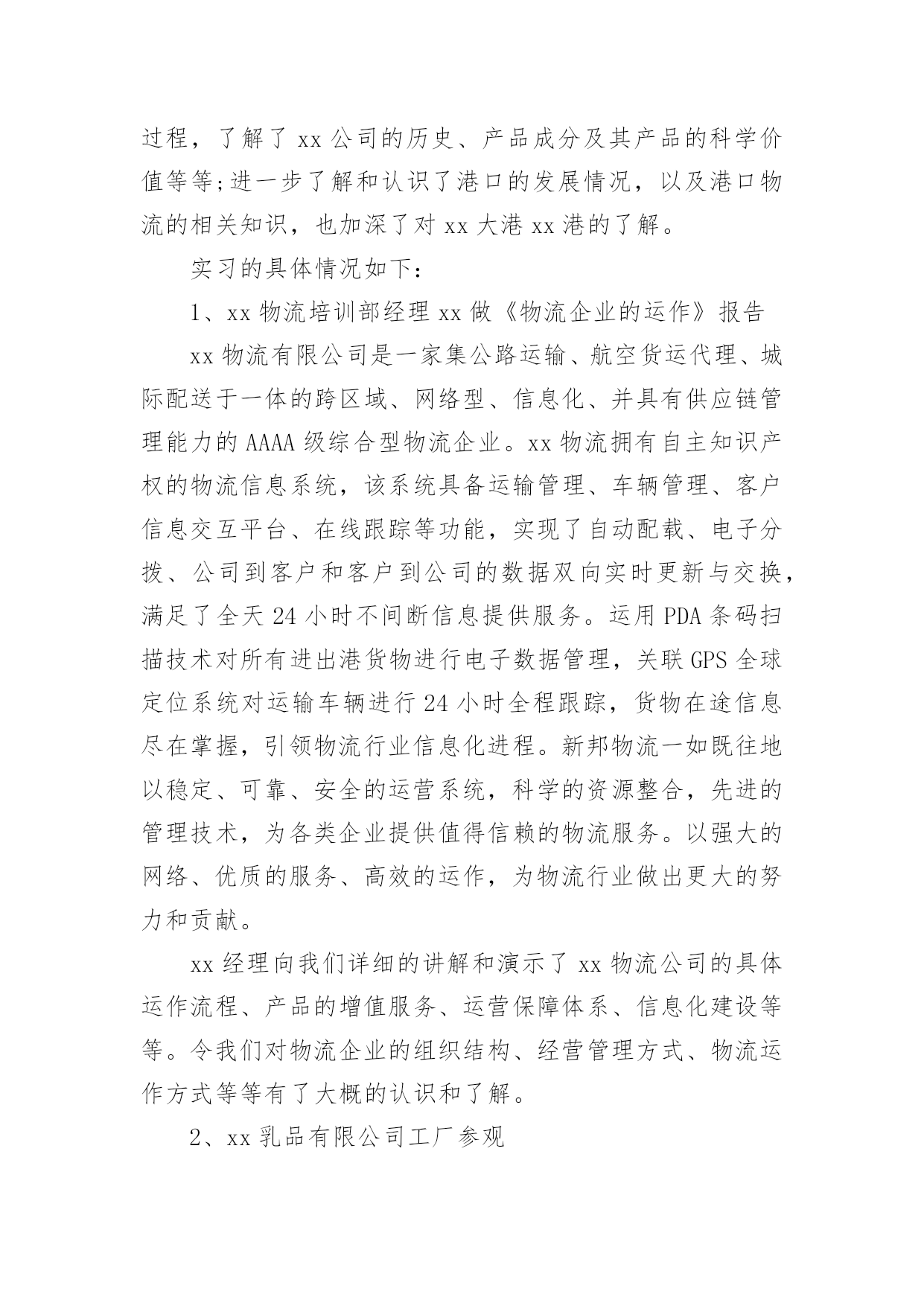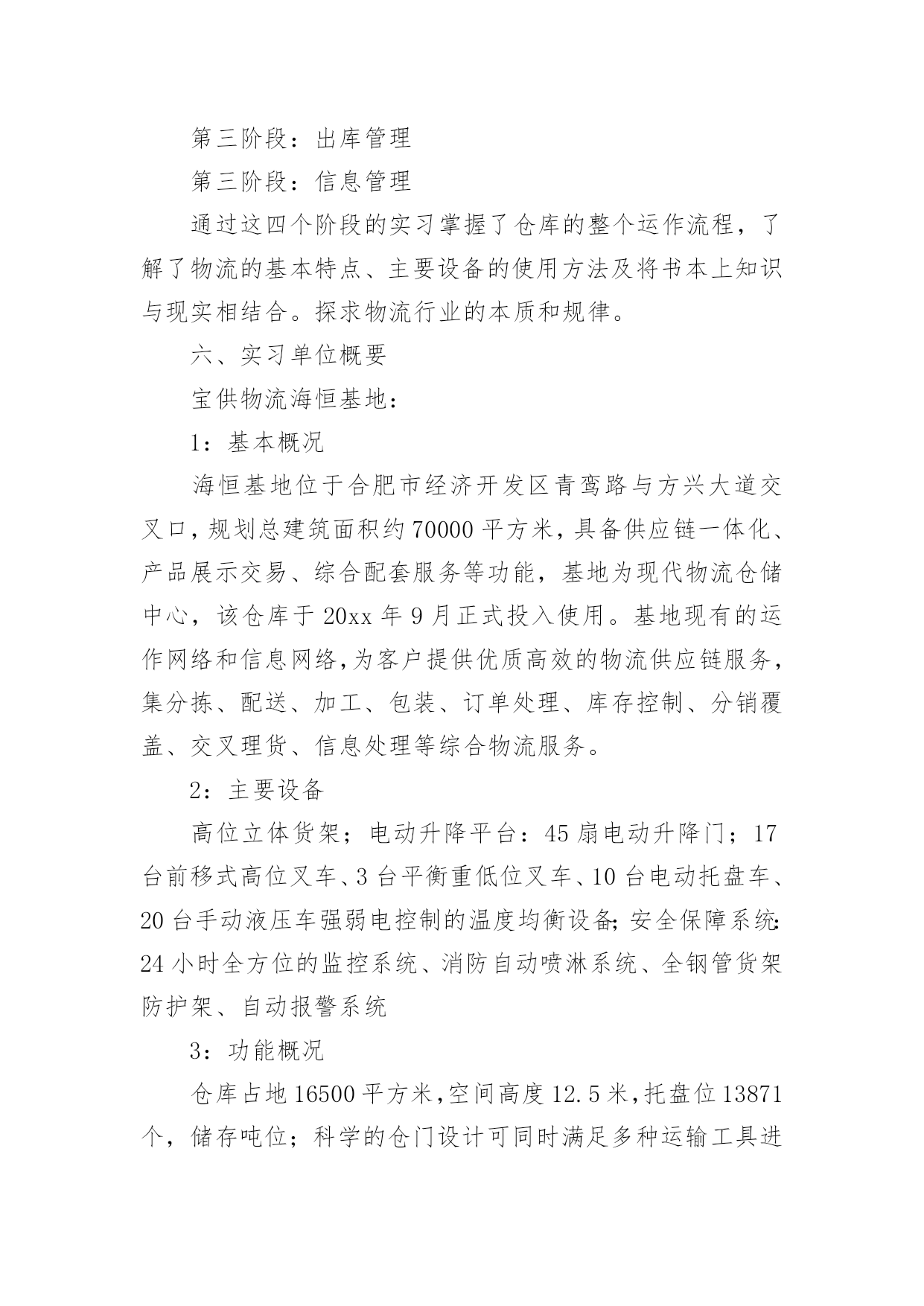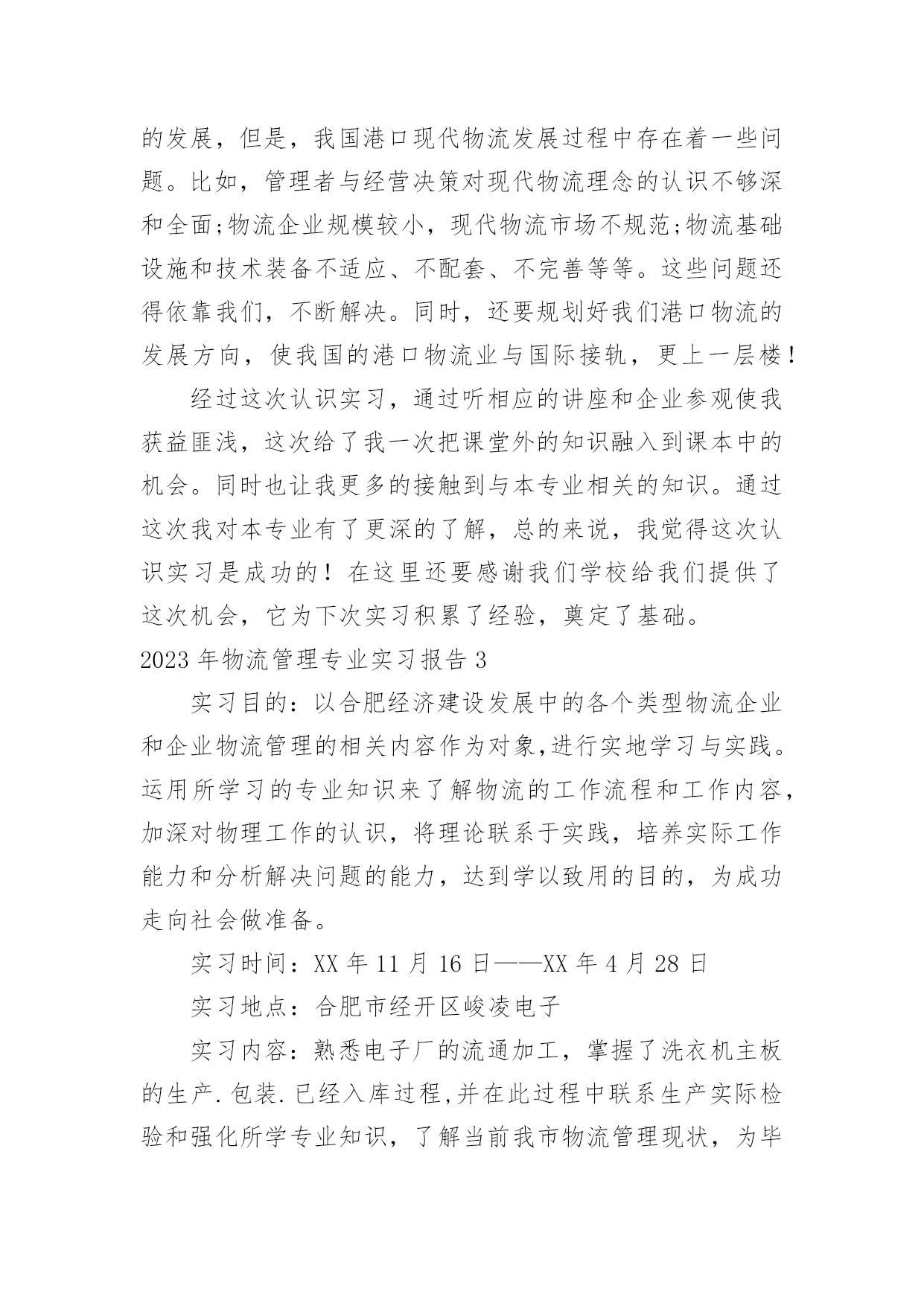 物流管理专业实习报告2023年物流管理专业实习报告在生活中,我们使用报告的情况越来越多,其在写作上具有一定的窍门。你所见过的报告是什么样的呢?下面是小编帮大家整理的2023年物流管理专业实习报告,欢迎阅读,希望大家能够喜欢。2023年物流管理专业实习报告1一、实习地点:xxxxx二、实习时间:20xx年xx月xx日至今三、实习班级:物流管理0801班四、实习目的为了更好的了解和认知物流,在为期一年的时间里我选择了当前物流行业中的佼佼者宝供物流去实习,从宏观和微观上去感受主要的物流流程,为以后的工作和学习打下坚实基础,也同时对物流行业有了全新的认识。五、实习要求为了了解物流在现代经济行业中的作用,了解物流在现在工商企业中的'运作模式,增强对专业的认知感。实习分为四个阶段:第一阶段:入库管理第二阶段:在库管理第三阶段:出库管理第三阶段:信息管理通过这四个阶段的实习掌握了仓库的整个运作流程,了解了物流的基本特点、主要设备的使用方法及将书本上知识与现实相结合。探求物流行业的本质和规律。六、实习单位概要宝供物流海恒基地:1:基本概况海恒基地位于合肥市经济开发区青鸾路与方兴大道交叉口,规划总建筑面积约70000平方米,具备供应链一体化、产品展示交易、综合配套服务等功能,基地为现代物流仓储中心,该仓库于20xx年9月正式投入使用。基地现有的运作网络和信息网络,为客户提供优质高效的物流供应链服务,集分拣、配送、加工、包装、订单处理、库存控制、分销覆盖、交叉理货、信息处理等综合物流服务。2:主要设备高位立体货架;电动升降平台:45扇电动升降门;17台前移式高位叉车、3台平衡重低位叉车、10台电动托盘车、20台手动液压车强弱电控制的温度均衡设备;安全保障系统:24小时全方位的监控系统、消防自动喷淋系统、全钢管货架防护架、自动报警系统3:功能概况仓库占地16500平方米,空间高度12.5米,托盘位13871个,储存吨位;科学的仓门设计可同时满足多种运输工具进行货物装卸。科学的仓储运作制度和流程、品牌的叉车、一流的WMS系统提供优质高效仓储运作;分销及交叉理货依托公司各平台和运作网络及自身资源整合能力,在全面订单管理系统和运输业务流程下,实现优质高效的运输业务操作;物流一体化服务:公司除正常仓储还提供一系列运输和信息服务外包装、再包装、刷唛、二次打码、分拣、回收等物注一体化服务;物流信息服务:基地利用先进的仓库管理系统、运输业务系统、全程订单管理系统对客户各个物流环节进行即时采集、分析和传递,为客户业务发展有力的保障。七、实习感想刚到宝供时脑海中的物流仅仅停留在书本上的概念,对于现实中的物流不够感性。对于物流我只知道他是集:运输、仓储、配送、搬运、包装、流通加工、信息处理这样的模式,但是当真来操作时发现没那么简单。通过这一年的学习掌握了该仓库的所有流程,同时发现这与国外的物流业相比差多了,当然这和中国的廉价劳动力息息相关,这是无尽切肤之痛。作为物流人深感当前的物流行业生存方式举步维艰。2023年物流管理专业实习报告2一、实习目的及意义认知实习是物流管理专业的学生在学习专业课前的一个教学环节,在大二下学期的下半学期,我们物流专业的全体学生在学校的带领组织下进行了为期近一个半月的认识实习培训(实训)。在这段时间里,通过听一些职场人士/专家的讲座和企业参观,理论联系实际,使得同学们从感性上对企业的组织结构、经营管理方式、物流运作方式有一个概略性的了解,进一步认识了物流业的宏观和微观发展以及主要的物流流程,加深知识面,为今后的专业课的学习和以后的工作打下一定的基础。同时,通过本次的认识实习,可以增强同学们对本专业的认识,更加了解本专业的相关细节,激发学生对后续课程的学习热情和动力。让同学们在对本专业的认识的基础上,了解更多的与本专业相衔接的行业,增加日后的就业面。通过现场的企业参观,还可以培养同学们的职业意识和团结协作精神,增强了实践经验,增强了同学们的吃苦精神,锻炼同学们的意志,为以后的成功就业做好准备。二、实习时间及安排20xx年x月x日至20xx年x月x日20xx年x月x日:xx物流培训部经理xx作《物流企业的运作》报告;20xx年x月x日:xx乳品有限公司工厂参观;20xx年x月x日:xx集团人力资源部经理xx作《xx港口与港口物流》报告;20xx年x月x日:认识实习总结。三、实习内容在本次认识实习过程中,我听了《物流企业的运作》和《xx港口与港口物流》两个学术报告,参观了xx乳品有限公司工厂。了解了物流企业的组织结构、经营管理方式、物流运作方式;参观、见识了xx乳酸菌乳饮品整个具体的生产过程,了解了xx公司的历史、产品成分及其产品的科学价值等等;进一步了解和认识了港口的发展情况,以及港口物流的相关知识,也加深了对xx大港xx港的了解。实习的具体